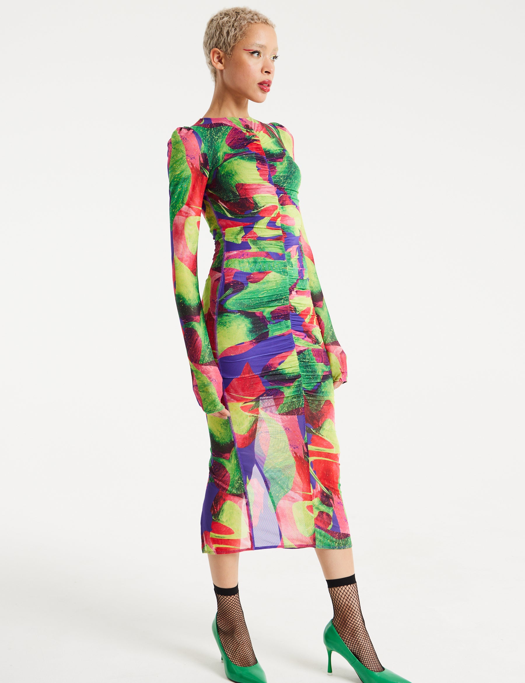 House Of Holland Abstract Multicolour Print Midi Dress With Ruching Detail