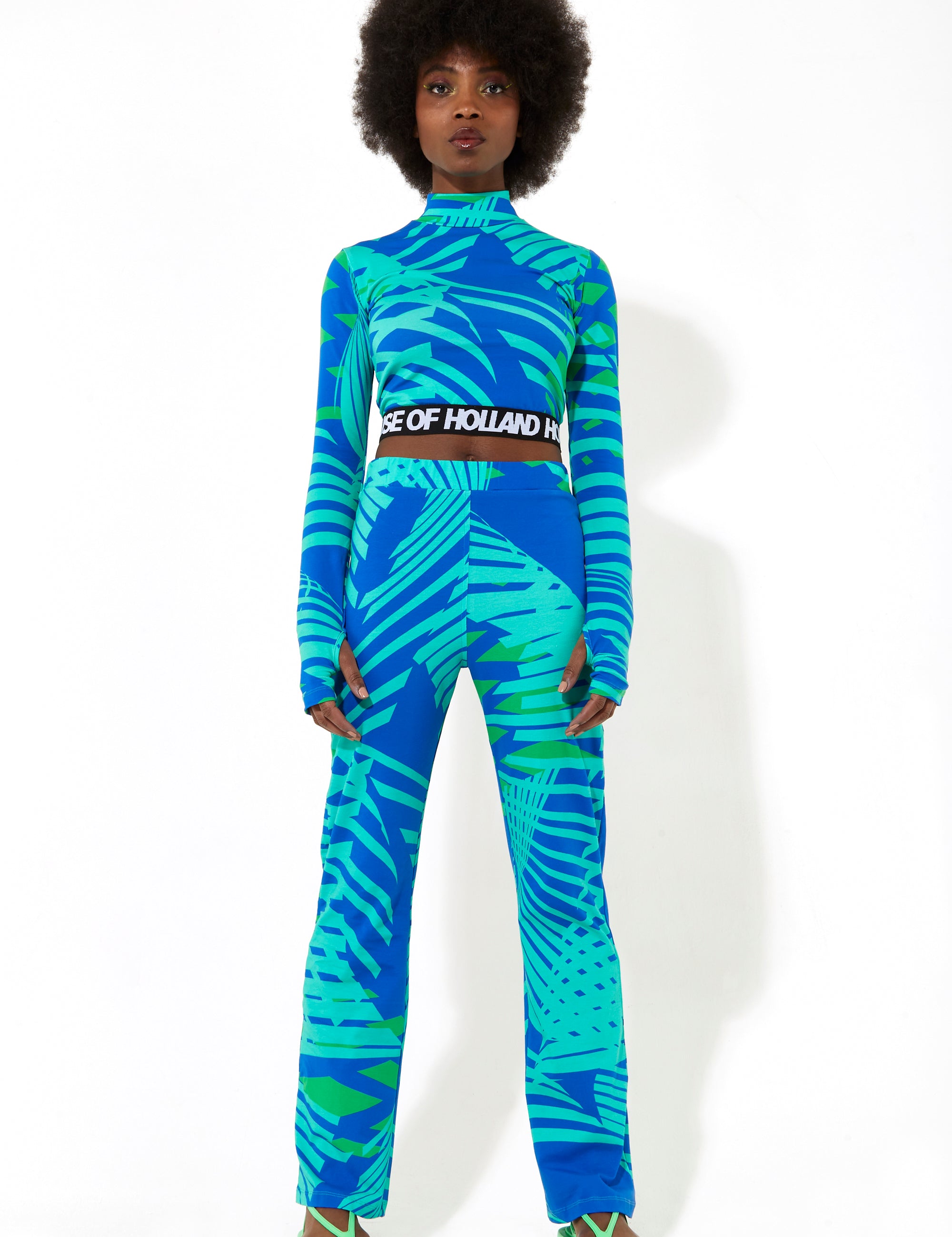House of Holland Jersey High Neck Top with a Tropical Print Elasticated Logo Waistband and Thumb Hole Details