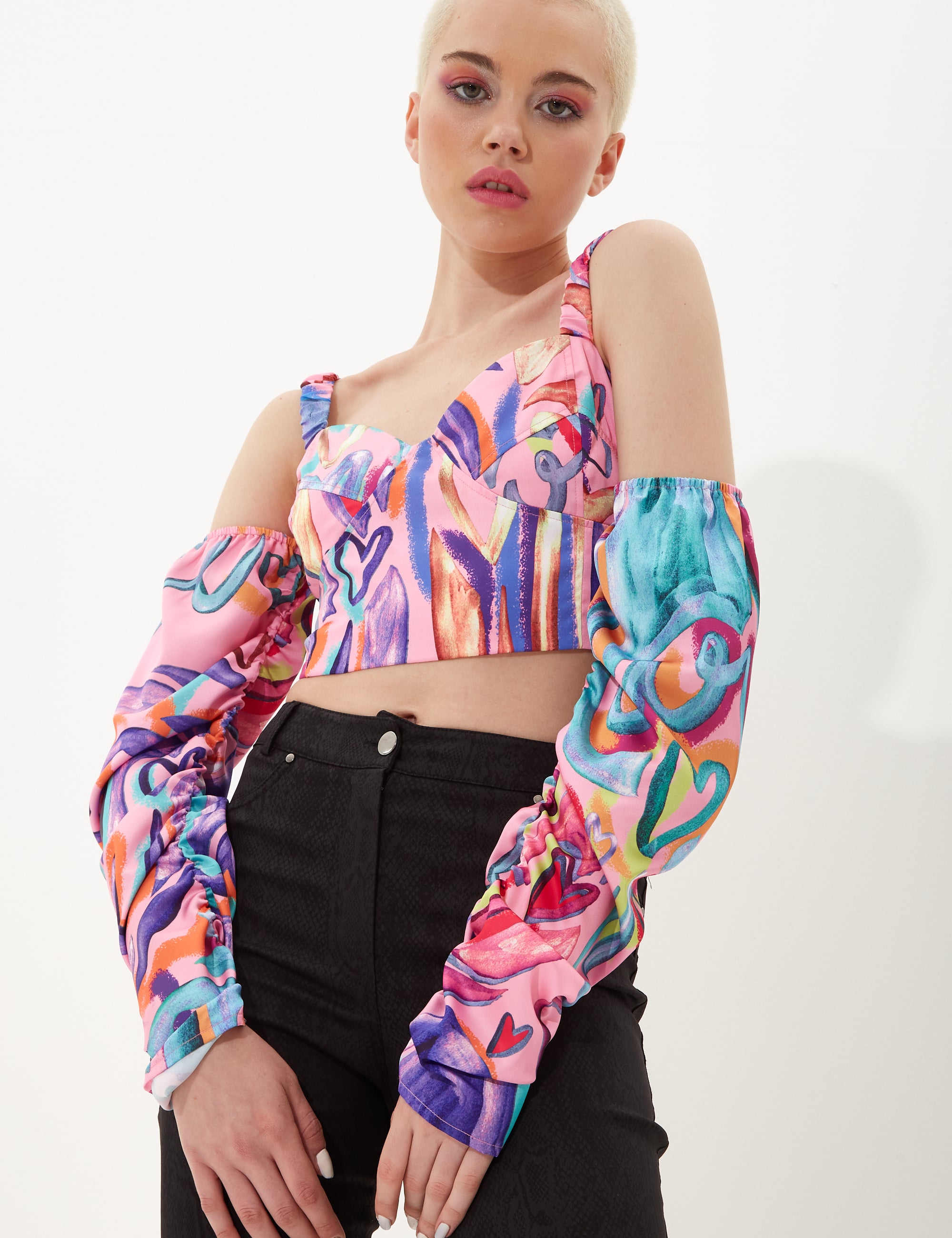 House Of Holland Heart Print Top With Elasticated Ruched Sleeves