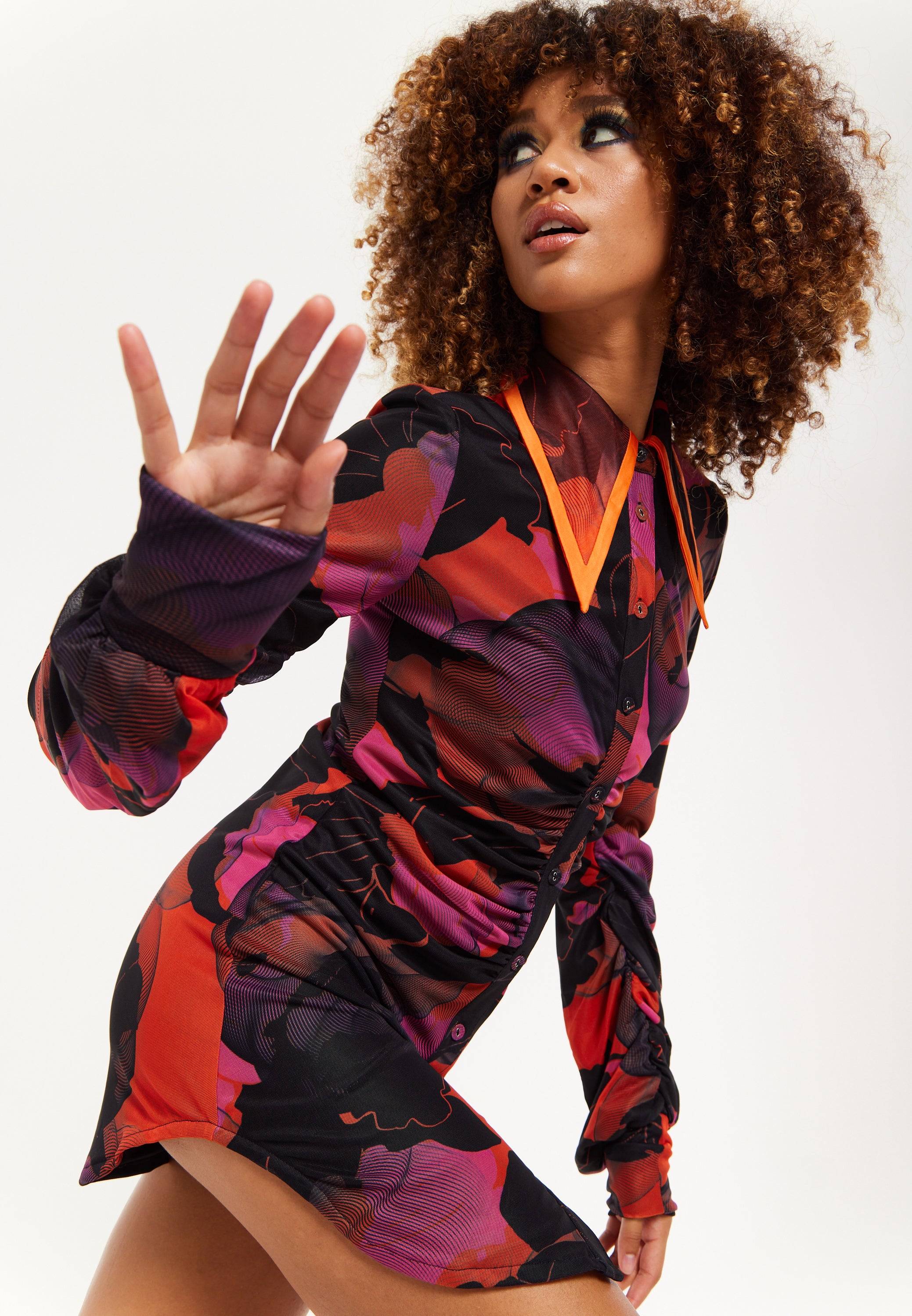 The House of Holland abstract wire print mesh mini collared shirt dress. Perfectly suitable for any occasion with a relaxed fit yet unique style. Pair it with high boots and a mini HOH bag for a remarkable appearance.
