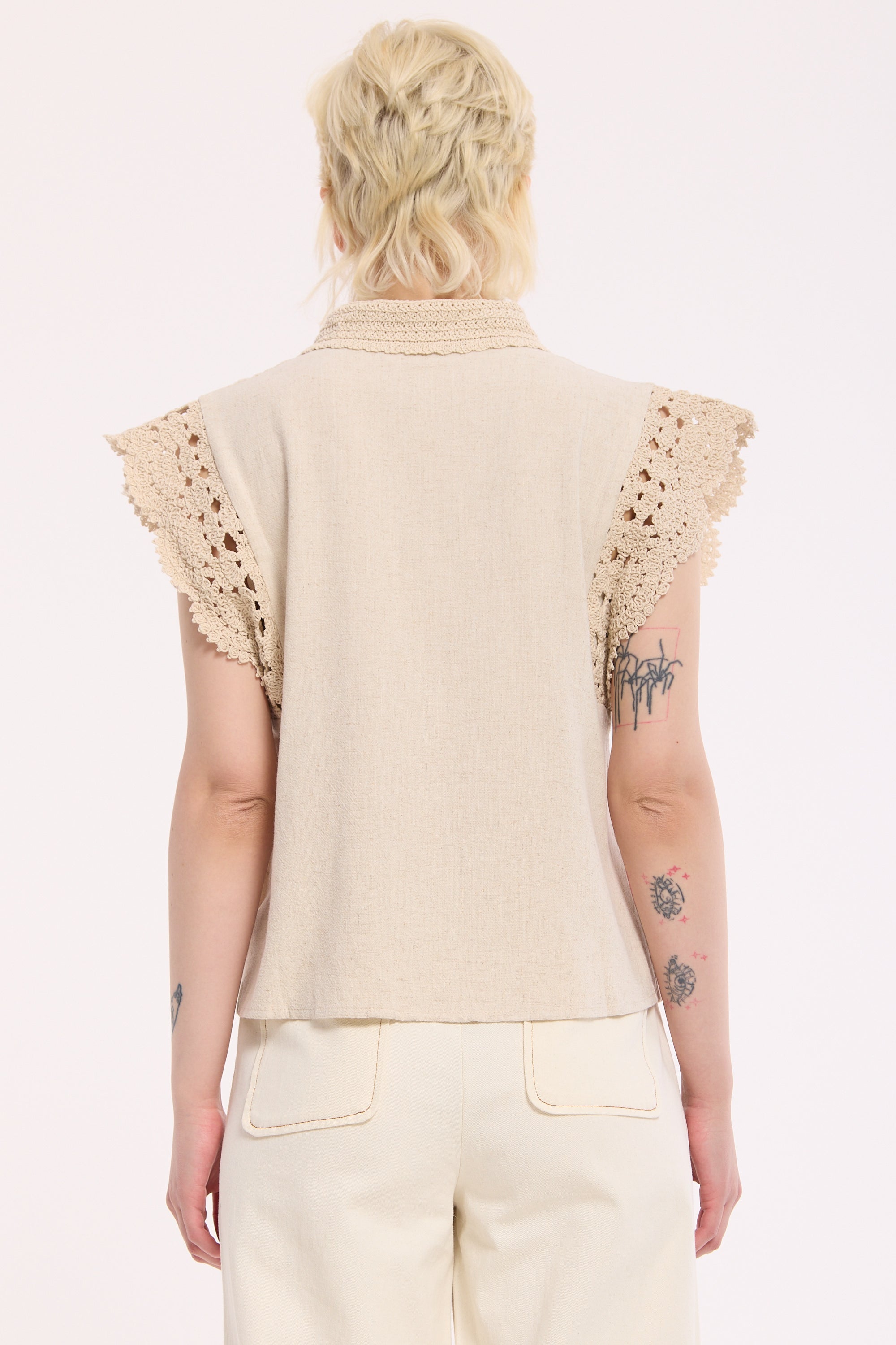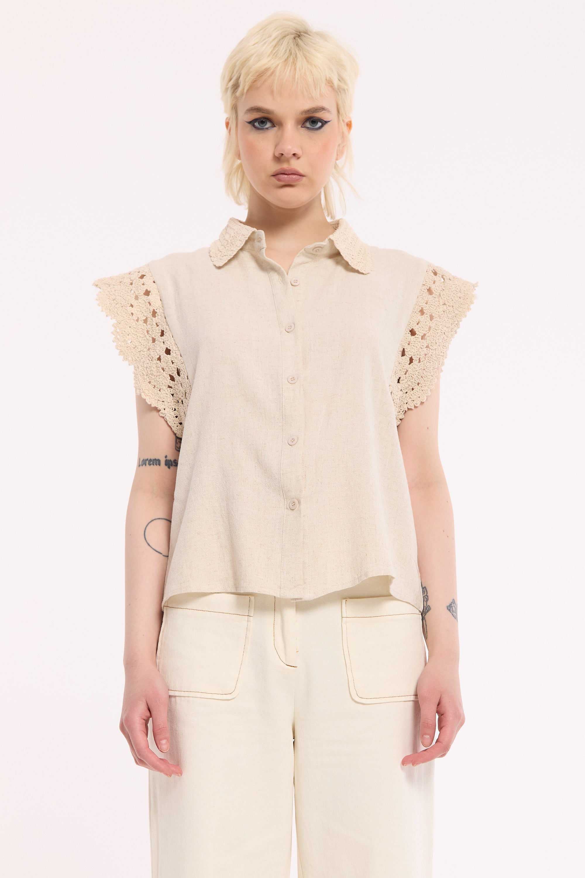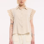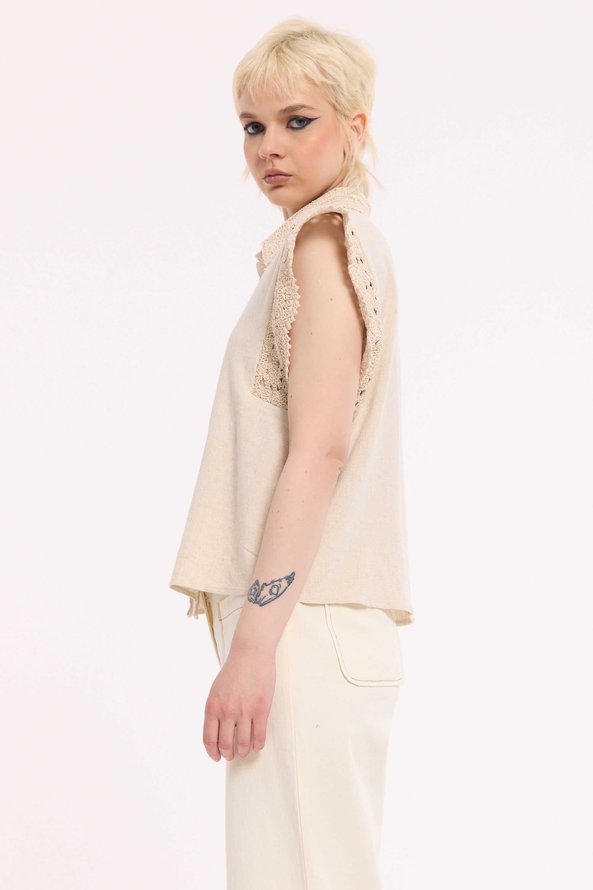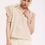 Effortlessly feminine with a soft, vintage feel, this beige sleeveless shirt is designed with delicate lace trim detailing on the shoulders and collar. The lightweight fabric and relaxed silhouette make it a versatile wardrobe staple, perfect for warm days or layering. Subtle yet elevated, it blends romantic texture with everyday ease for a timeless look.