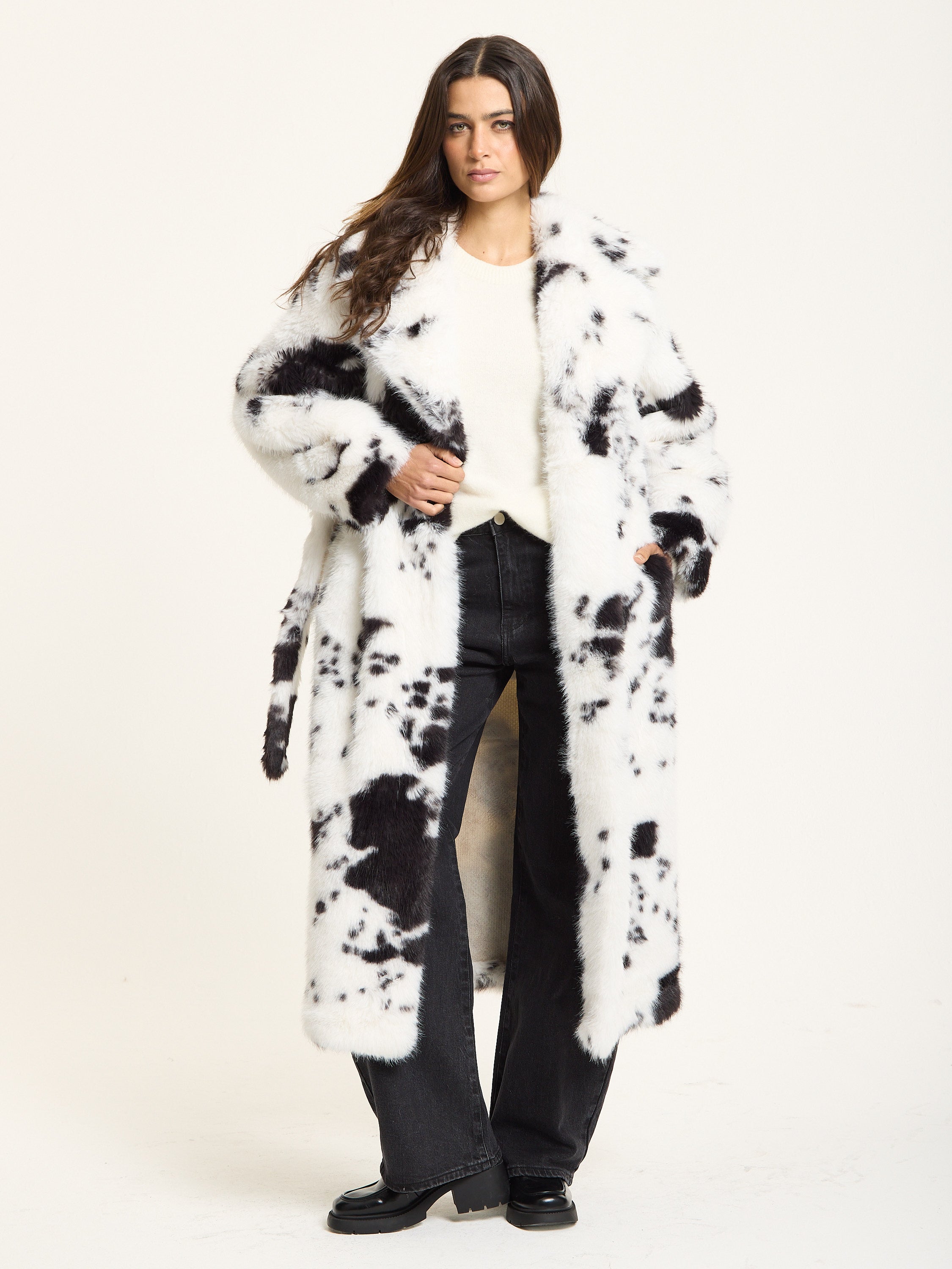 Make every entrance unforgettable with this standout cow print faux fur coat. Pair it with black jeans and chunky boots for a laid-back street style look or drape it over a mini dress and heels for night-time drama. Perfect for brunch dates, fashion events, winter parties, and city weekends – this coat is made for bold personalities who love to stand out.