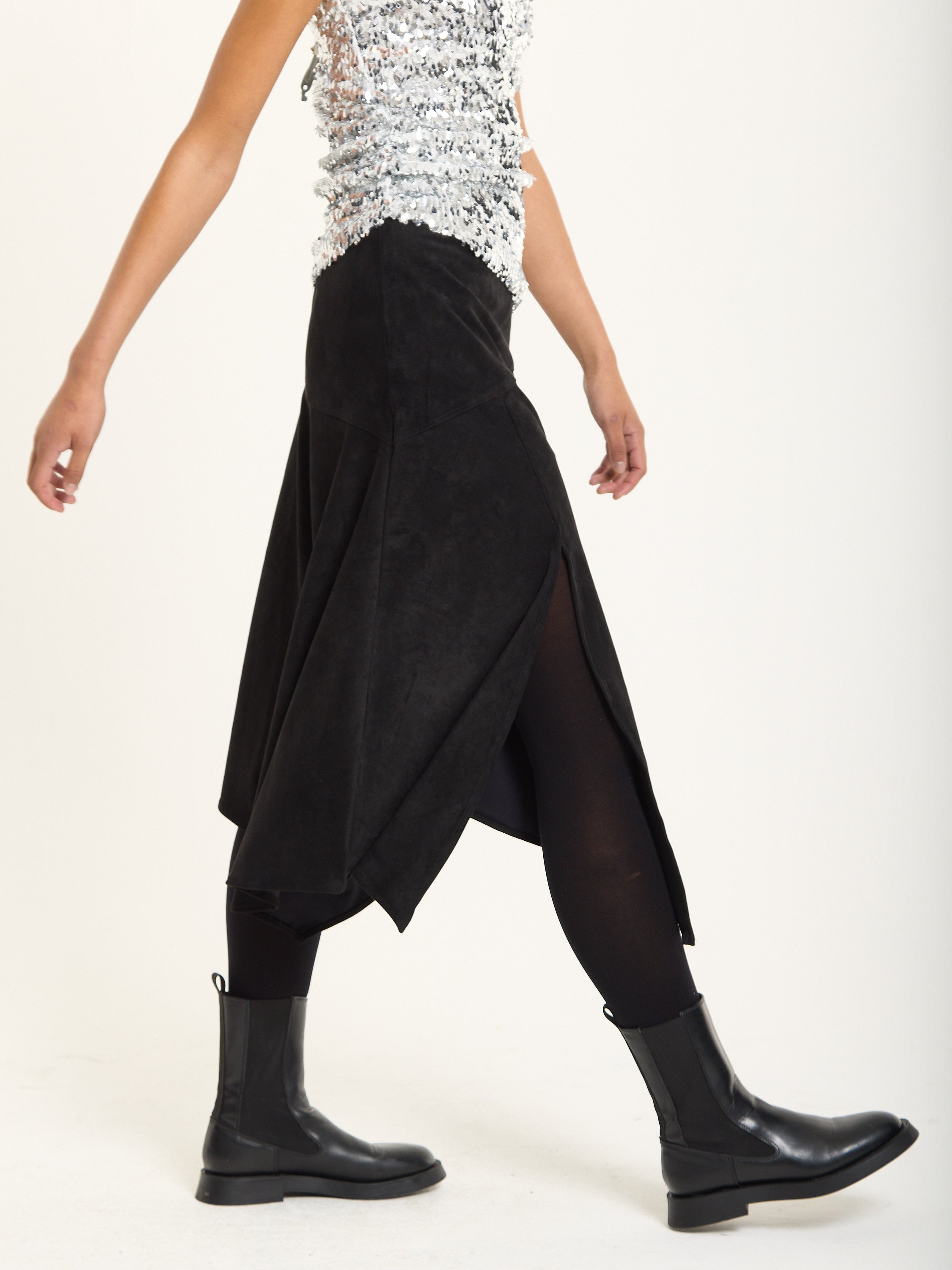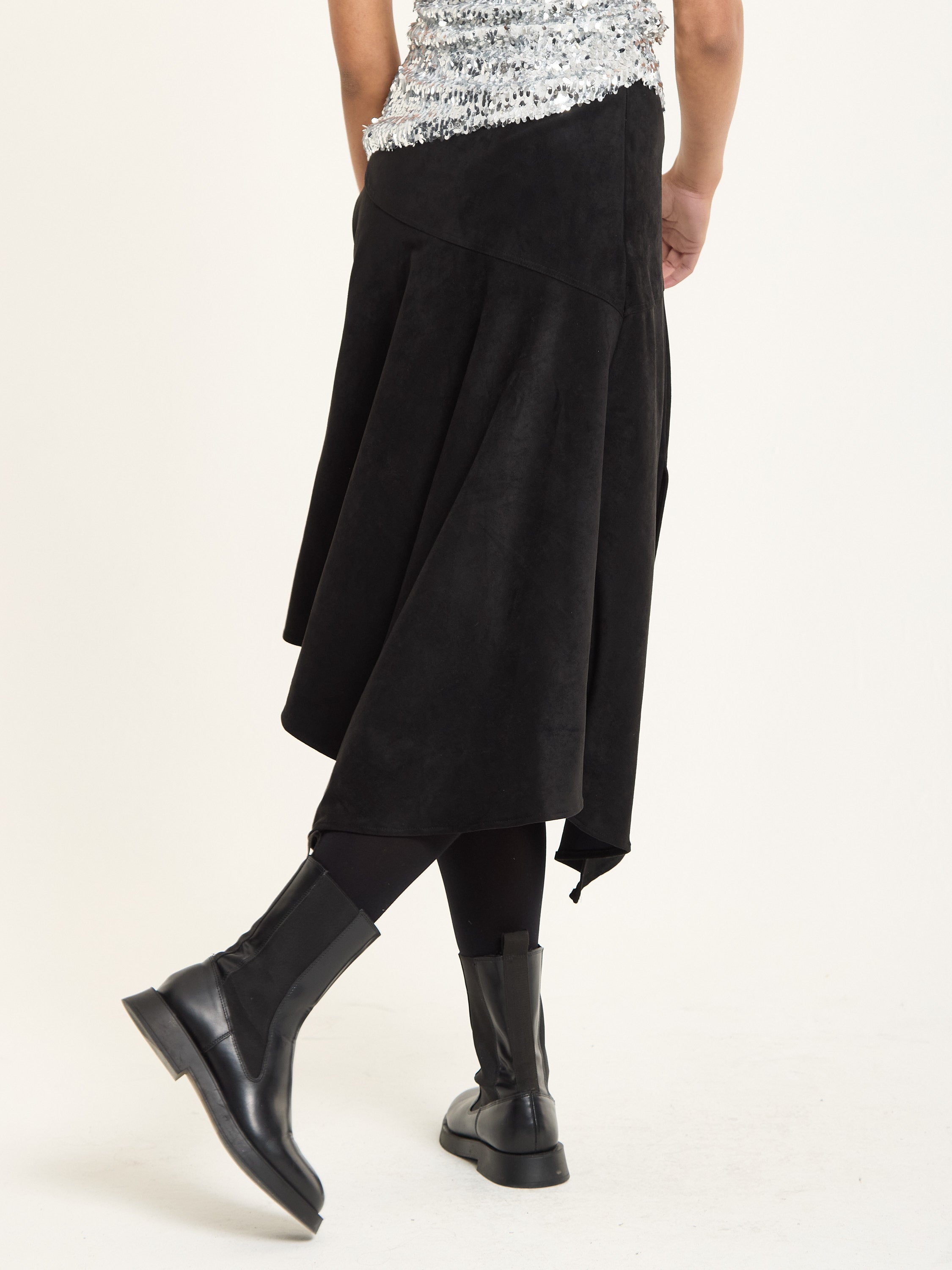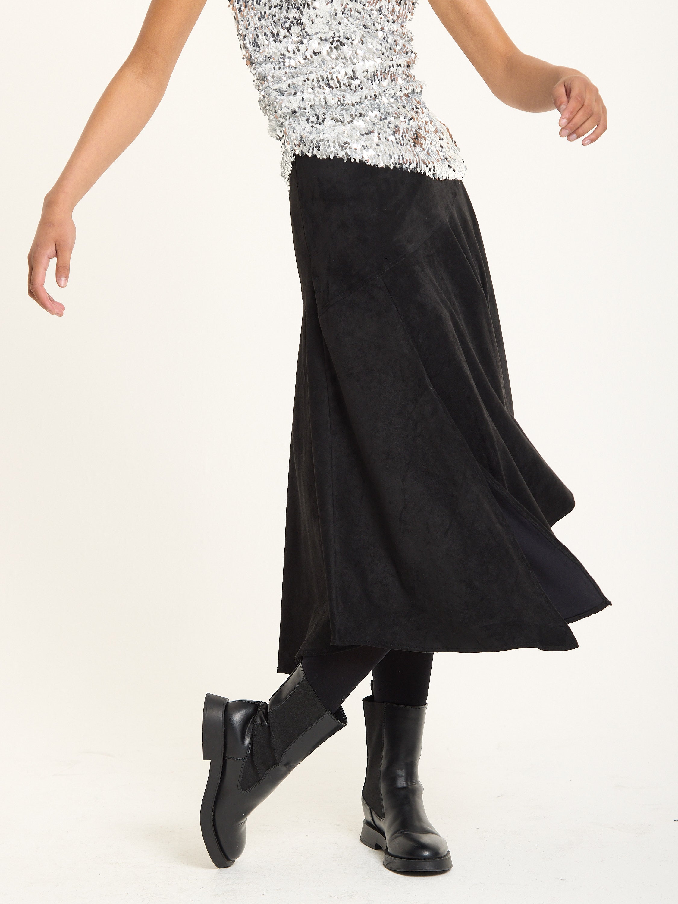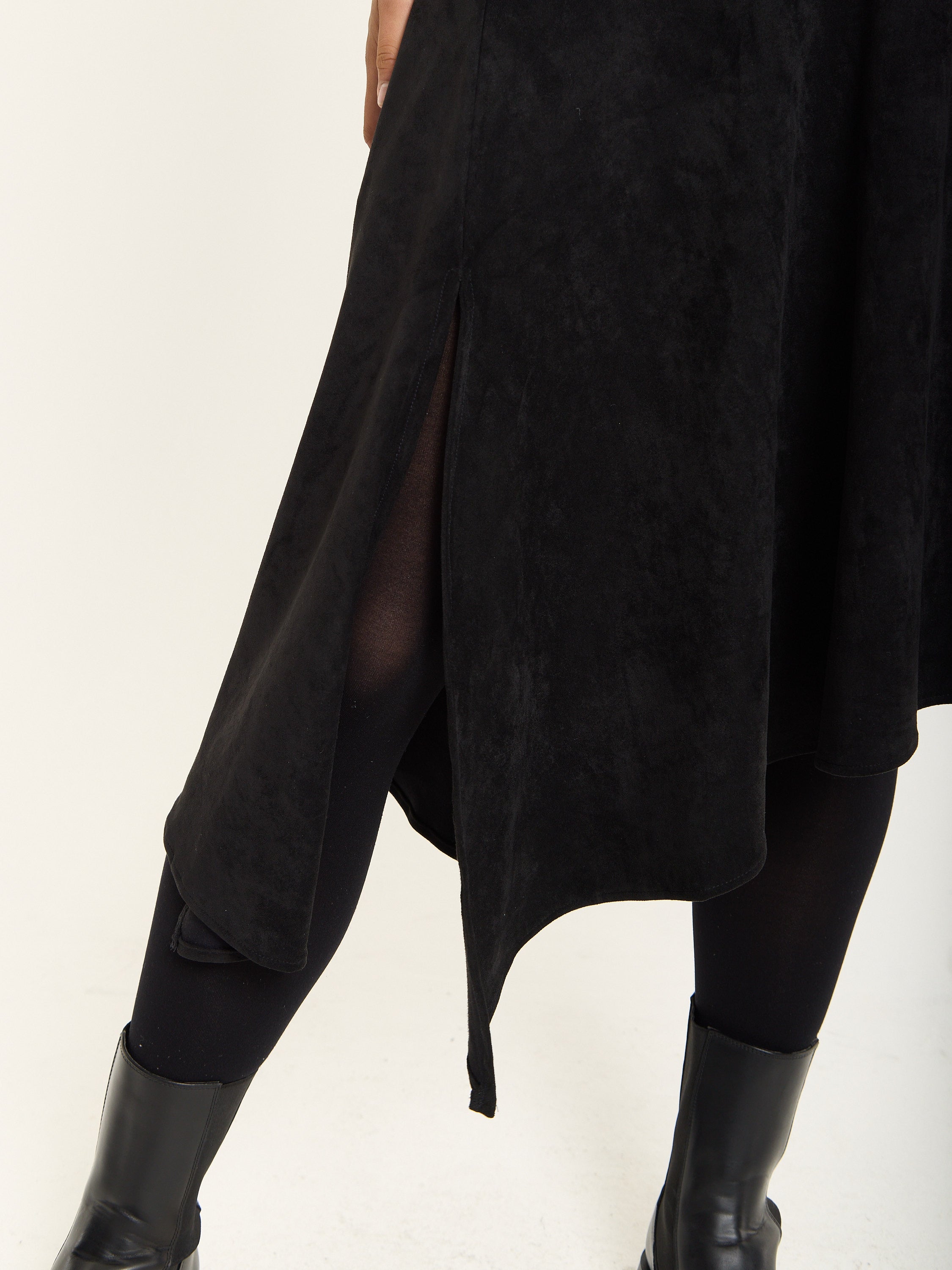 A sleek faux suede midi skirt in black featuring an asymmetric hemline and subtle side slits for ease of movement. The soft suede texture gives a luxurious feel, perfect for adding depth and edge to your look.