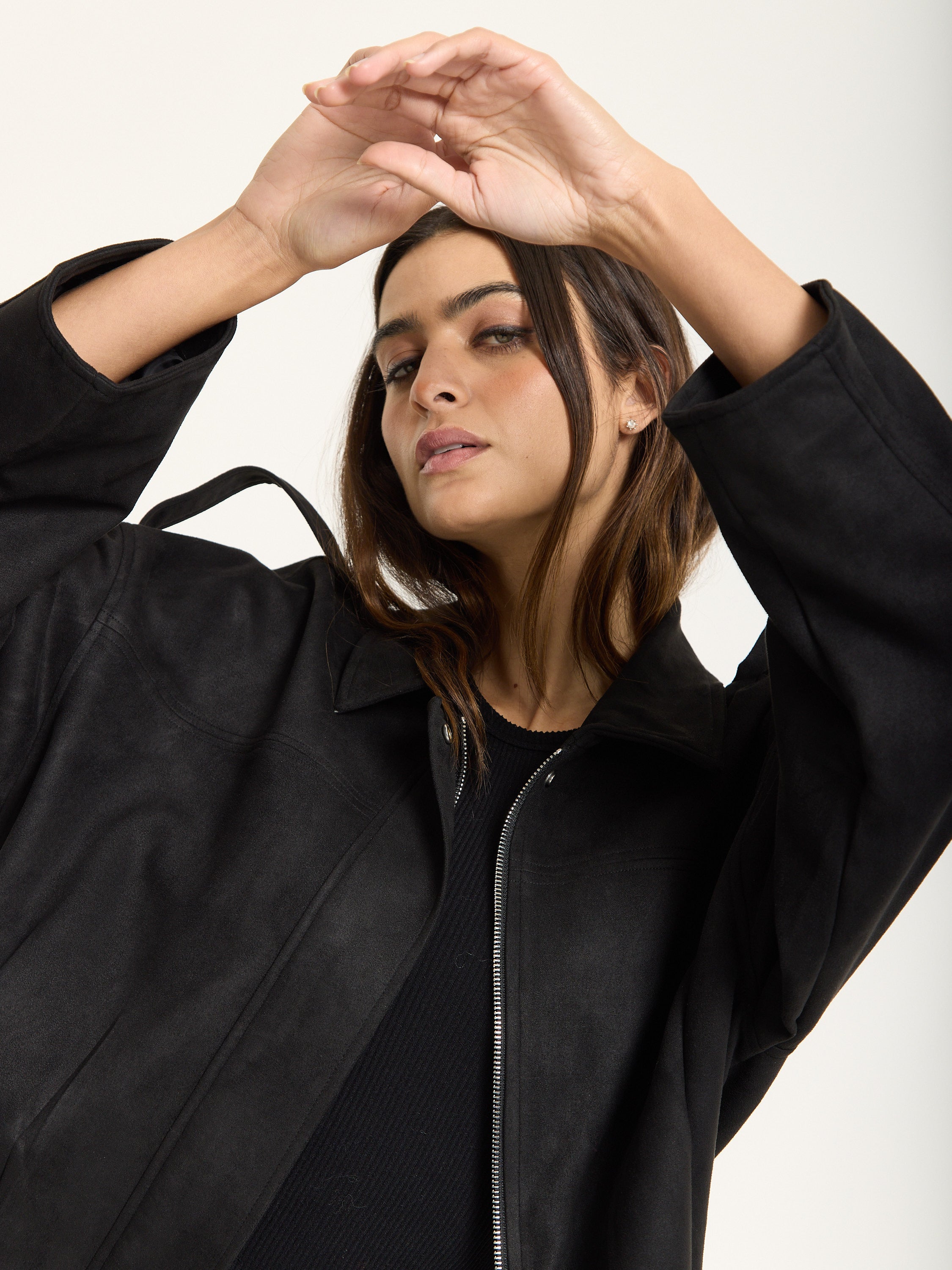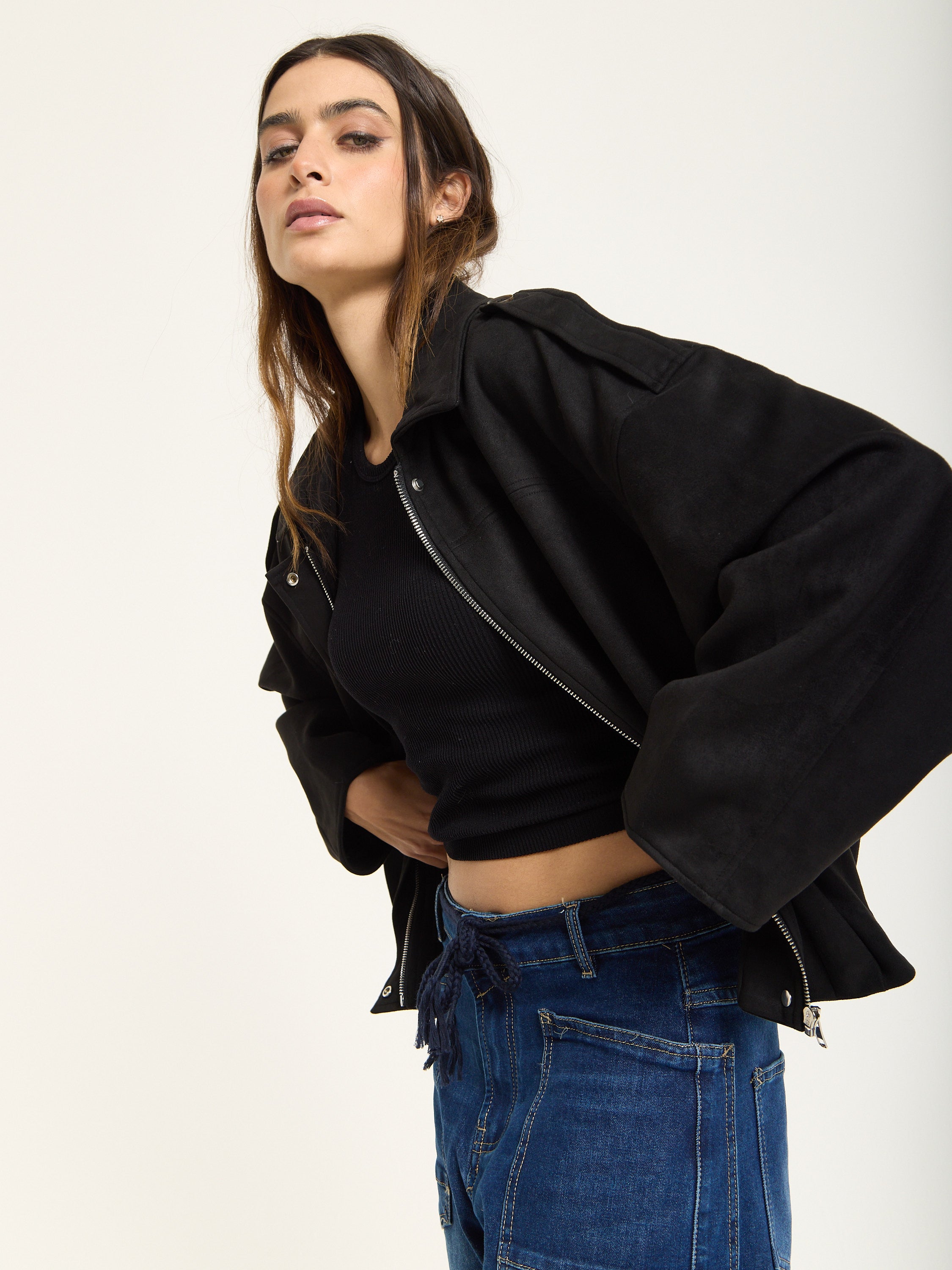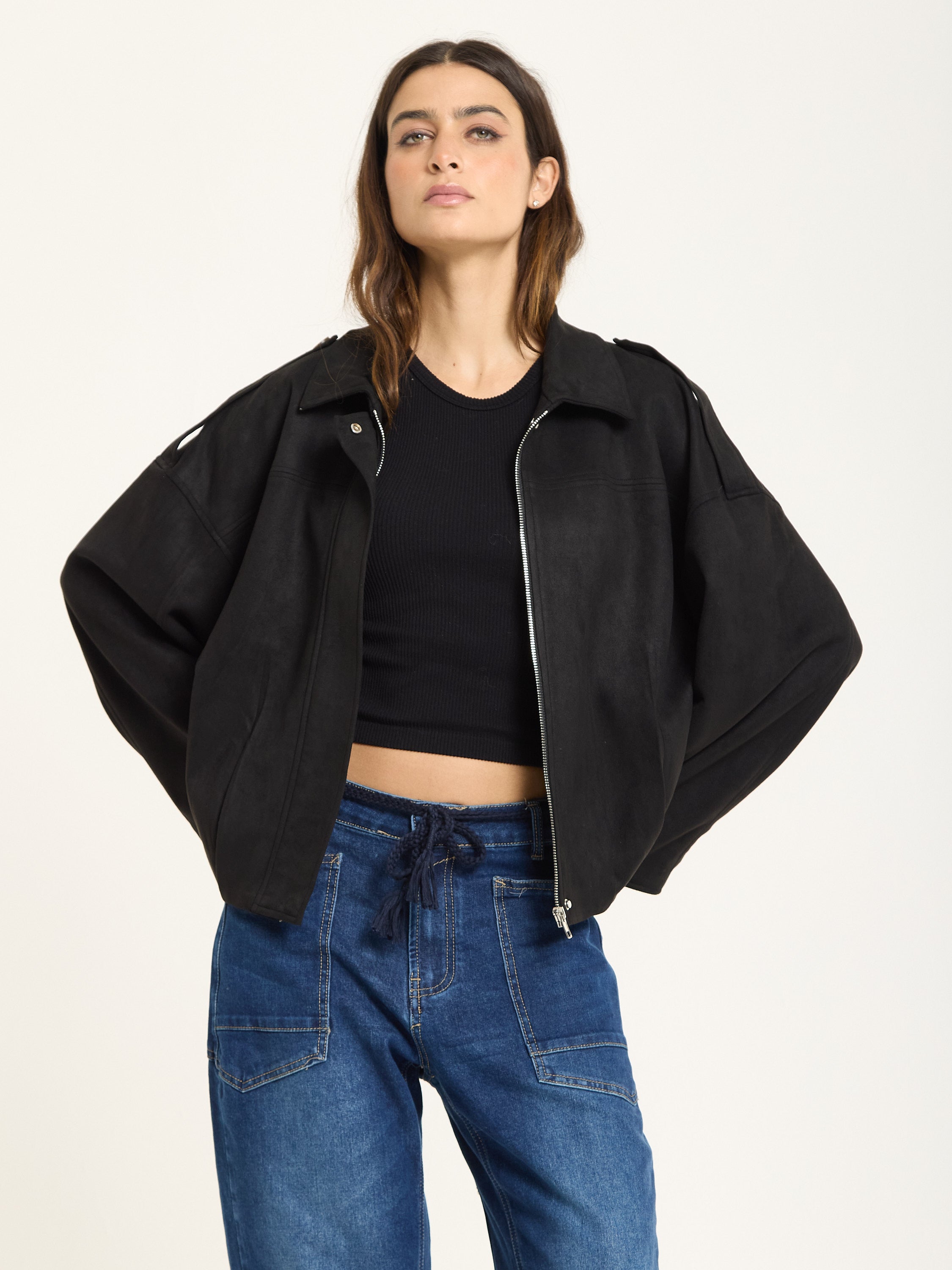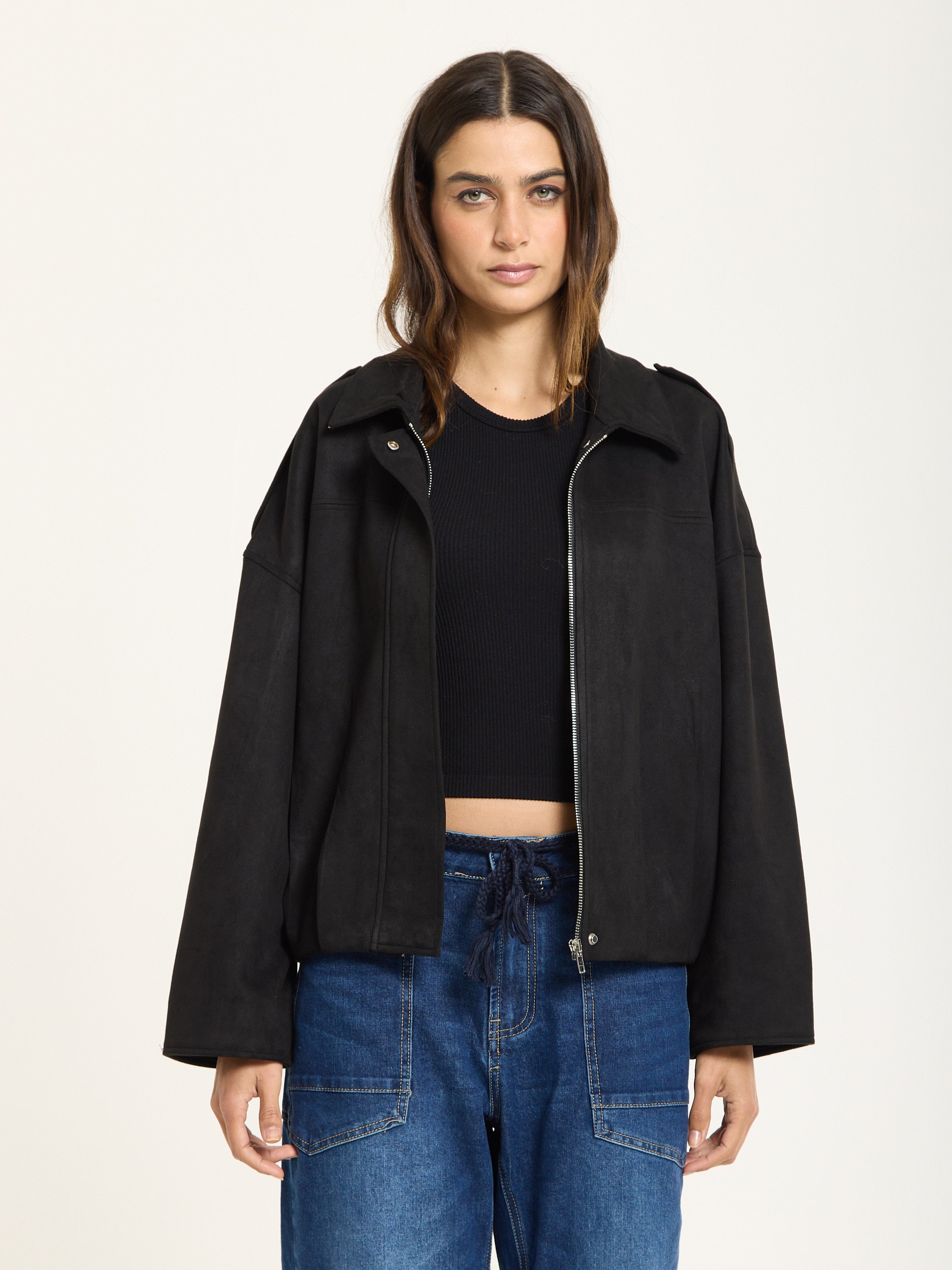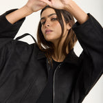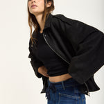 A modern twist on utilitarian style, this wool-blend jacket combines structured tailoring with a relaxed, boxy silhouette. Designed with dropped shoulders, a zip front closure, and subtle shoulder tabs, it brings effortless edge to any outfit. The soft, brushed texture of the fabric adds warmth and comfort, making it a versatile layer for transitional seasons.