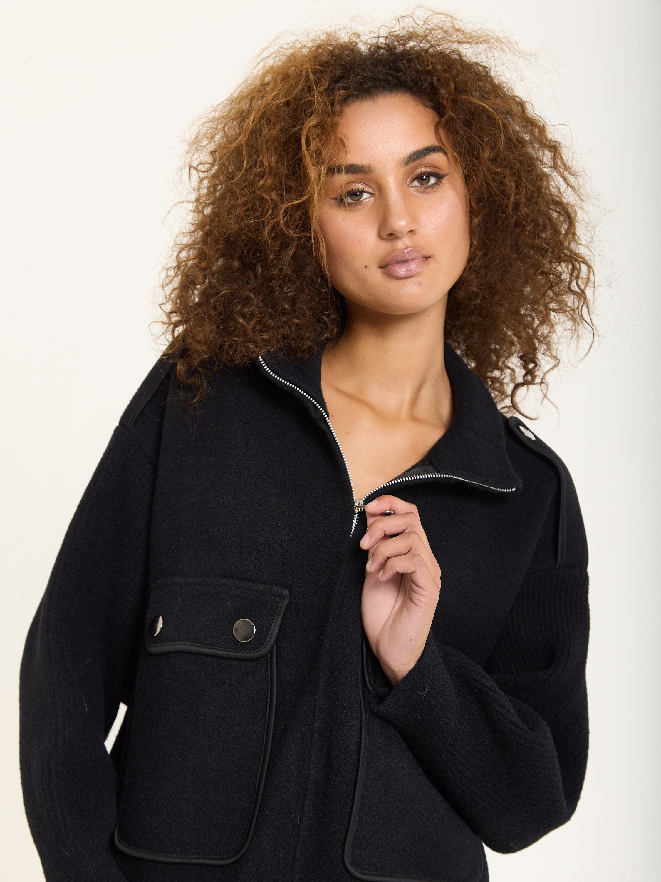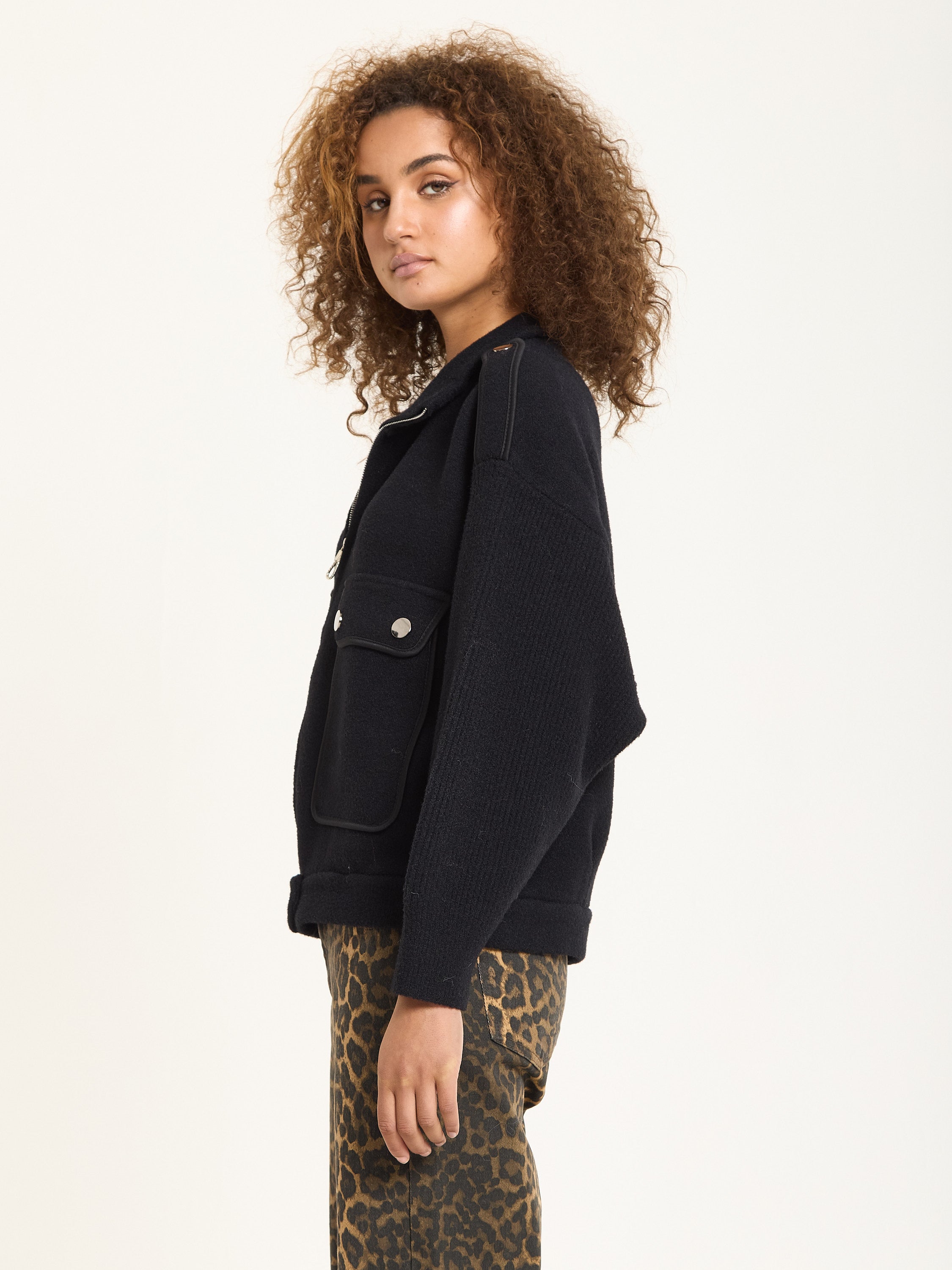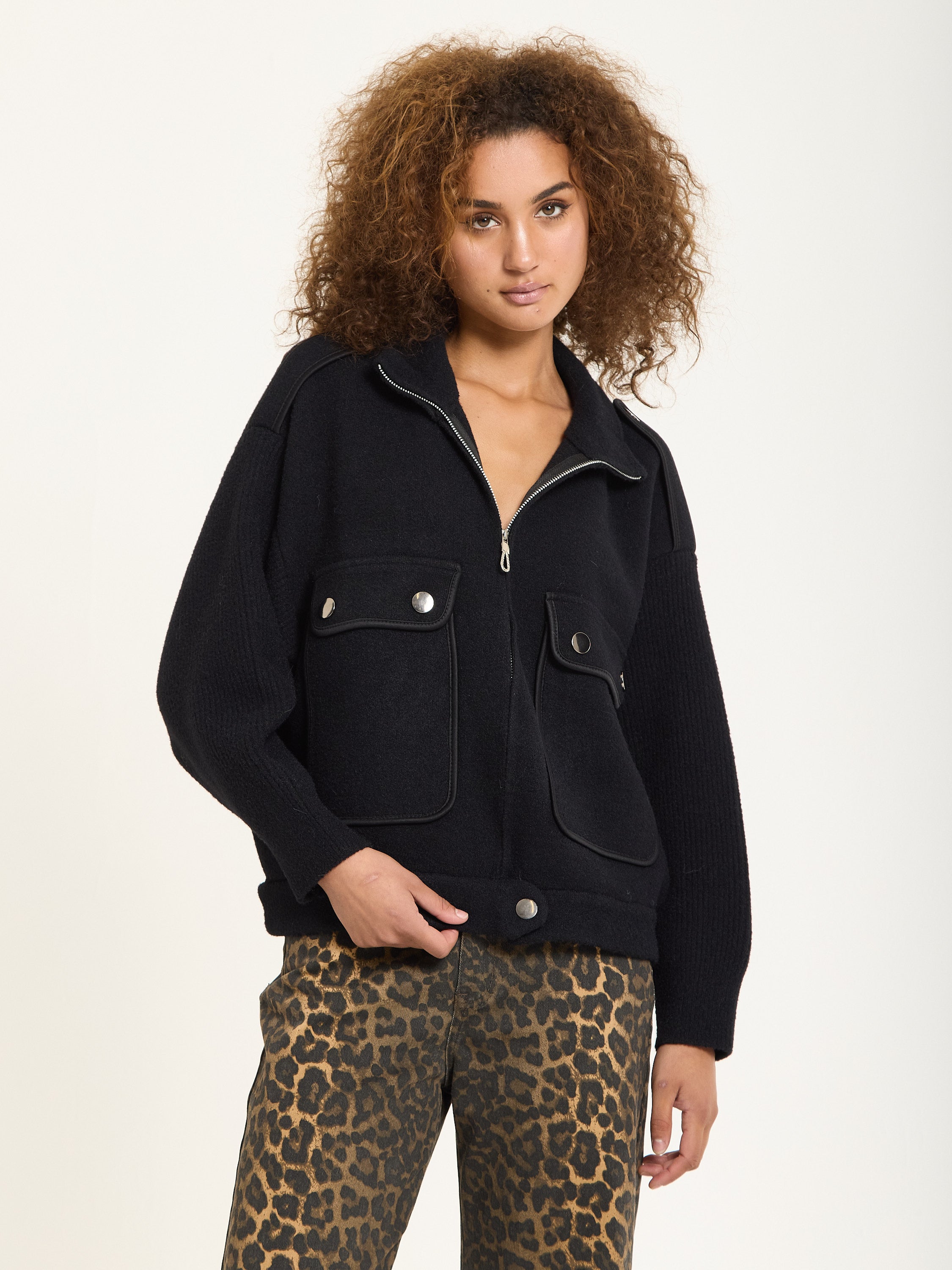 A structured black knit bomber jacket featuring a zip closure, large front flap pockets, and snap button details. Its clean, boxy fit and ribbed texture give it a modern utility look with a soft, cozy feel — perfect for layering in cooler weather.