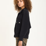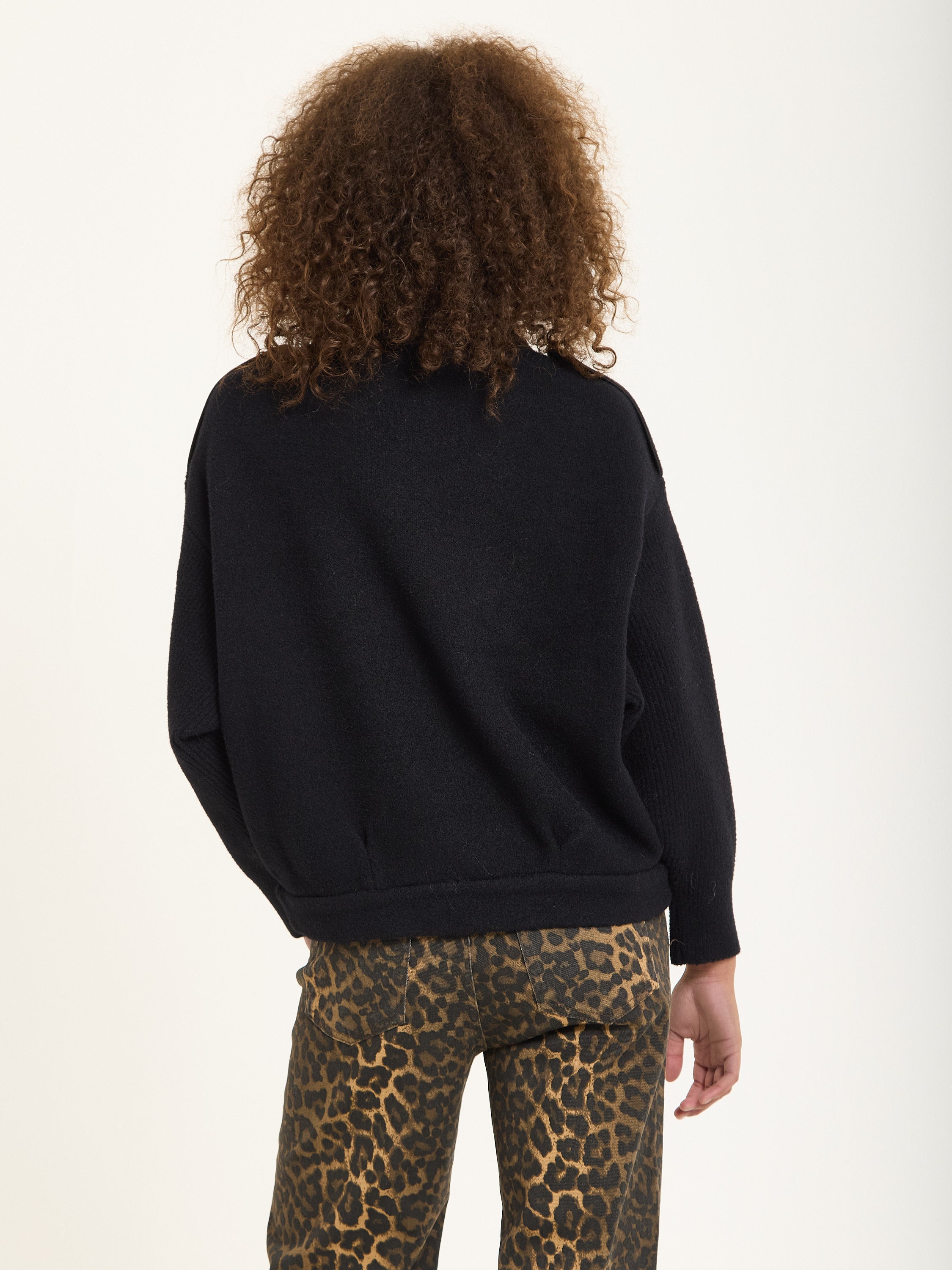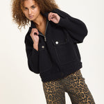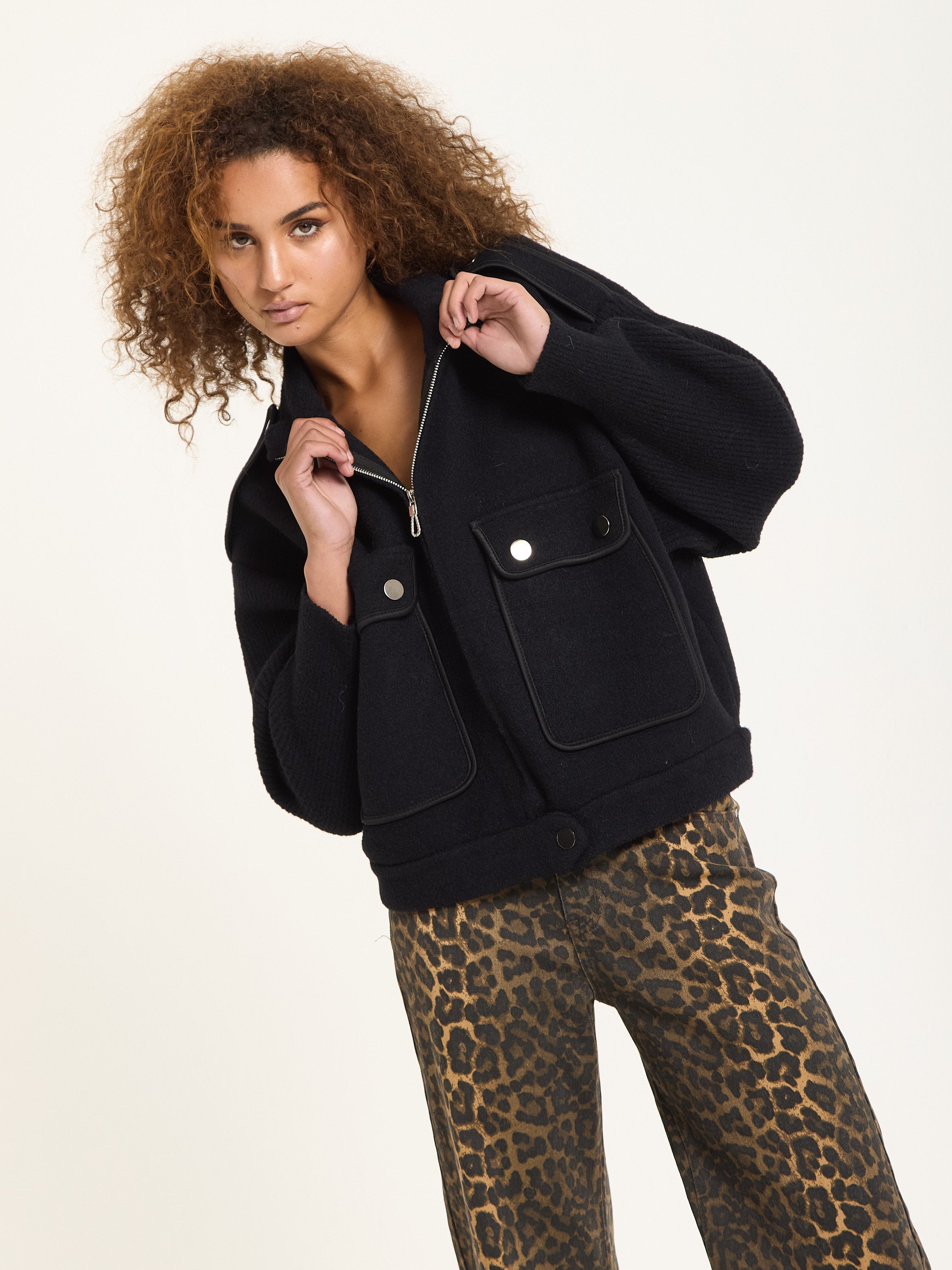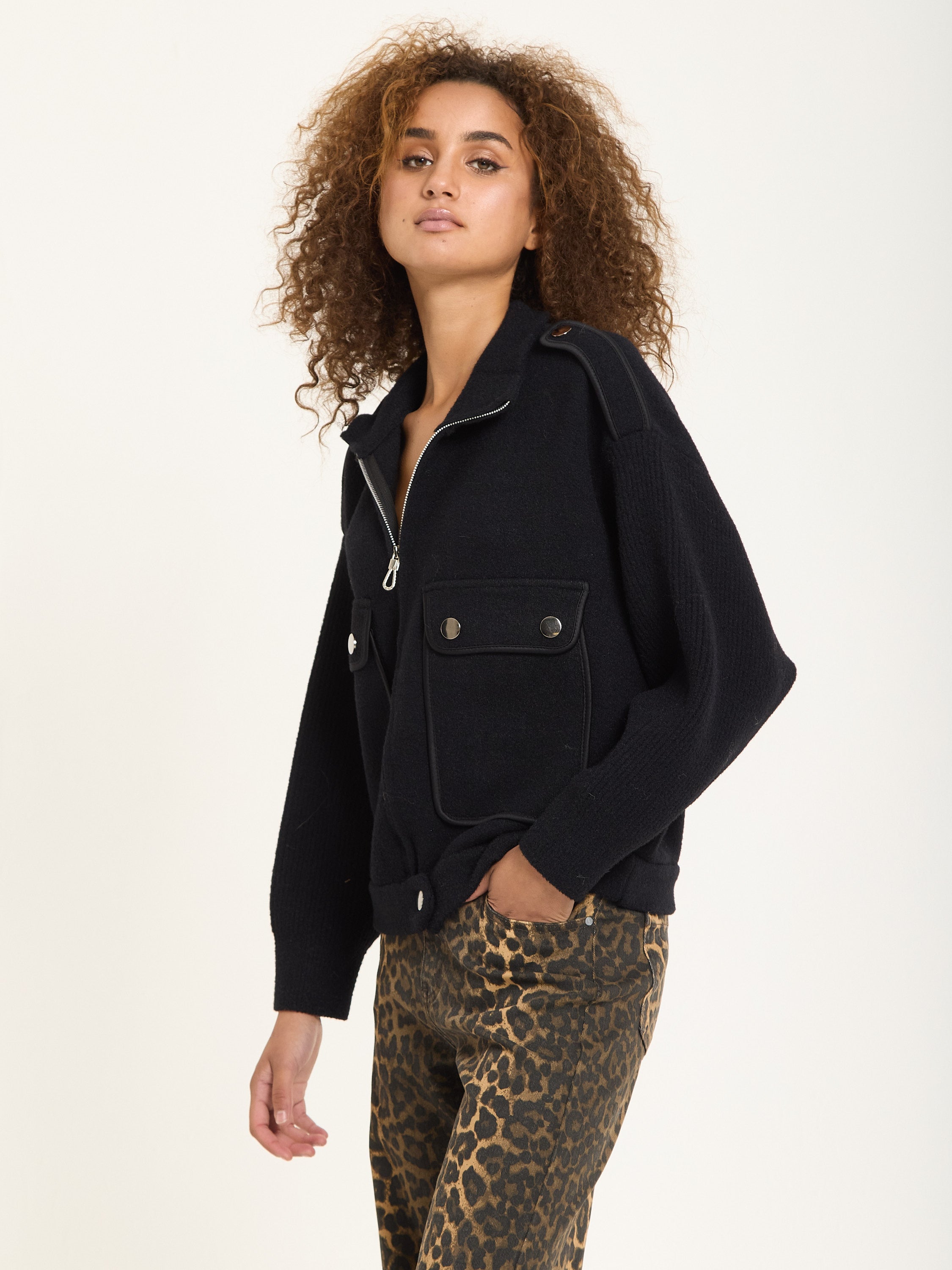 A structured black knit bomber jacket featuring a zip closure, large front flap pockets, and snap button details. Its clean, boxy fit and ribbed texture give it a modern utility look with a soft, cozy feel — perfect for layering in cooler weather.