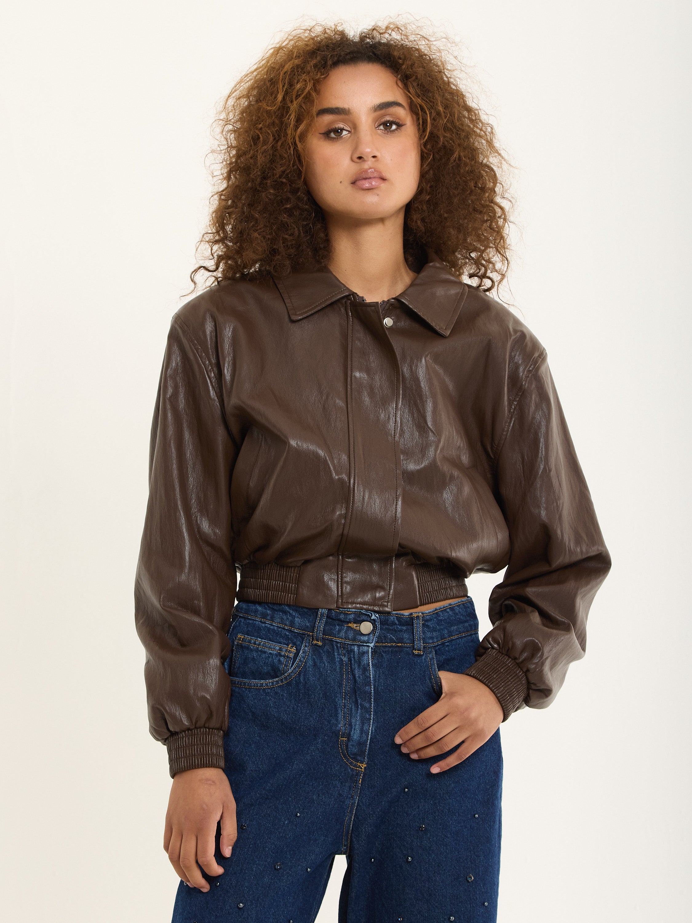 House of Holland Faux Leather Bomber Jacket in Chocolate Brown updates the classic bomber with a rich, modern hue. Designed with a cropped silhouette, elasticated details, and zip fastening, it’s a versatile layering piece that adds understated edge to any outfit.