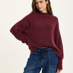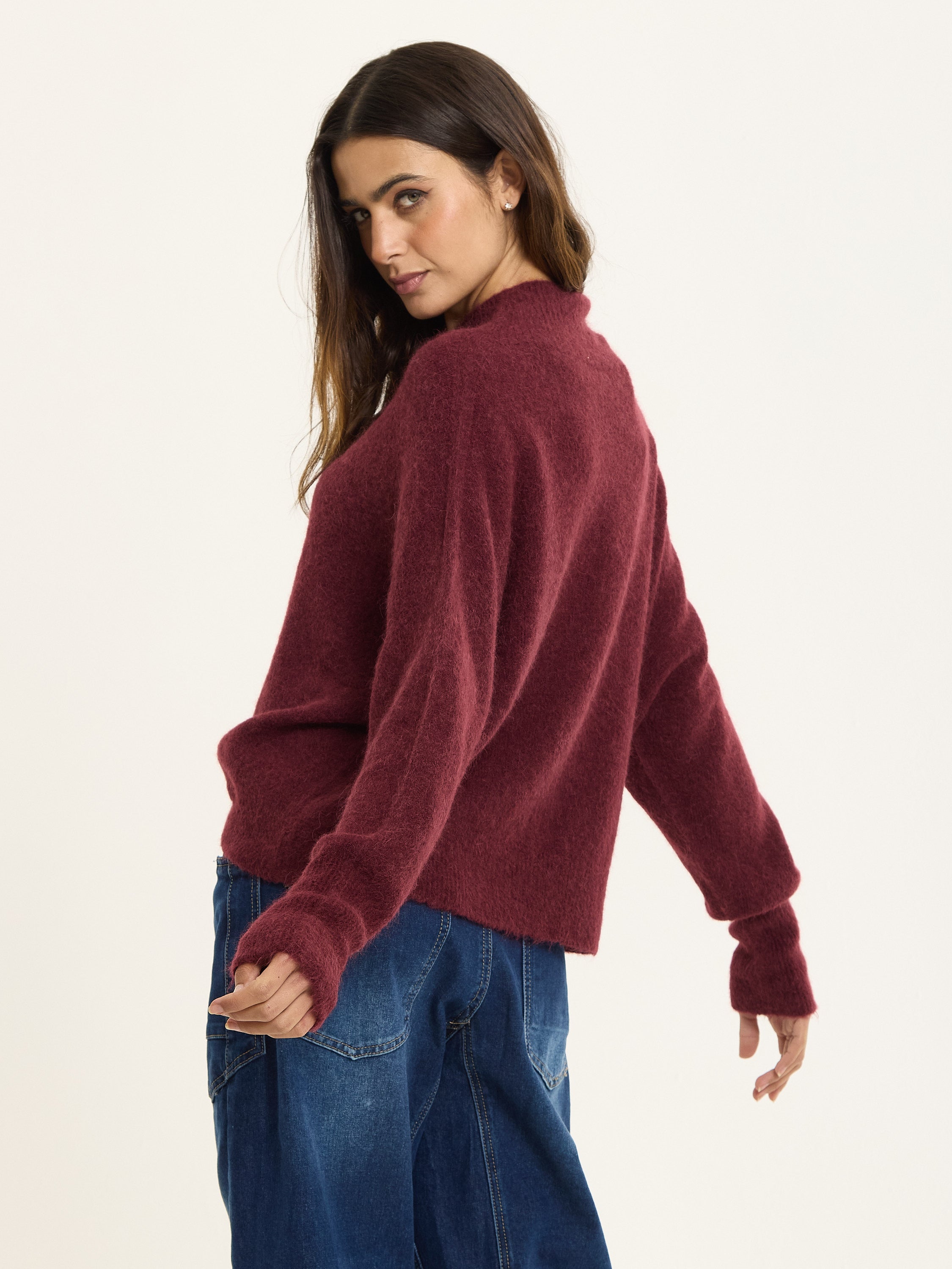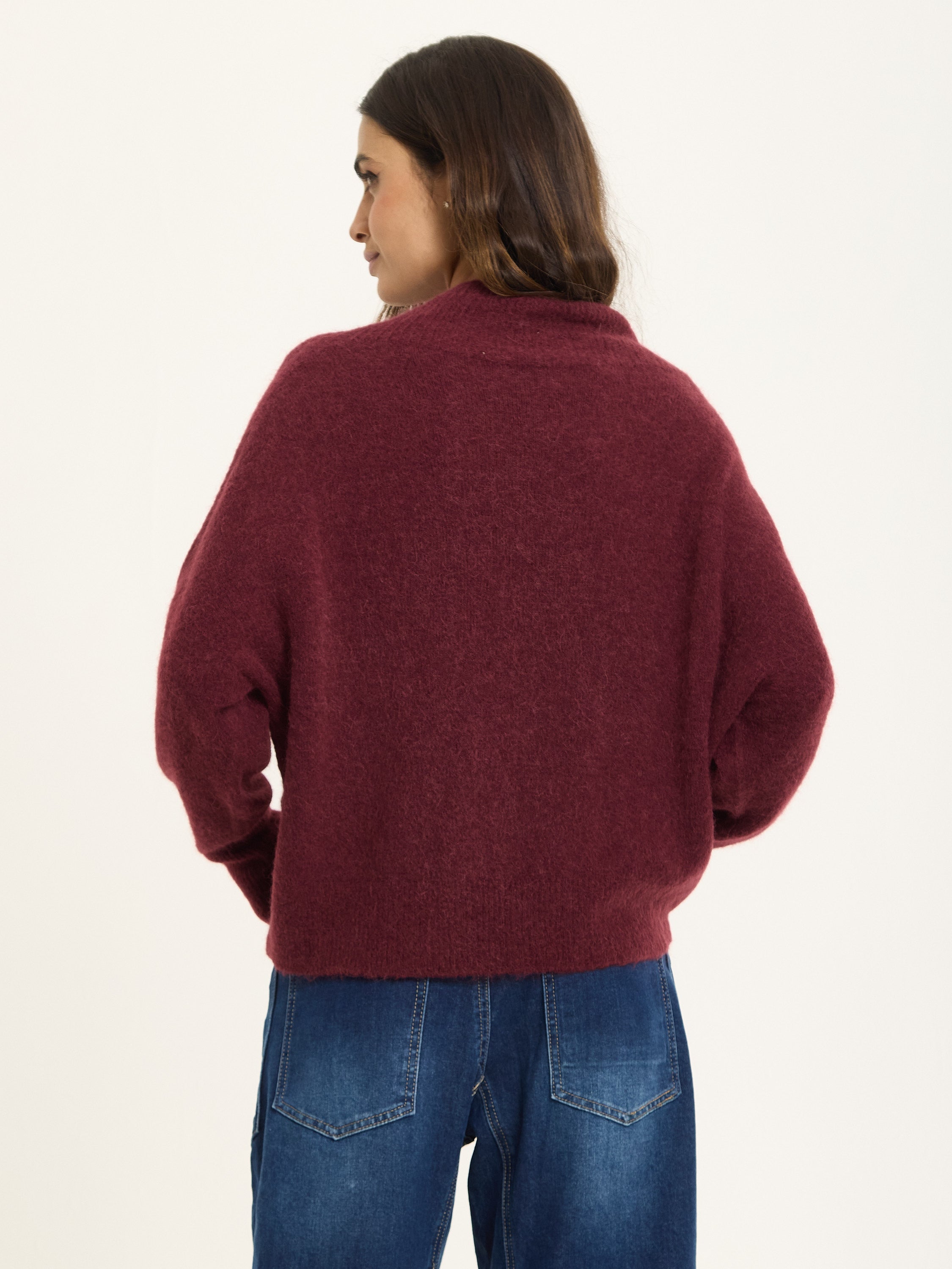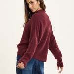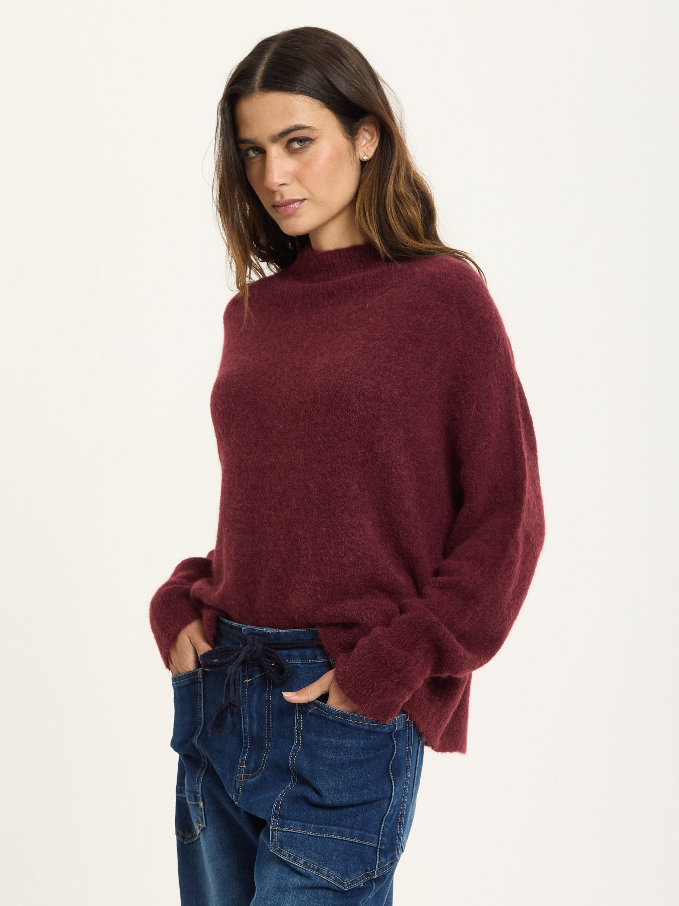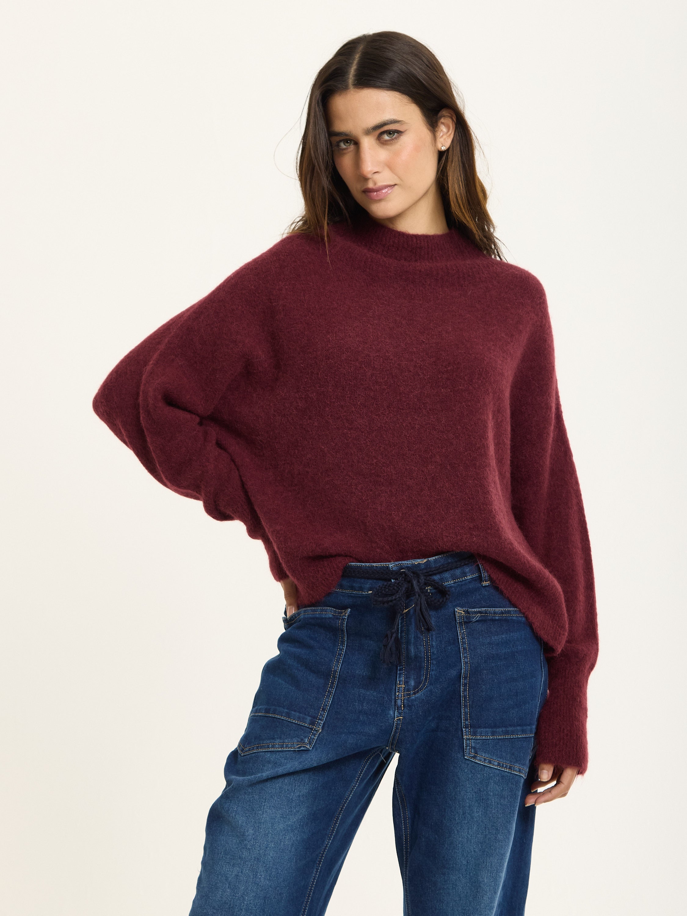 This cozy oversized sweater is crafted from a soft wool blend in a deep burgundy hue. Designed with a relaxed silhouette, dropped shoulders, and ribbed trims, it delivers effortless comfort and a refined casual look.