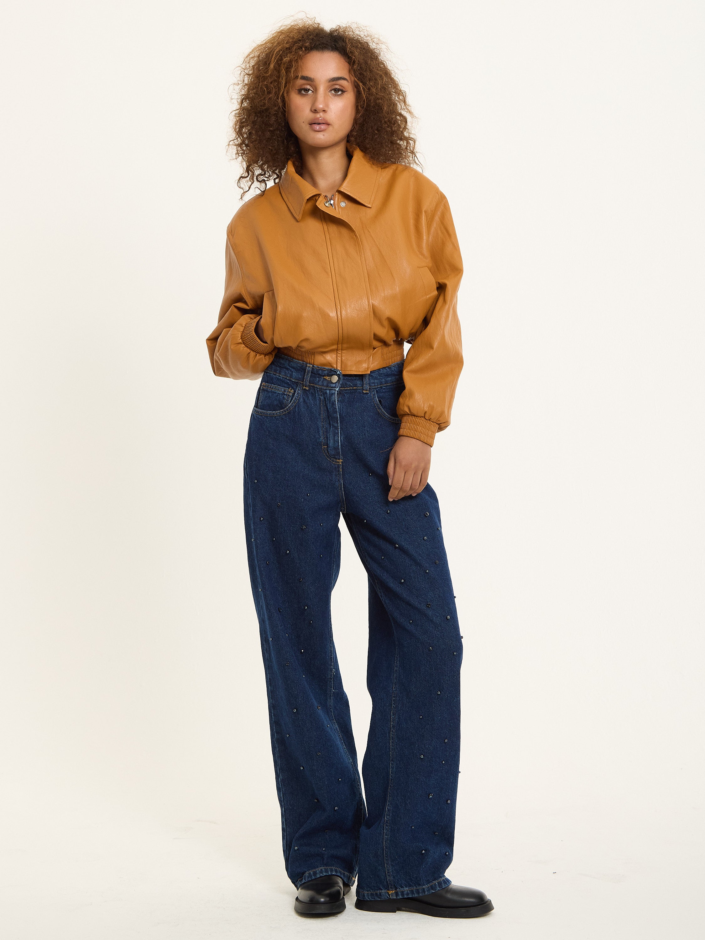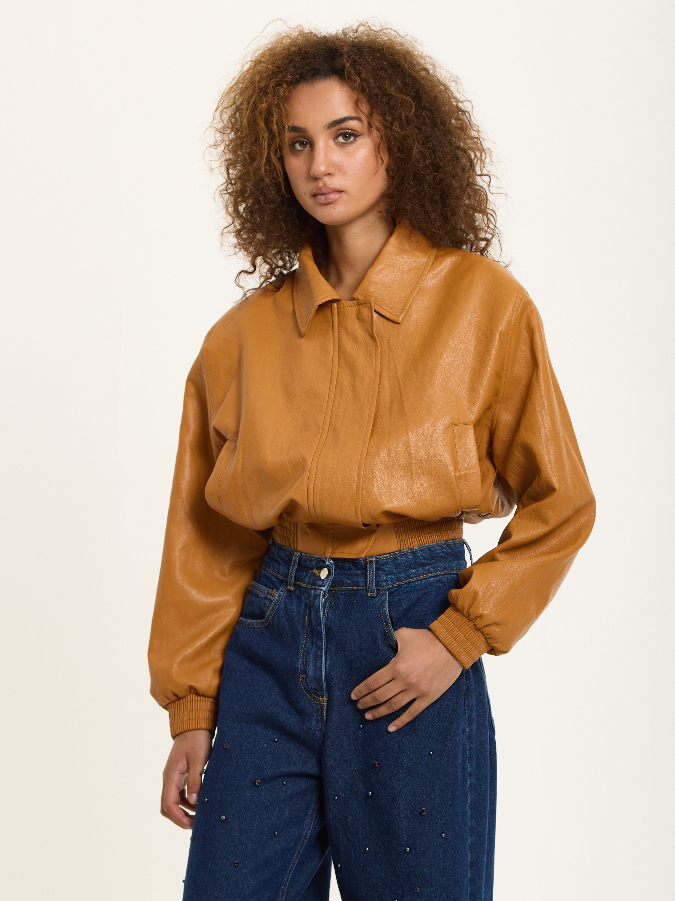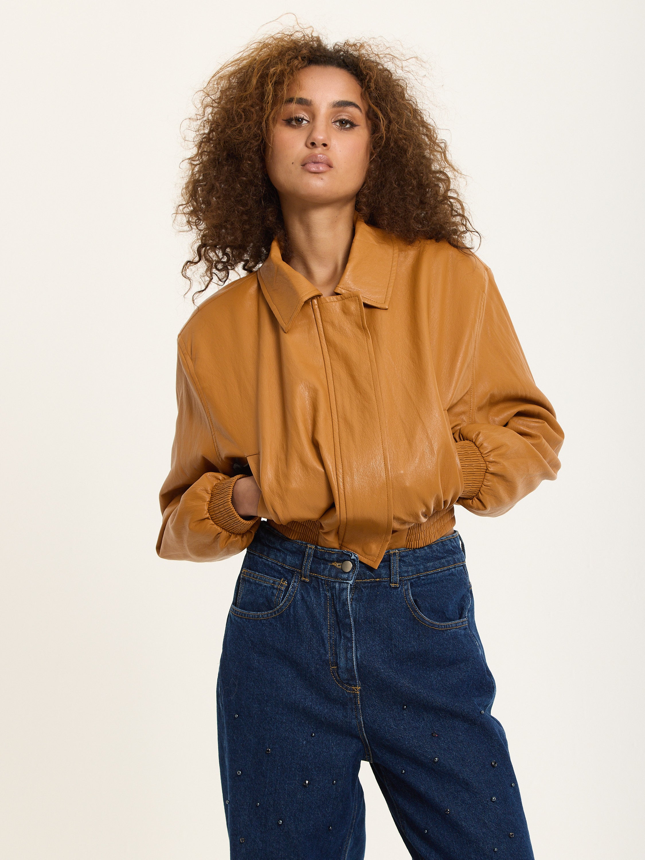 Tan Faux Leather Bomber Jacket by House of Holland brings a retro twist to your everyday edit. Cut in a relaxed cropped shape with a zip-up front and elasticated trims, this piece blends warmth and attitude. Its caramel hue adds a soft yet strong edge to your look.