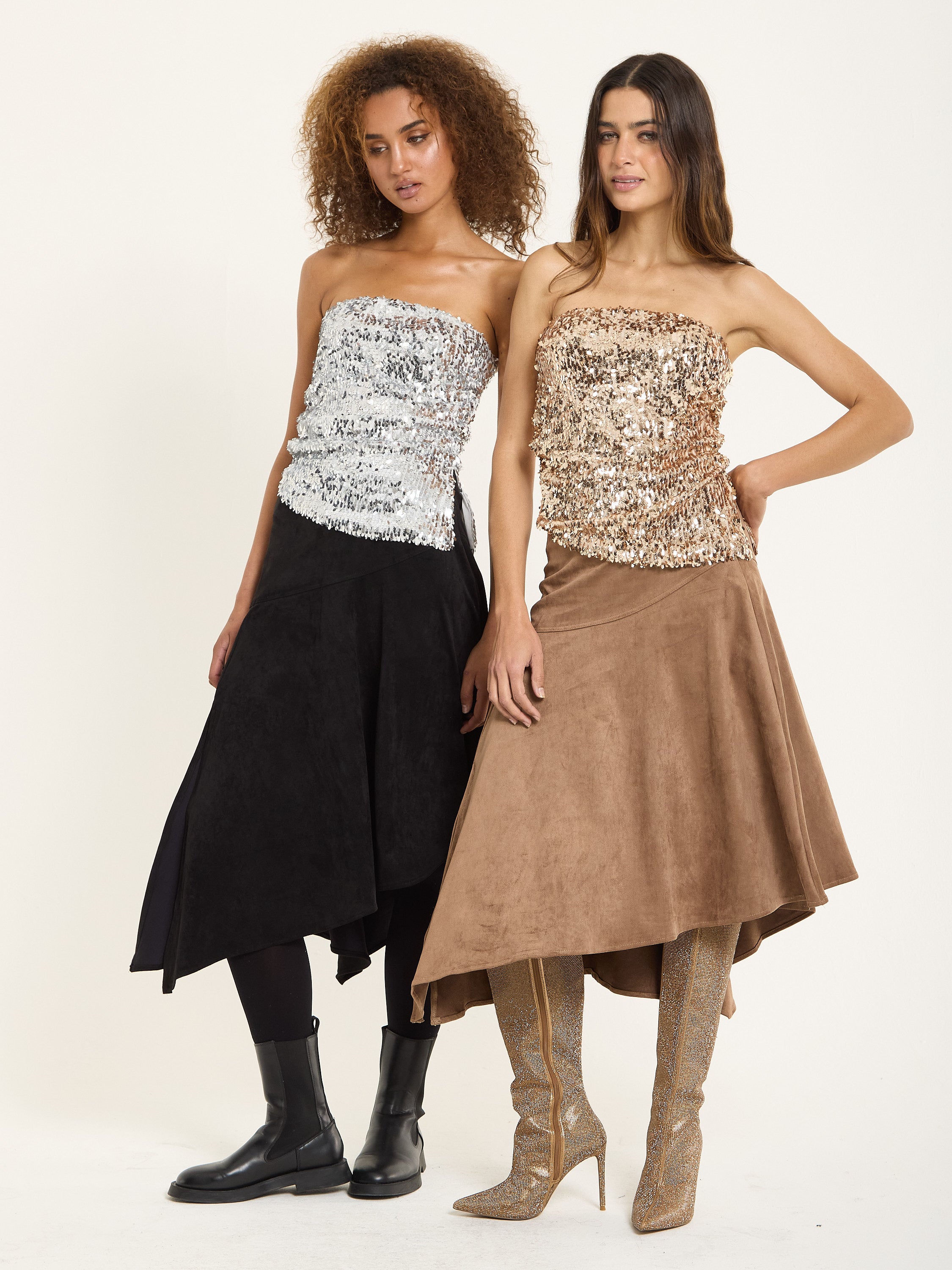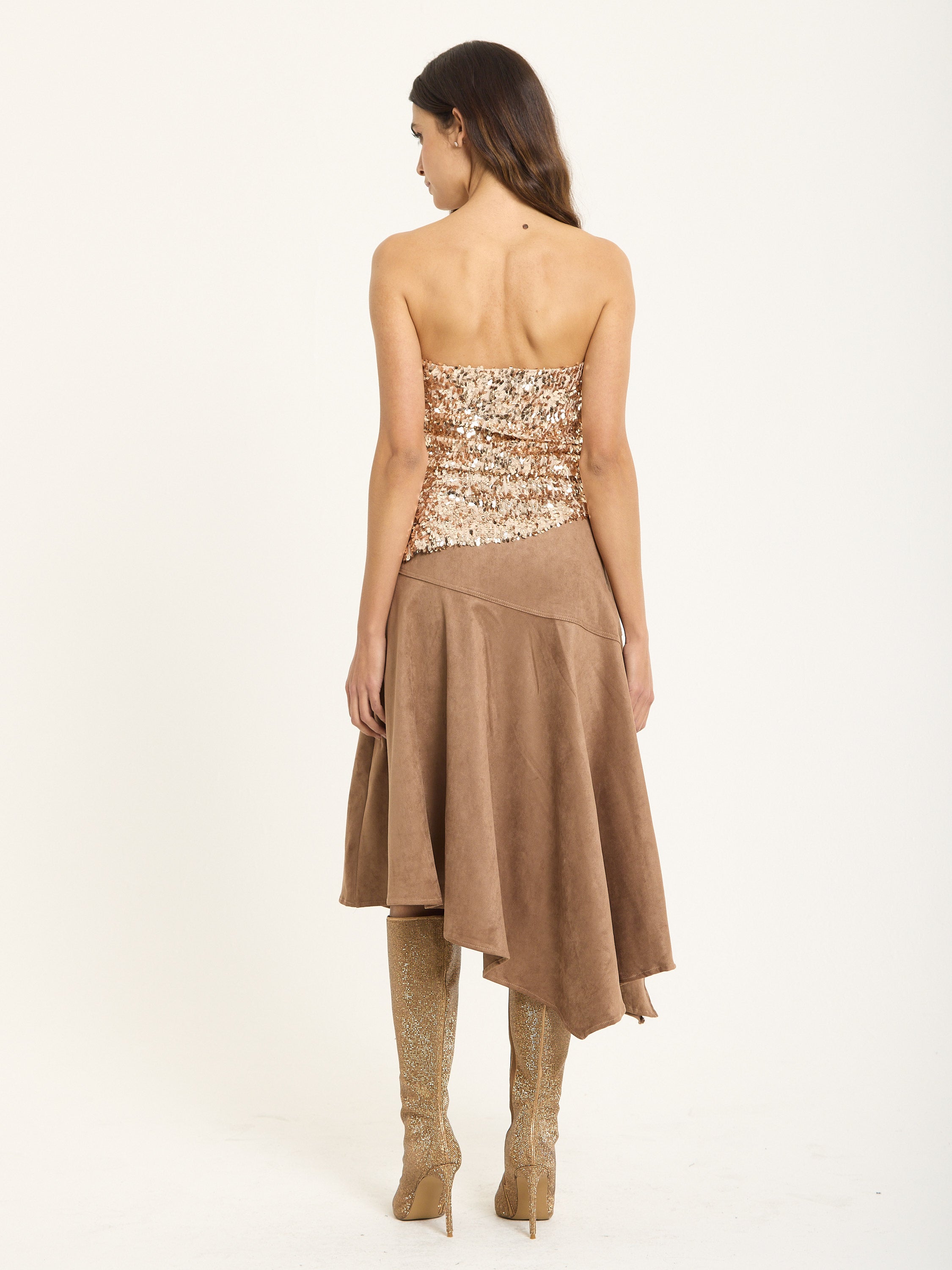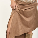 An elegant faux suede midi skirt in warm camel, designed with an asymmetric hemline and soft drape. The rich suede texture offers a touch of luxury while maintaining comfort and fluid movement.