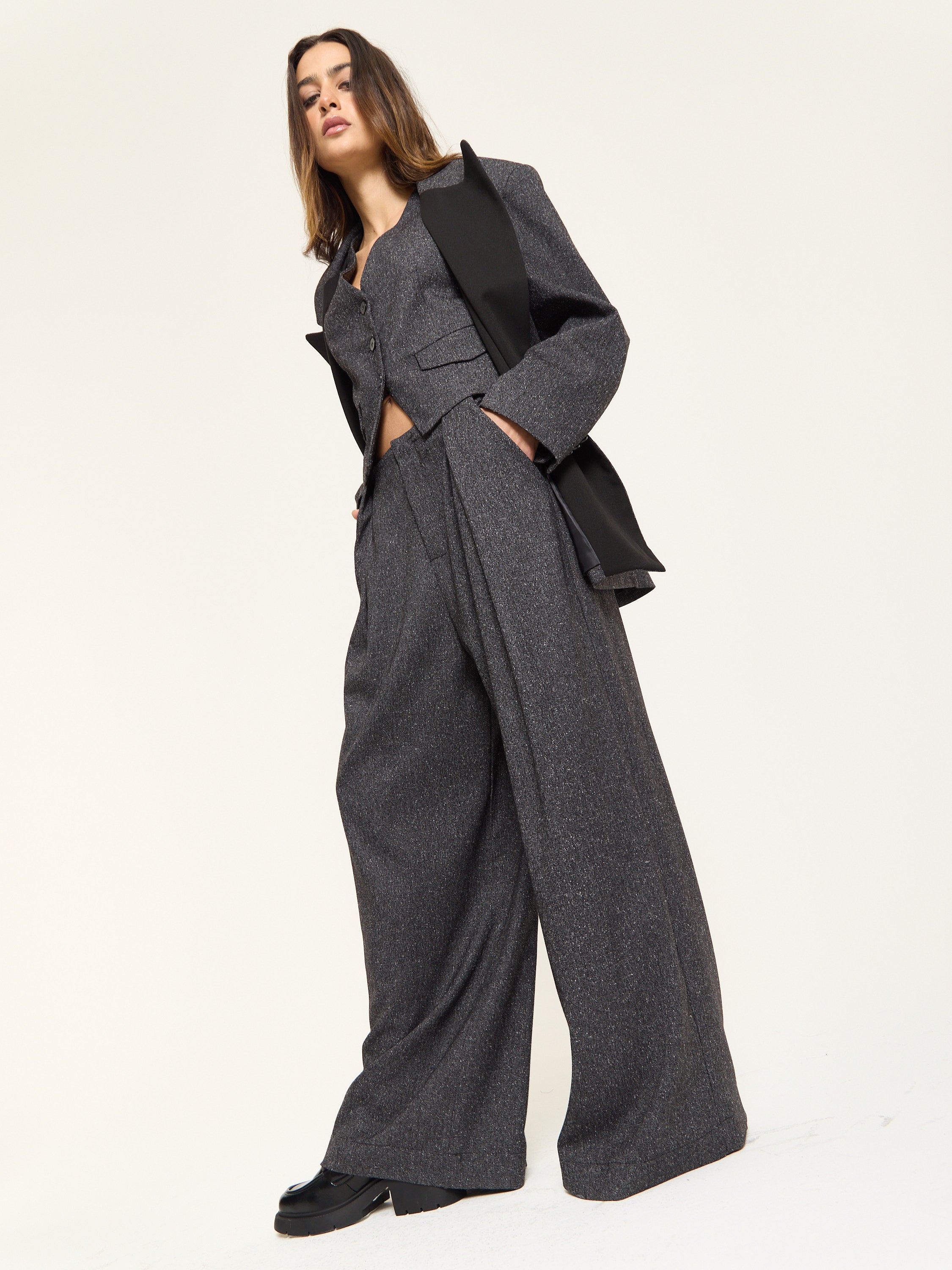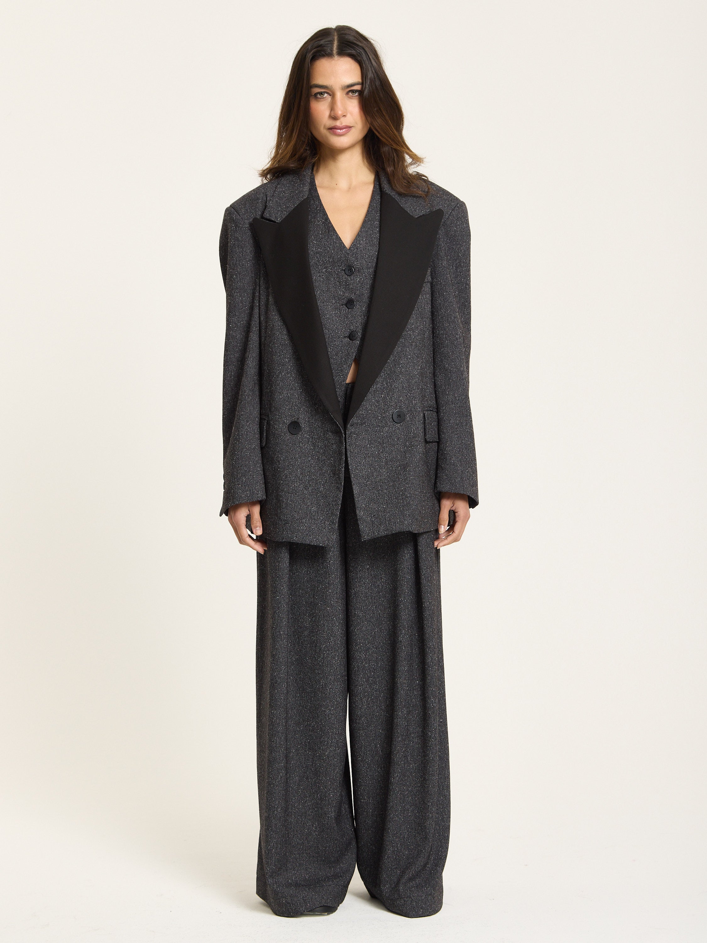 Sharp tailoring meets effortless cool in this Charcoal Oversized Jacket. Designed with strong shoulders, contrast satin lapels, and a relaxed fit, it captures modern power dressing with a touch of rebellion. Crafted from a rich charcoal-grey fabric with subtle texture, this jacket is made to elevate any look — from daytime denim to after-hours suiting.