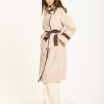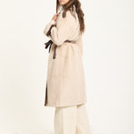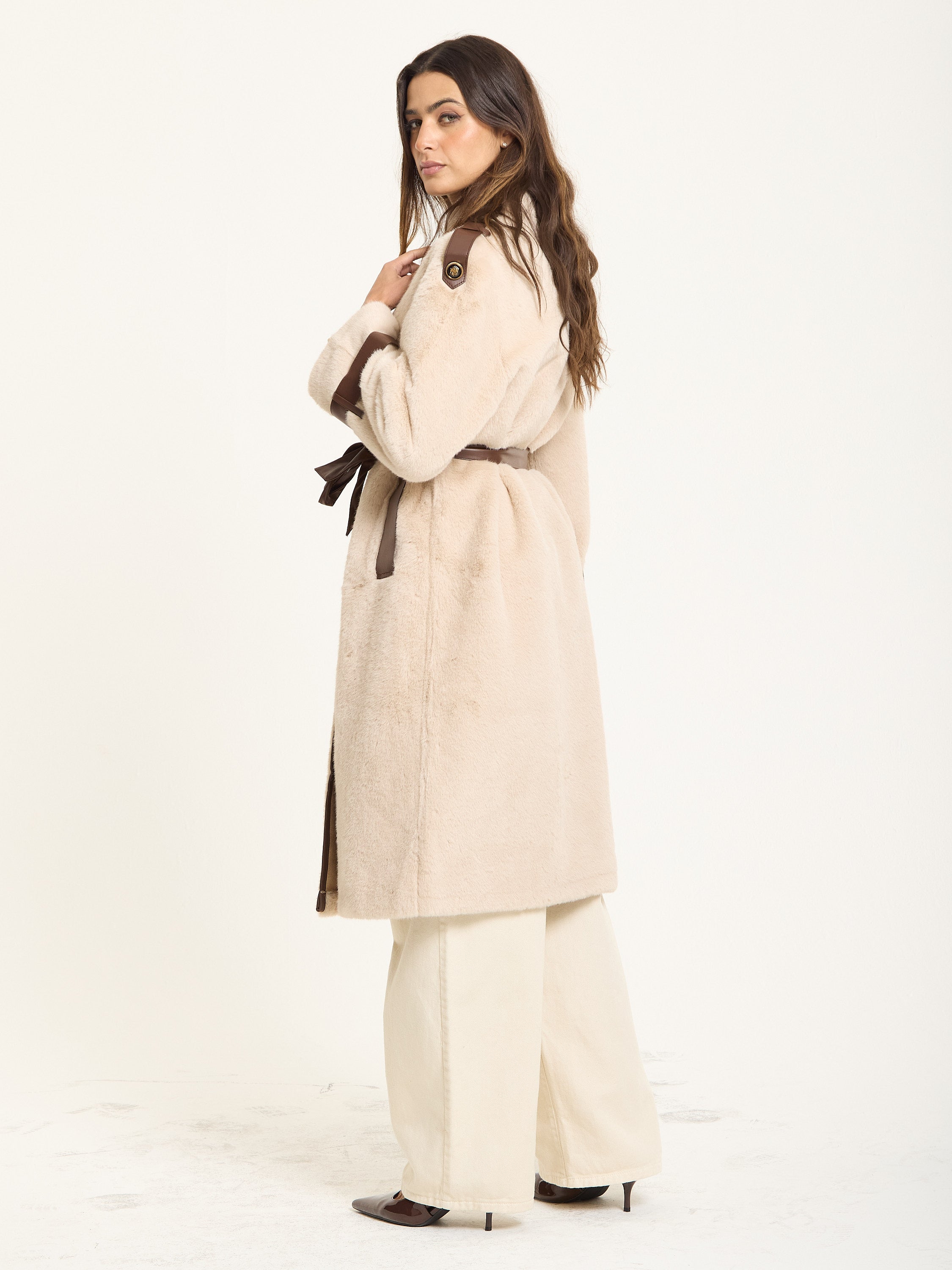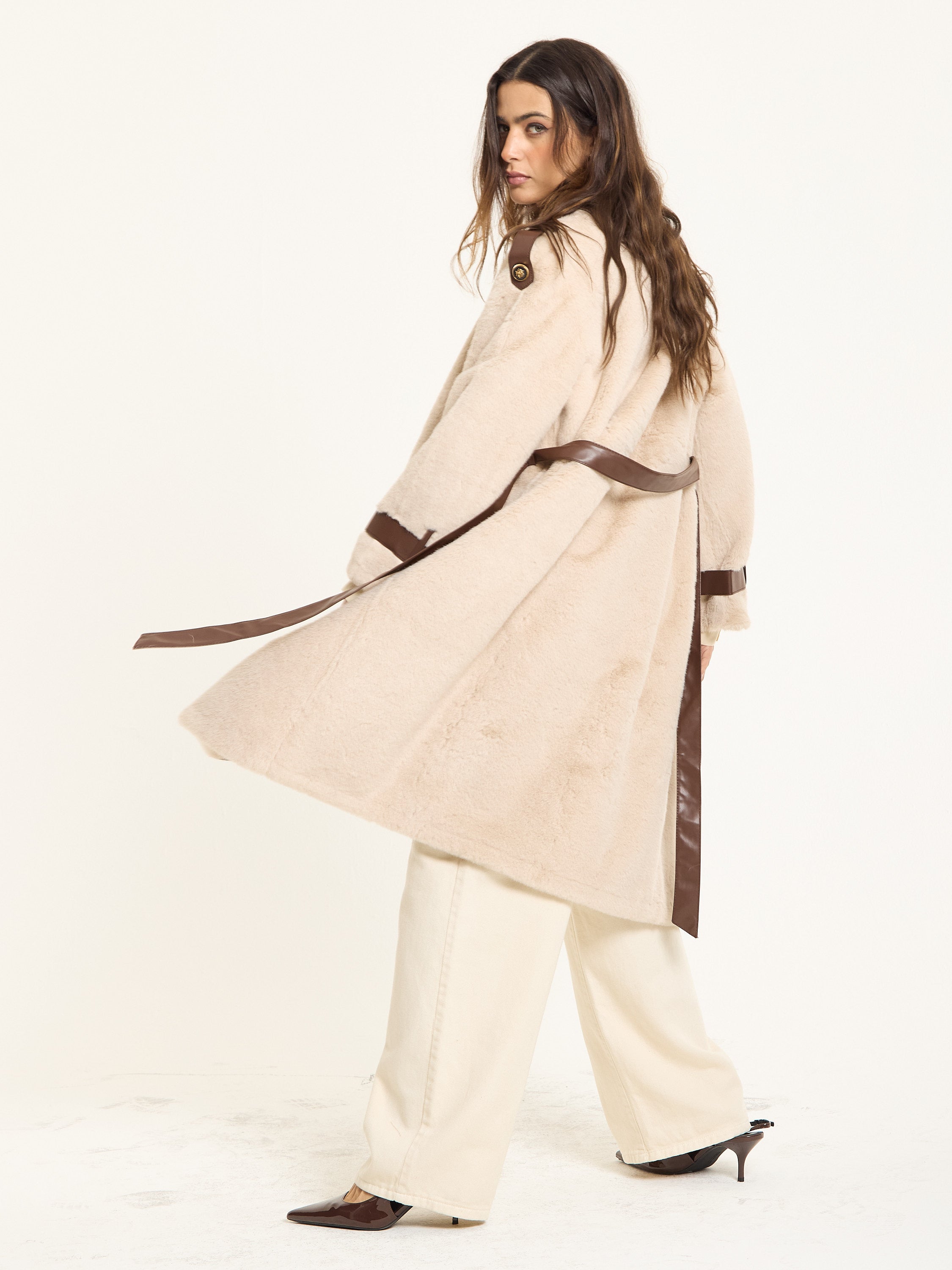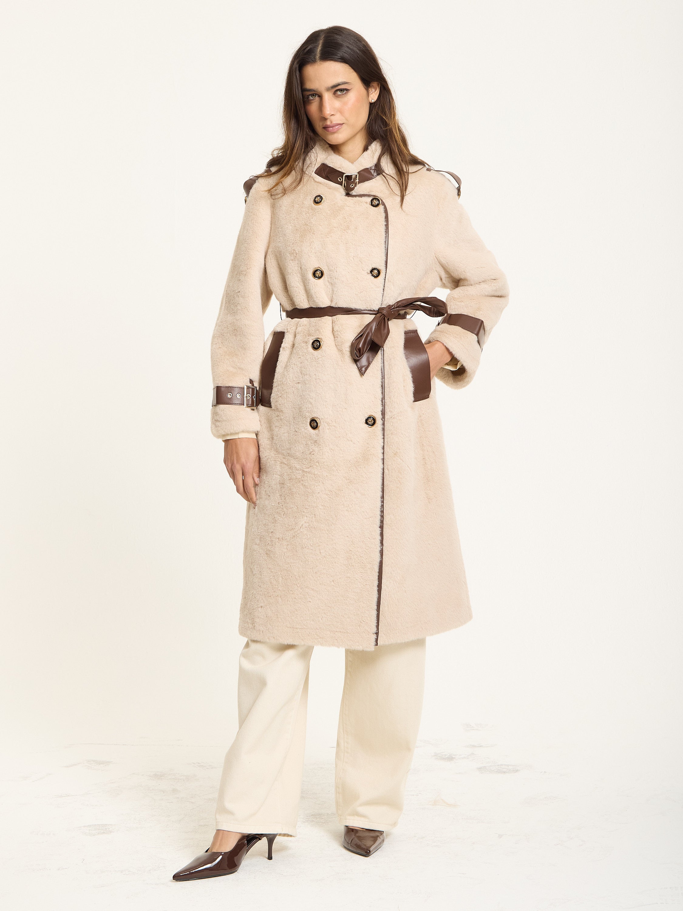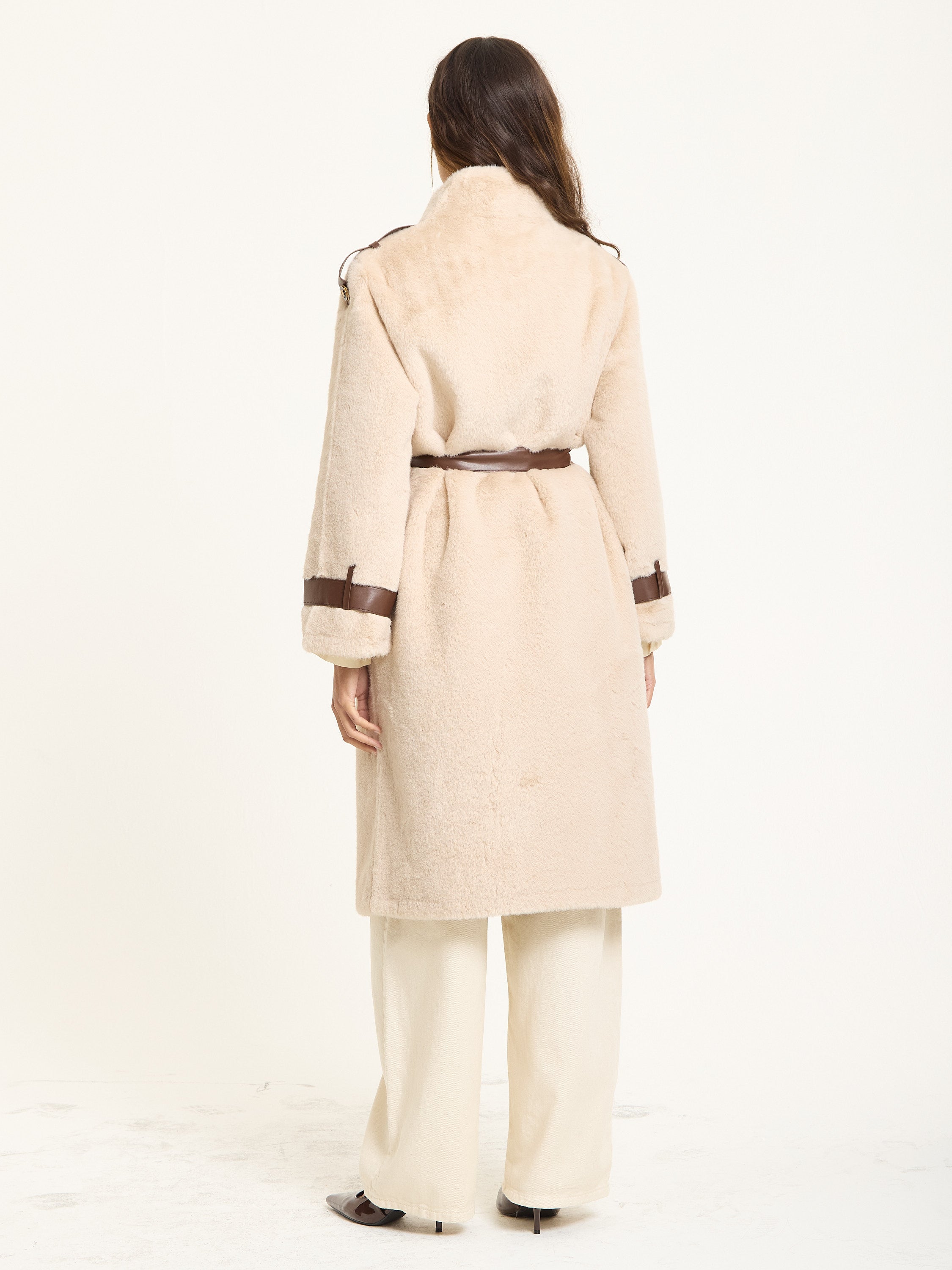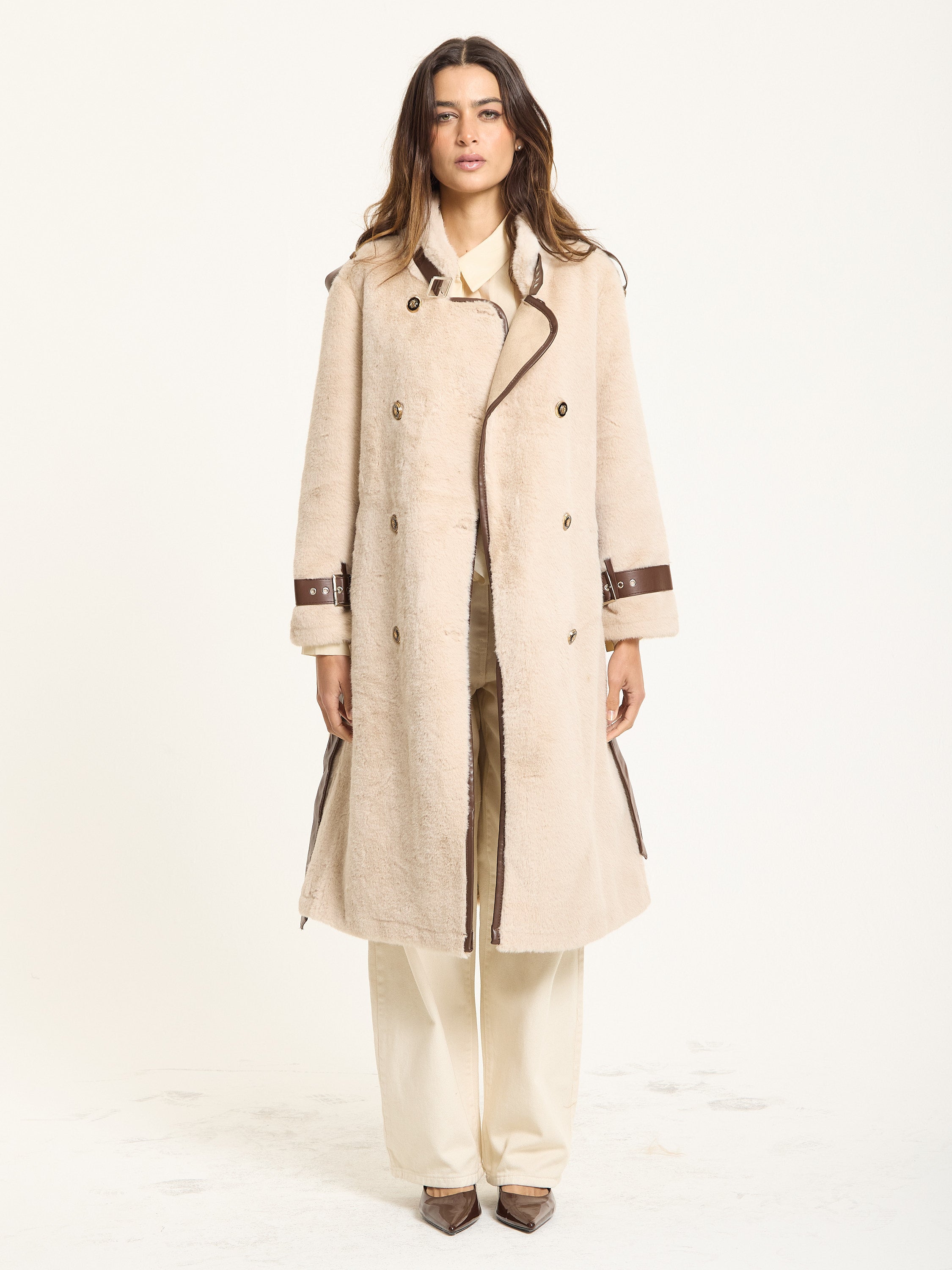 Classic meets contemporary. The Faux Shearling Trench Coat in Cream takes timeless tailoring and reimagines it with textural contrast and attitude. Perfect over tonal layers or bold prints for a statement winter look.