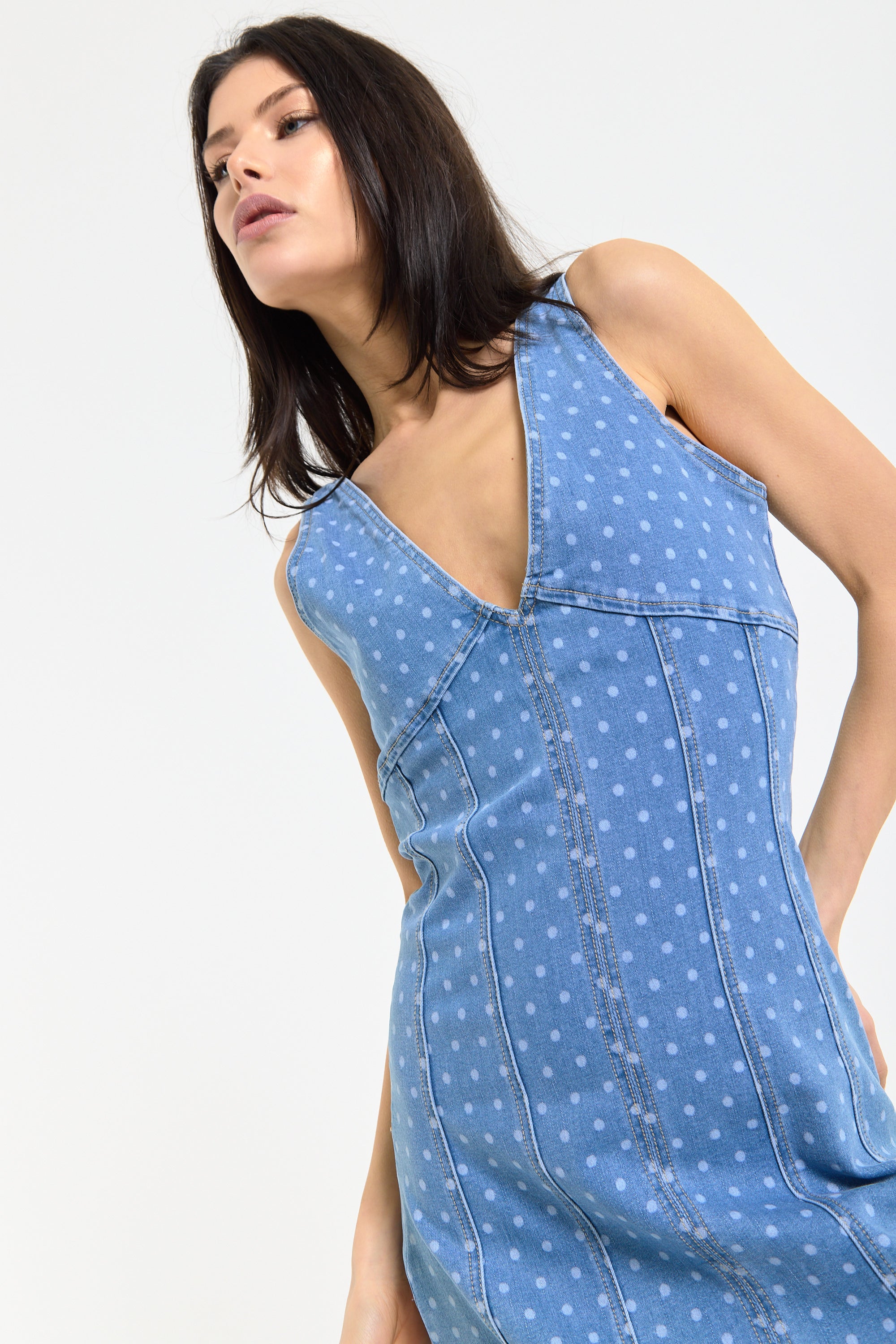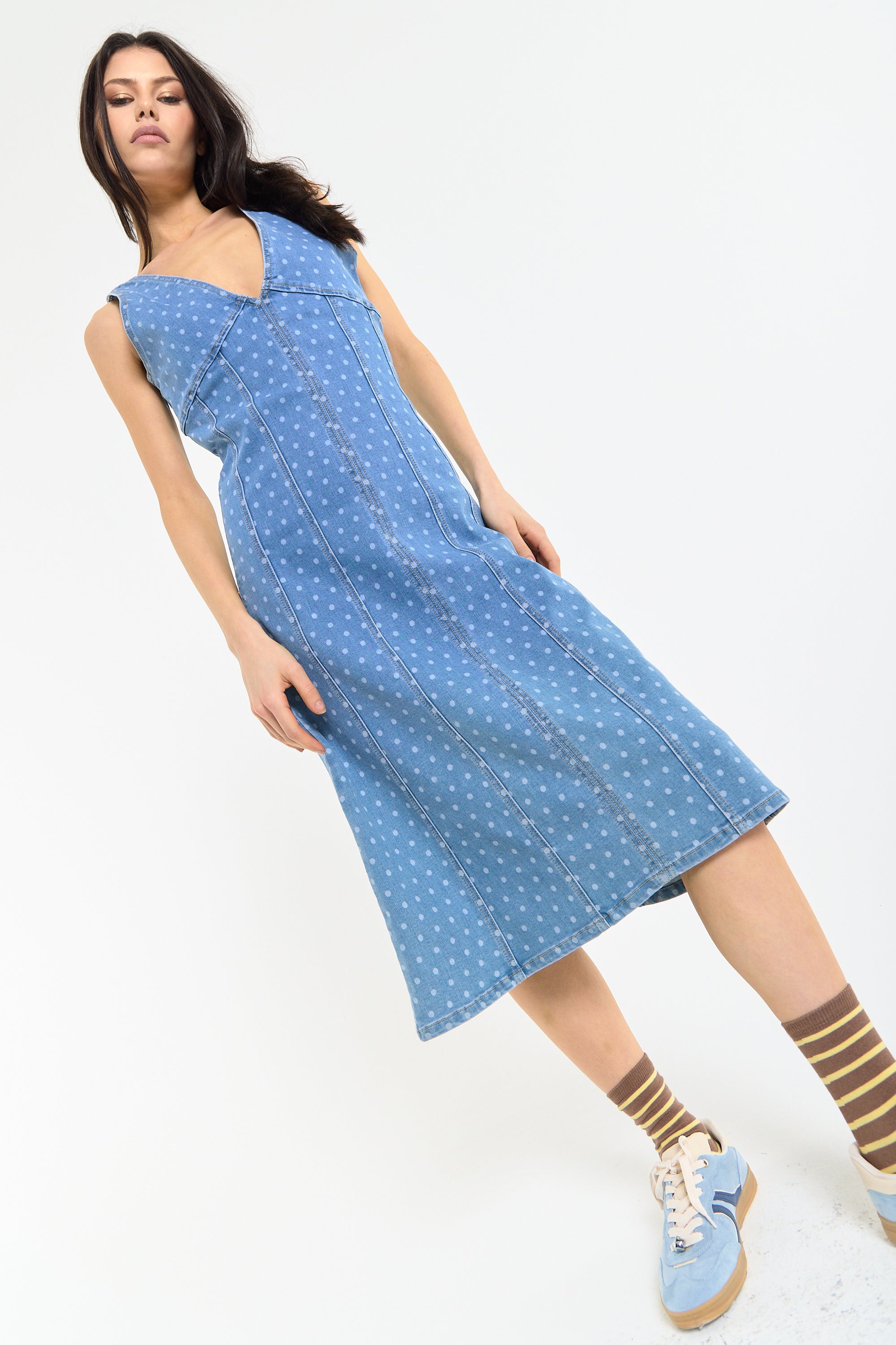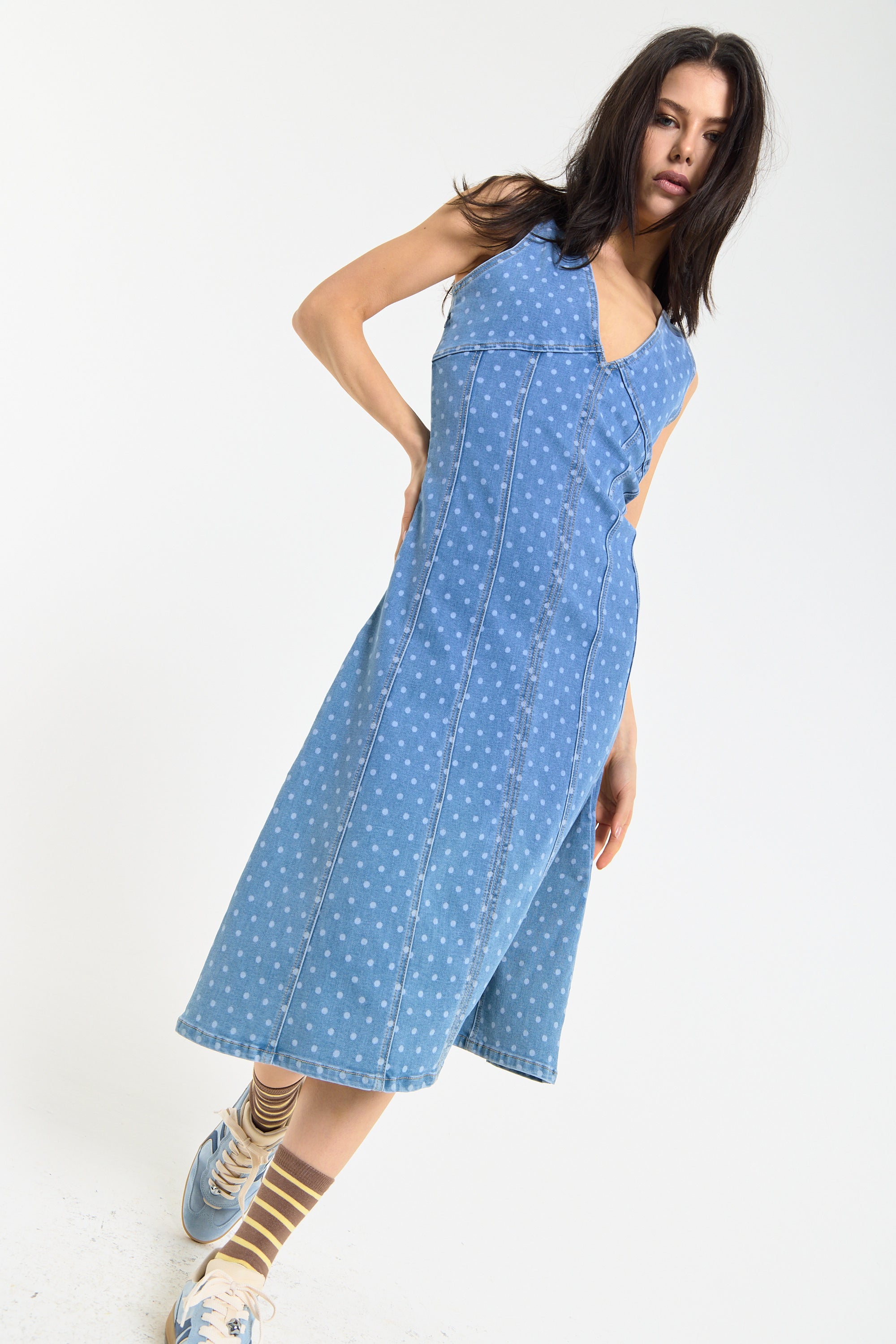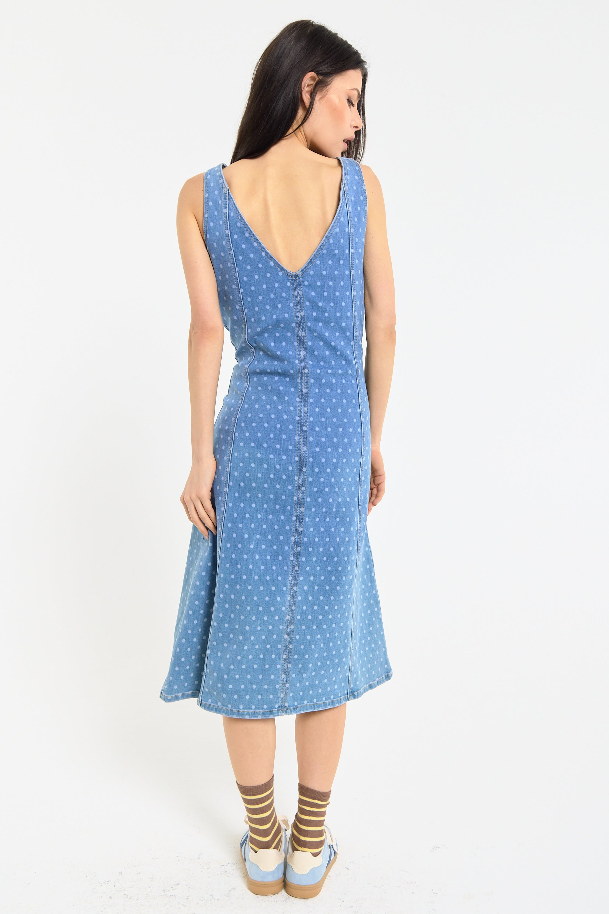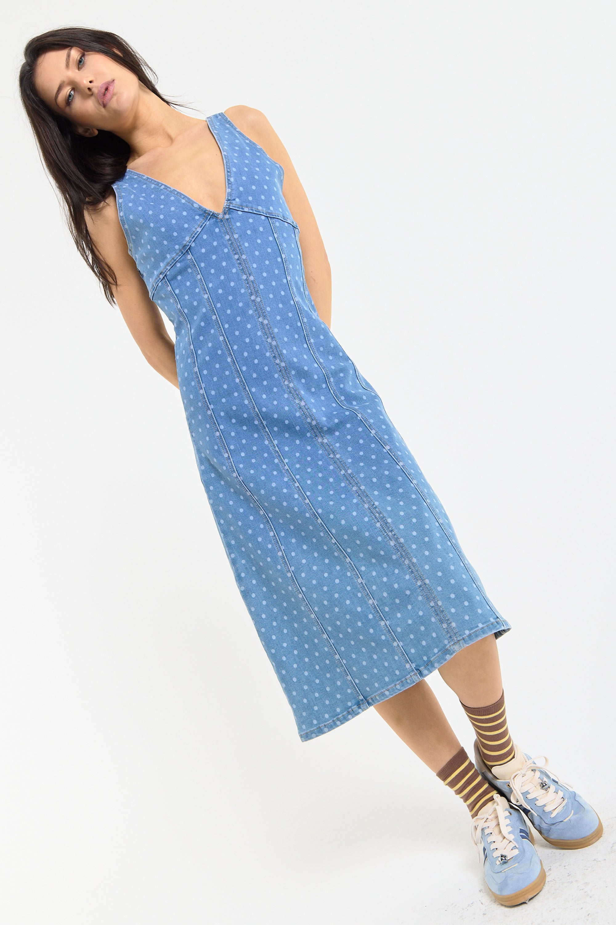 This denim midi dress features a flattering fitted silhouette with a soft flared hem, designed with a deep V neckline and panelled structure to enhance shape while maintaining comfort, finished in a subtle all-over spot print for a playful yet refined look. Crafted from structured denim, it offers a versatile day-to-evening style, perfect to wear with trainers for casual outings or dress up with heels for dinner and events, as seen styled on model across looks.