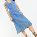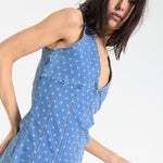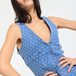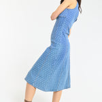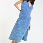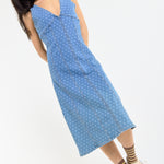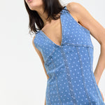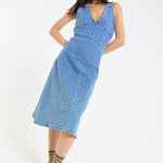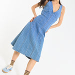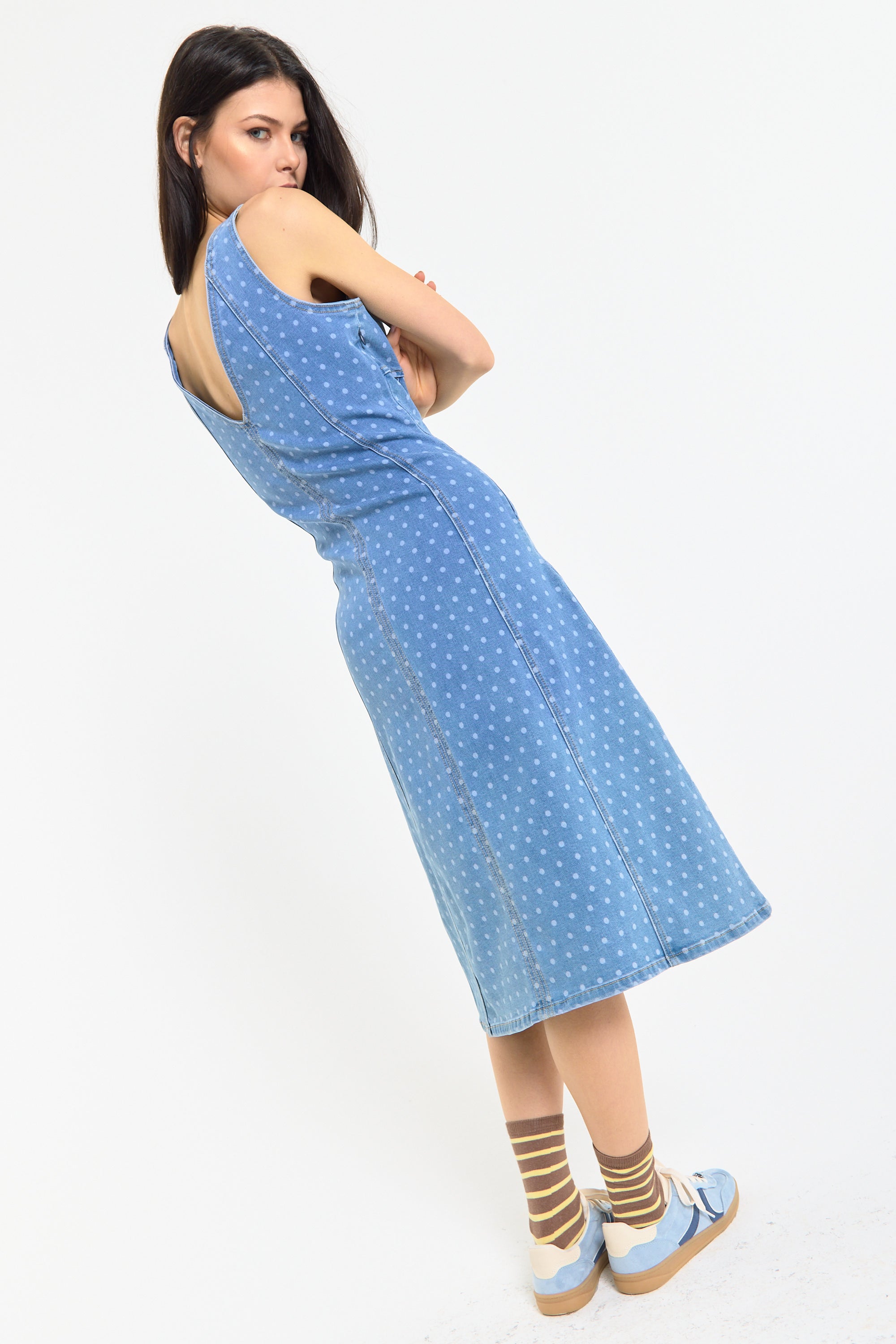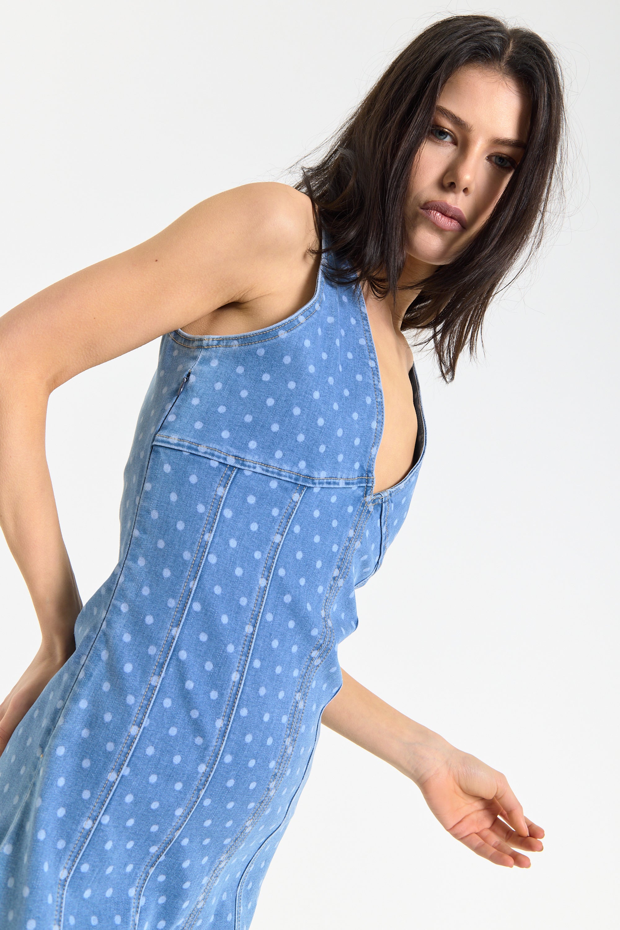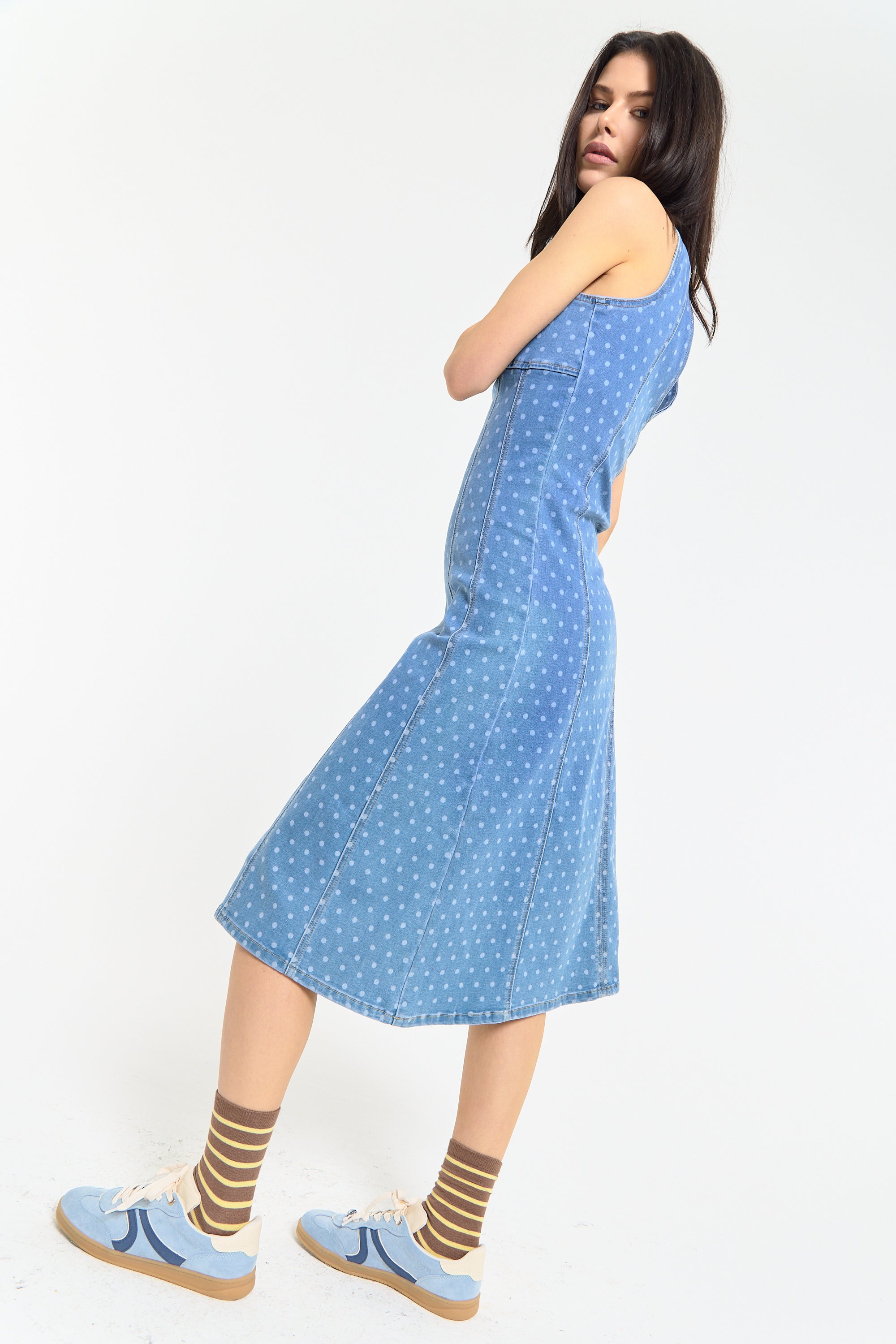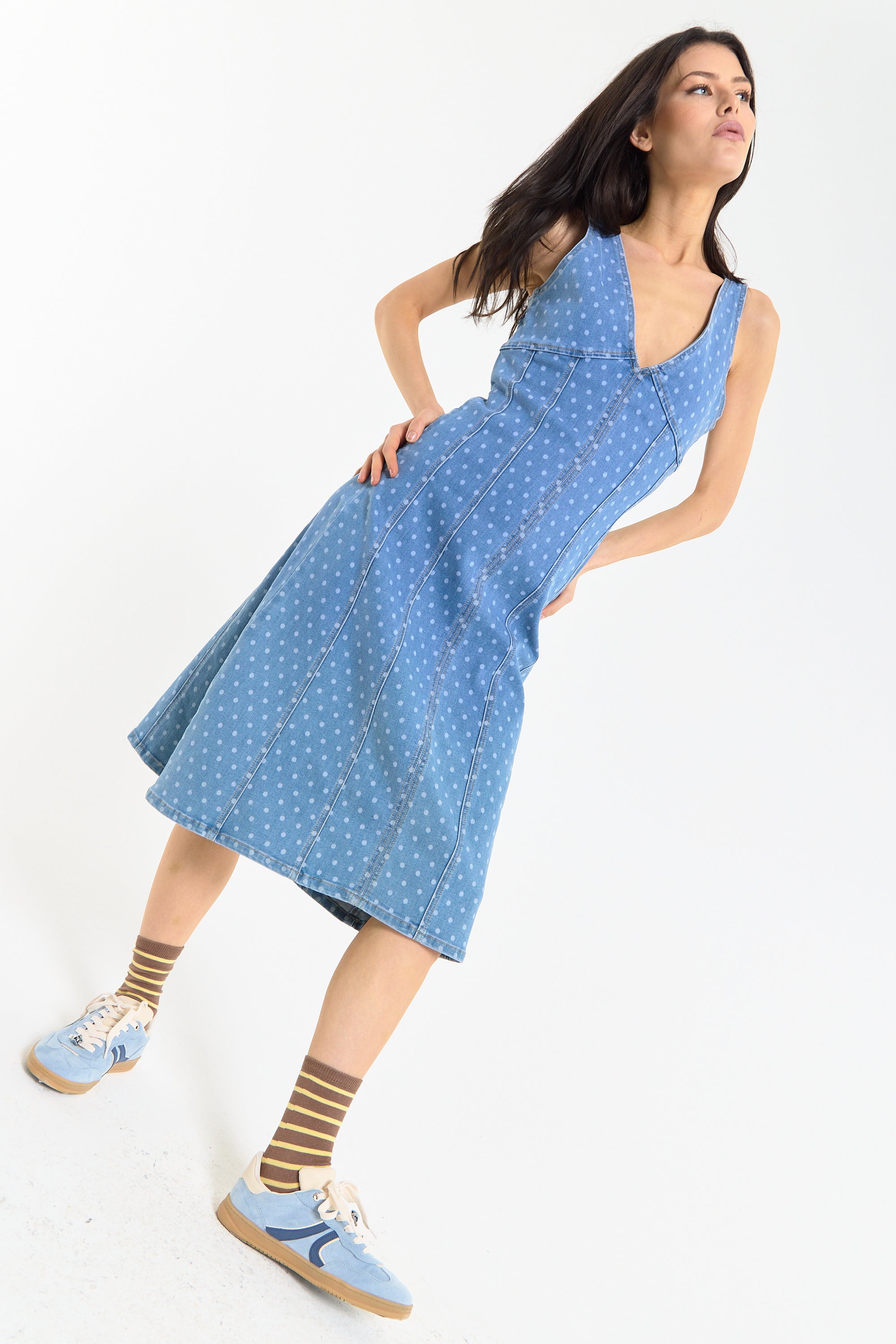 This denim midi dress features a flattering fitted silhouette with a soft flared hem, designed with a deep V neckline and panelled structure to enhance shape while maintaining comfort, finished in a subtle all-over spot print for a playful yet refined look. Crafted from structured denim, it offers a versatile day-to-evening style, perfect to wear with trainers for casual outings or dress up with heels for dinner and events, as seen styled on model across looks.