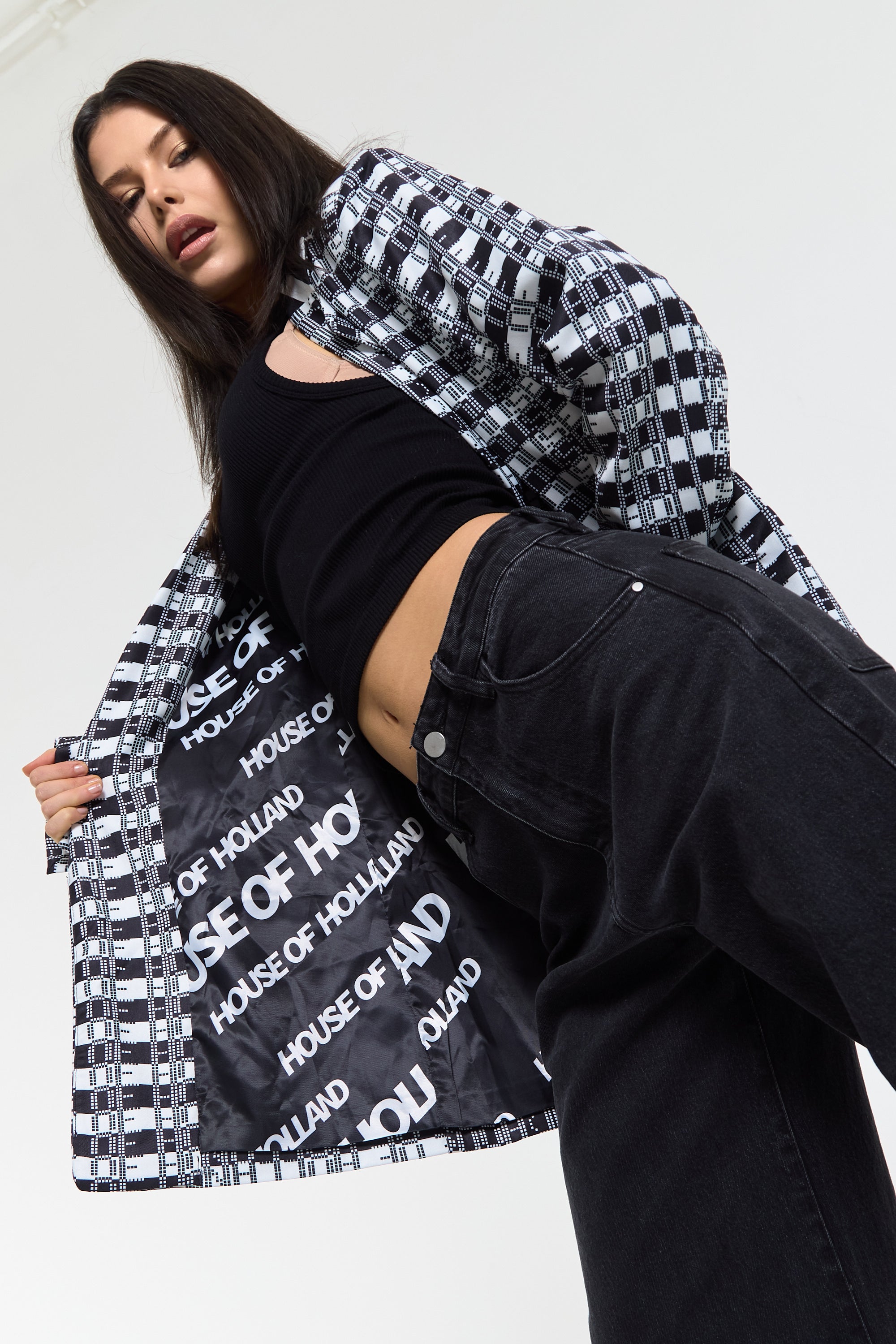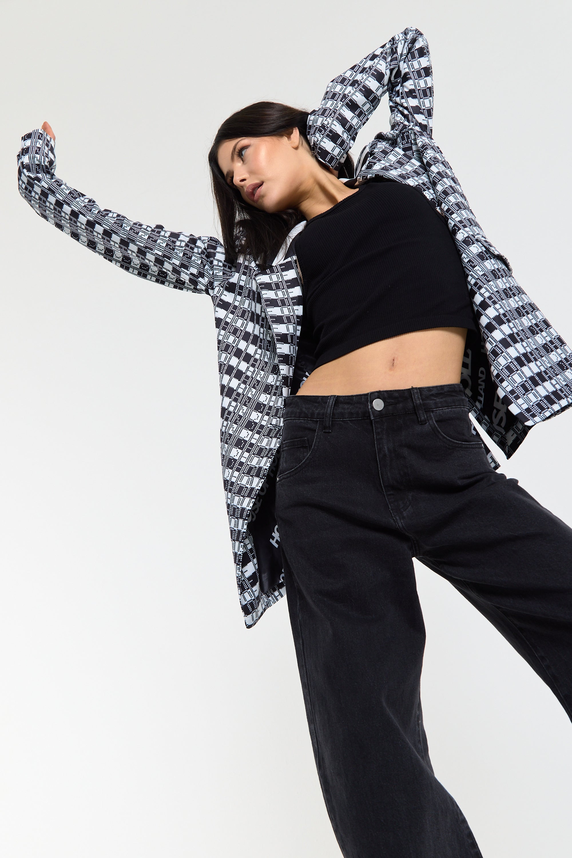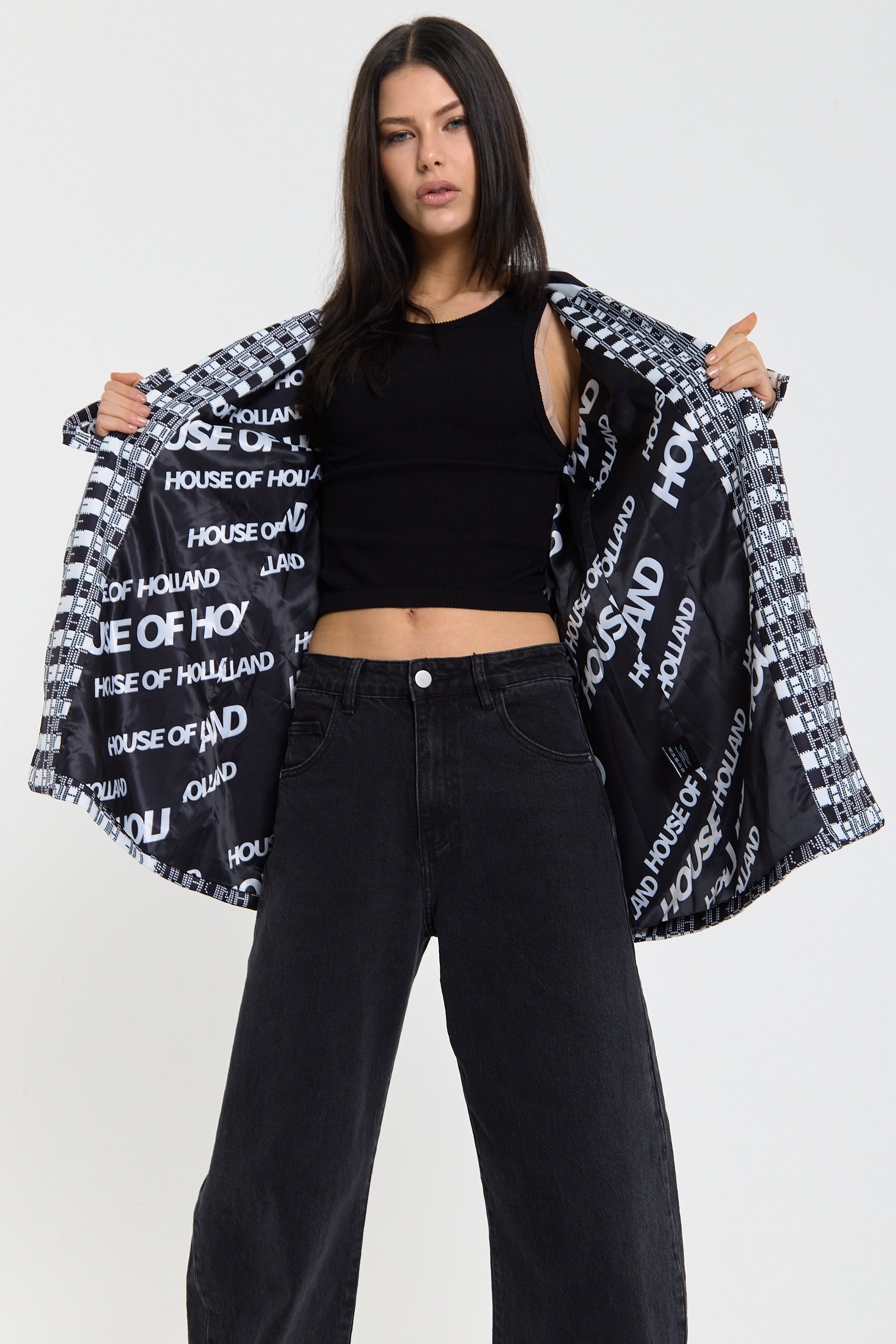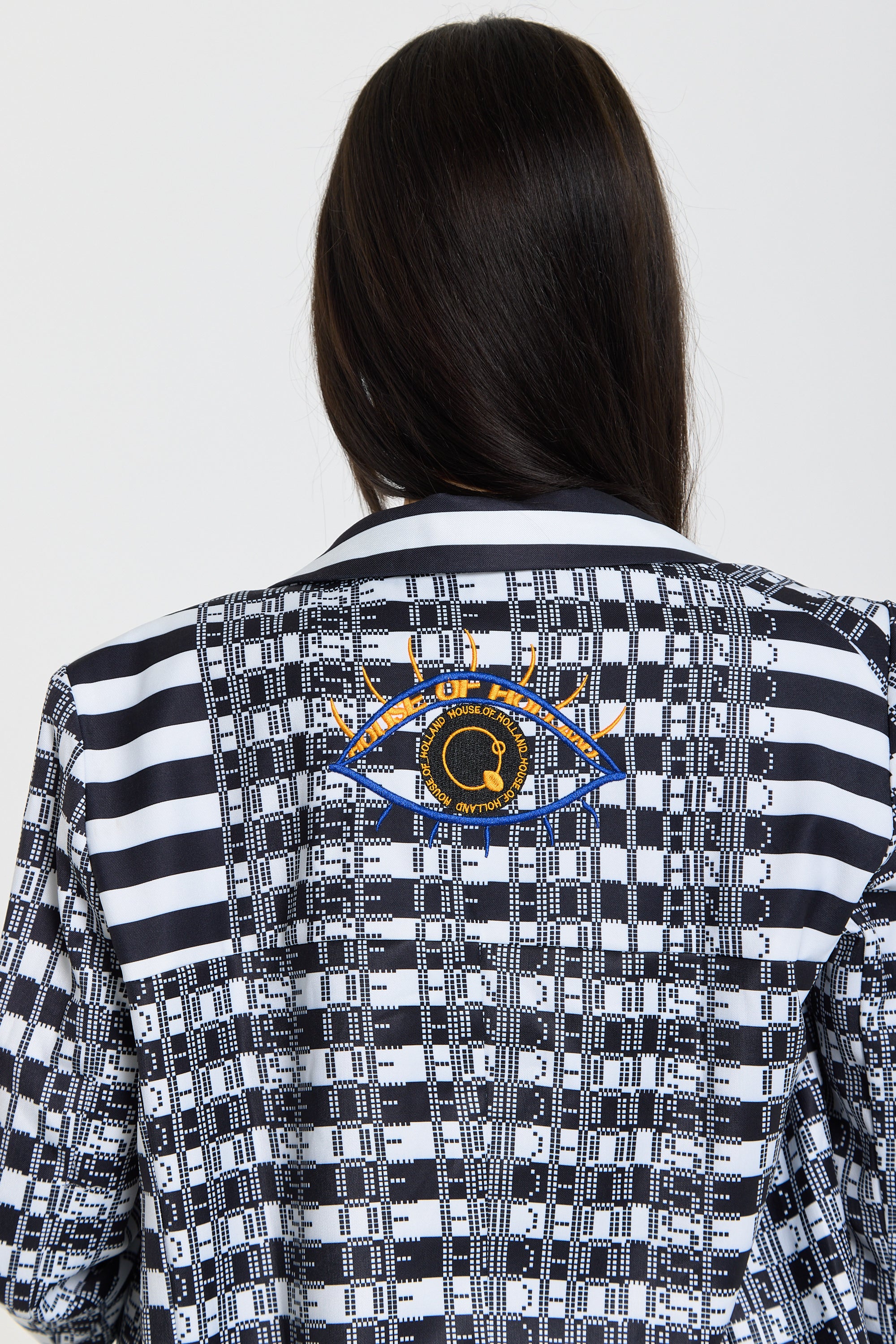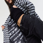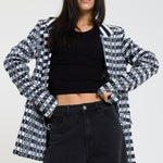 This monochrome check blazer features a tailored silhouette with a bold text-inspired geometric pattern incorporating subtle House of Holland wording throughout the fabric, creating a statement yet sophisticated look; style with the matching trousers for a coordinated set or pair with denim and heels for a modern contrast, making it perfect for workwear, smart-casual events, evenings out, and fashion-forward occasions.