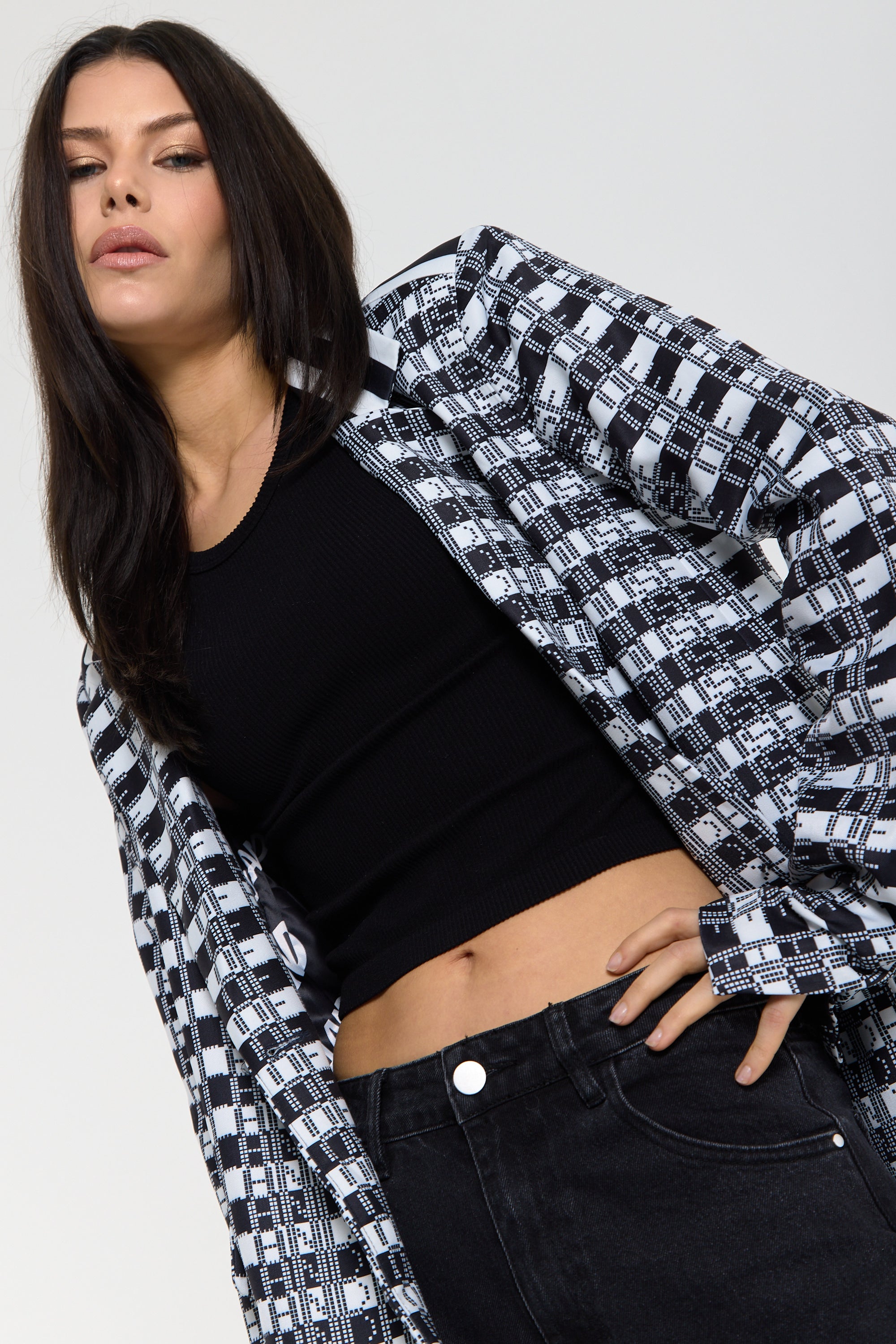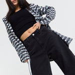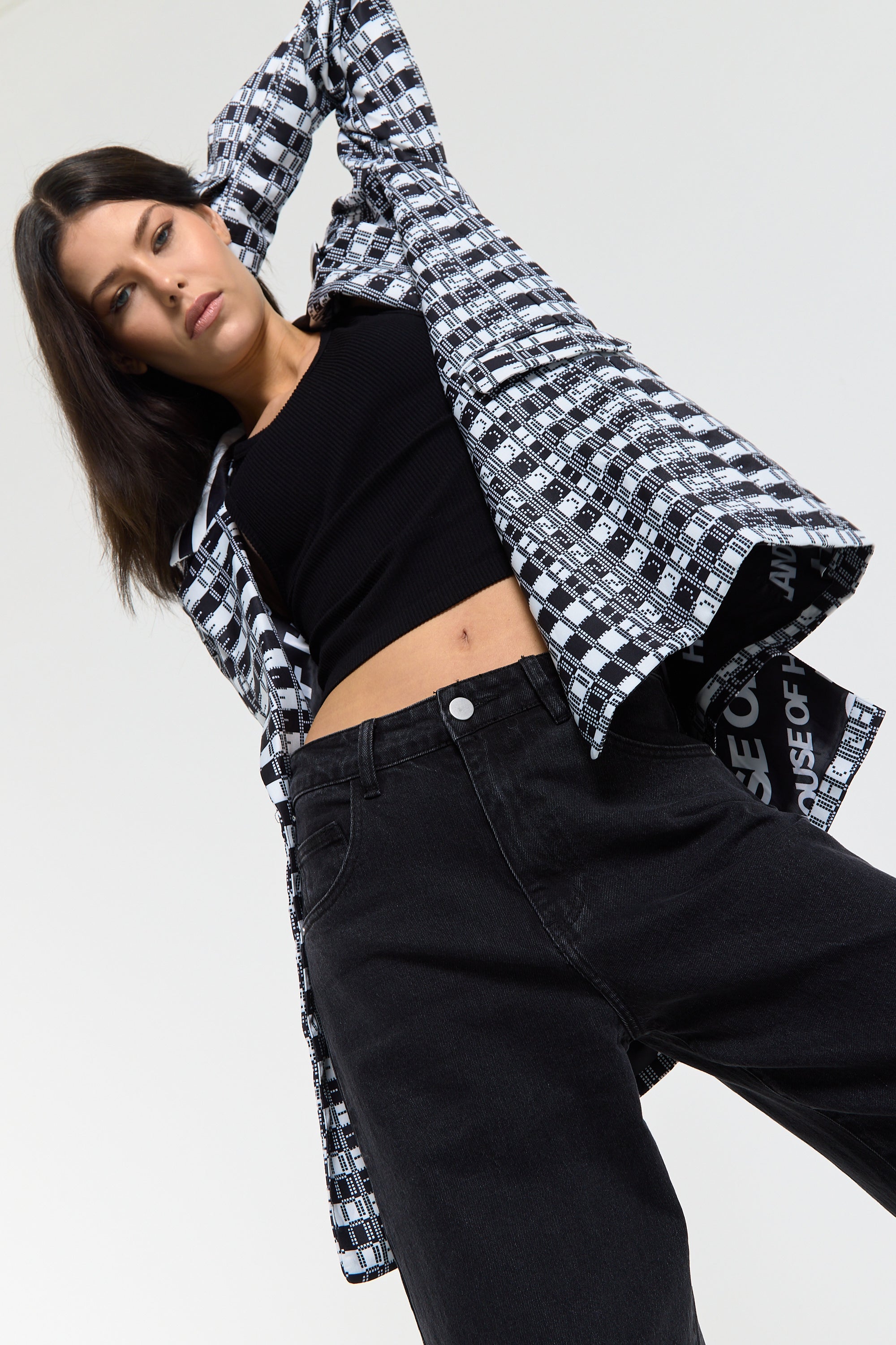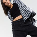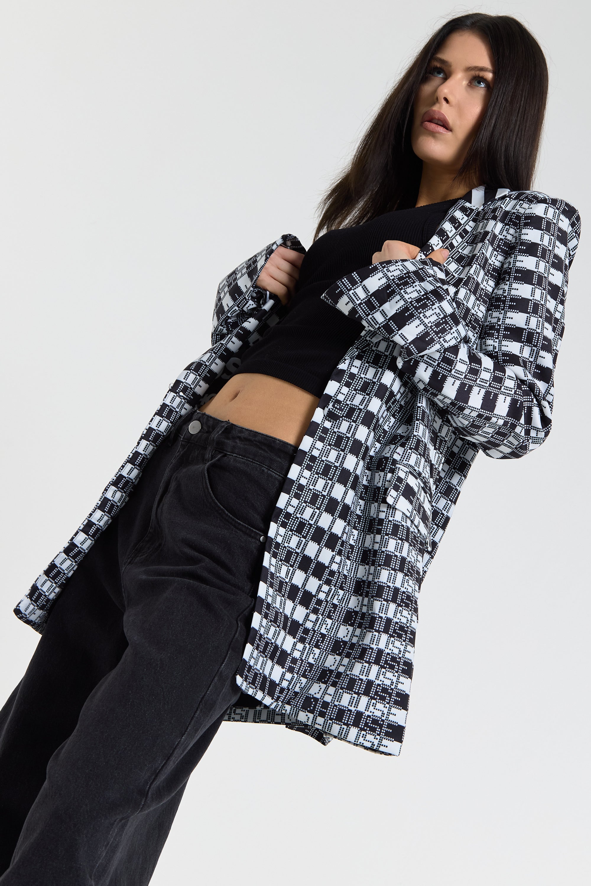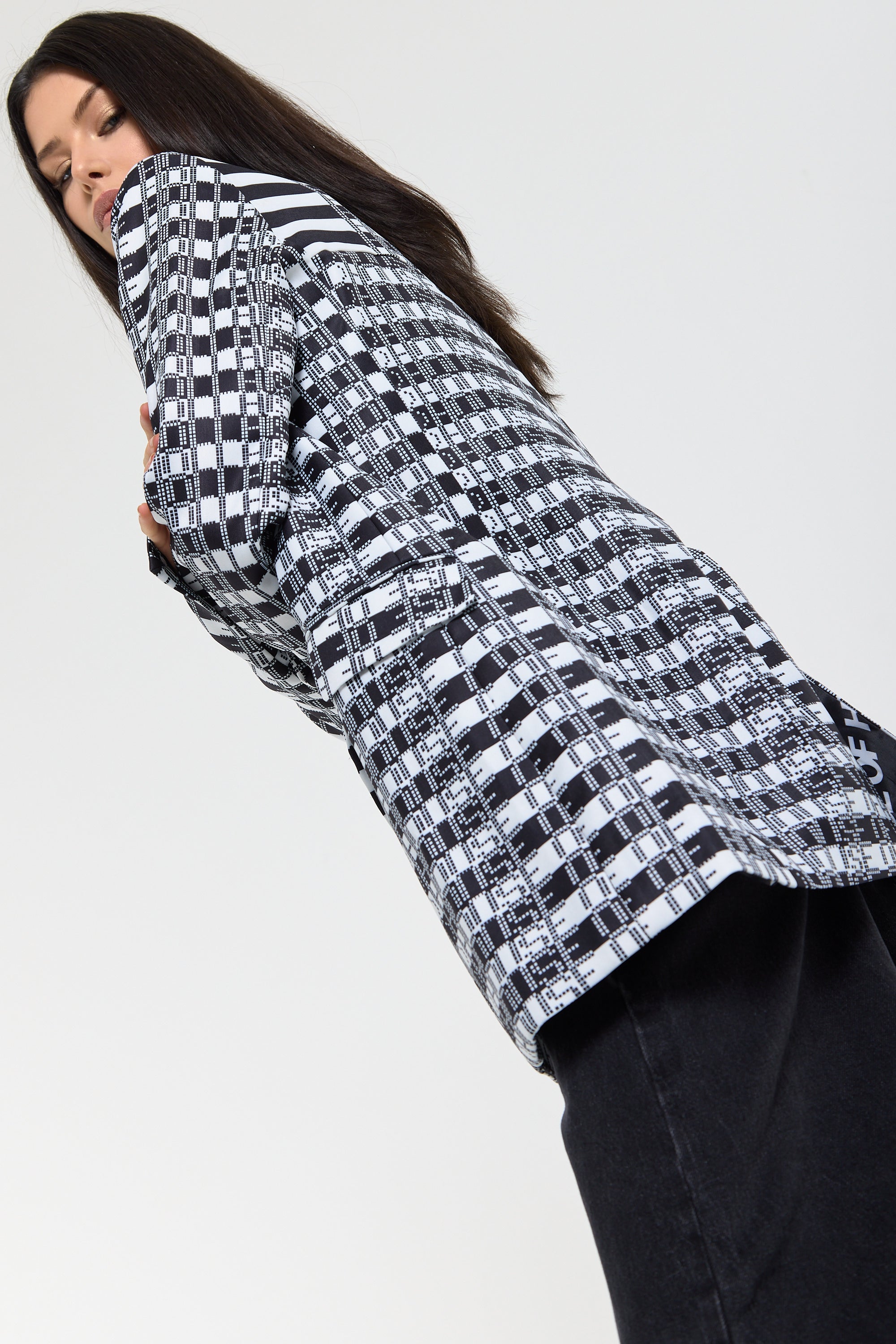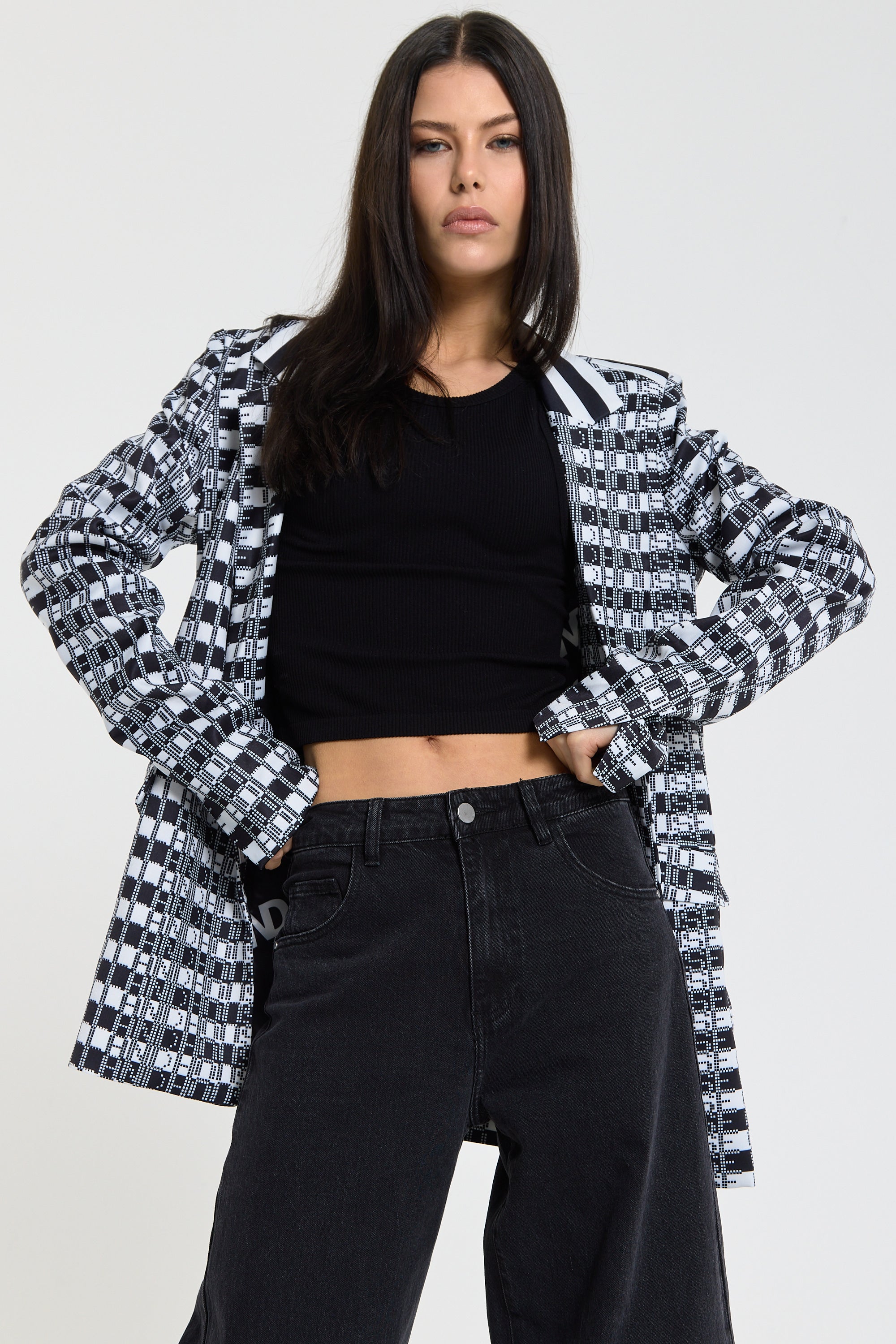 This monochrome check blazer features a tailored silhouette with a bold text-inspired geometric pattern incorporating subtle House of Holland wording throughout the fabric, creating a statement yet sophisticated look; style with the matching trousers for a coordinated set or pair with denim and heels for a modern contrast, making it perfect for workwear, smart-casual events, evenings out, and fashion-forward occasions.