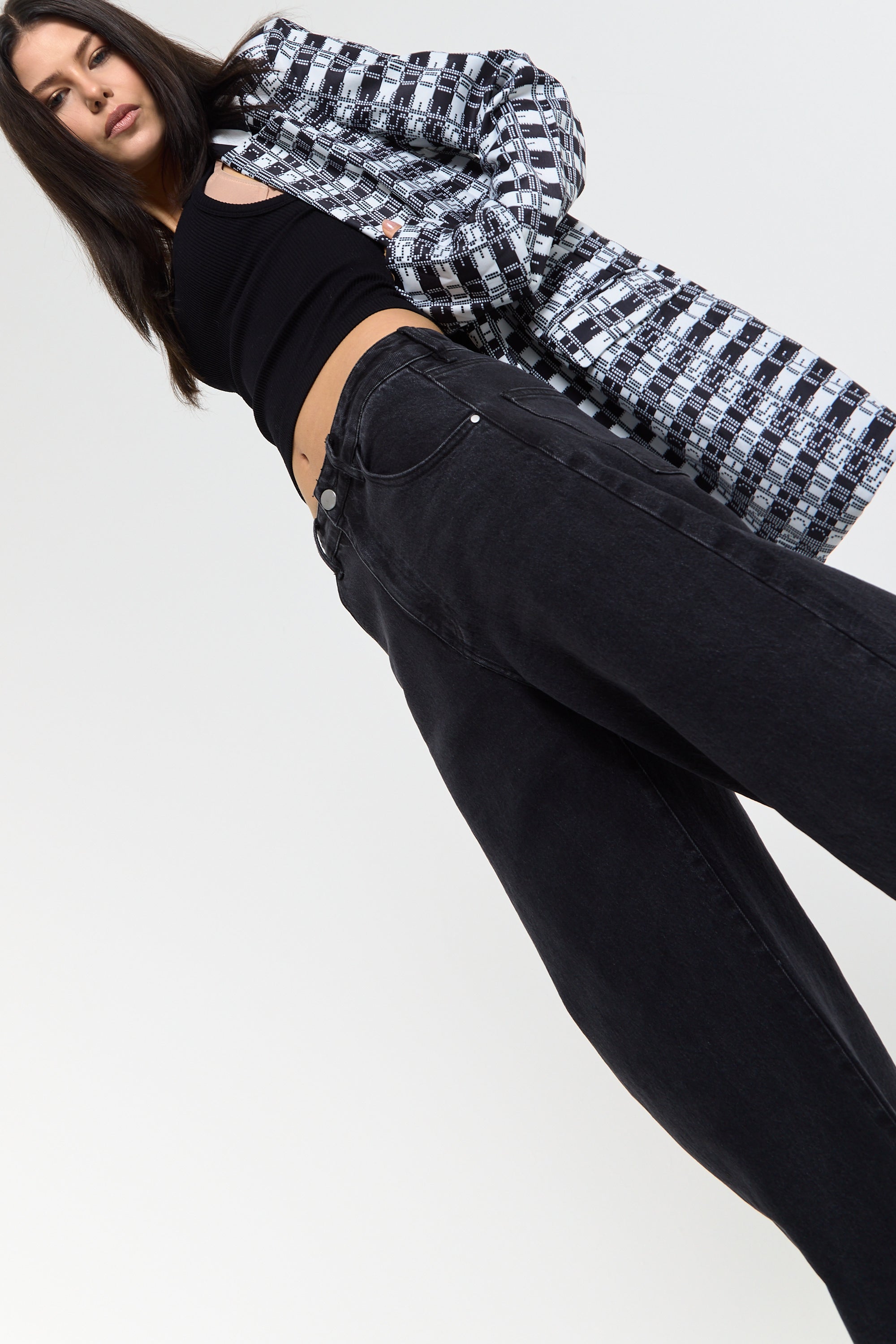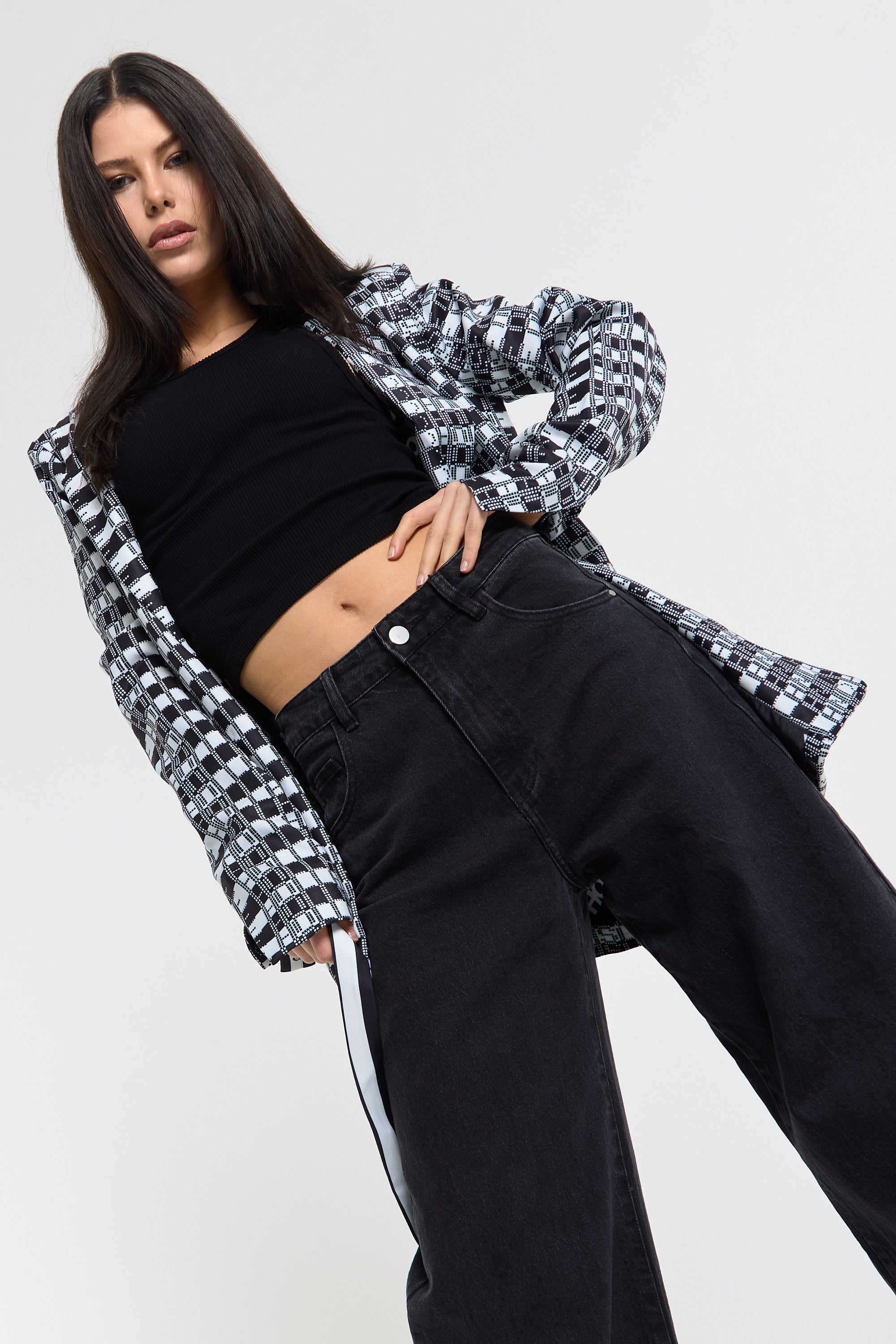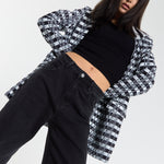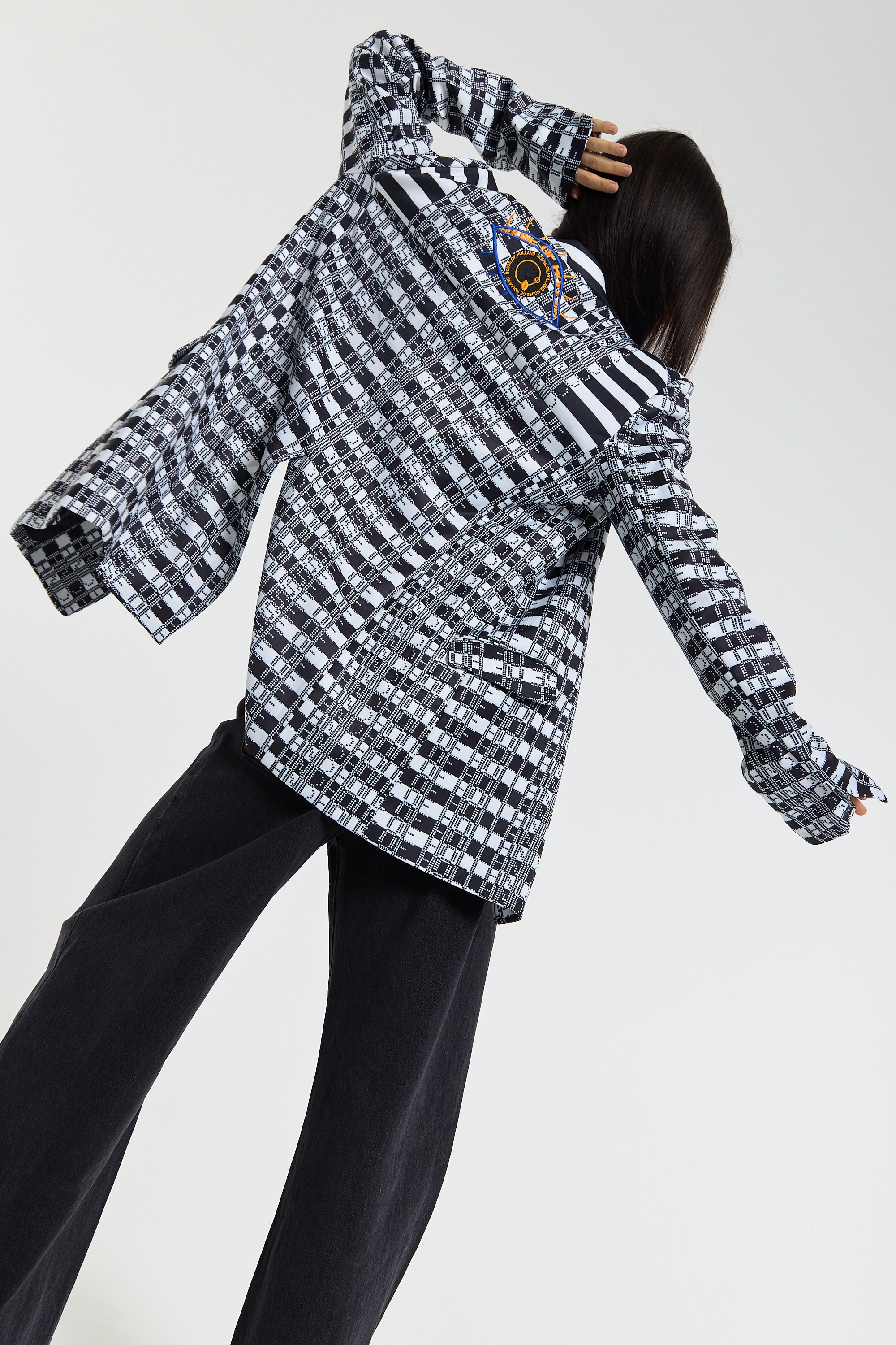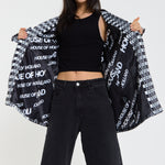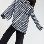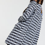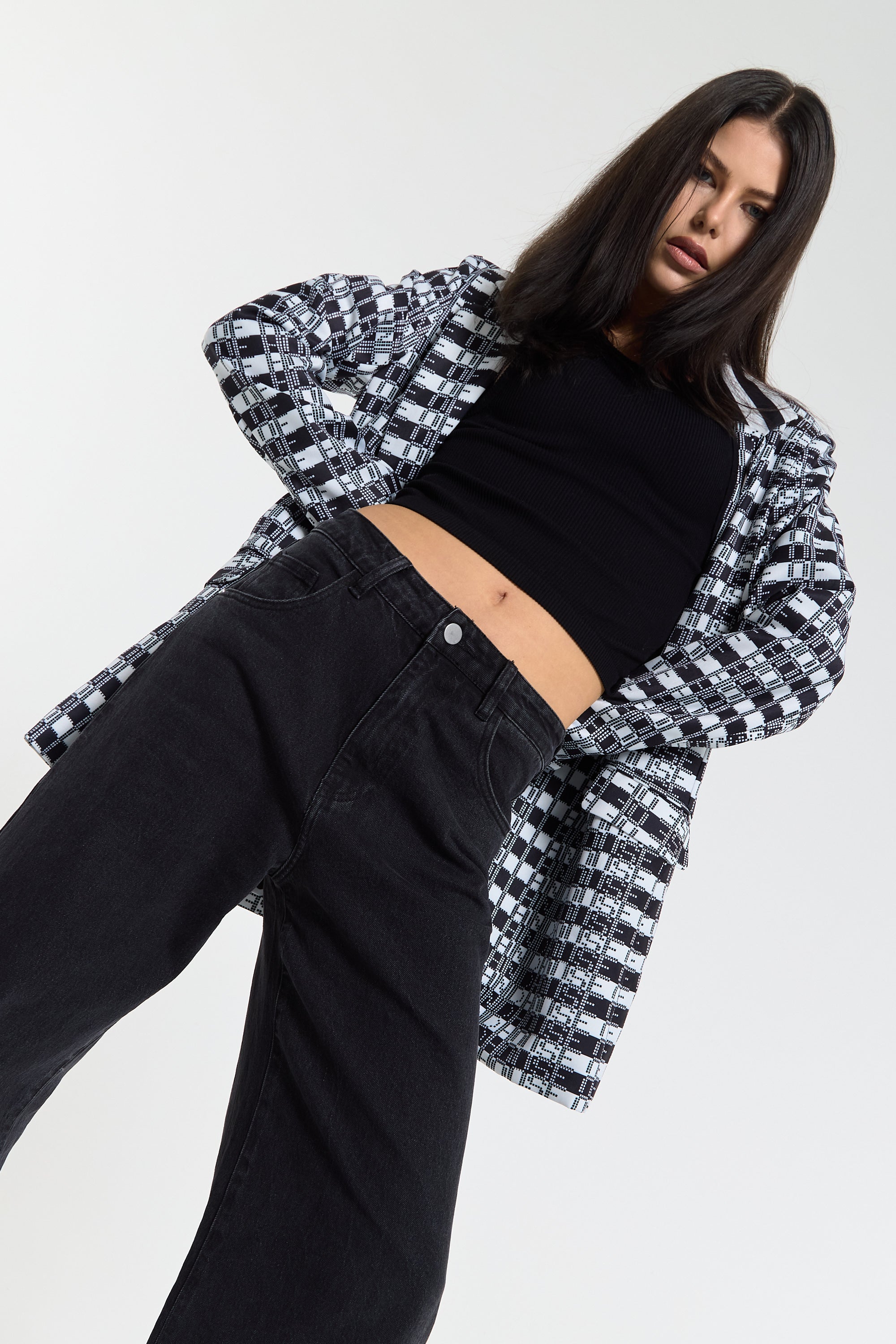 This monochrome check blazer features a tailored silhouette with a bold text-inspired geometric pattern incorporating subtle House of Holland wording throughout the fabric, creating a statement yet sophisticated look; style with the matching trousers for a coordinated set or pair with denim and heels for a modern contrast, making it perfect for workwear, smart-casual events, evenings out, and fashion-forward occasions.