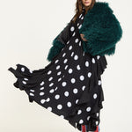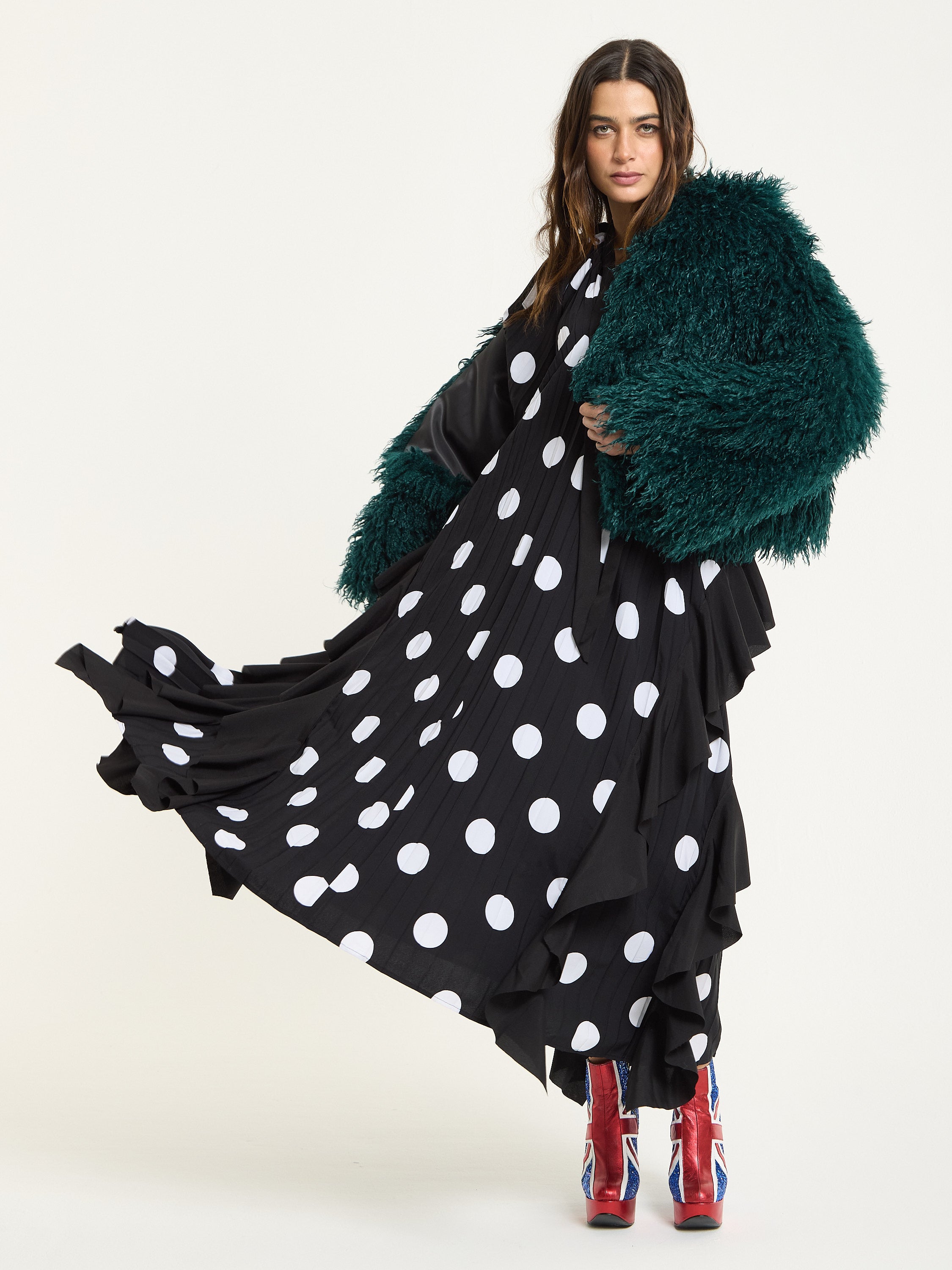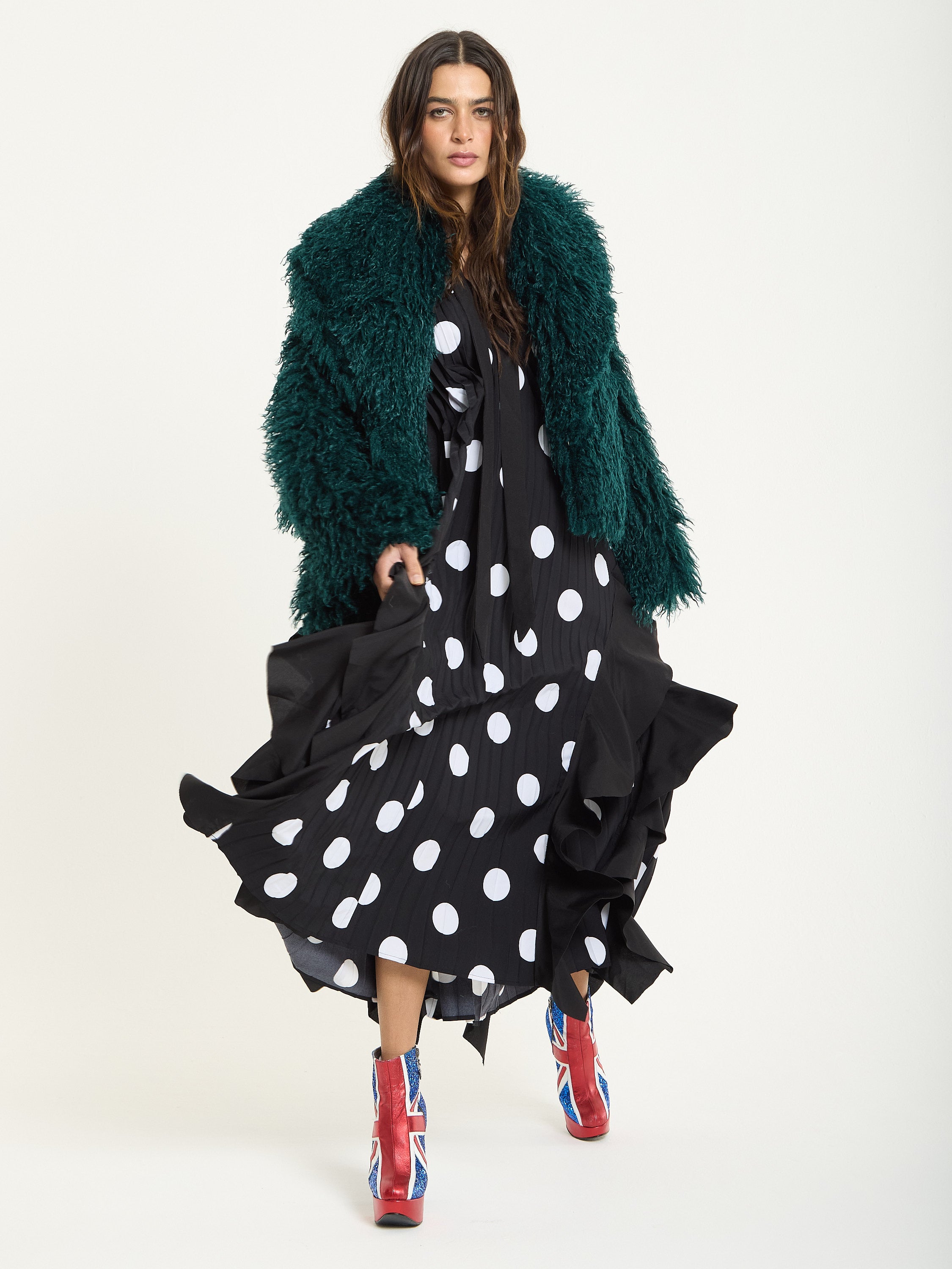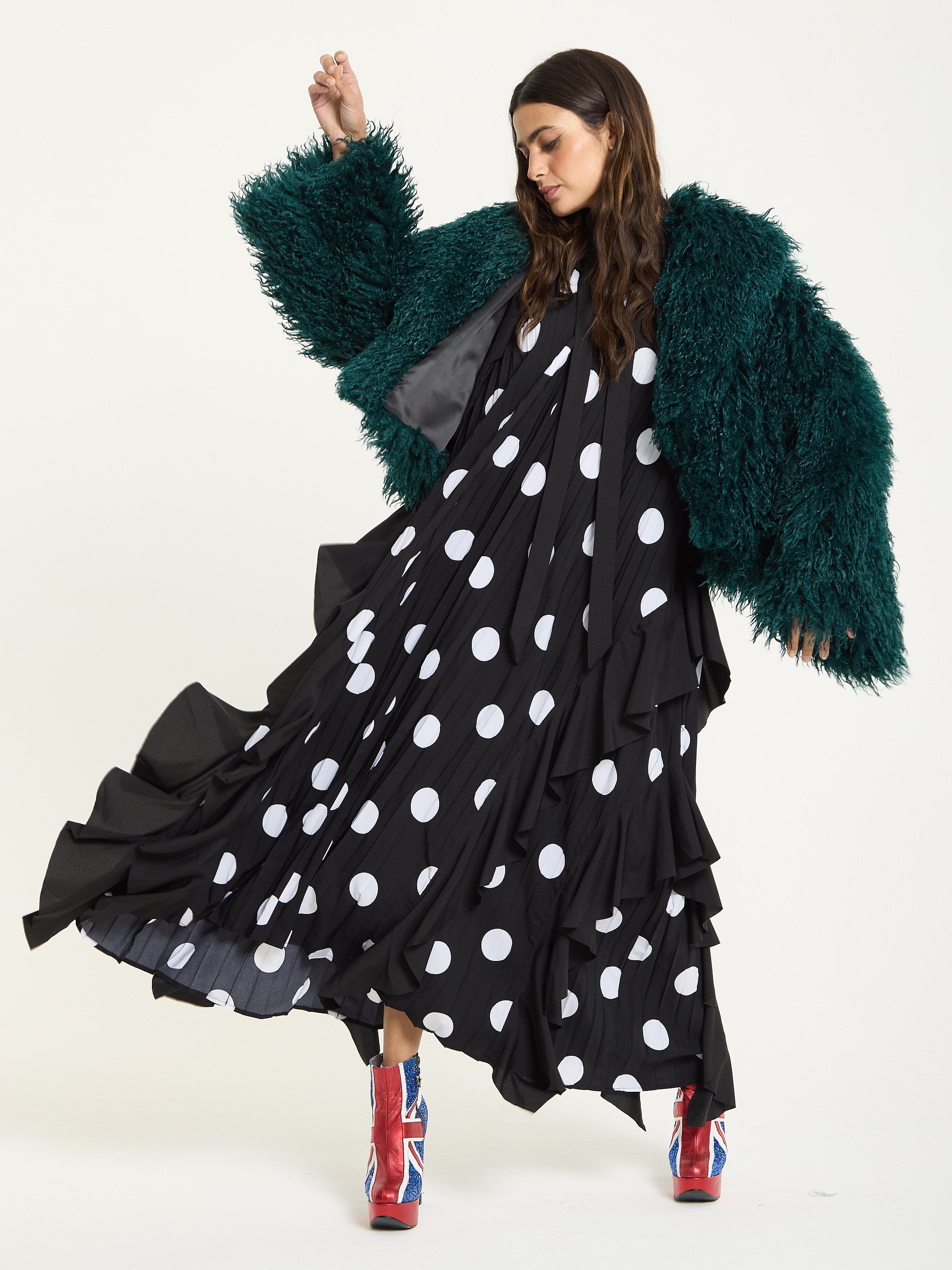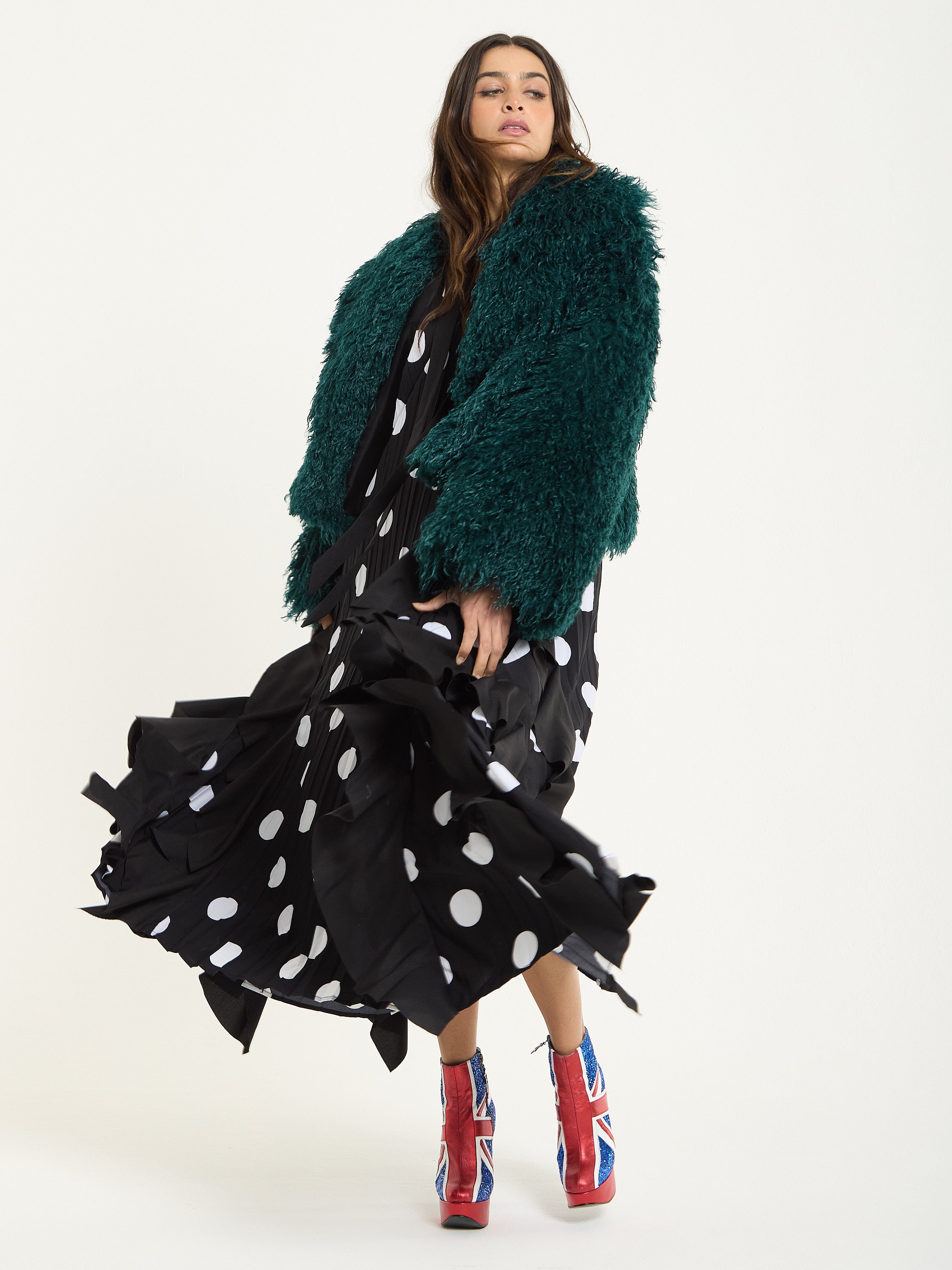 Go bold with texture and tone. The Shaggy Faux Fur Jacket in Emerald captures effortless glamour with a rock ‘n’ roll edge — pair it with wide-leg trousers, statement boots, or printed dresses for maximum impact.