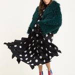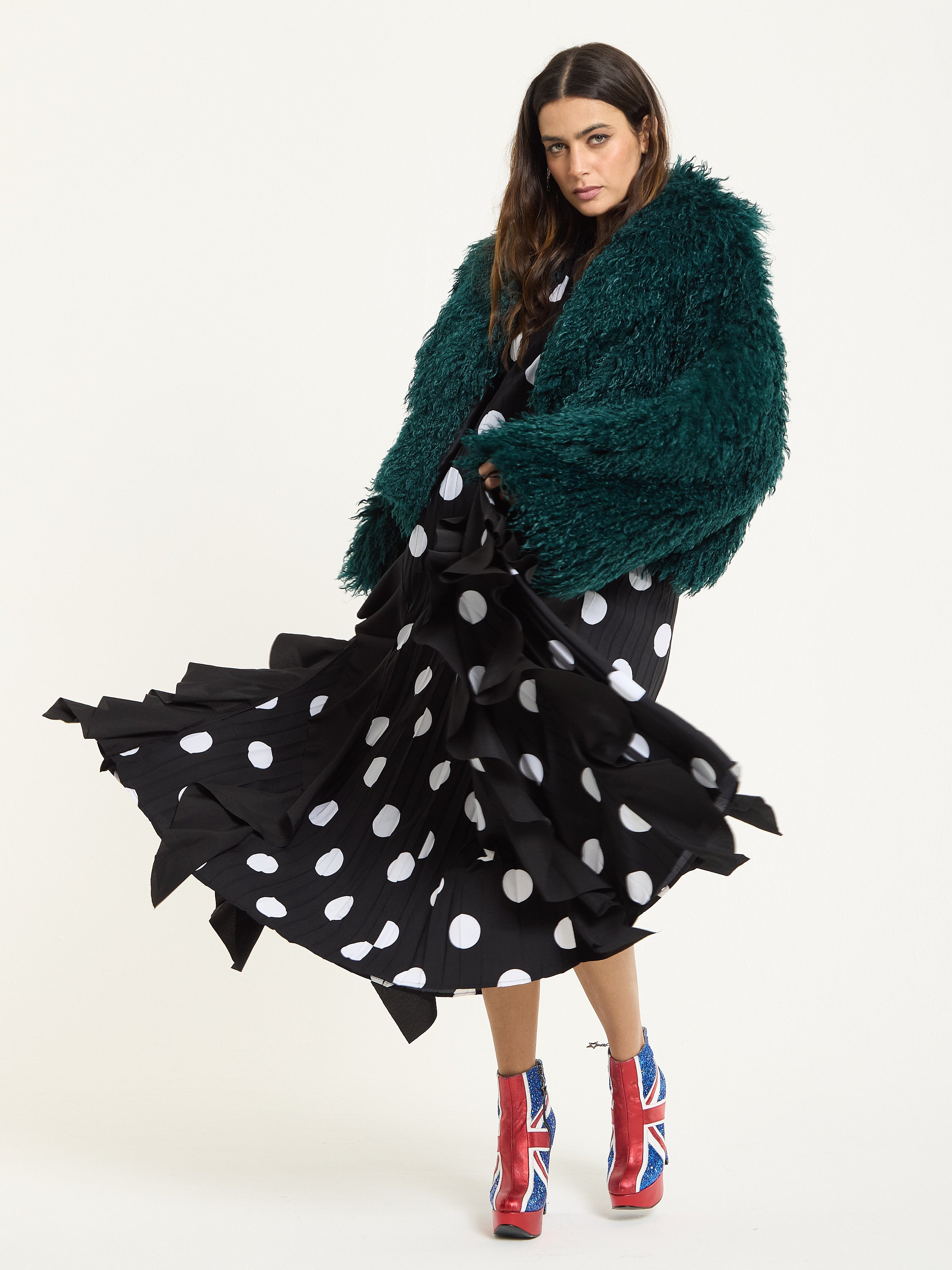 The House of Holland Shaggy Faux Fur Jacket in Emerald is a bold statement piece designed to turn heads. Featuring plush long-pile faux fur in a rich jewel tone, this cropped jacket brings texture, warmth, and attitude to your wardrobe. Fully lined for a smooth fit, it’s perfect for layering over dresses or denim when you want to make an entrance.