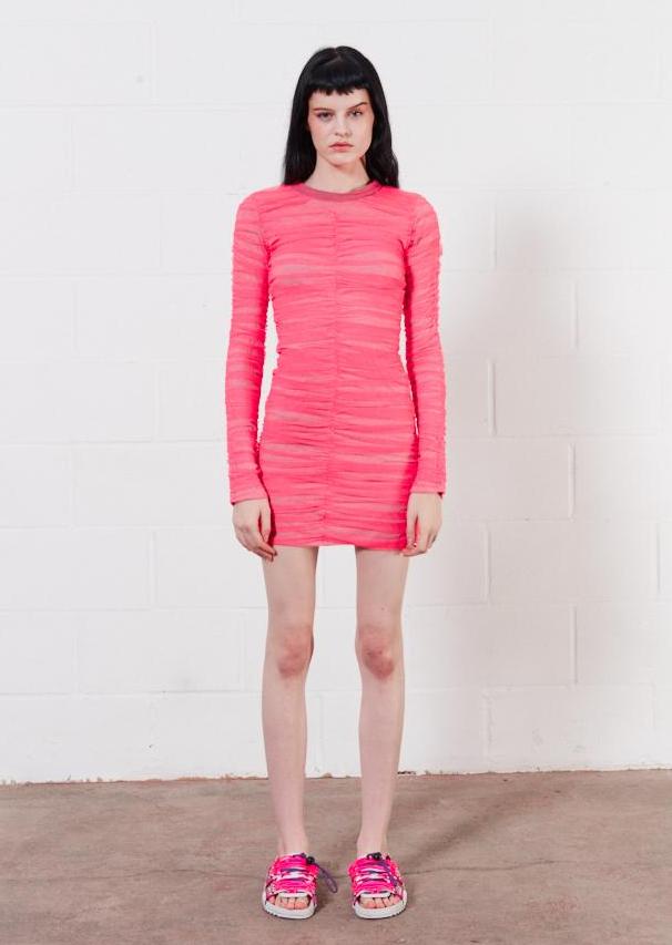 Made for breaking hearts, turning heads and creating unnecessary drama. Our Gathered Tulle Mini Dress in vivid pink features a crew neck and neon pink tulle ruching over a muted grey marl base. Re-live the runway look with our Mega Oversized Rain Coat in Vivid Pink