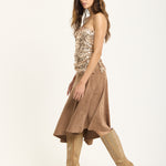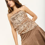 A gold sequin bandeau top that adds instant glamour to any outfit. Its fitted cut and radiant shine make it a perfect choice for parties, celebrations, or date nights.
