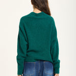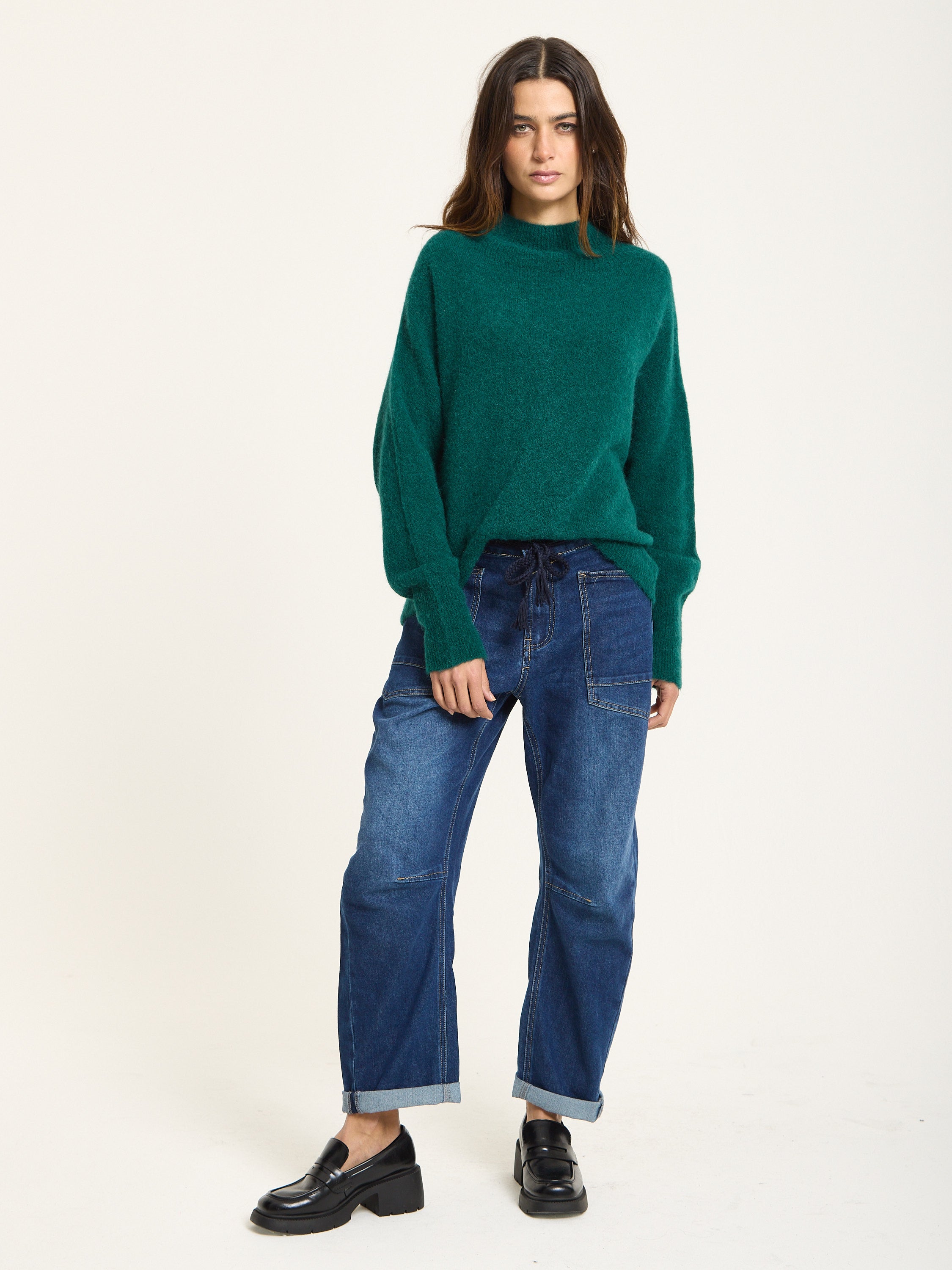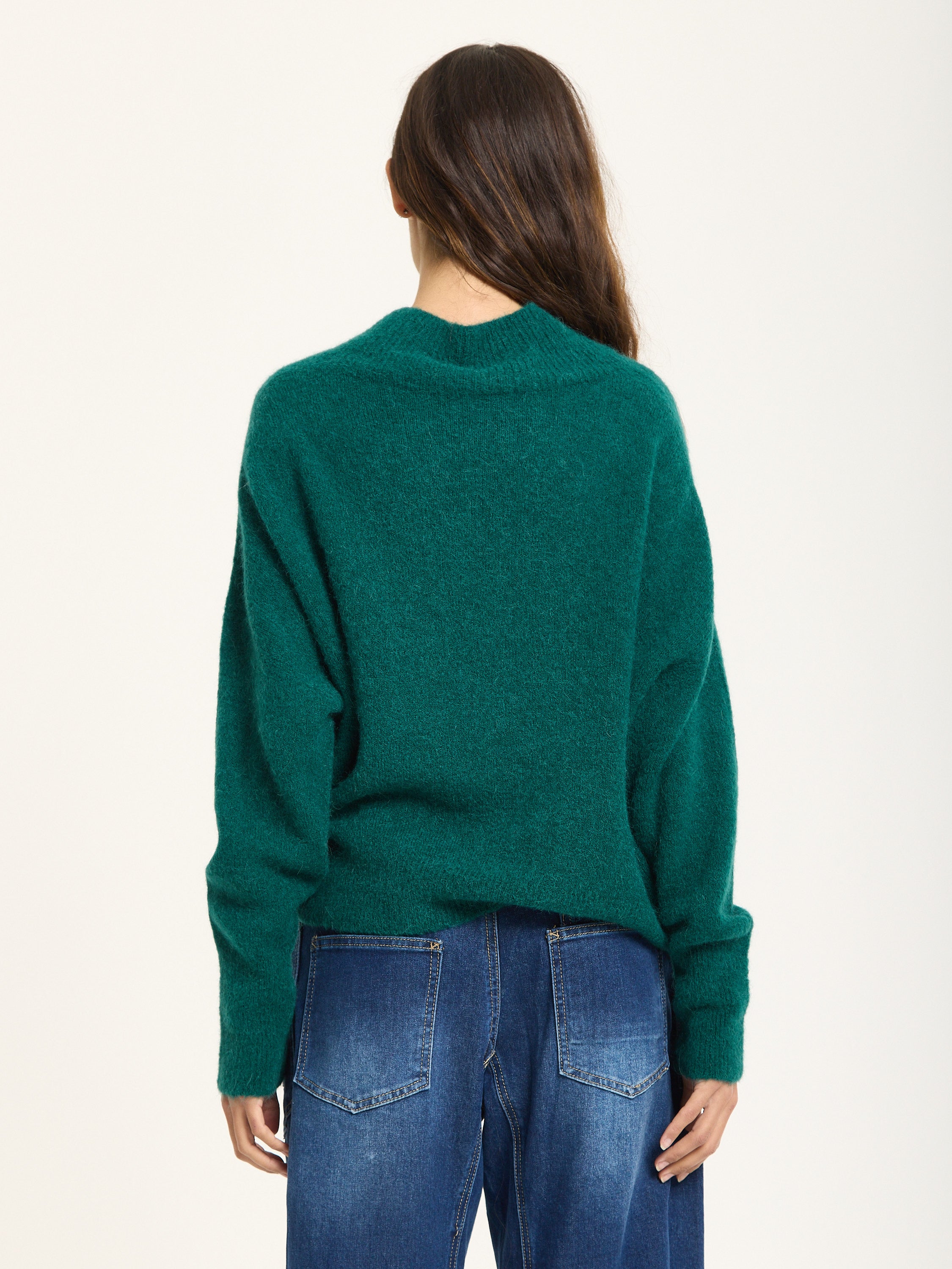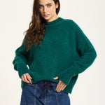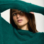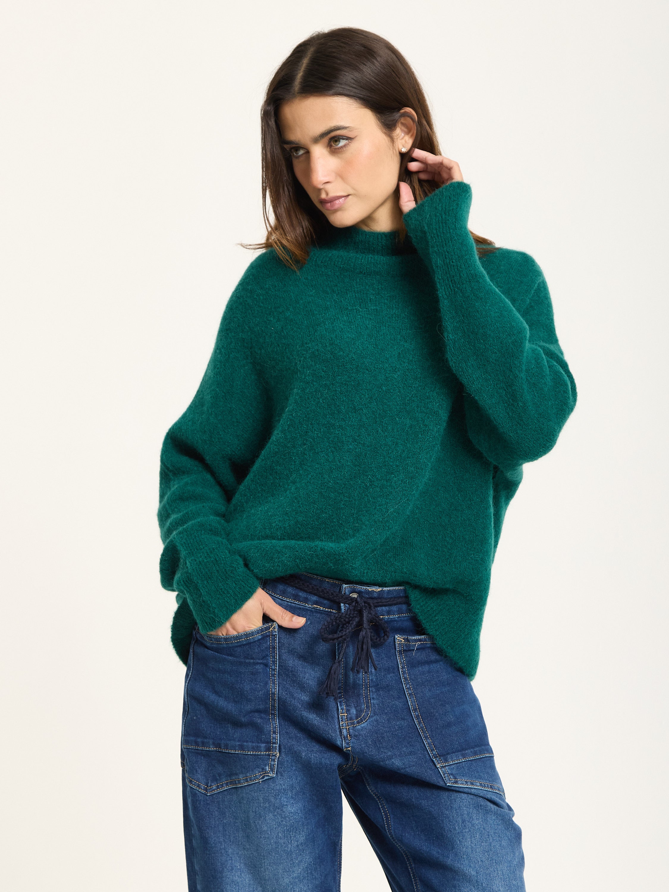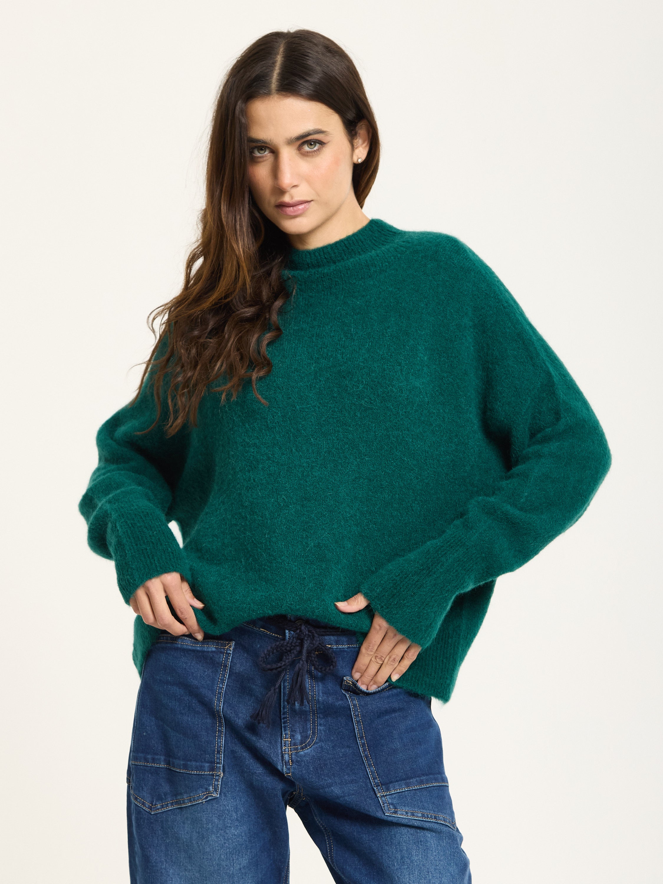 This luxurious oversized sweater is crafted from a soft alpaca blend, offering warmth and lightness in a rich emerald green hue. Featuring dropped shoulders, a relaxed silhouette, and ribbed trims for a casual yet elevated finish.