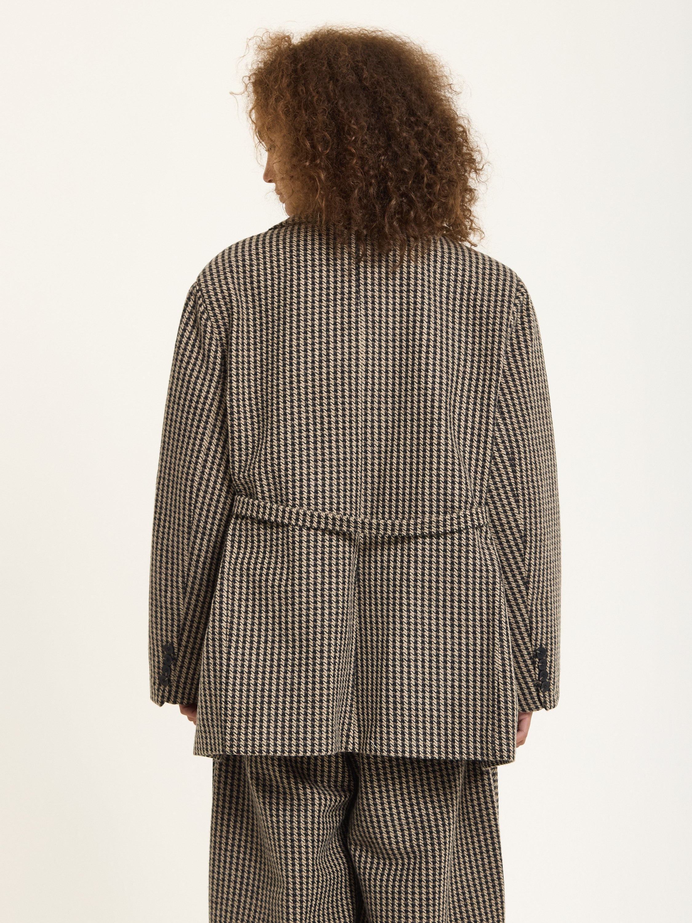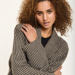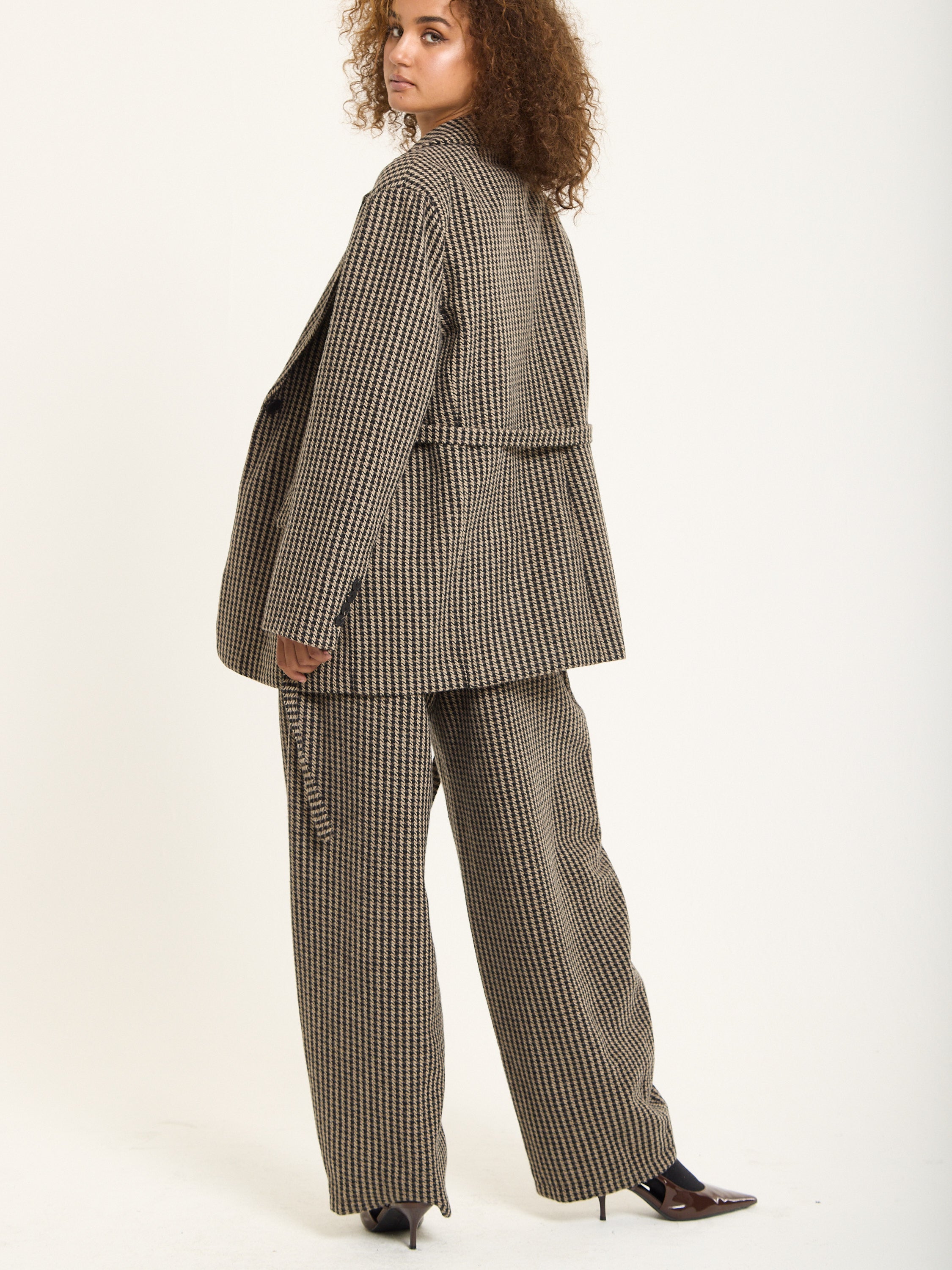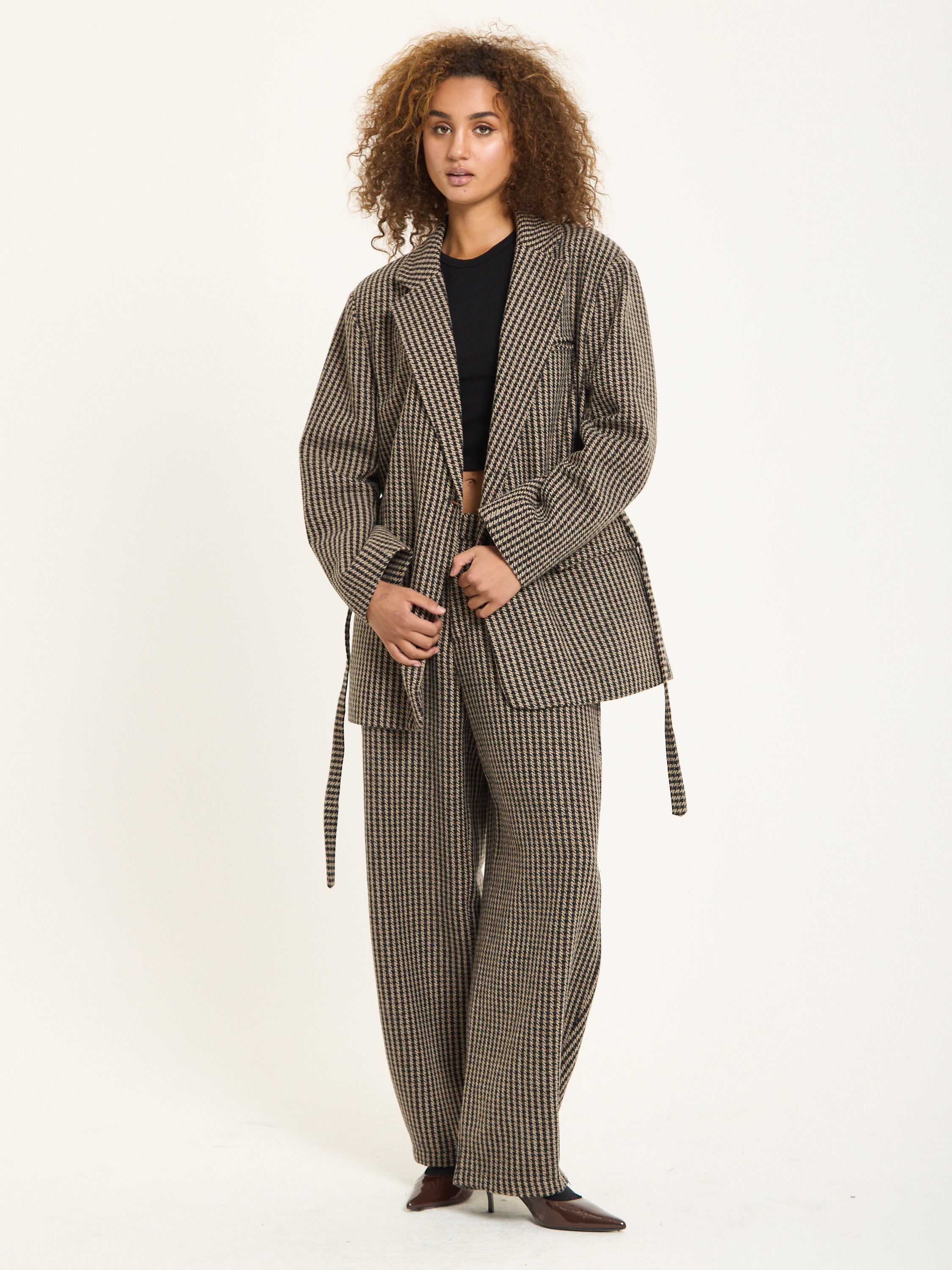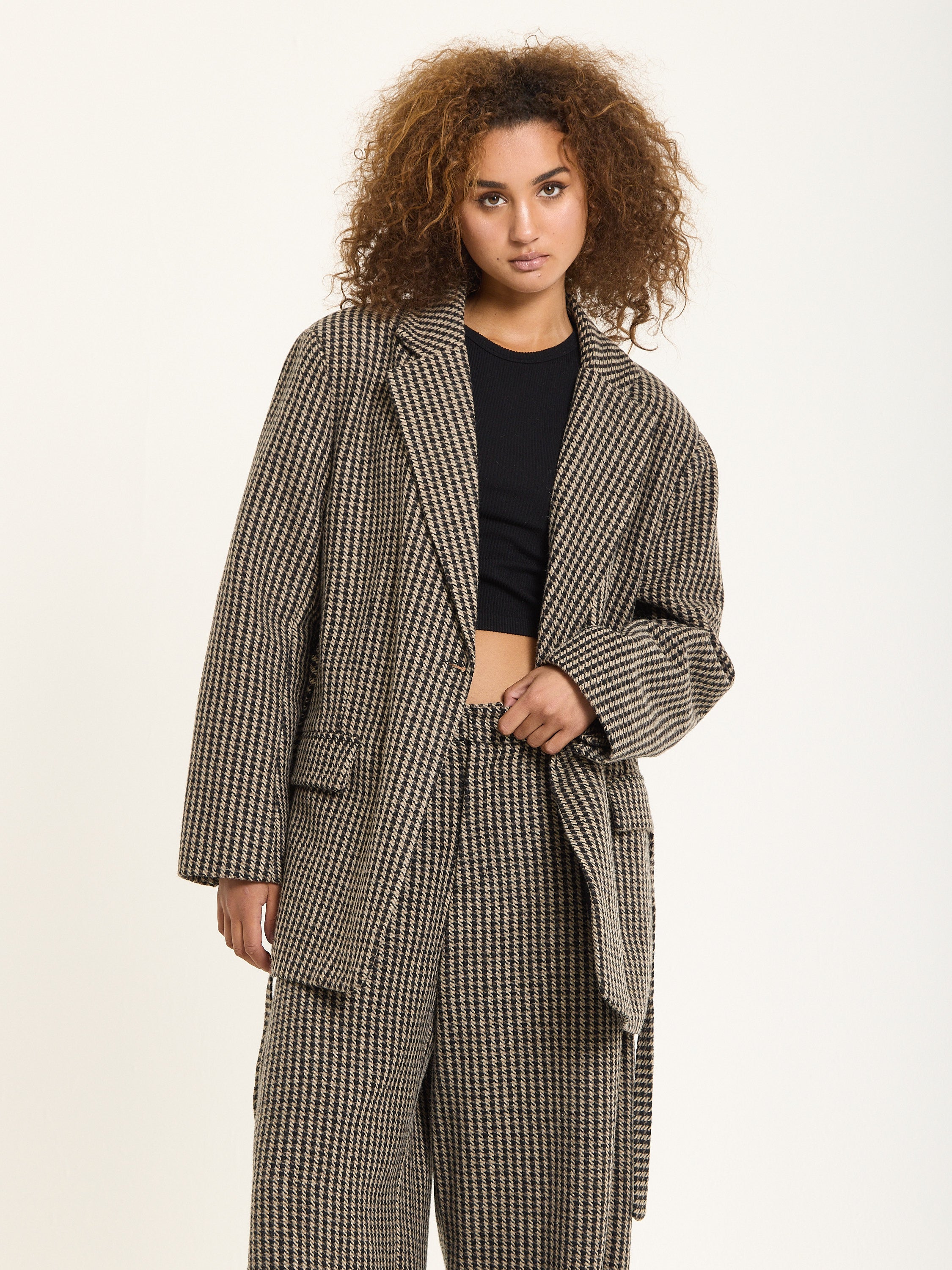 Tailored in a classic beige and black houndstooth pattern, this oversized blazer brings a bold twist to timeless tailoring. Crafted from a soft wool-blend fabric, it features a relaxed silhouette with sharp lapels, front flap pockets, and a detachable belt for added definition. Style it with the matching trousers for a statement co-ord look or wear it over denim for effortless everyday chic.