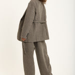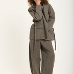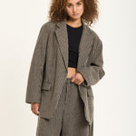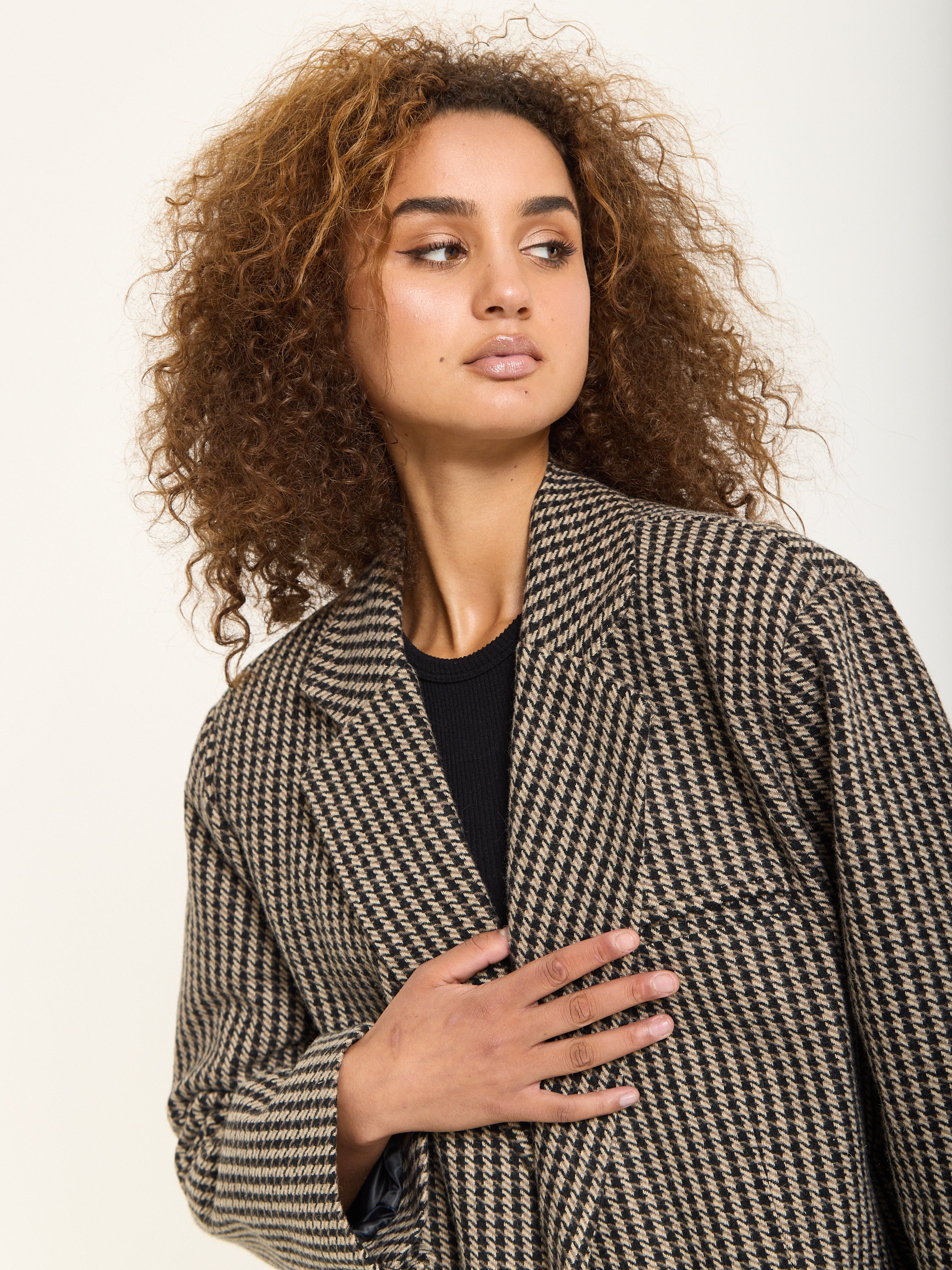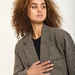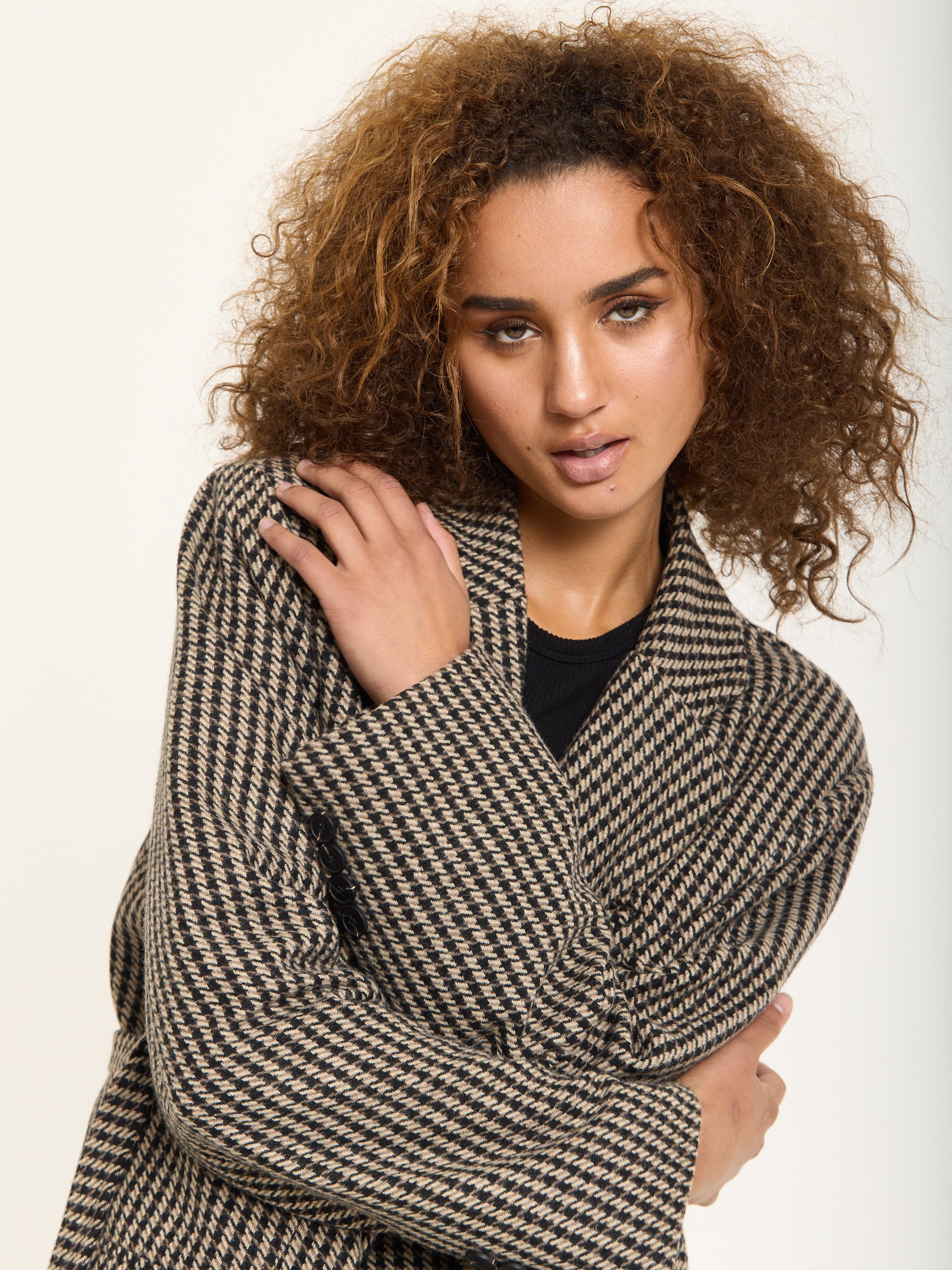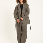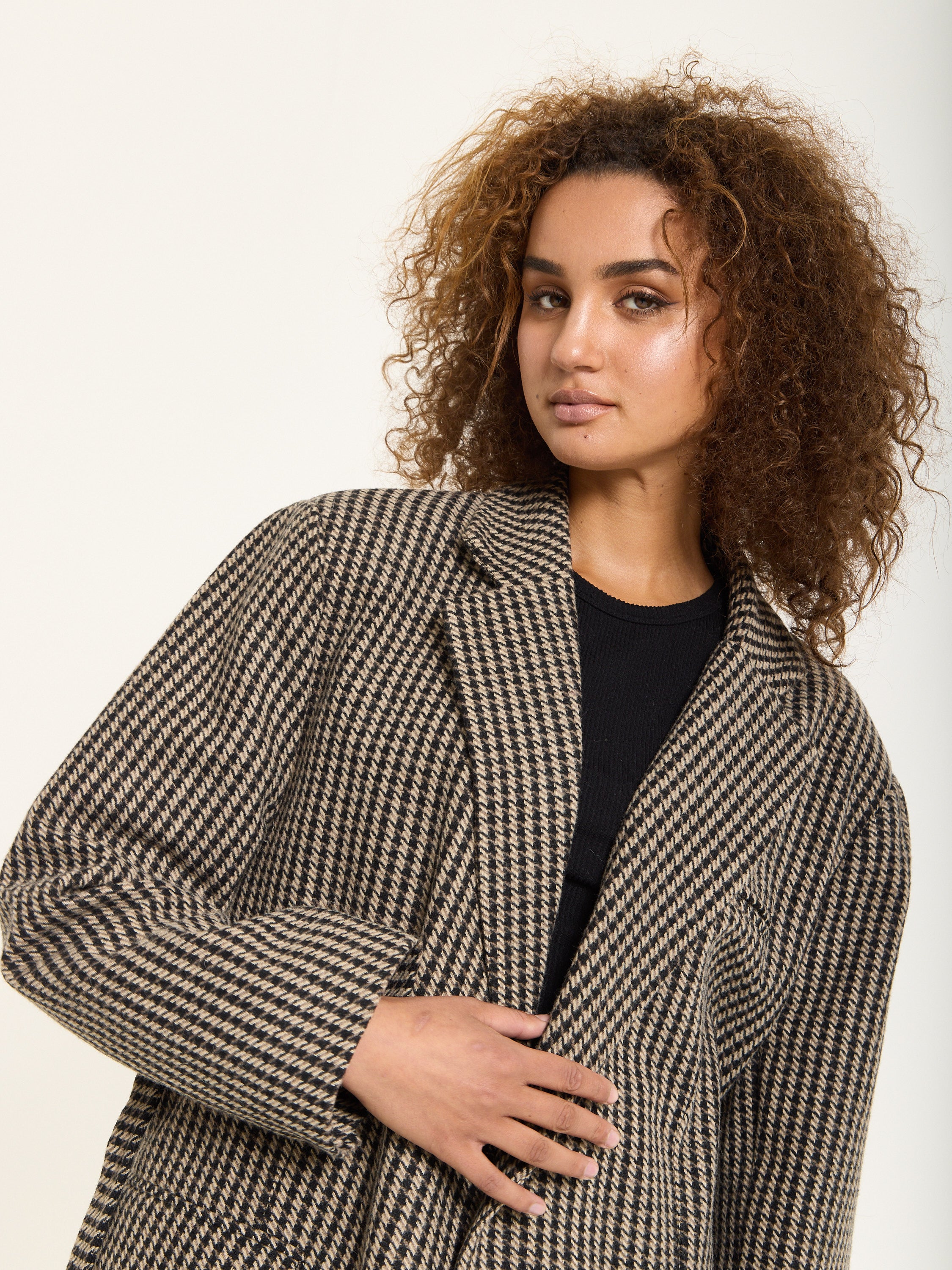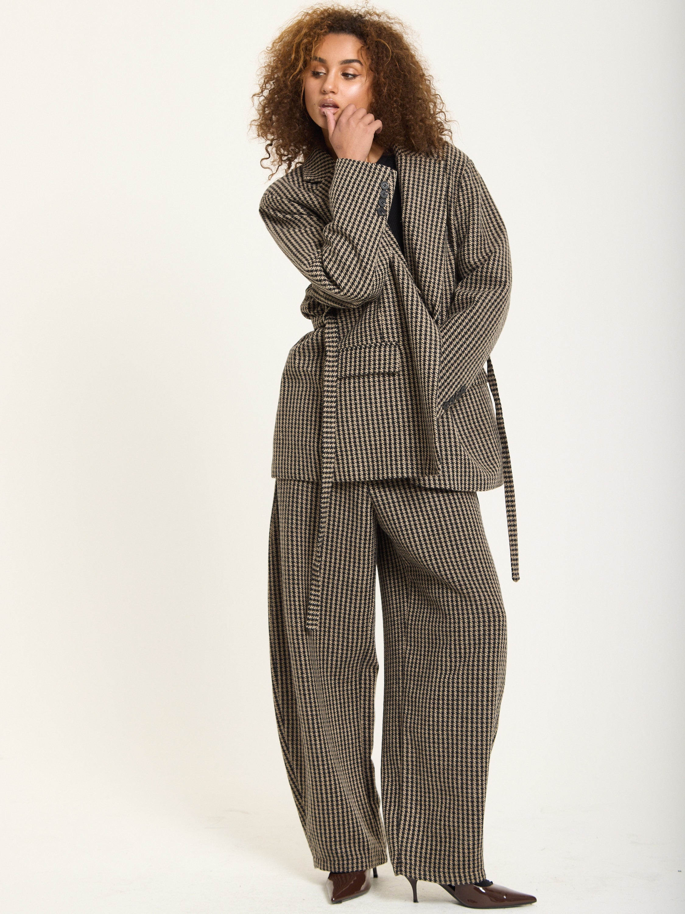 Tailored in a classic beige and black houndstooth pattern, this oversized blazer brings a bold twist to timeless tailoring. Crafted from a soft wool-blend fabric, it features a relaxed silhouette with sharp lapels, front flap pockets, and a detachable belt for added definition. Style it with the matching trousers for a statement co-ord look or wear it over denim for effortless everyday chic.