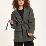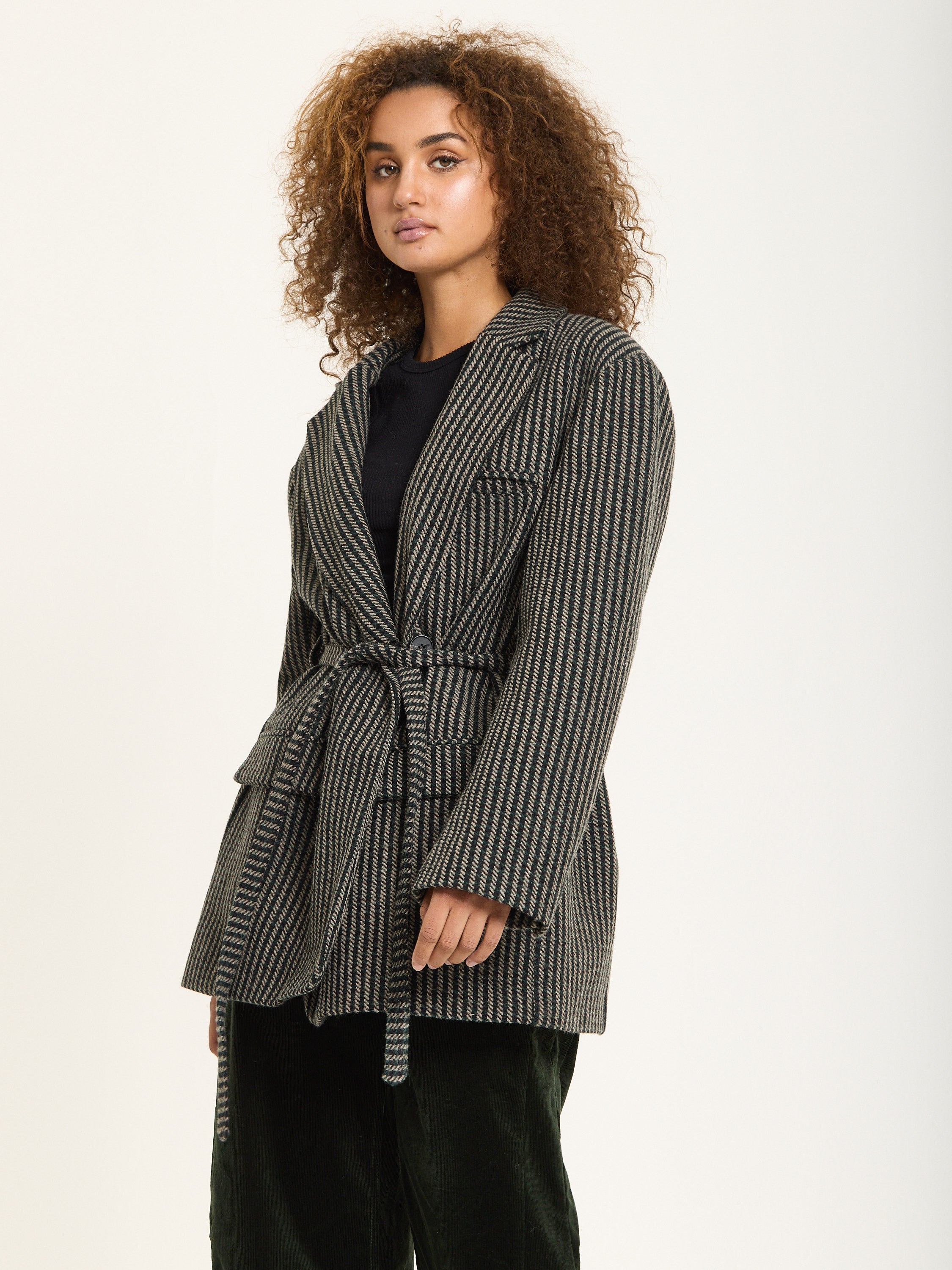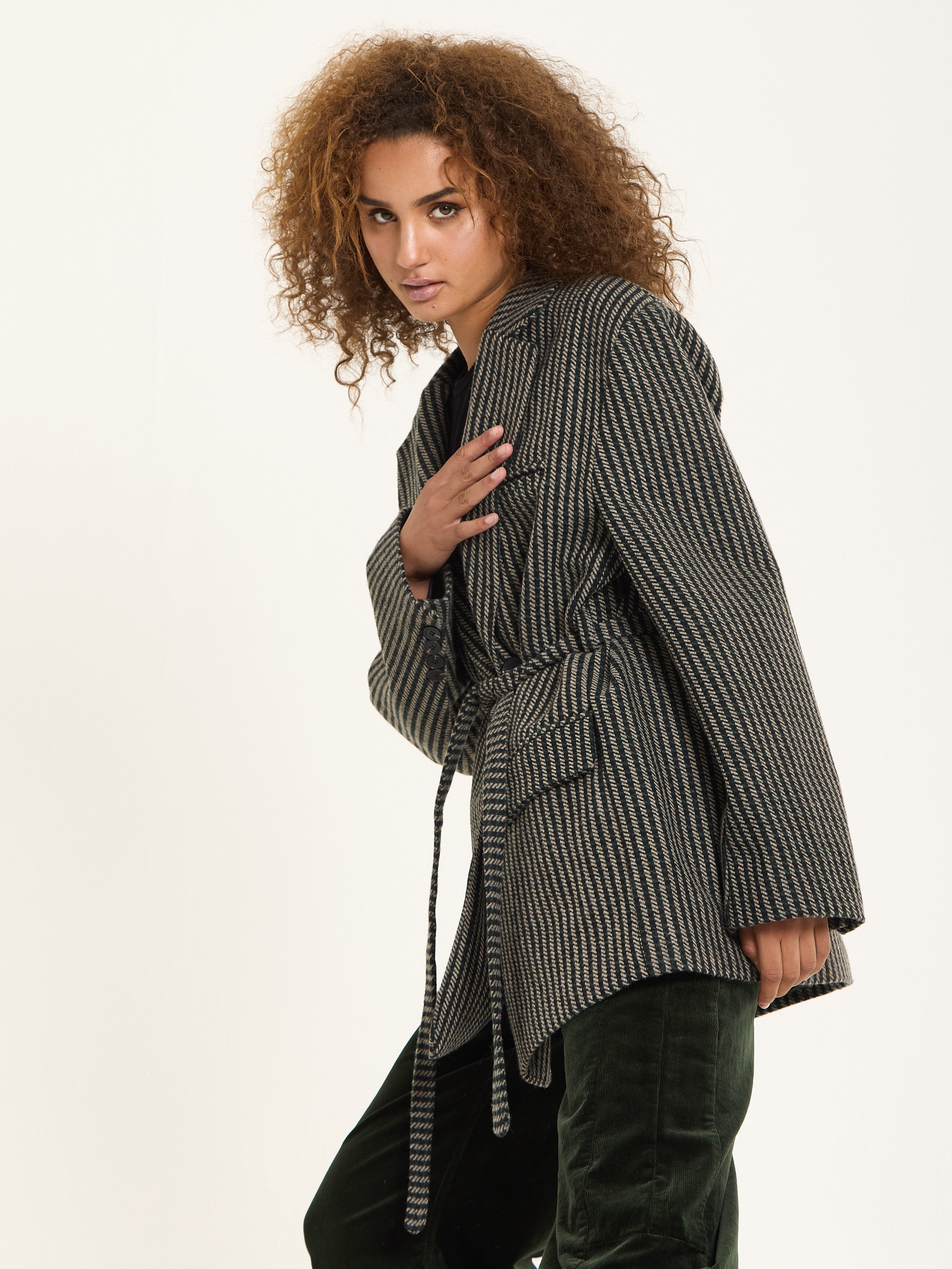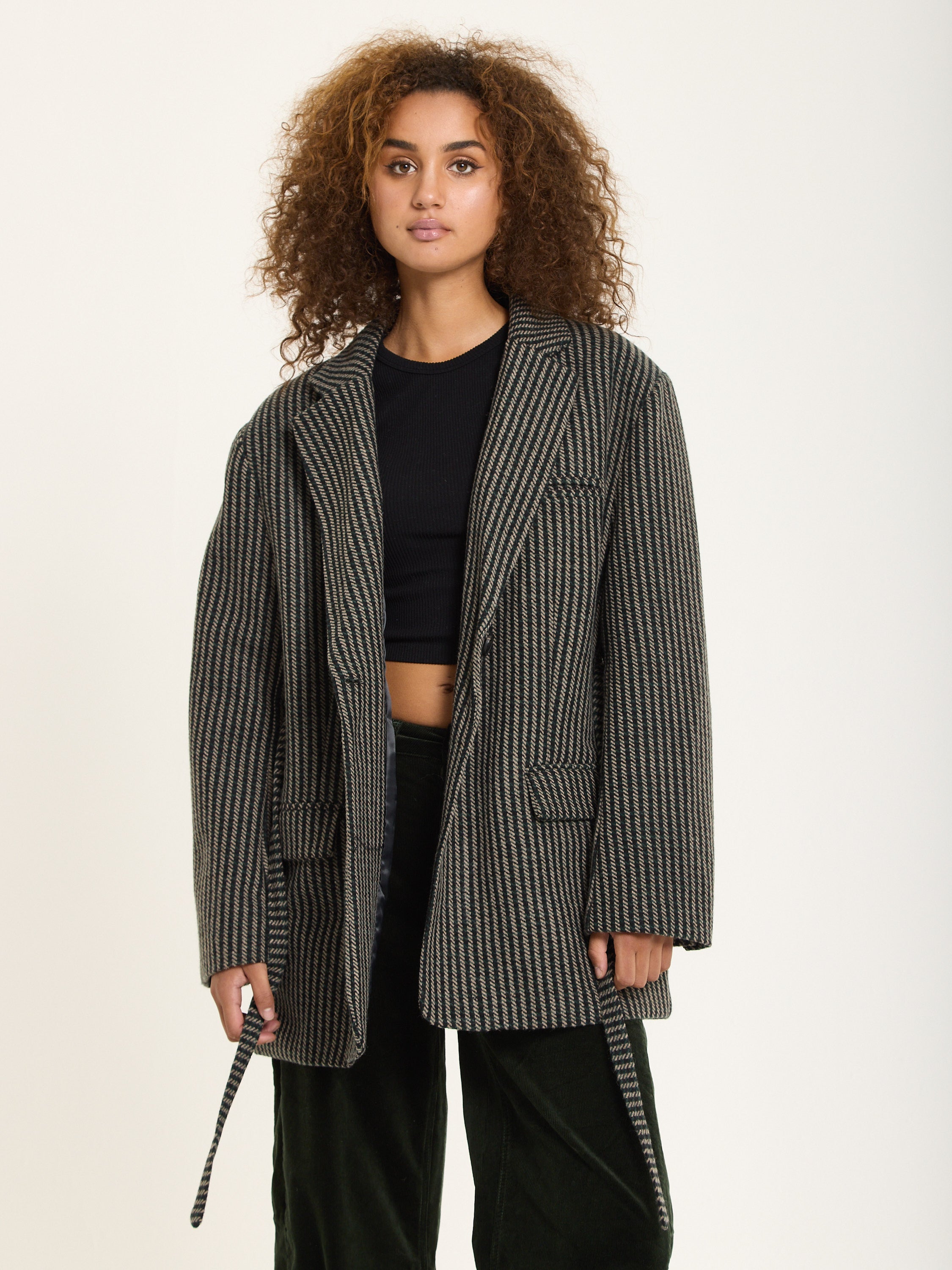 Tailored sophistication meets relaxed modernity in this wool blend belted blazer. Cut to an oversized silhouette, it features a subtle woven stripe pattern, notched lapels, and a matching fabric belt that cinches the waist for effortless definition. Designed to elevate both casual and smart looks, this piece blends classic structure with a laid-back House of Holland edge.