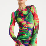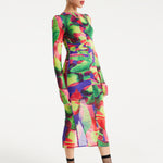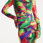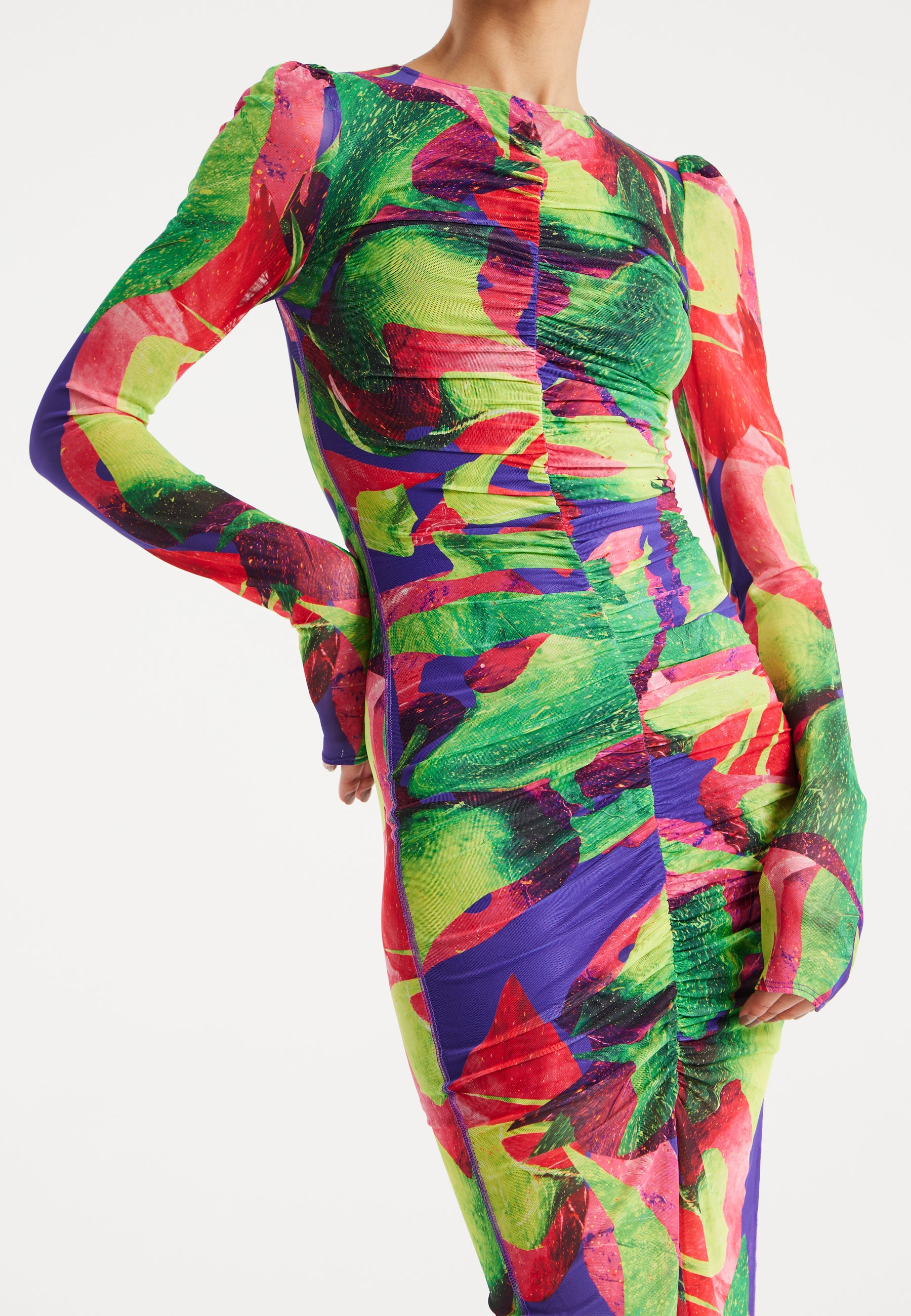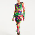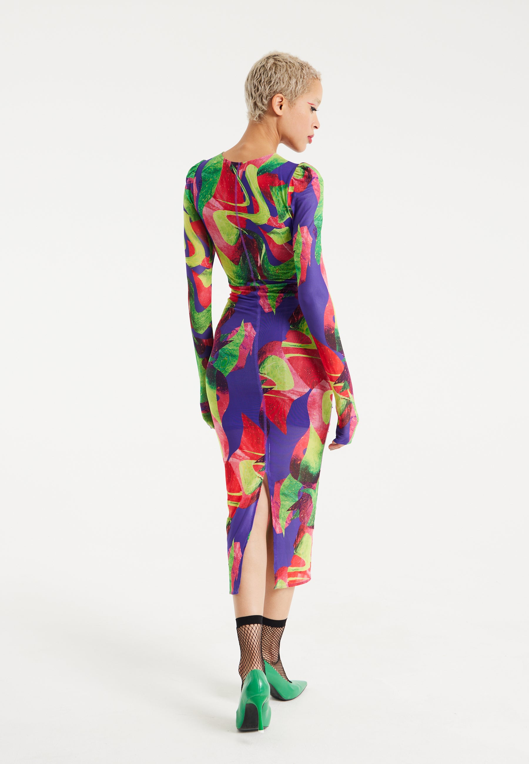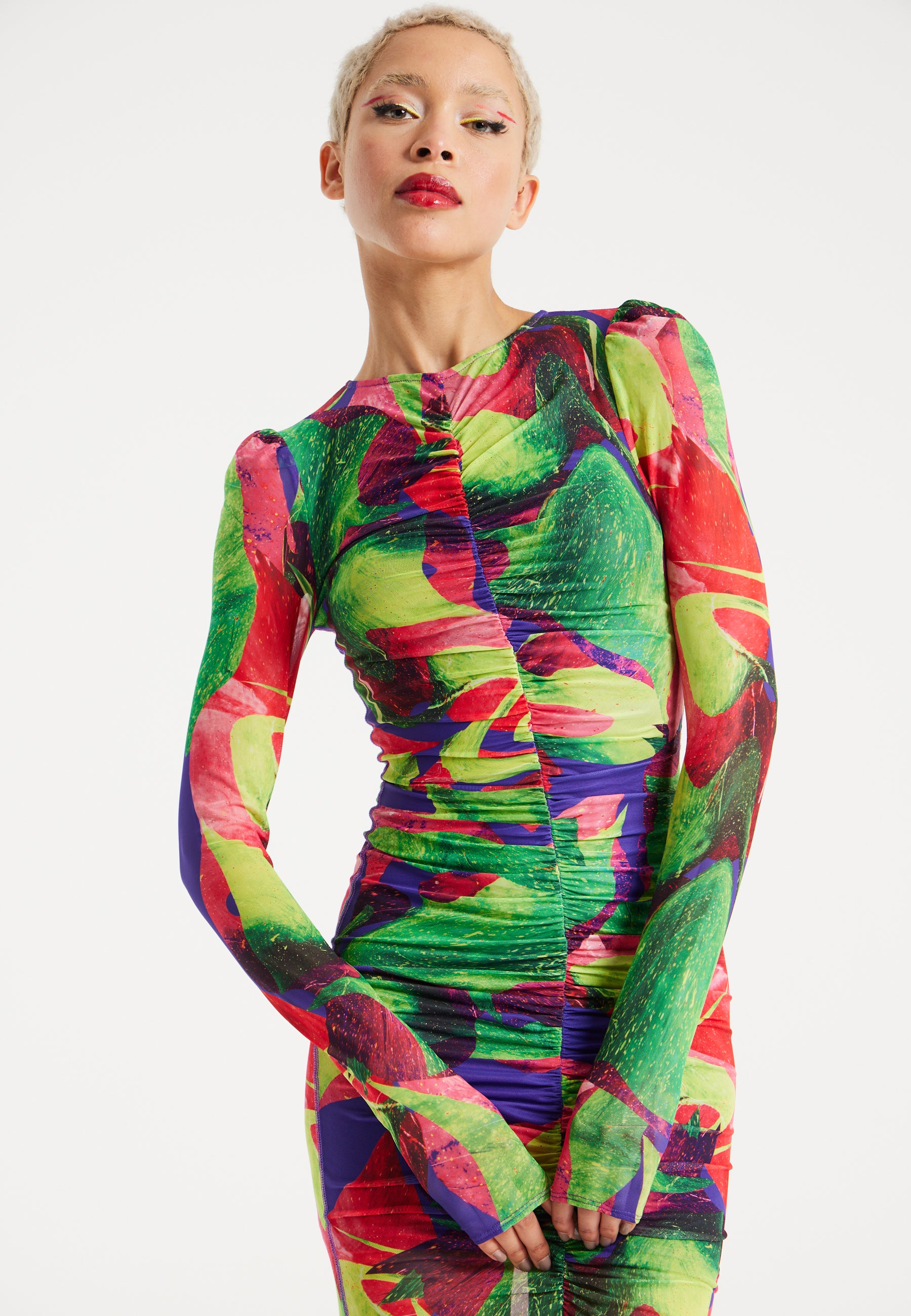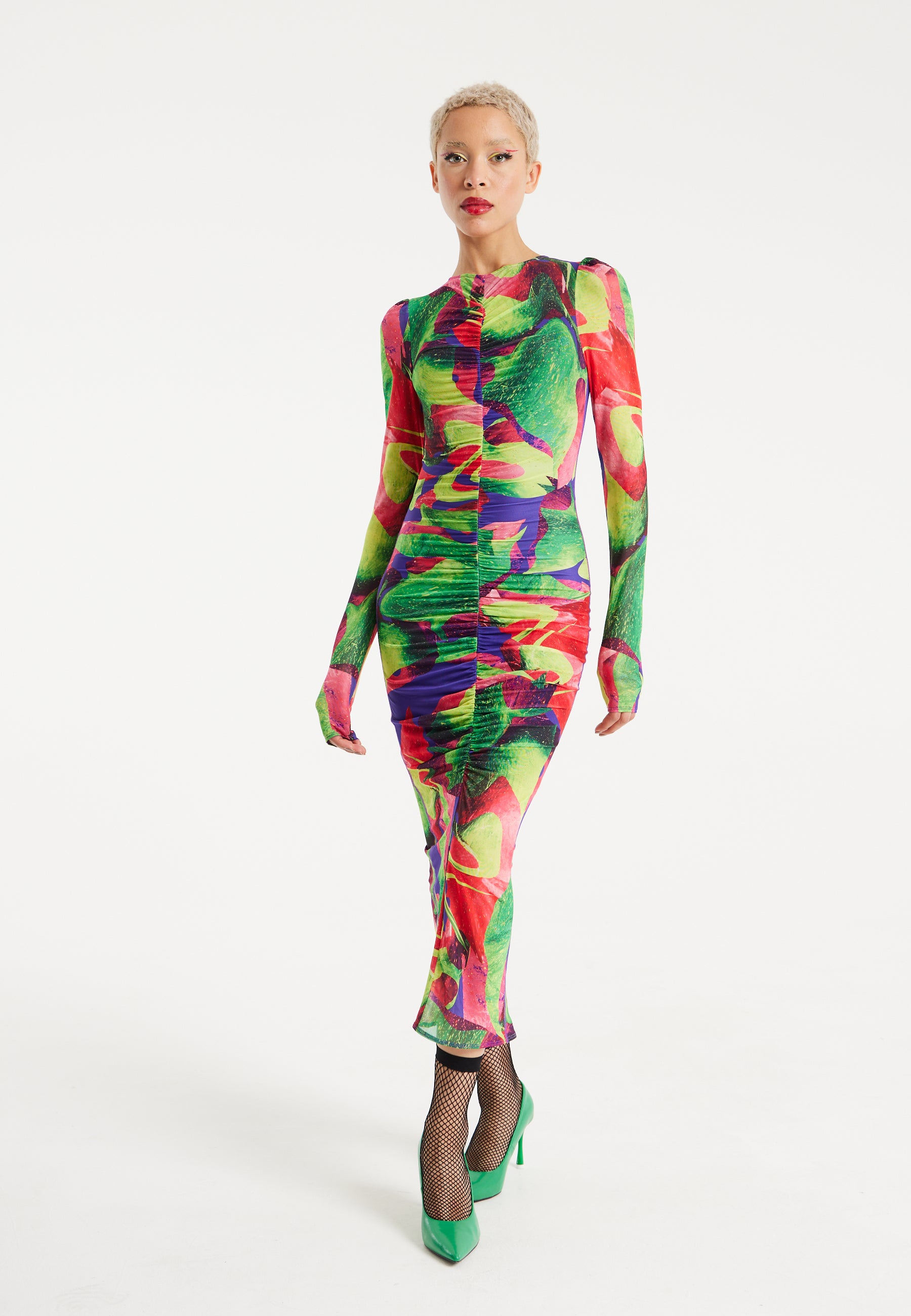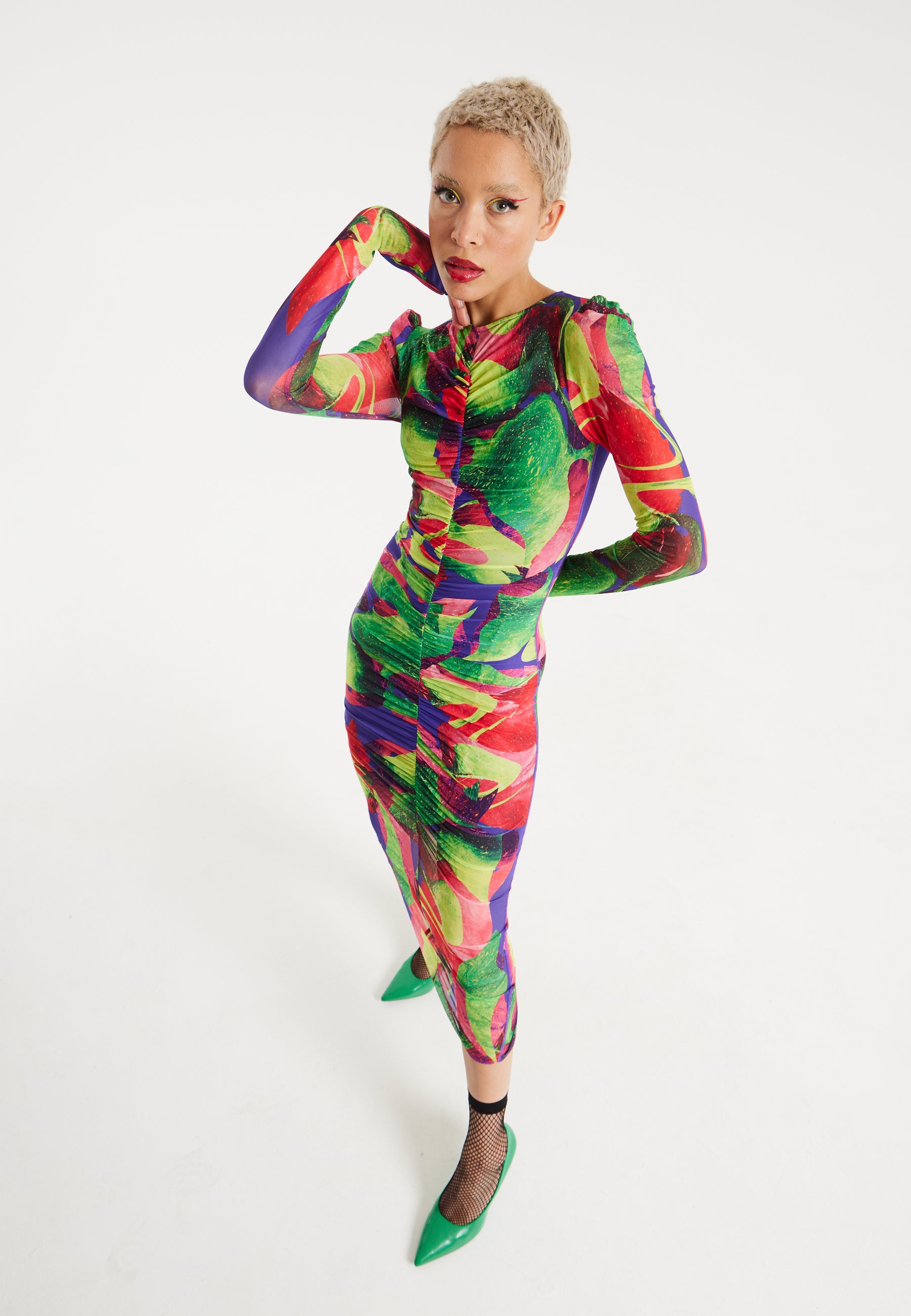 House Of Holland abstract multicolour print midi dress with a ruching design detail. A bodycon dress with a flattering silhouette; get ready to be the most colourful in the room.Â