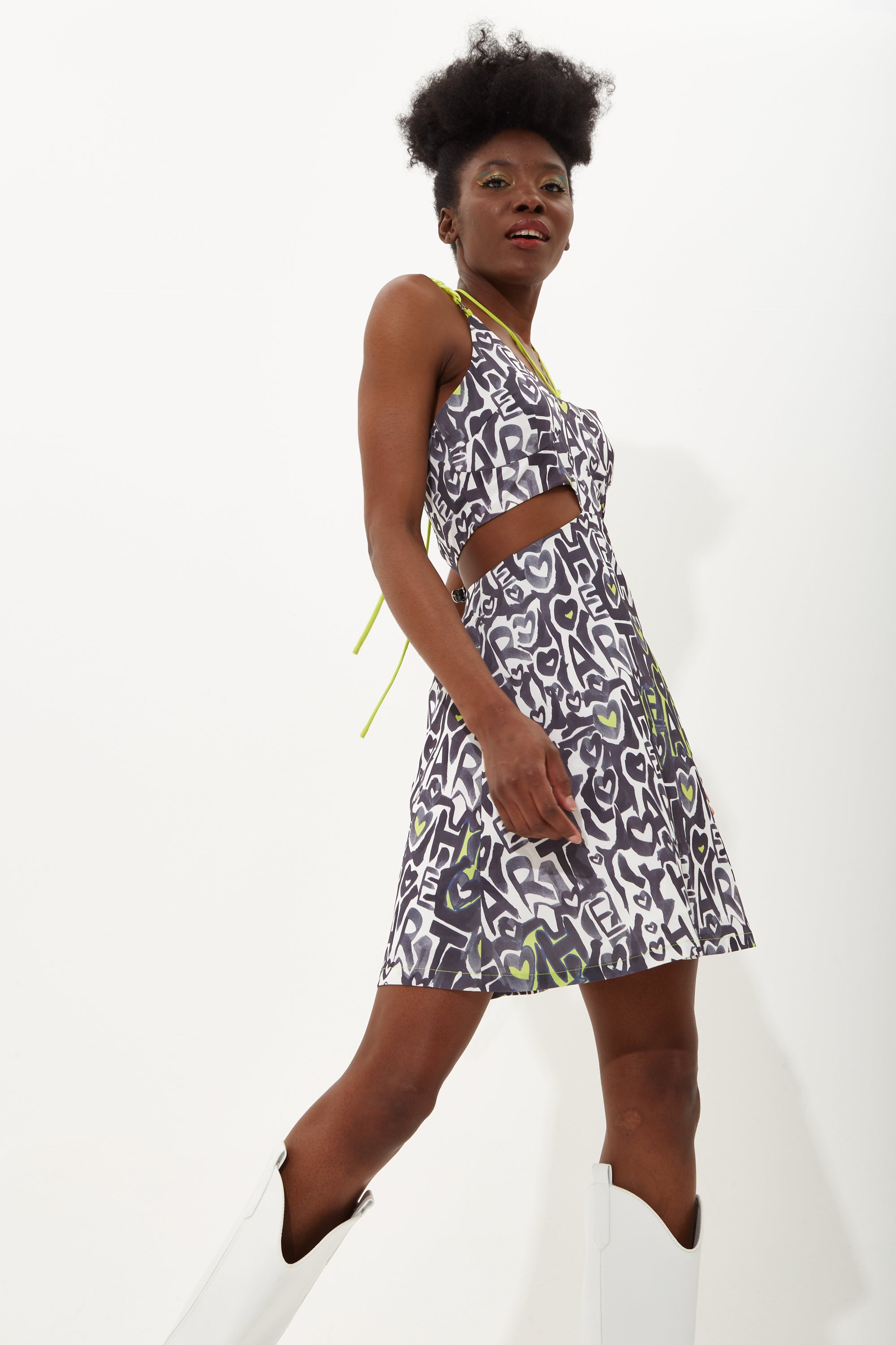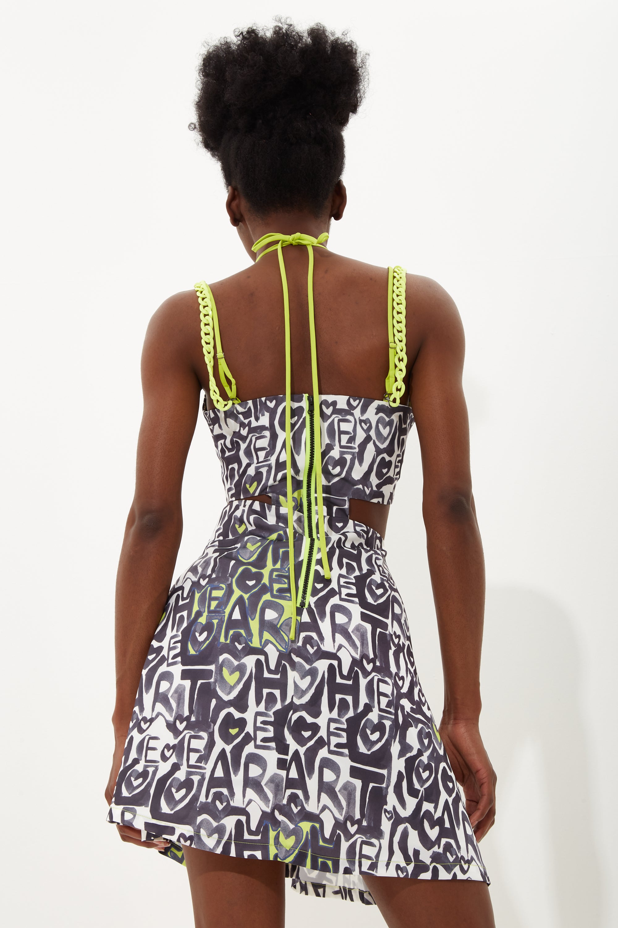 House Of Holland abstract print mini dress with waist cut-outs and a neon tie neck. Finished off with neon chain straps to complement the monochrome print.