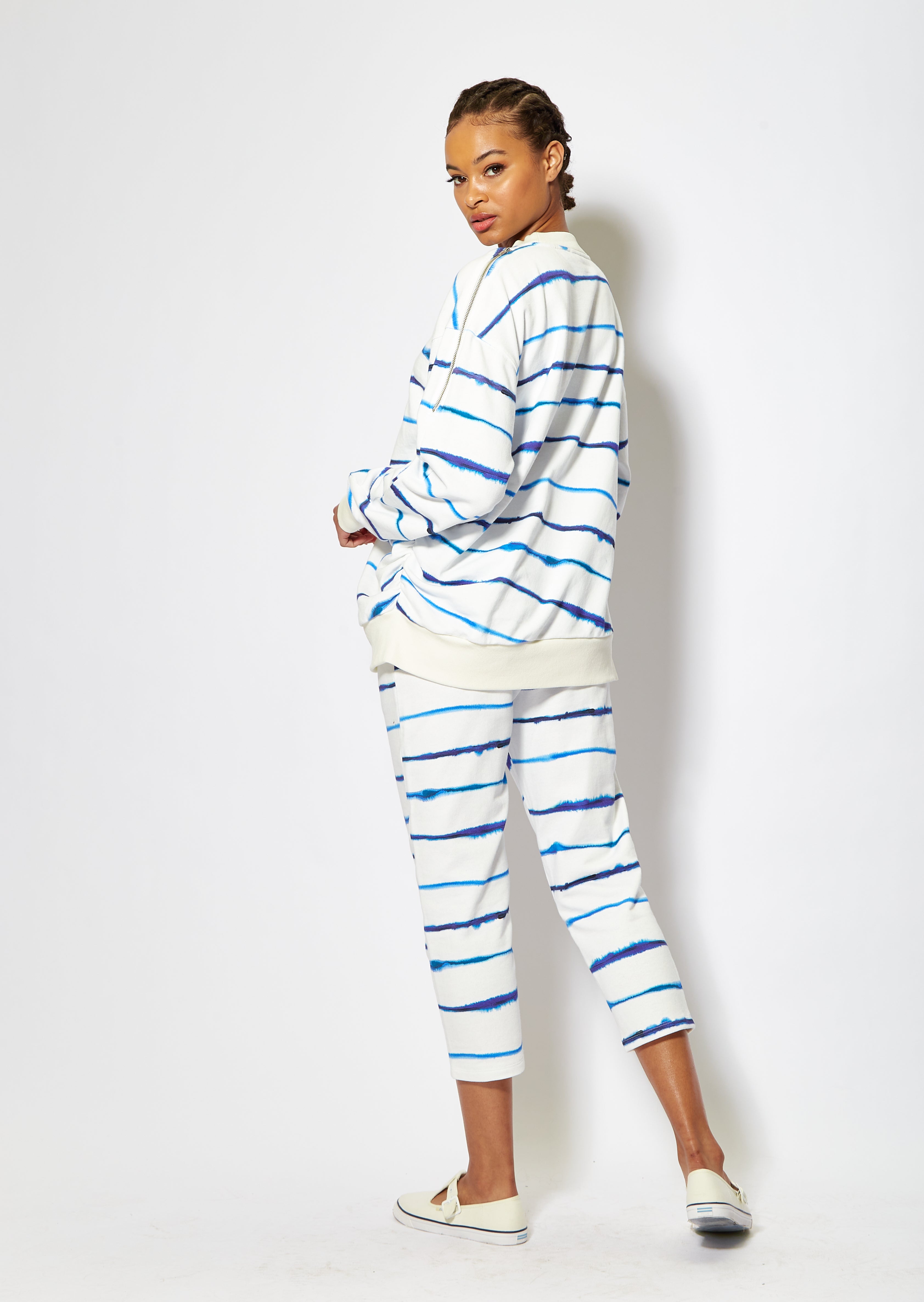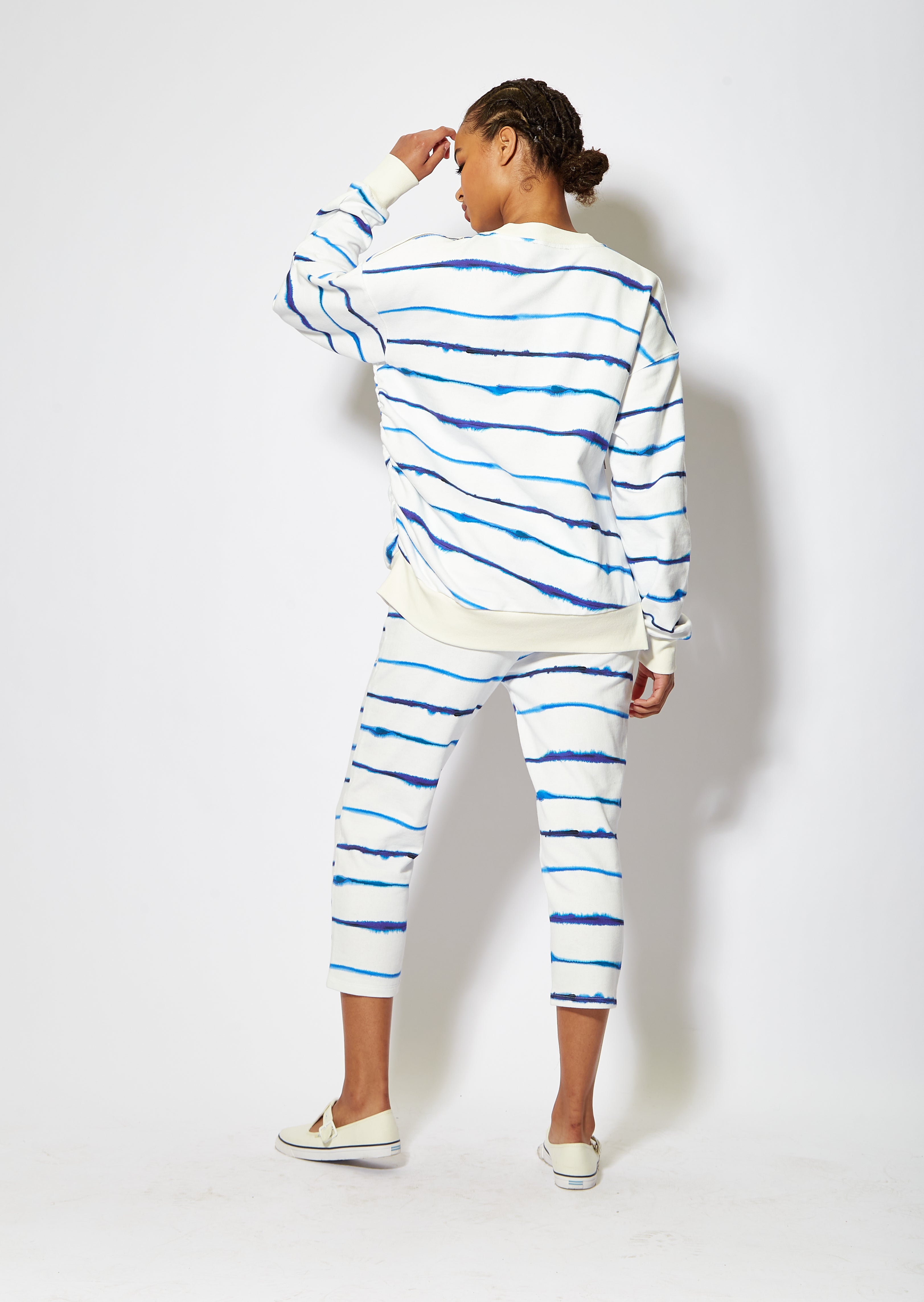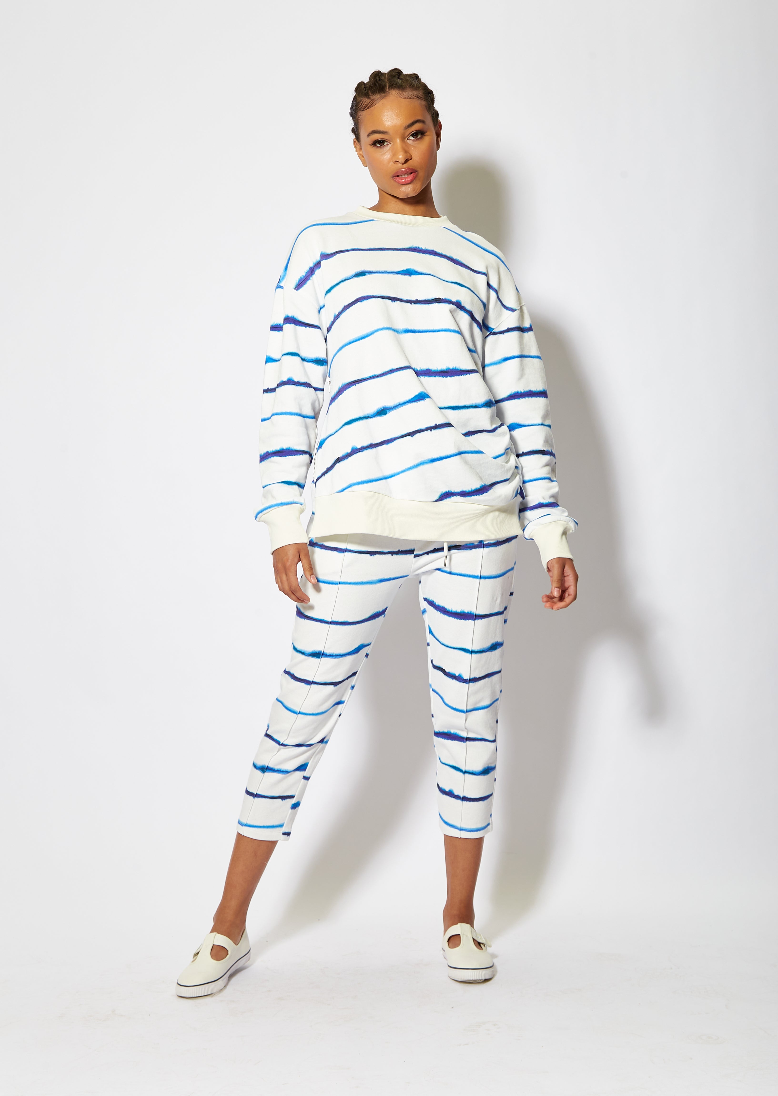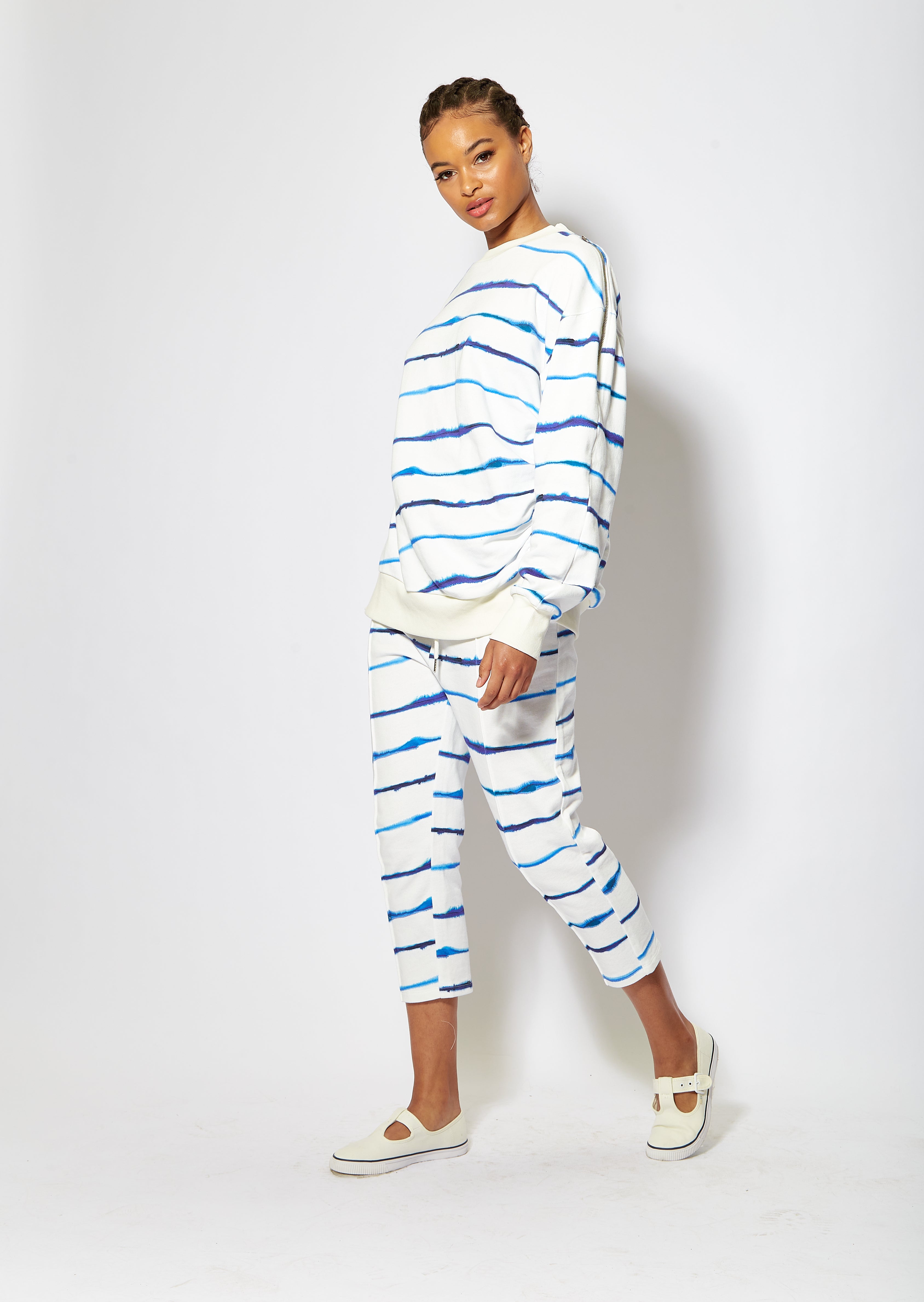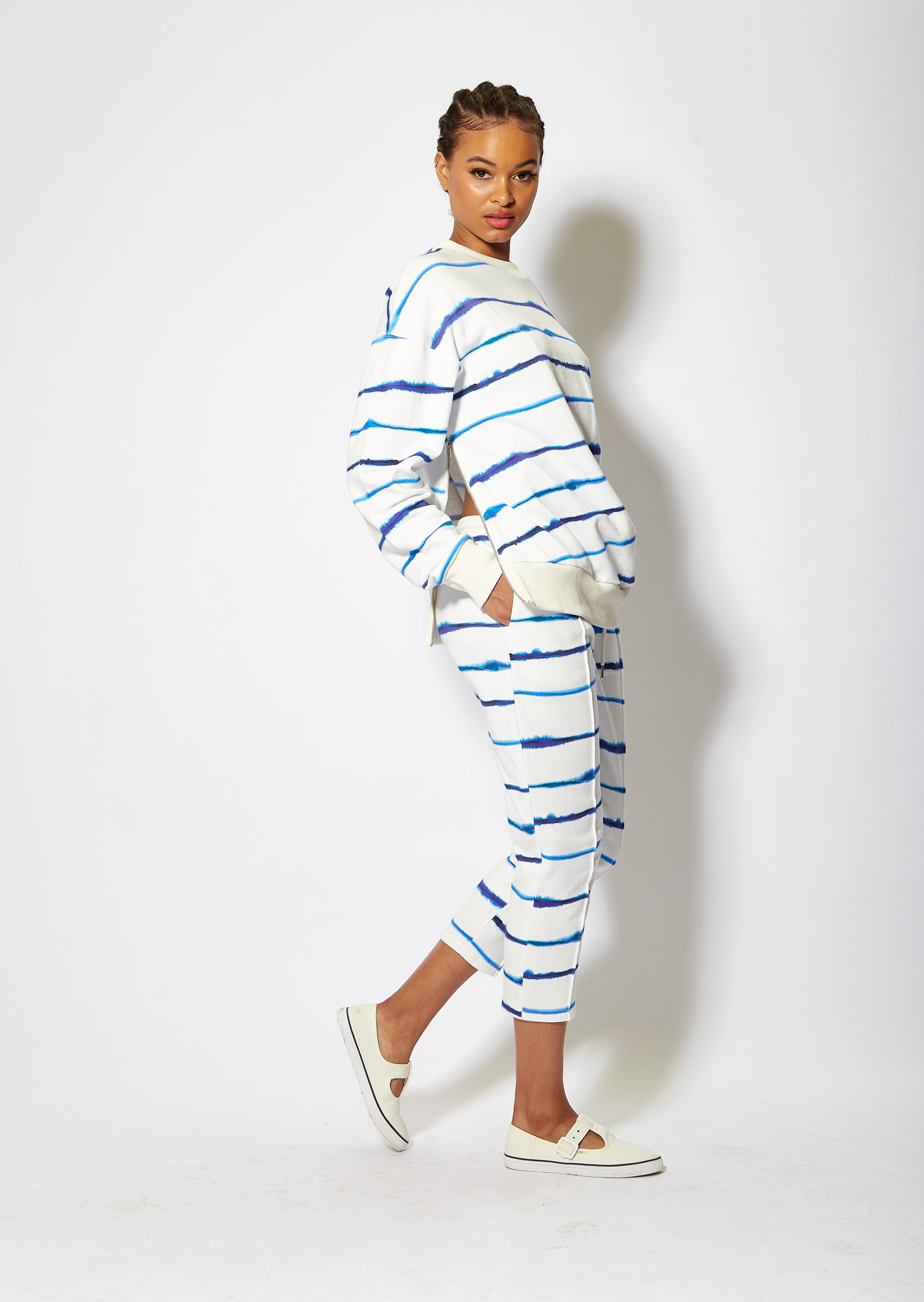 Blue Ink diagonal stripe all-over print, 3/4 length joggers. Drawstring detail, relaxed fit. Wear alone with your go to white t-shirt or go wild and wear with the matching sweatshirt!