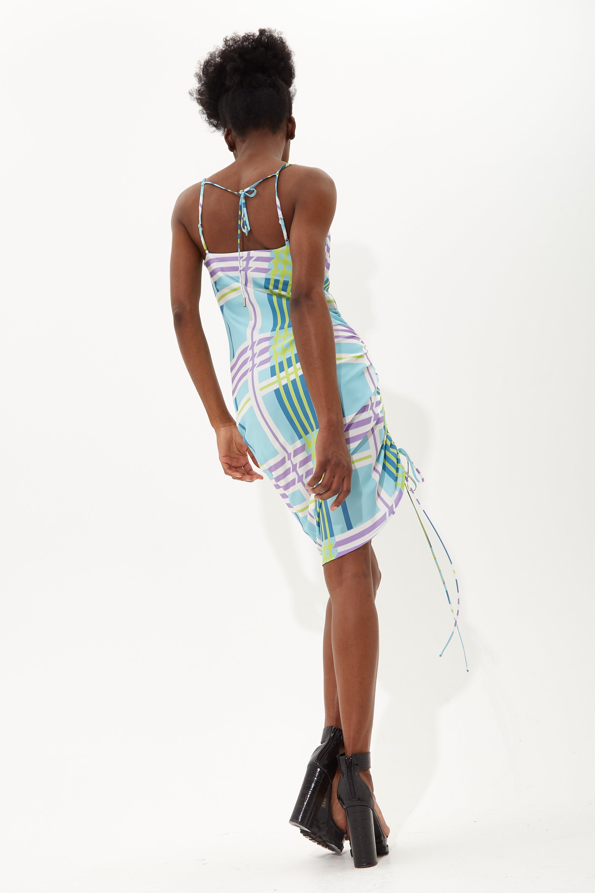 House of Holland check mini dress with a cowl neckline and adjustable ruched sides.