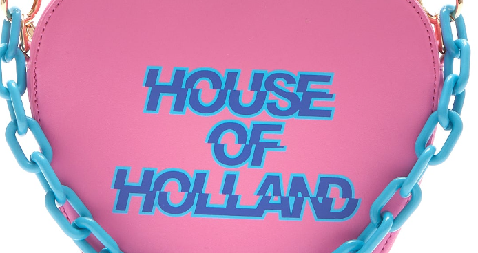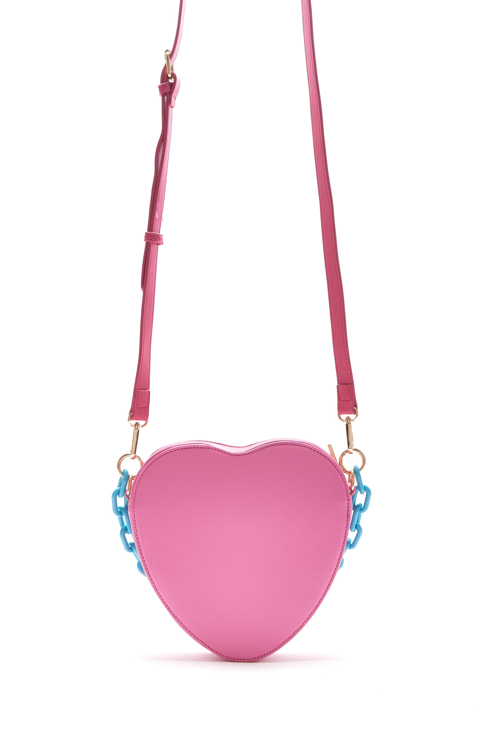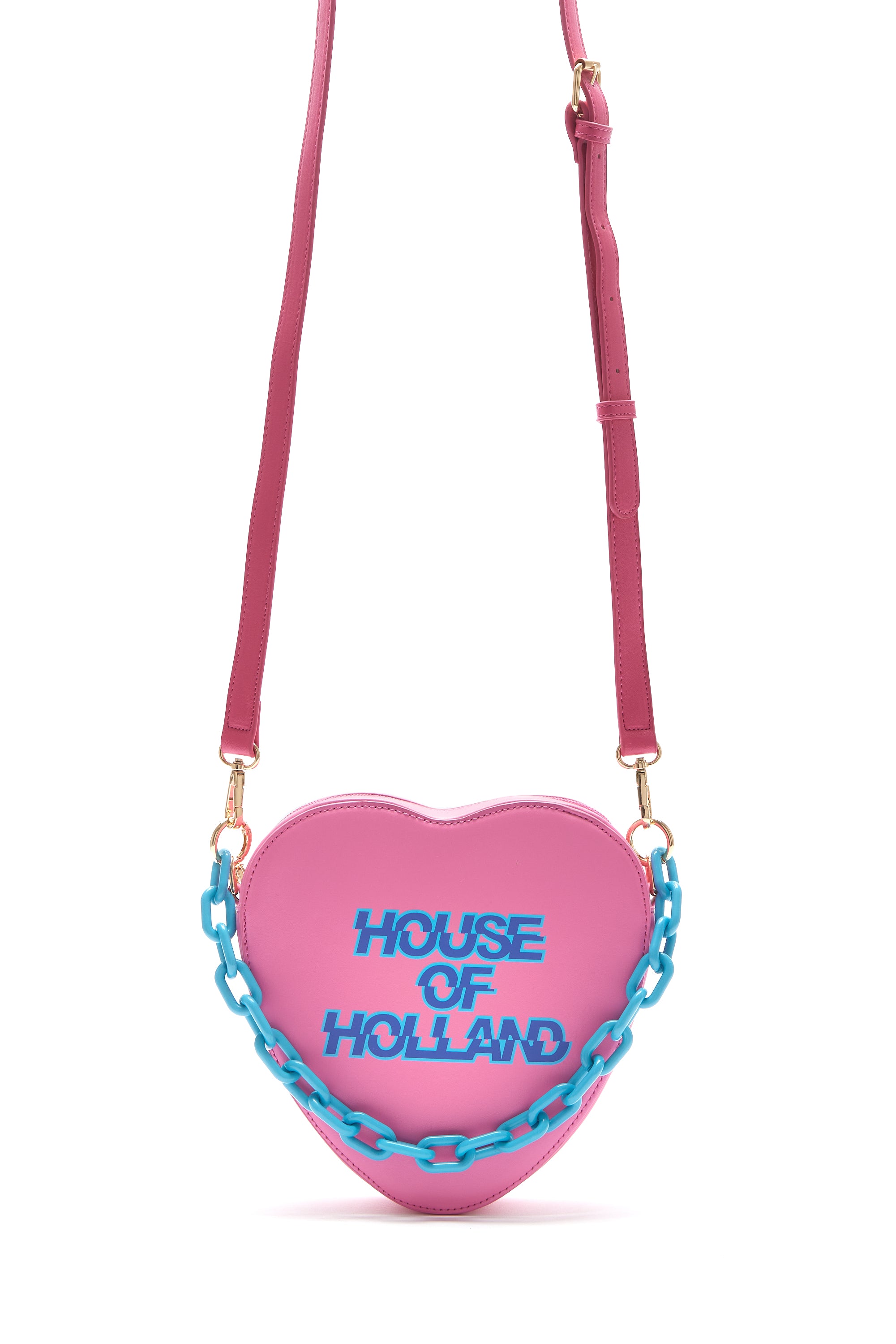 House Of Holland Heart Shape Cross Body Bag In Pink With A Chain Detail And Printed Logo