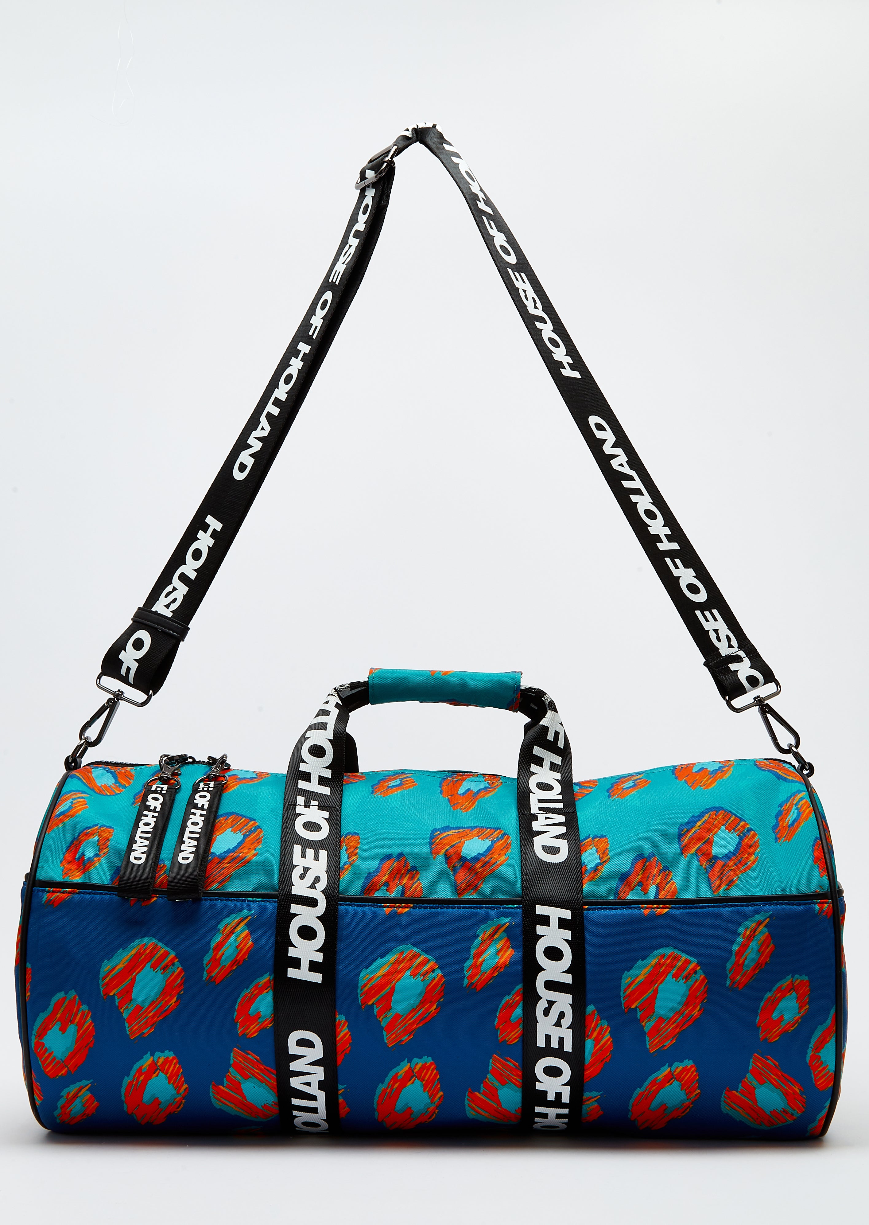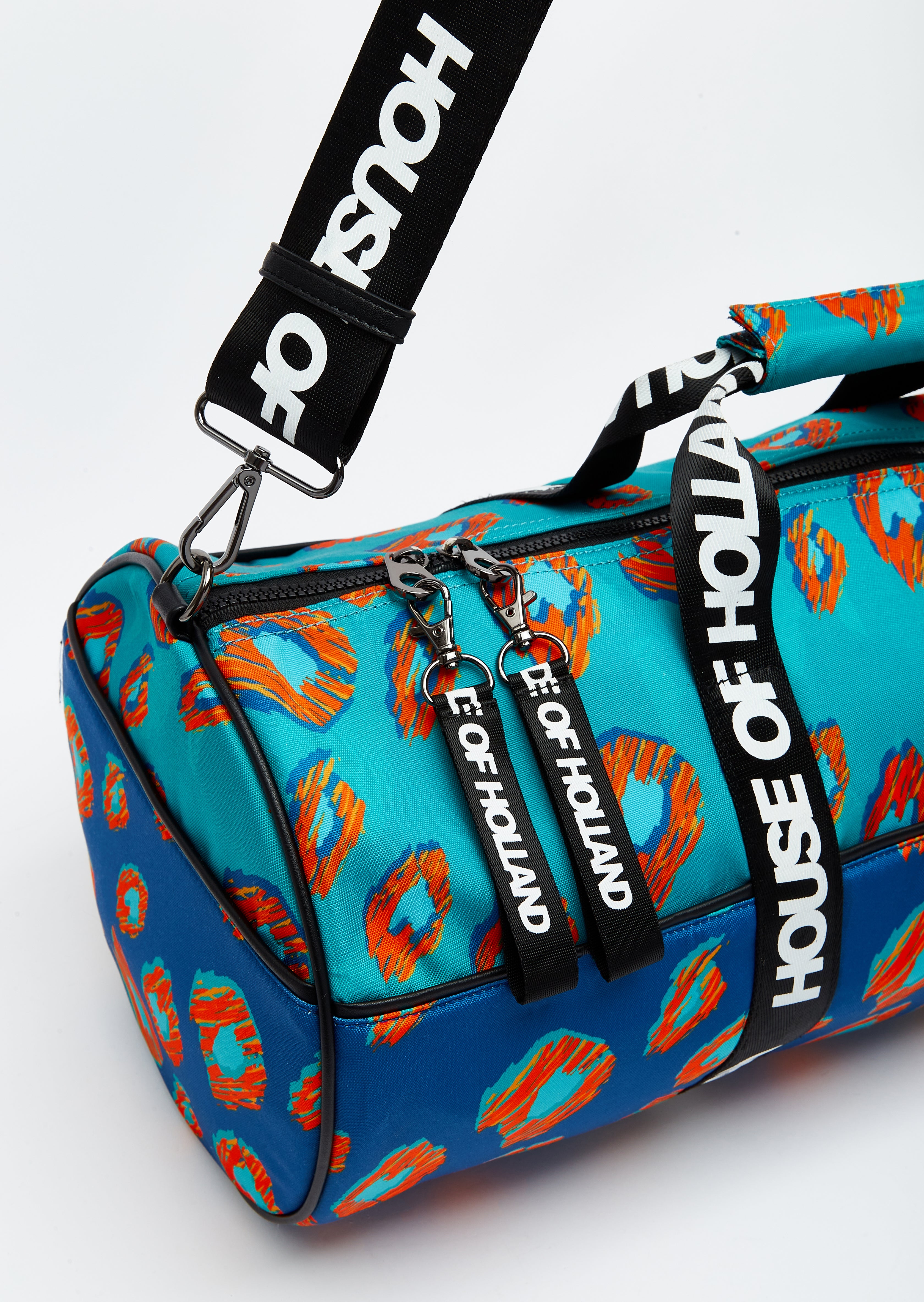 House of Holland multi colour abstract animal print weekender bag with branded straps, adjustable straps detail.