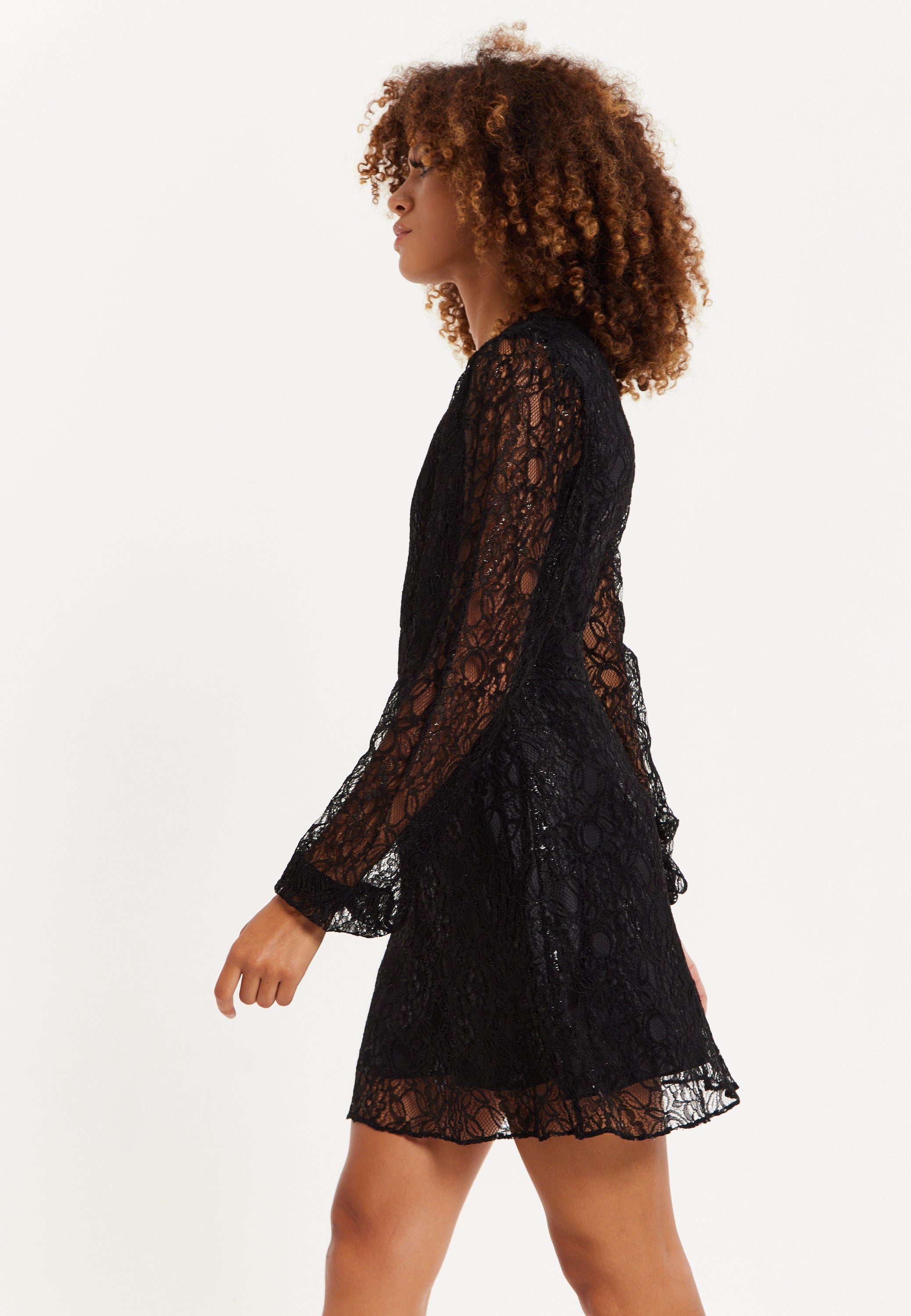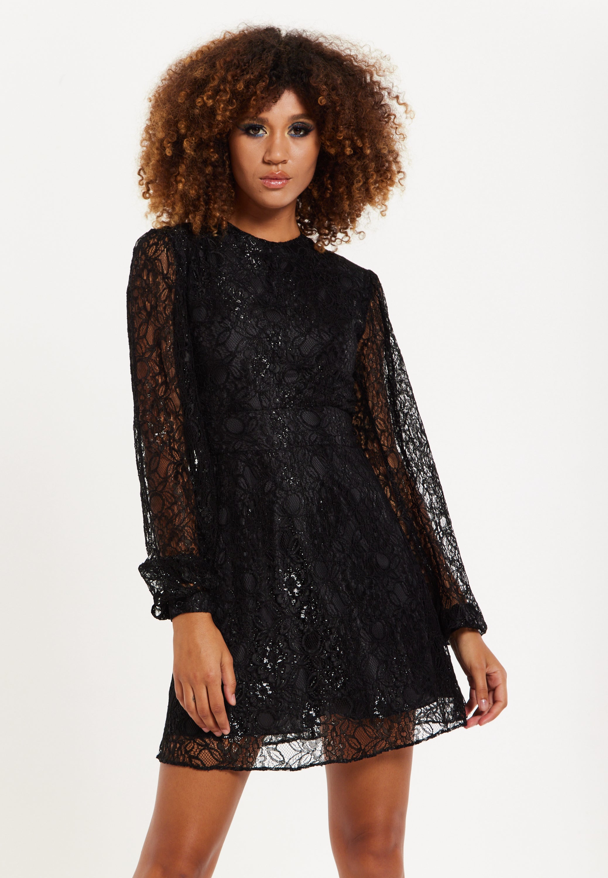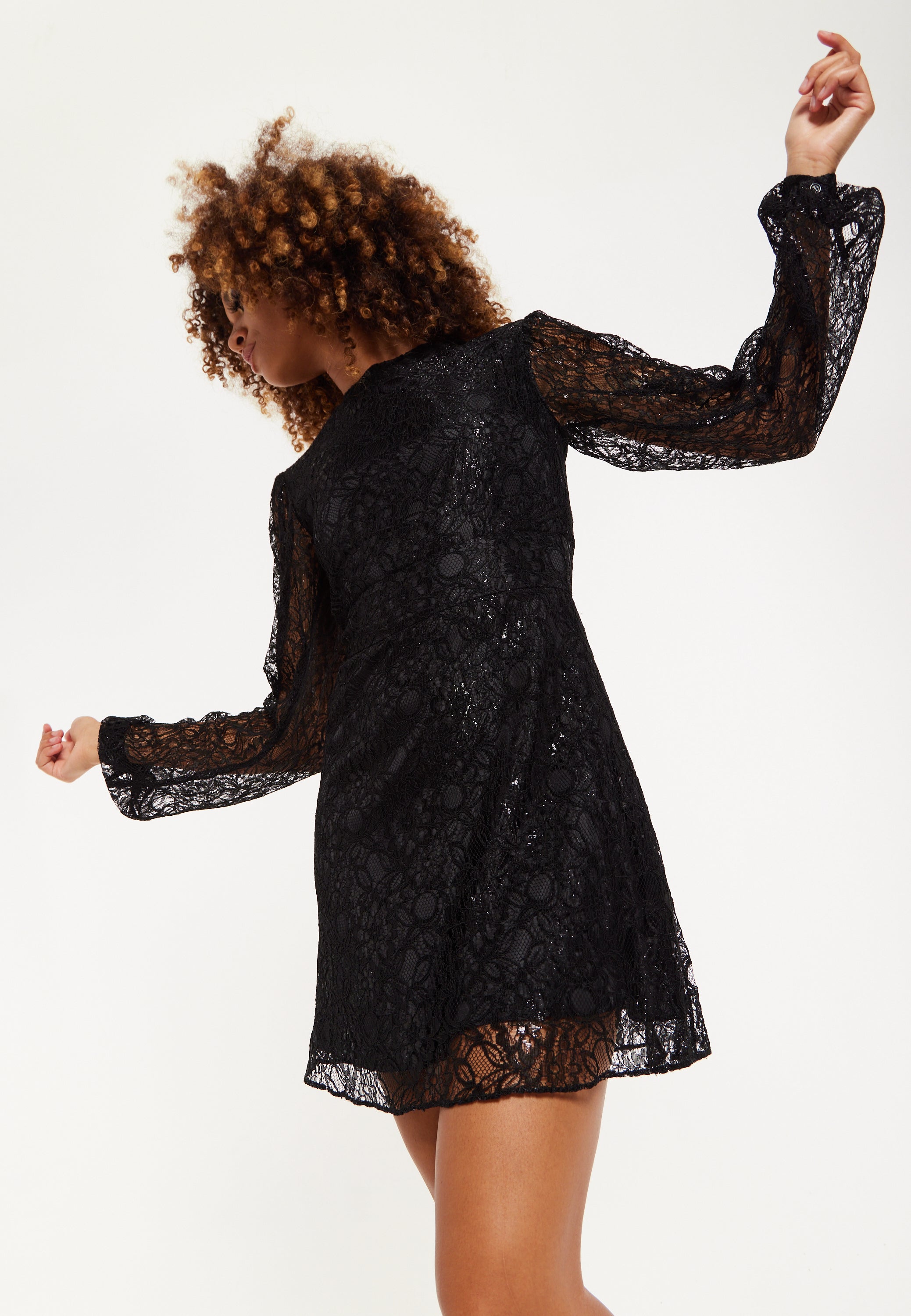 Embrace elegance with a touch of mystery in the Midnight Lace Long-Sleeve Mini Dress. This chic black mini dress features a delicate lace overlay with intricate floral patterns that add dimension and texture. Designed with sheer, long sleeves and a high neckline, it balances sophistication with a hint of allure. The subtle shimmer woven into the lace catches the light beautifully, making it perfect for evening events or cocktail parties. With its relaxed yet flattering A-line silhouette, this dress pairs effortlessly with heels or ankle boots for a look that’s both classic and captivating.