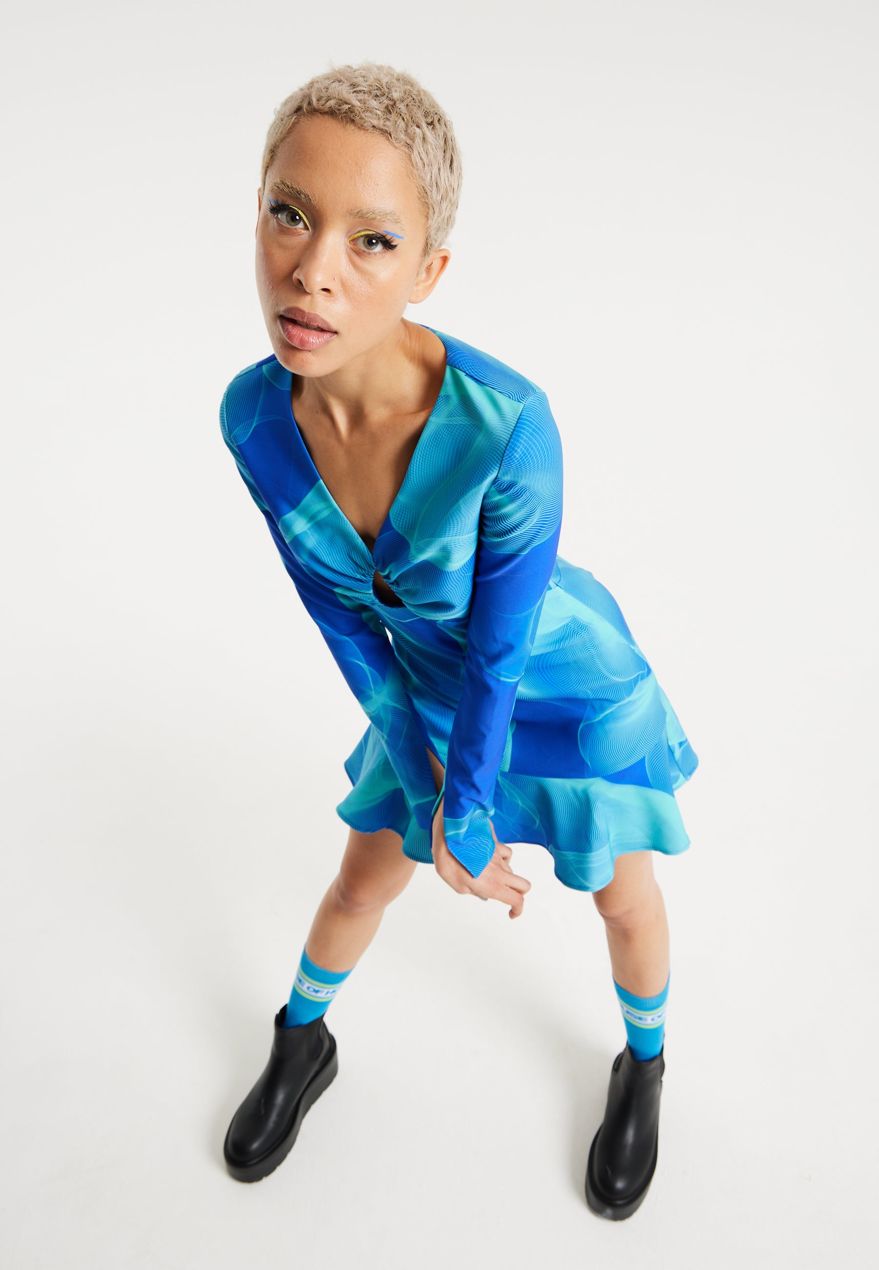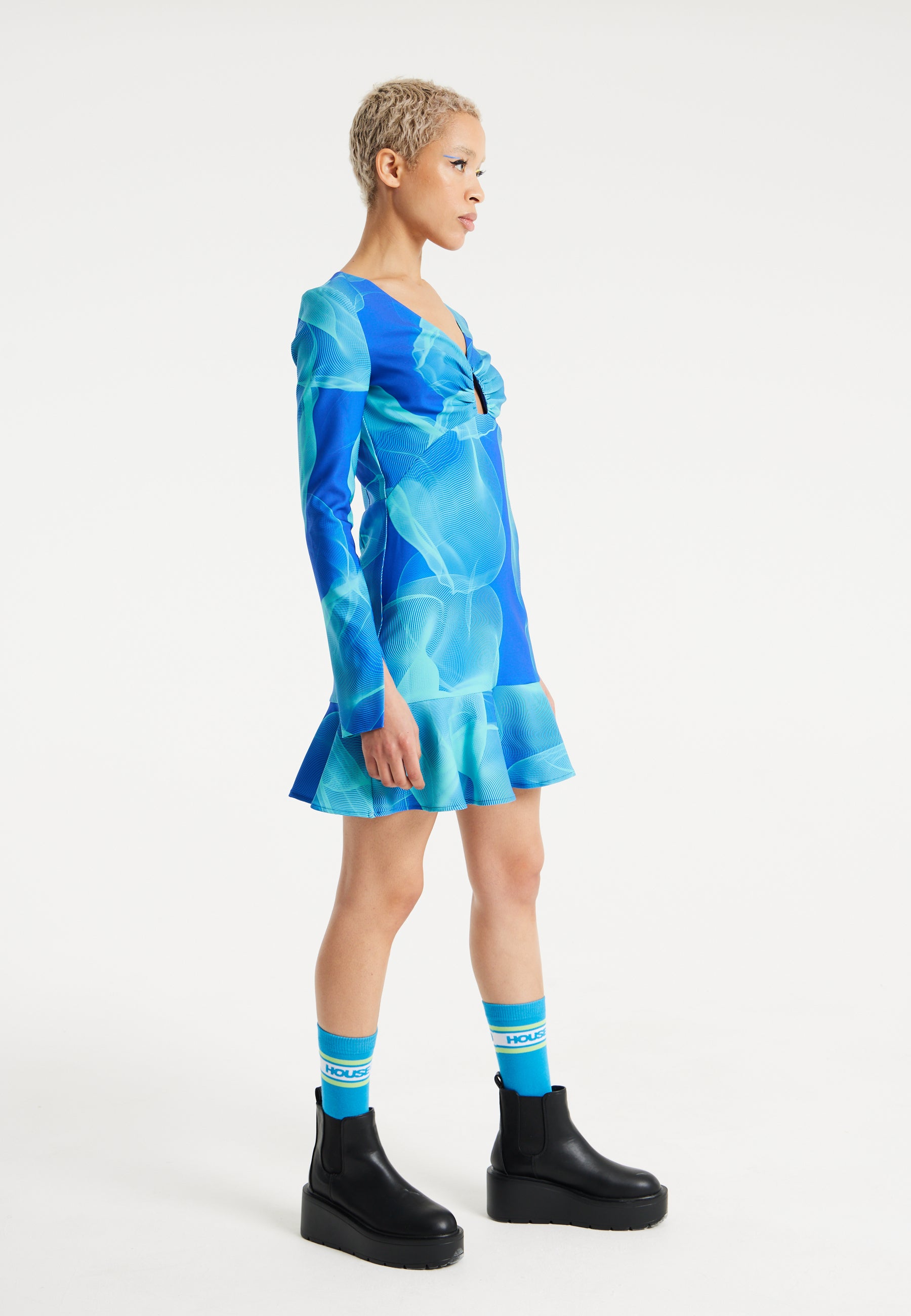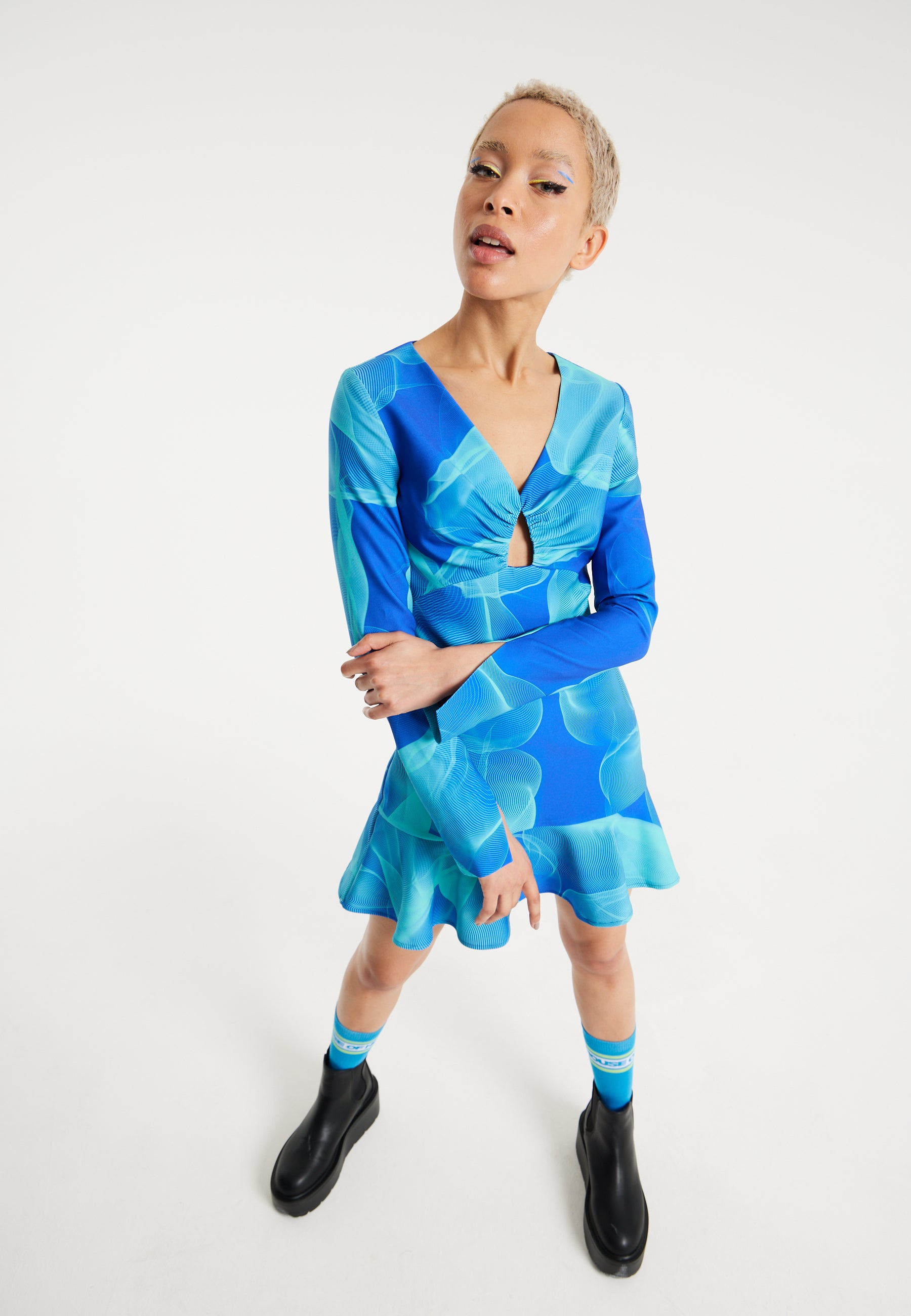 House Of Holland royal blue aqua mesh abstract wire print long sleeve dress featuring a front cut out detail. Suitable for day or night events. Pairs amazingly with boots.