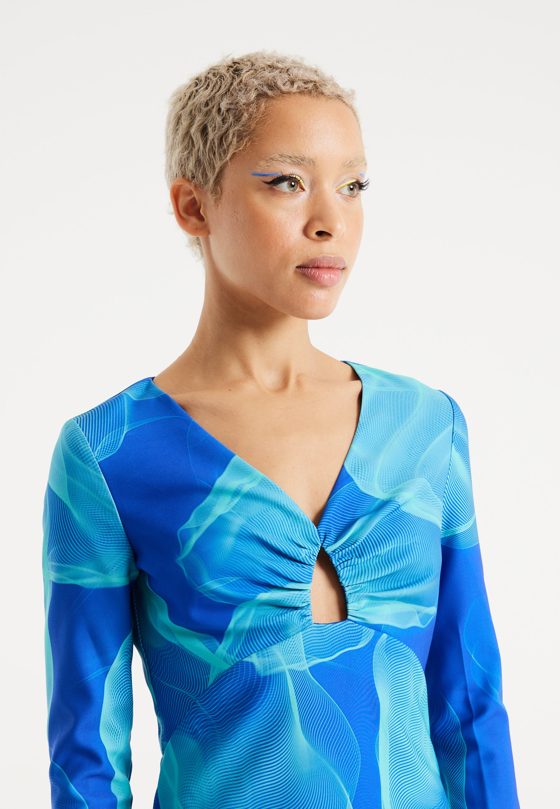 House Of Holland Aqua Mesh Abstract Wire Print Long Sleeve Dress With A Front Cut Out Detail