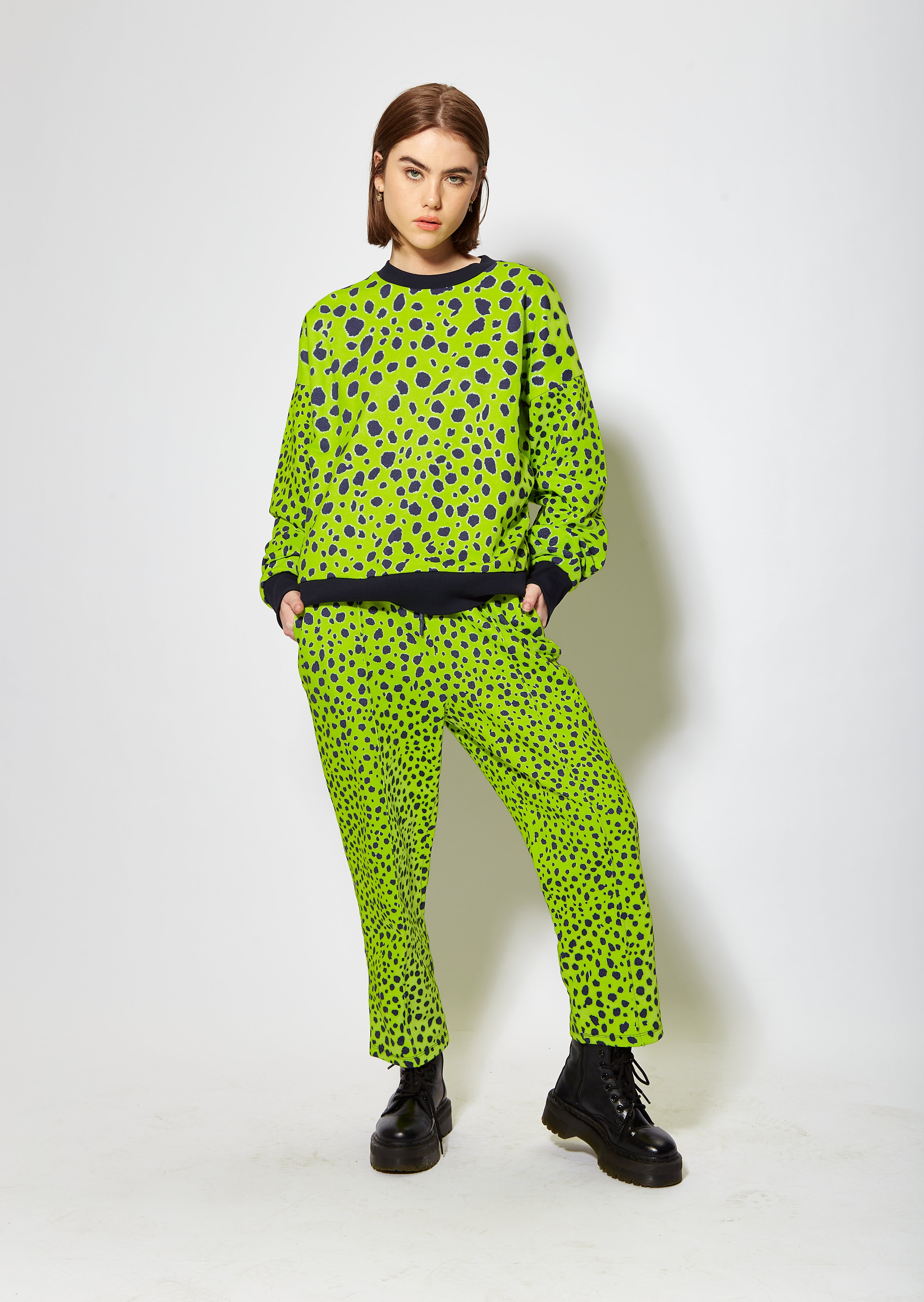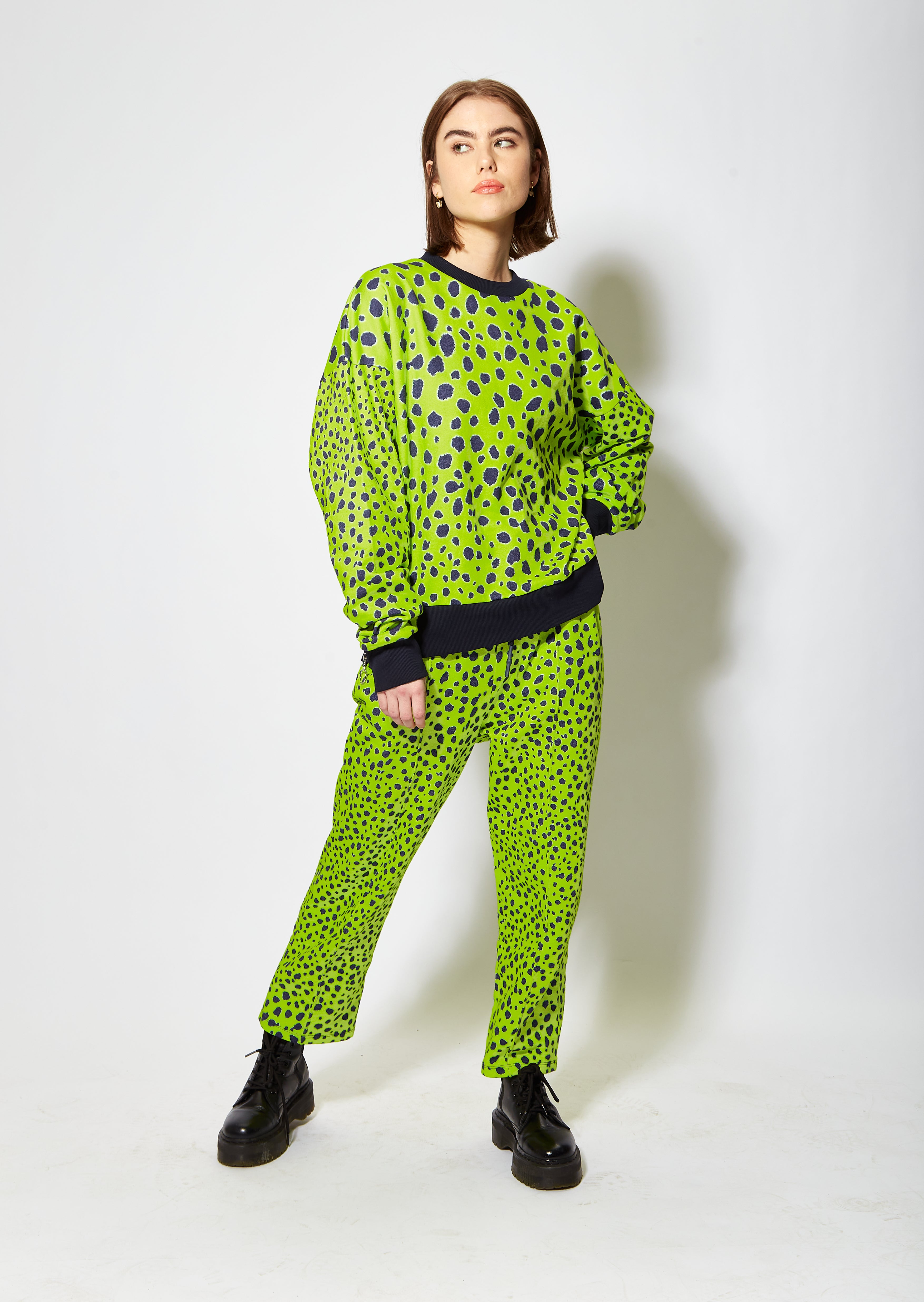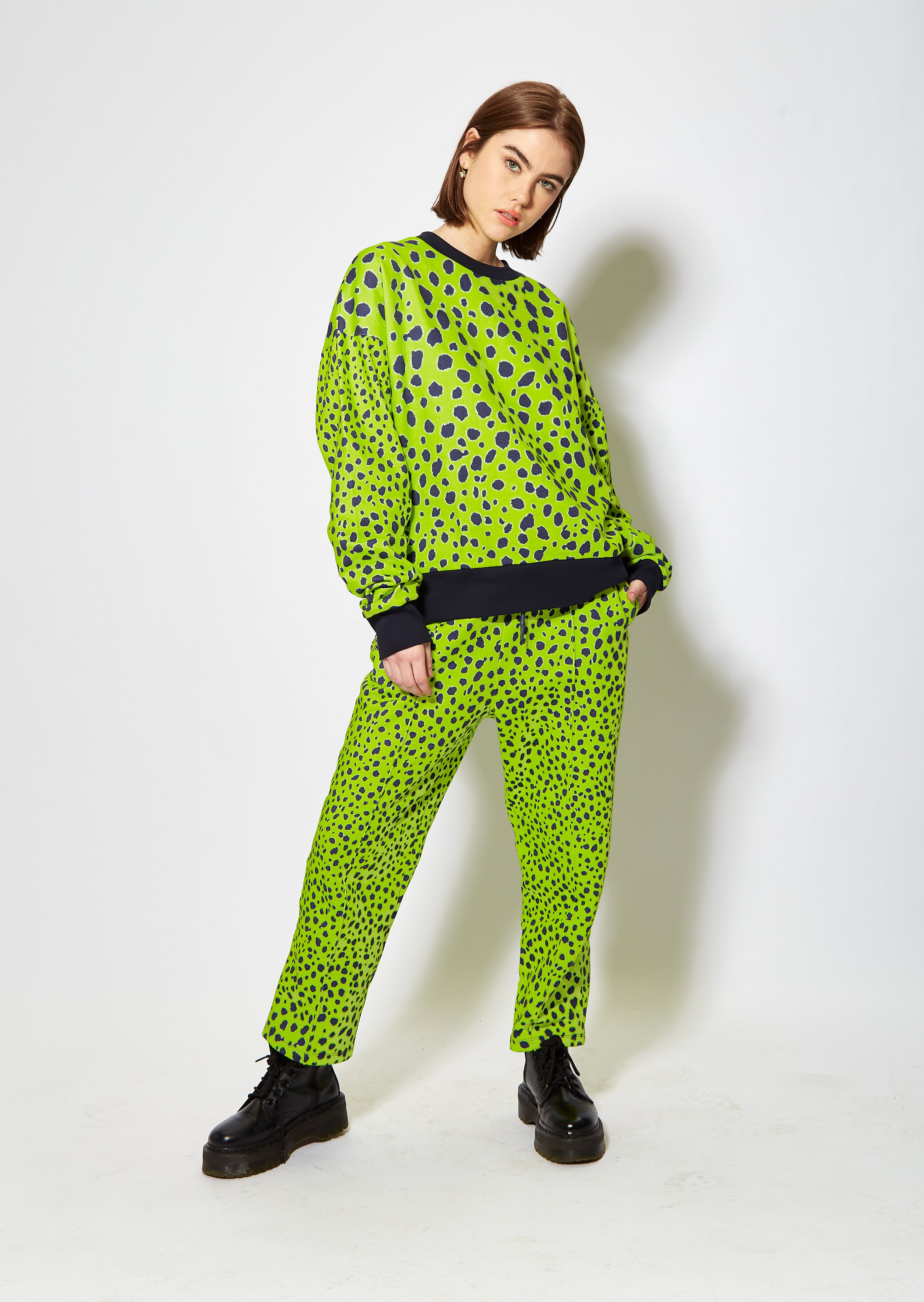 Bright and vivid lime green cheetah print sweatshirt. Loungewear style, relaxed fit with solid colour detail cuff, hem and neck.