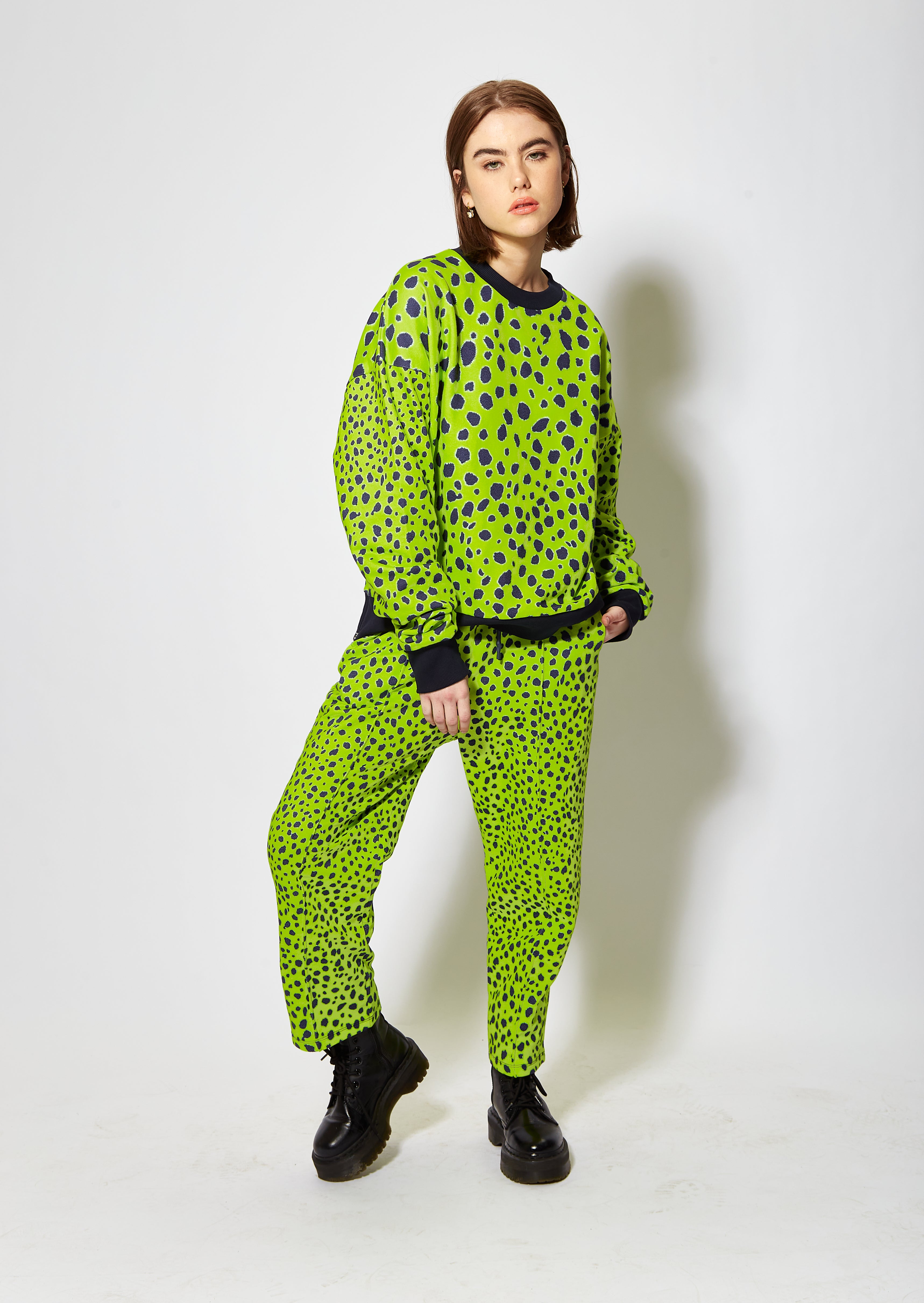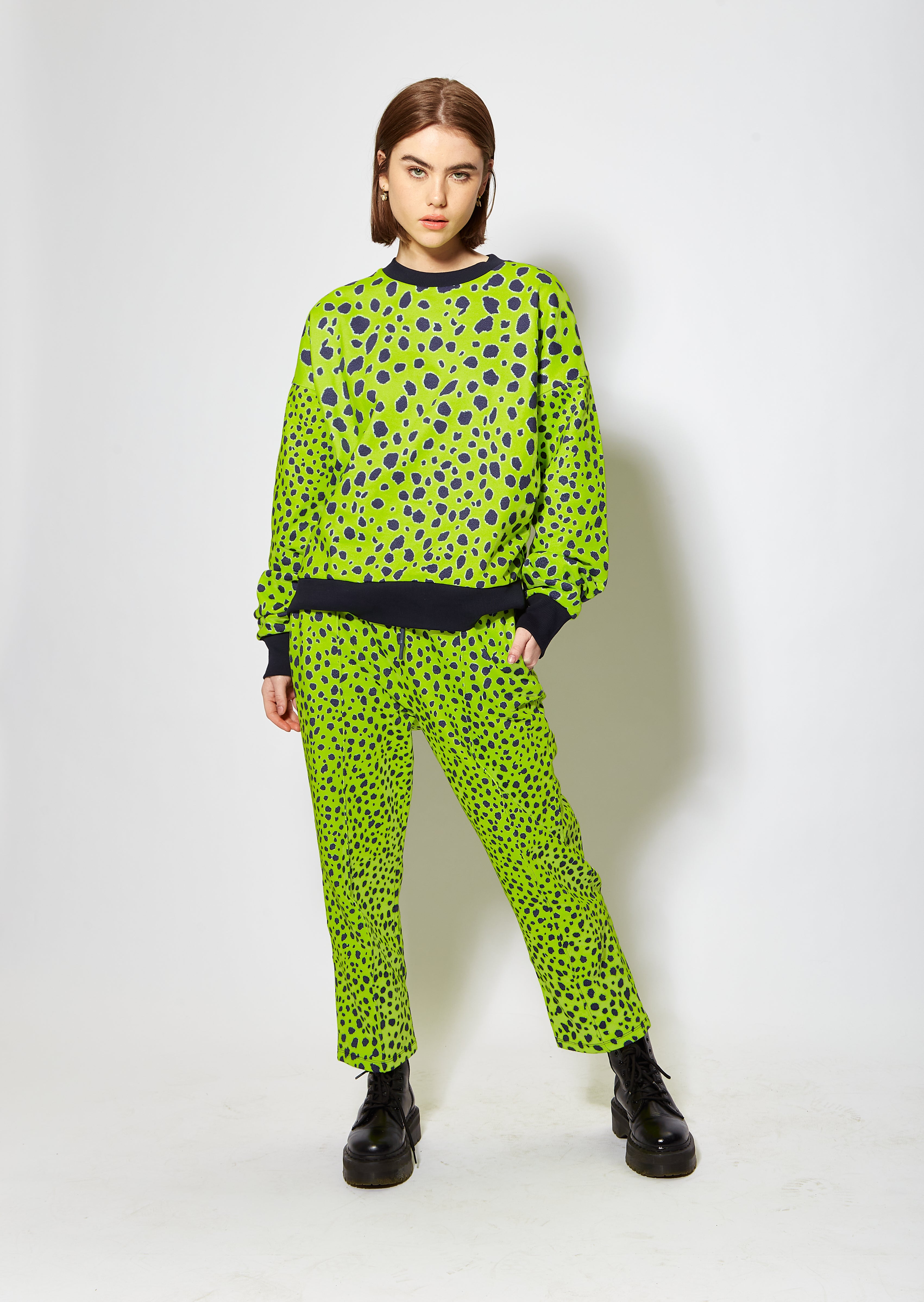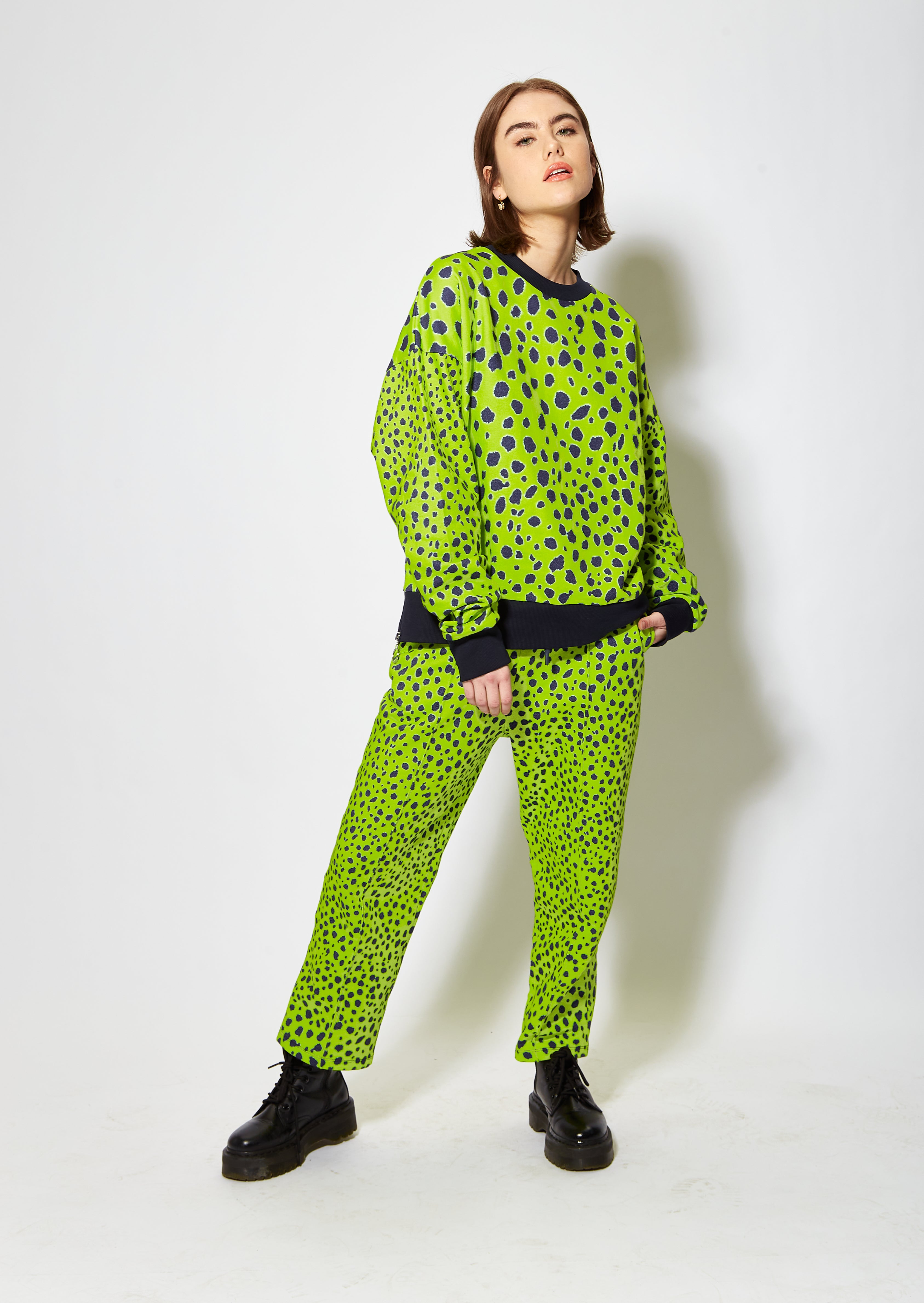 Bright and vivid lime green cheetah print sweatshirt. Loungewear style, relaxed fit with solid colour detail cuff, hem and neck.