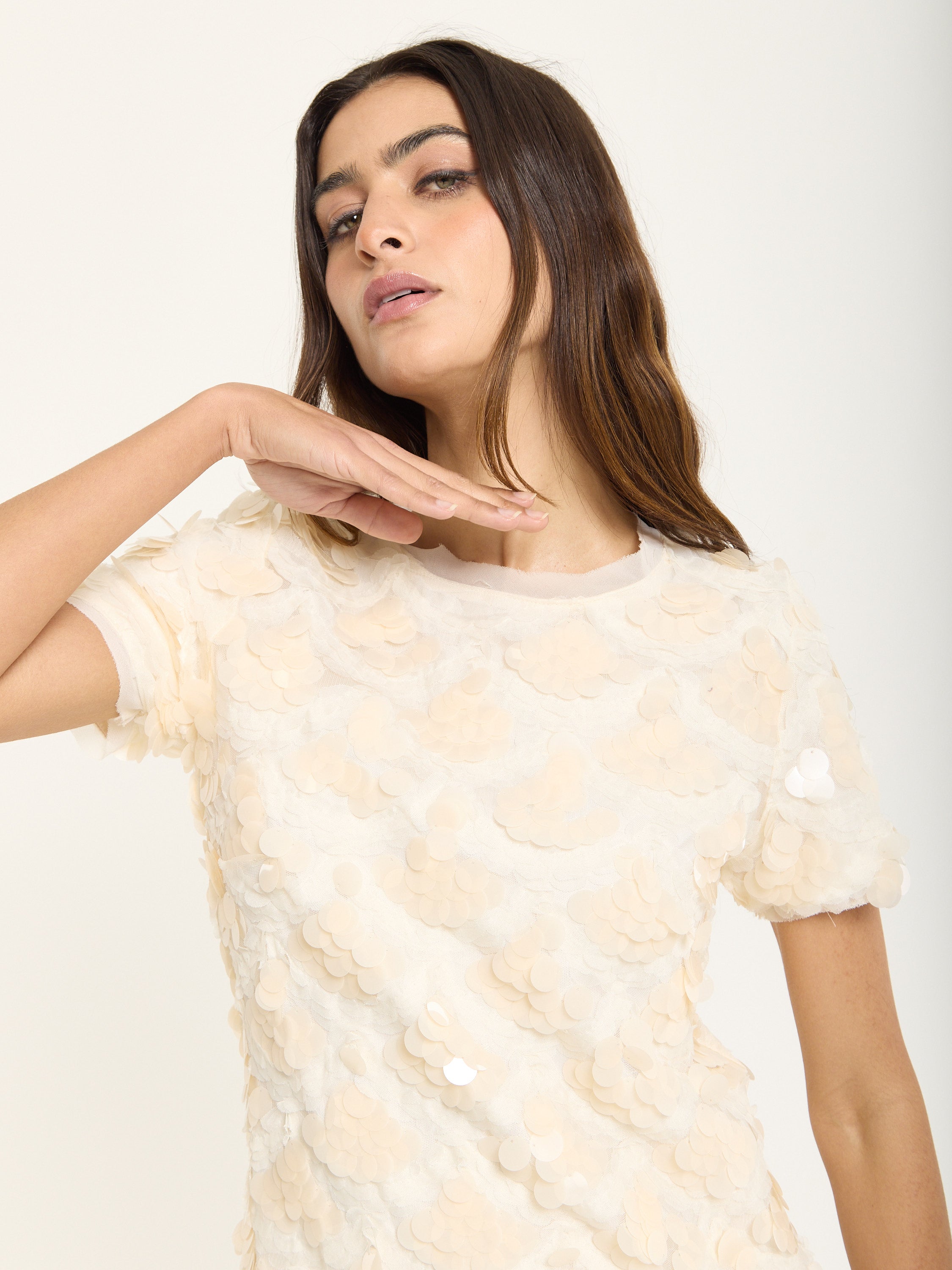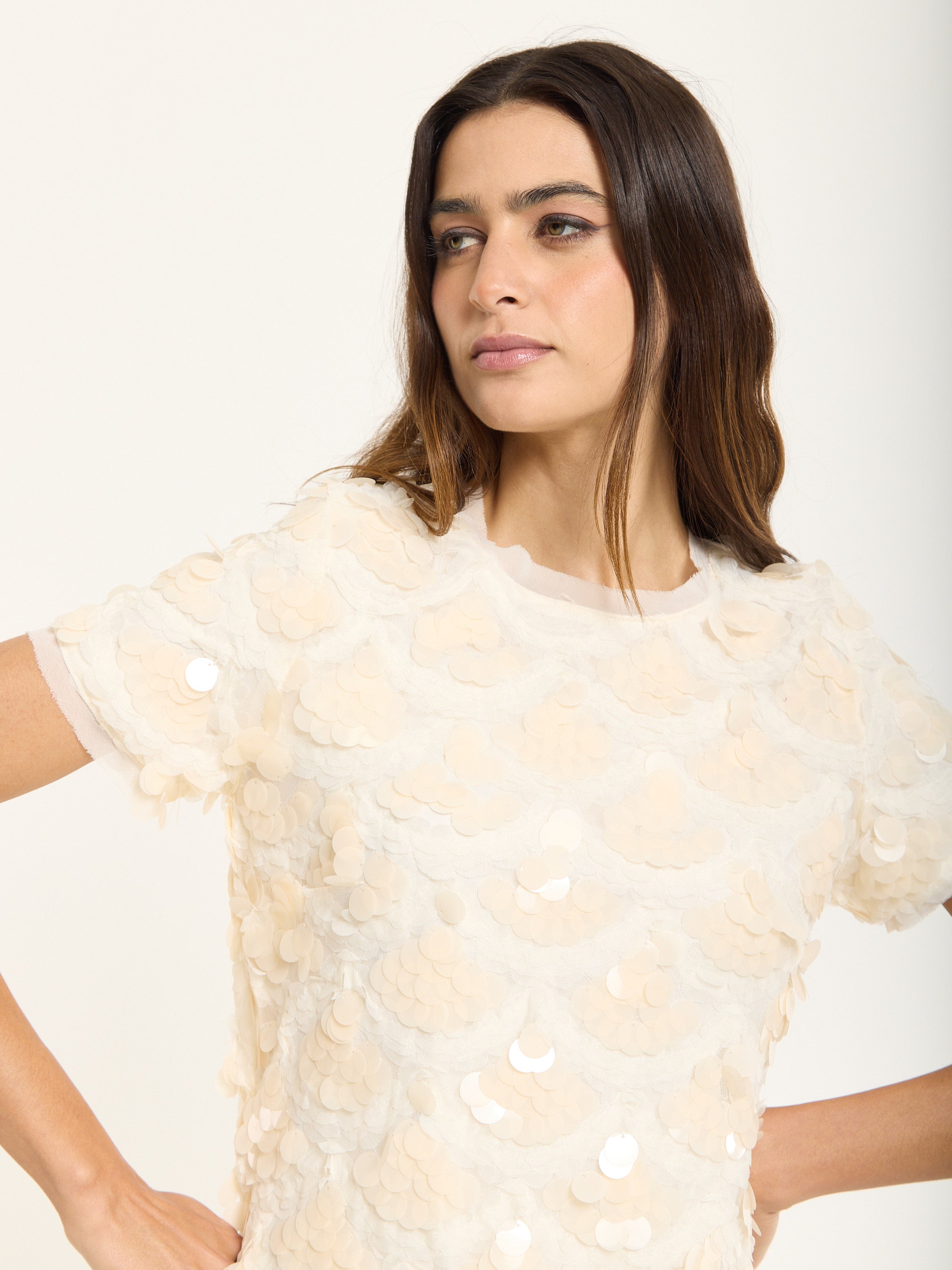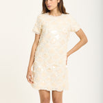 A stunning ivory mini dress adorned with oversized sequin scallops that catch the light beautifully. The soft, rounded texture and straight silhouette create a playful yet elegant look. Featuring short sleeves and a crew neckline, it’s the perfect statement piece for evening occasions or festive celebrations.