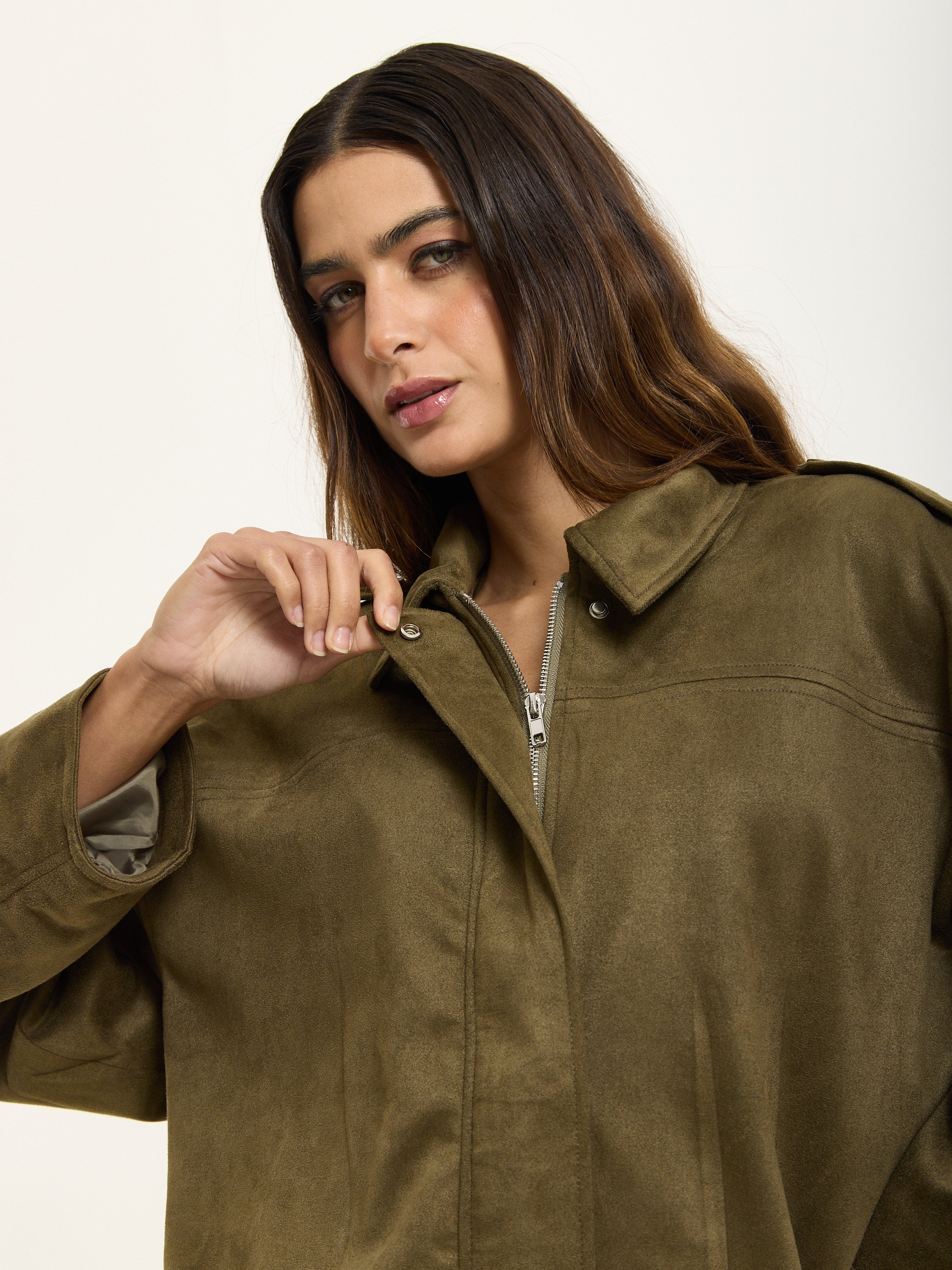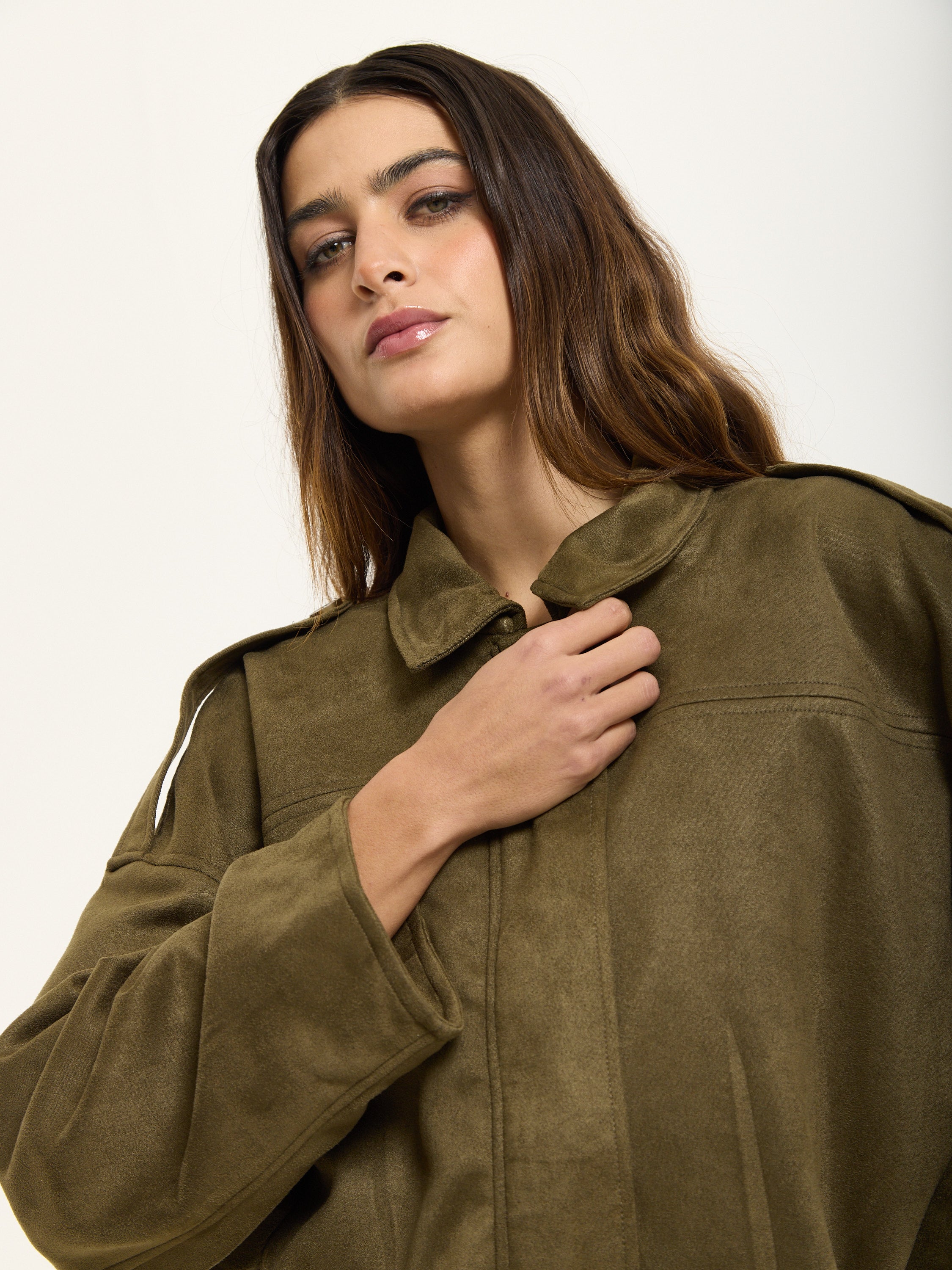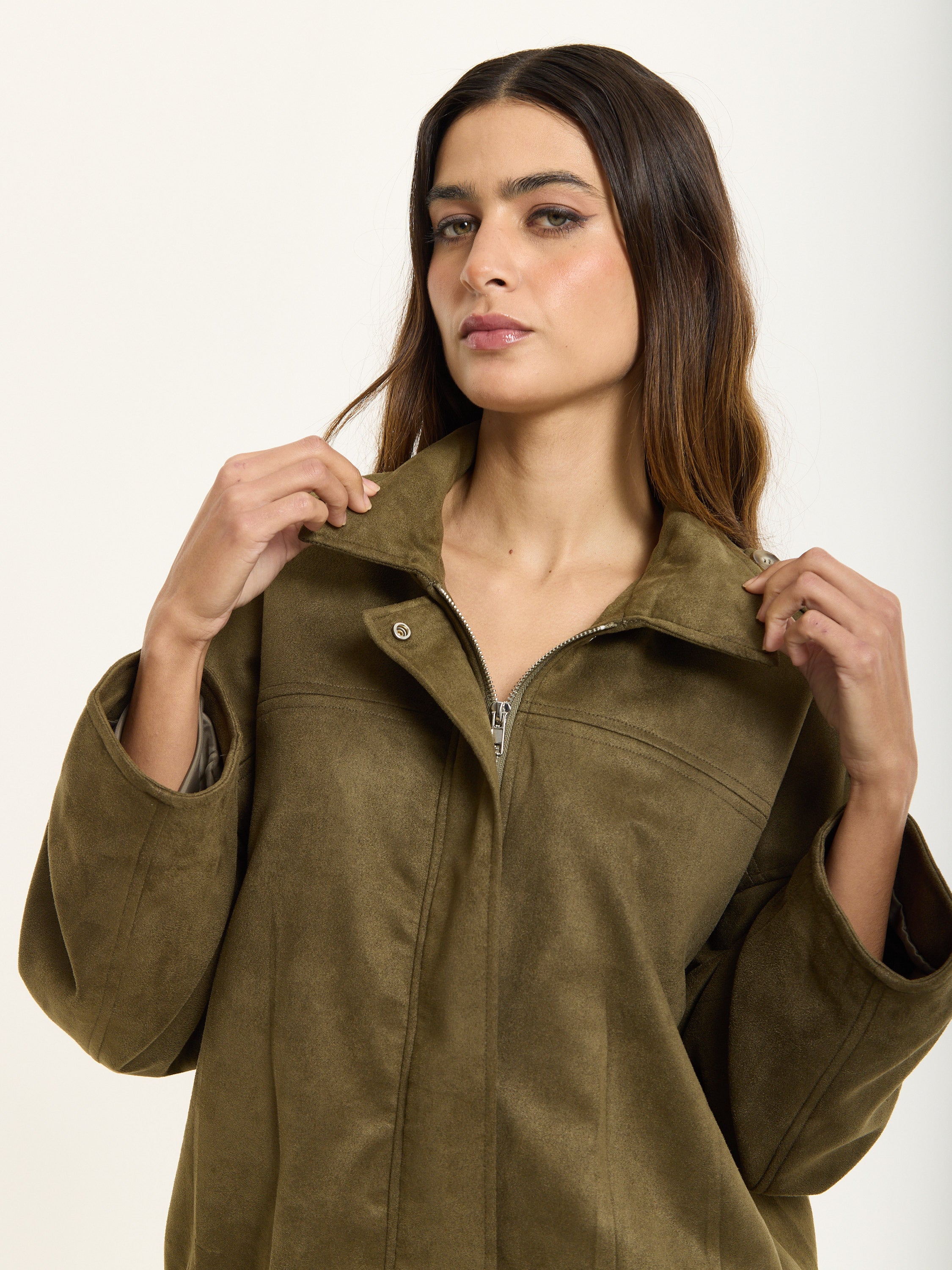 Reimagine utility style with this statement Khaki Oversized Utility Jacket from House of Holland. Designed in a soft faux suede fabric, it combines relaxed tailoring with a clean, structured finish. The dropped shoulders, wide sleeves and boxy silhouette give it a contemporary edge, while the collared neckline and concealed front closure keep things sleek.