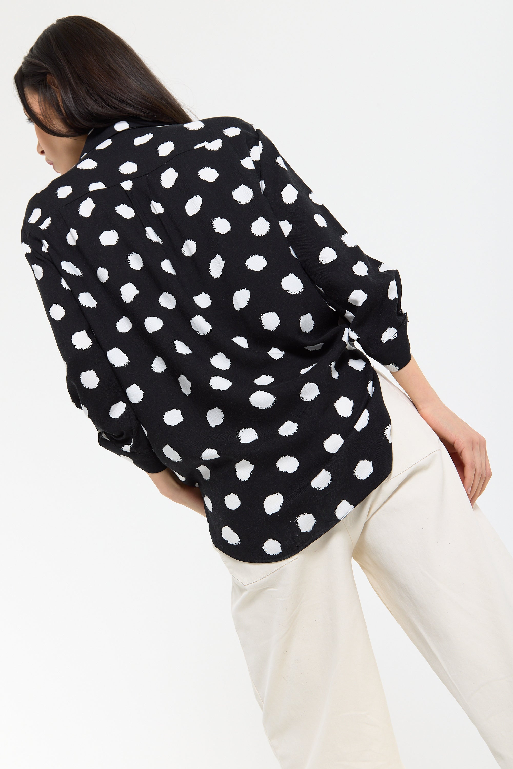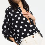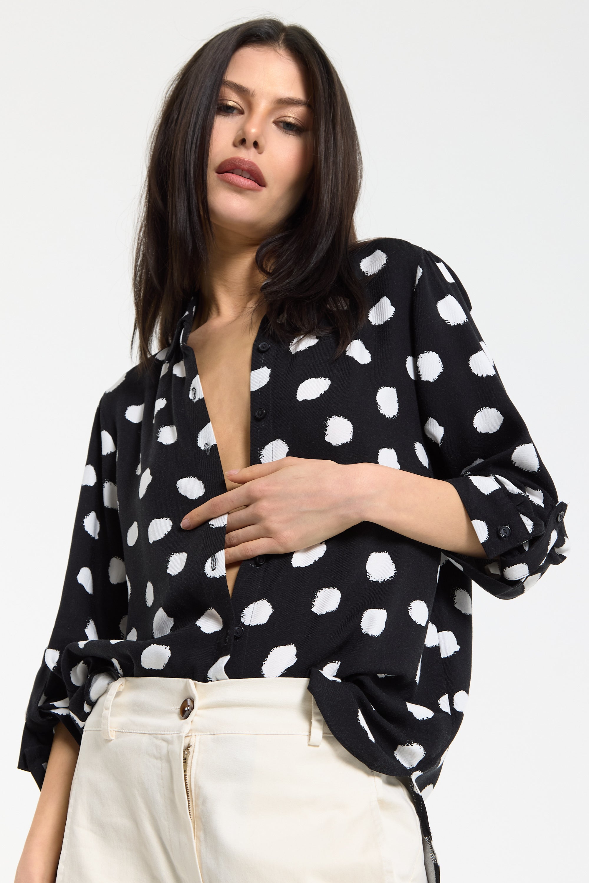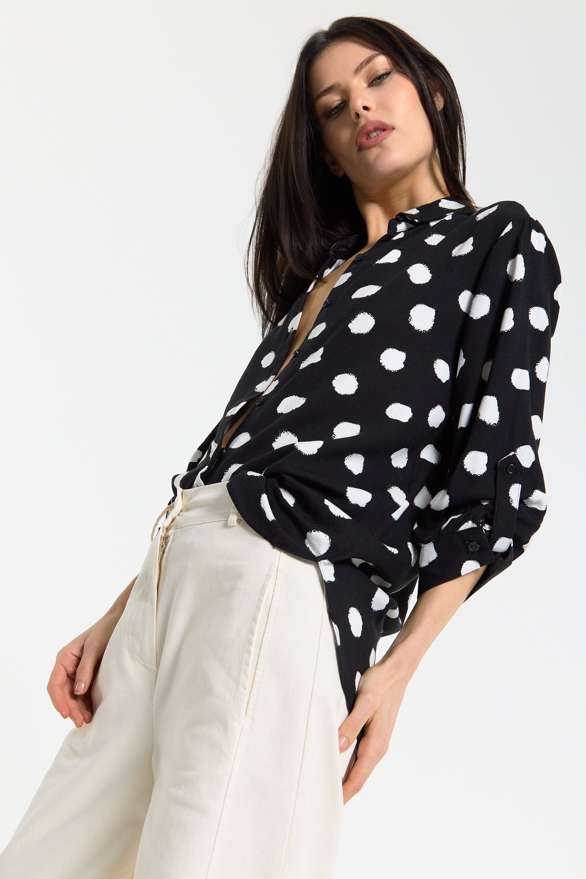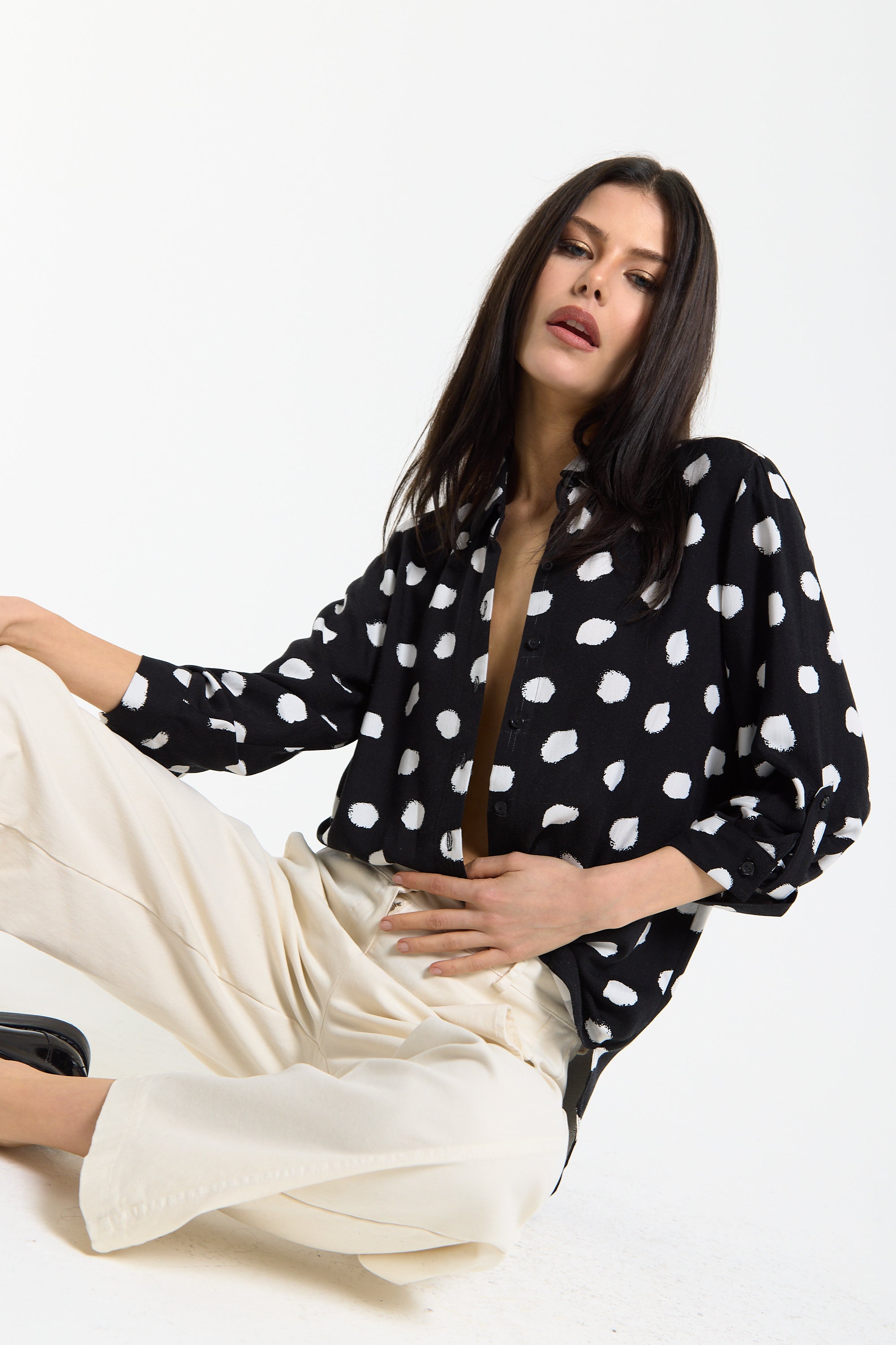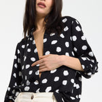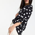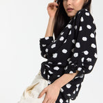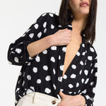 This monochrome spot print shirt is designed with a relaxed, fluid silhouette that drapes effortlessly on the body, featuring a classic button-down front, soft collar, and roll-tab sleeves for adjustable styling, while the bold irregular spot pattern adds a modern, statement edge to a timeless shape; easy to dress up or down, it can be tucked into tailored trousers for a sharp office-ready look or worn loose with denim or wide-leg pants for a more relaxed, contemporary feel, making it a versatile piece perfect for work, casual outings, evening drinks, travel, and everyday styling across seasons.