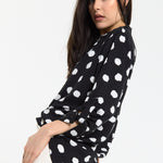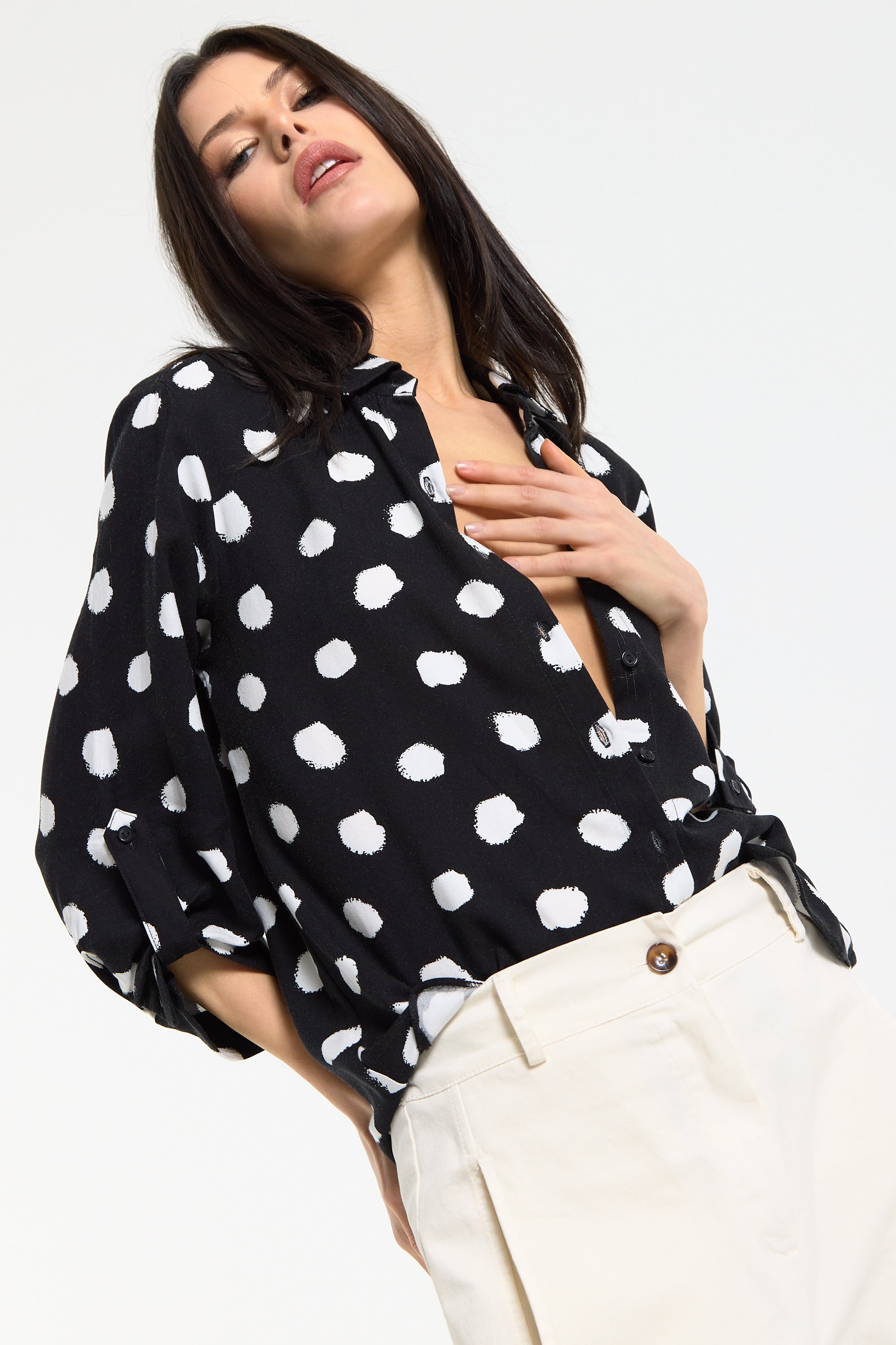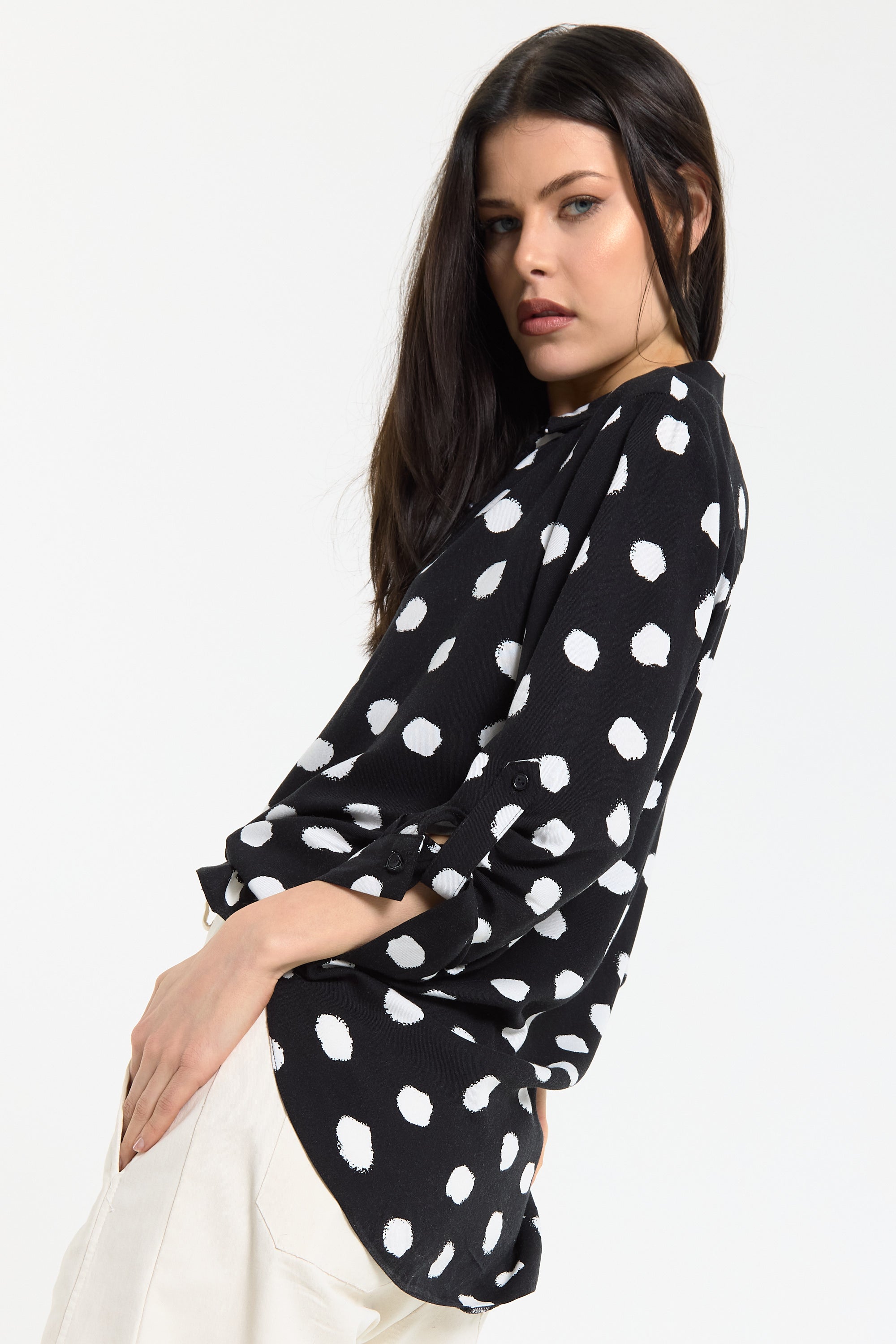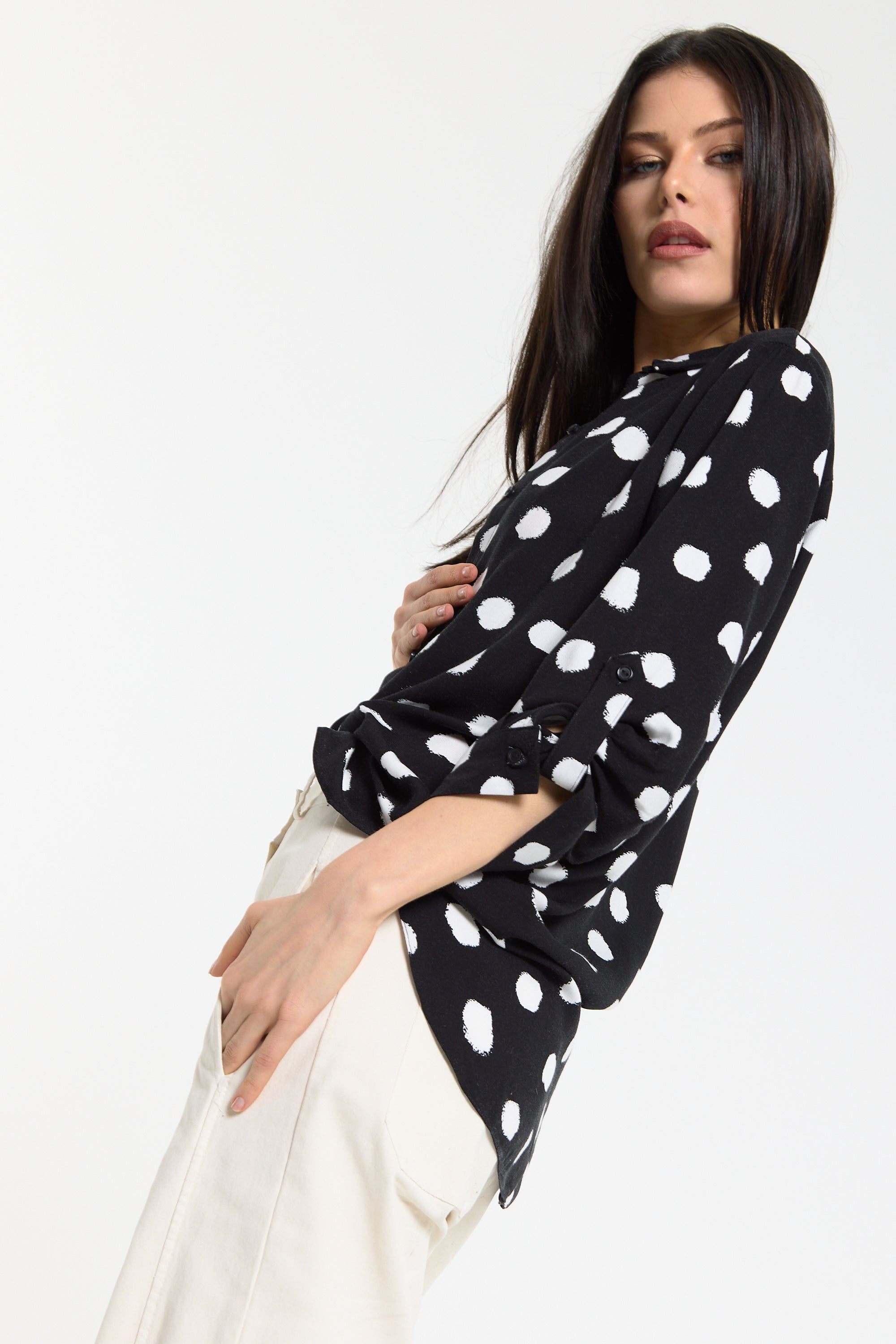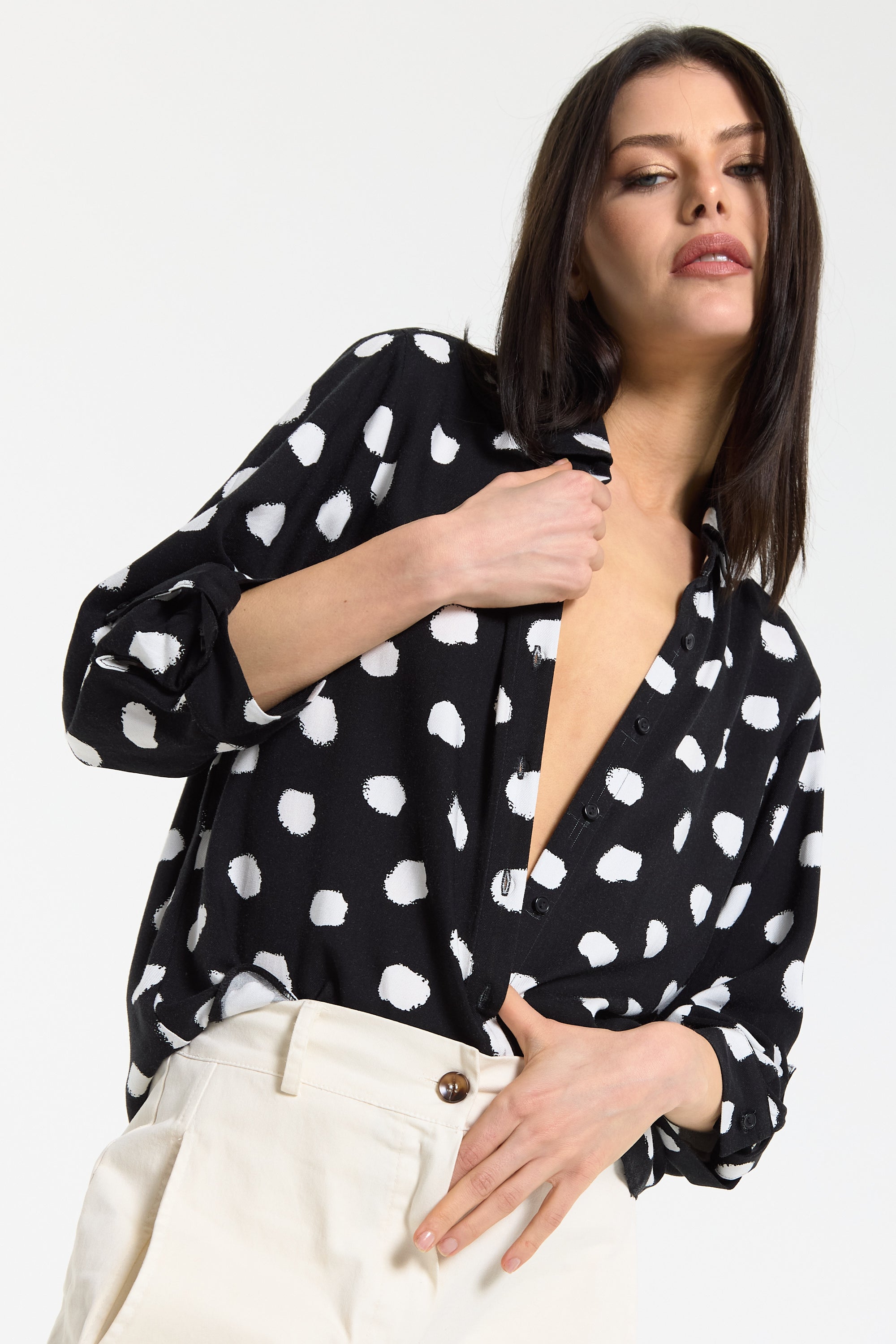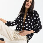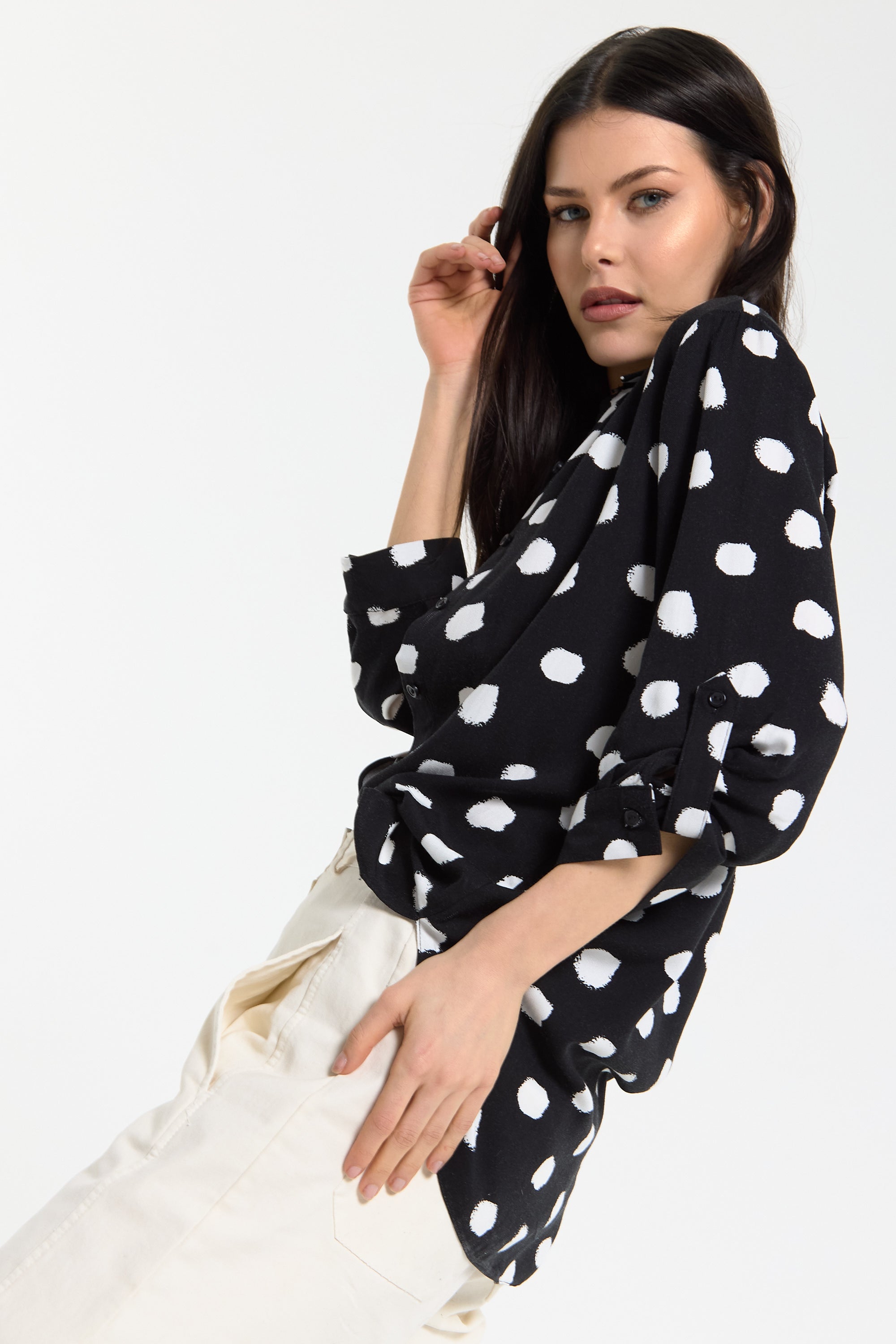 This monochrome spot print shirt is designed with a relaxed, fluid silhouette that drapes effortlessly on the body, featuring a classic button-down front, soft collar, and roll-tab sleeves for adjustable styling, while the bold irregular spot pattern adds a modern, statement edge to a timeless shape; easy to dress up or down, it can be tucked into tailored trousers for a sharp office-ready look or worn loose with denim or wide-leg pants for a more relaxed, contemporary feel, making it a versatile piece perfect for work, casual outings, evening drinks, travel, and everyday styling across seasons.