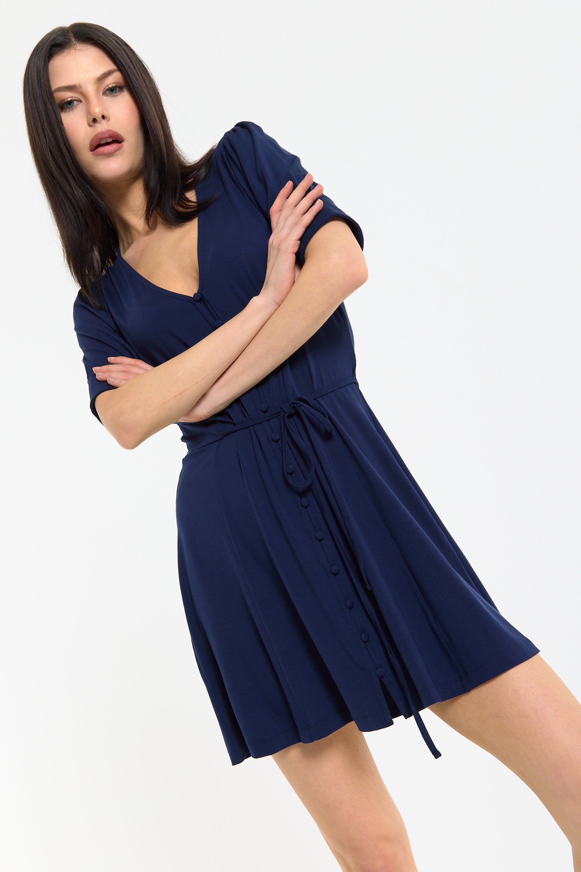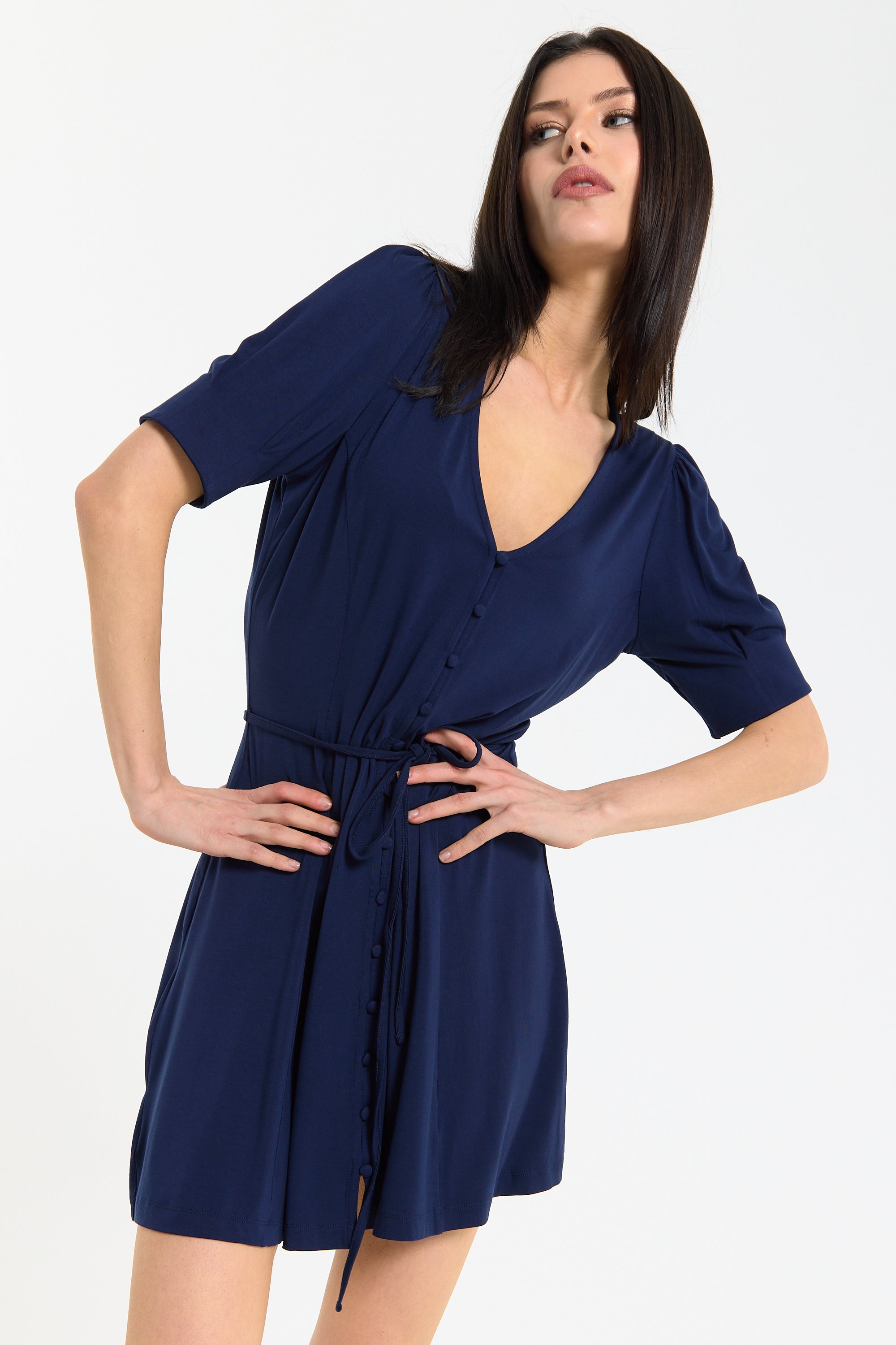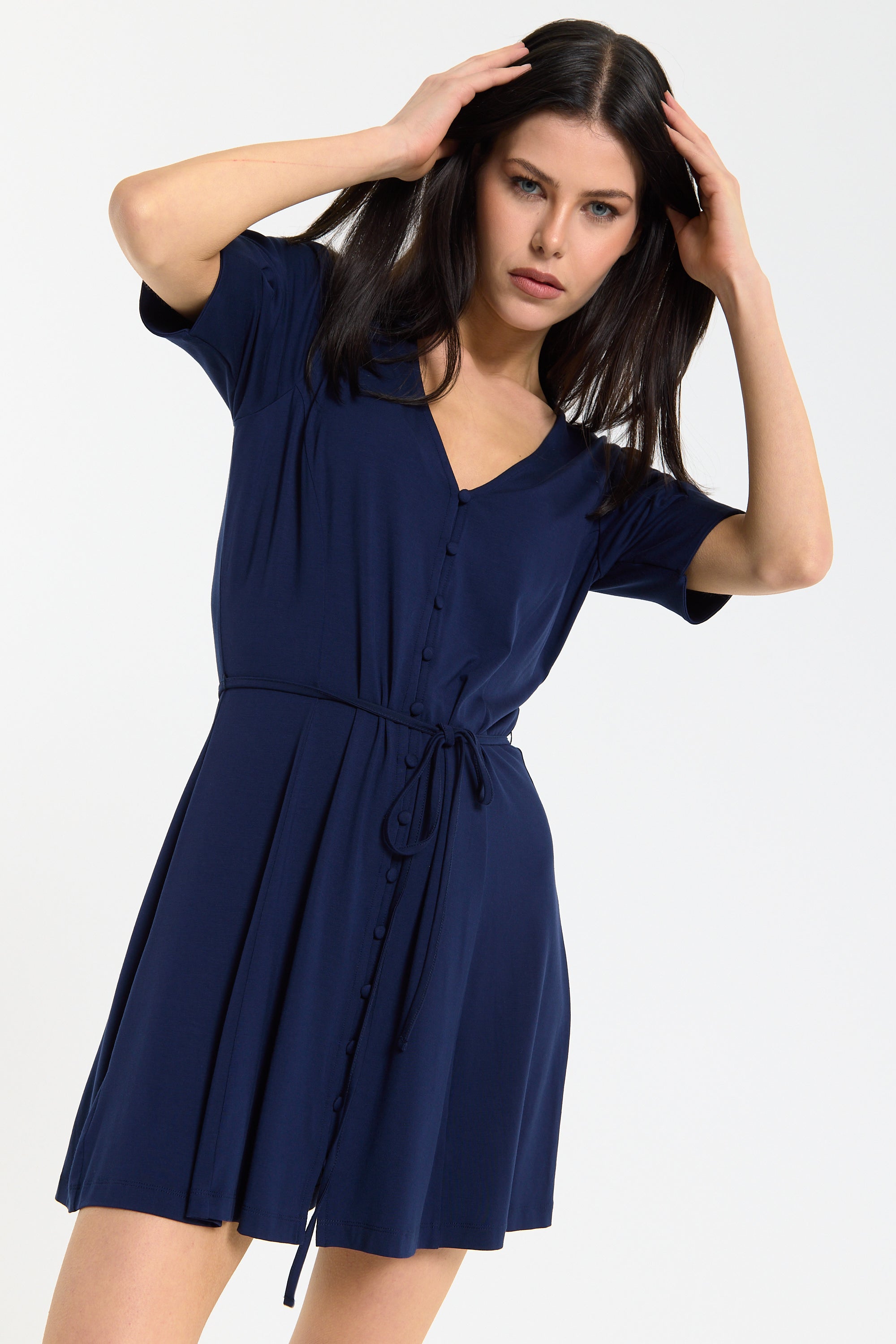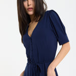 This navy mini dress features a flattering V-neckline with a button front detail and a soft tie waist that cinches the silhouette for an effortlessly feminine shape, complemented by short sleeves and a gently flared skirt for added movement and comfort. Designed to be both versatile and easy to wear, it can be styled casually with trainers or dressed up with heels for evenings, making it perfect for daytime outings, holidays, or relaxed occasions. The lightweight fabric ensures all-day comfort.