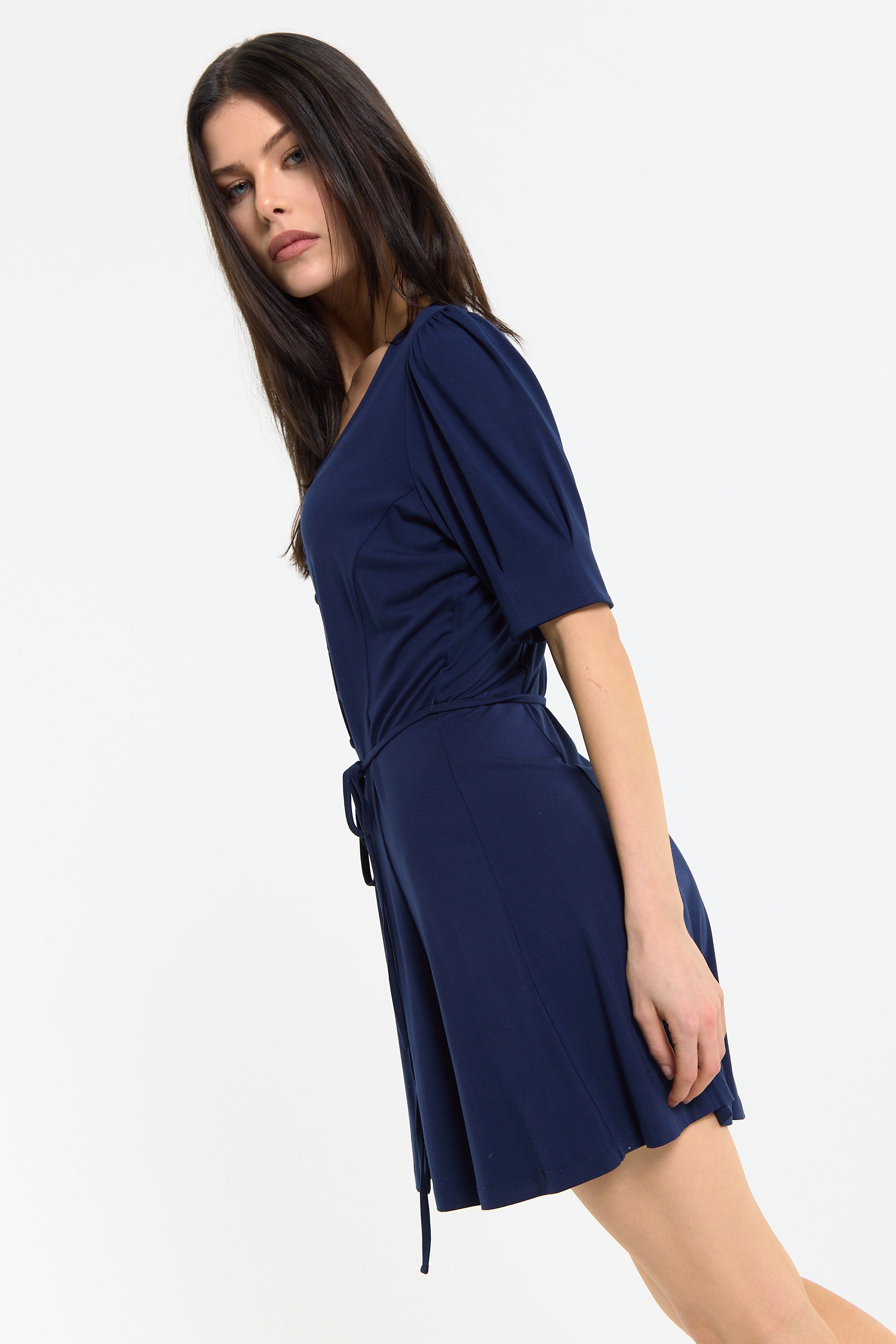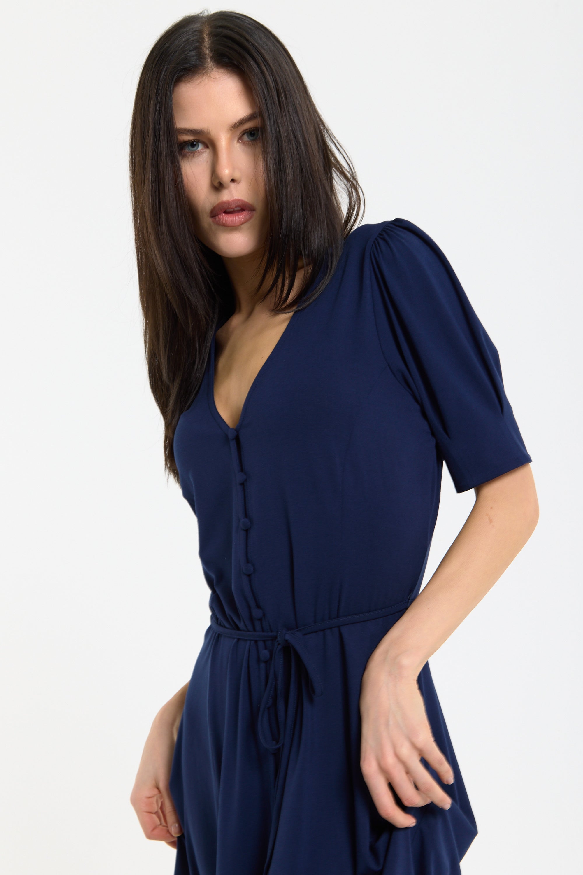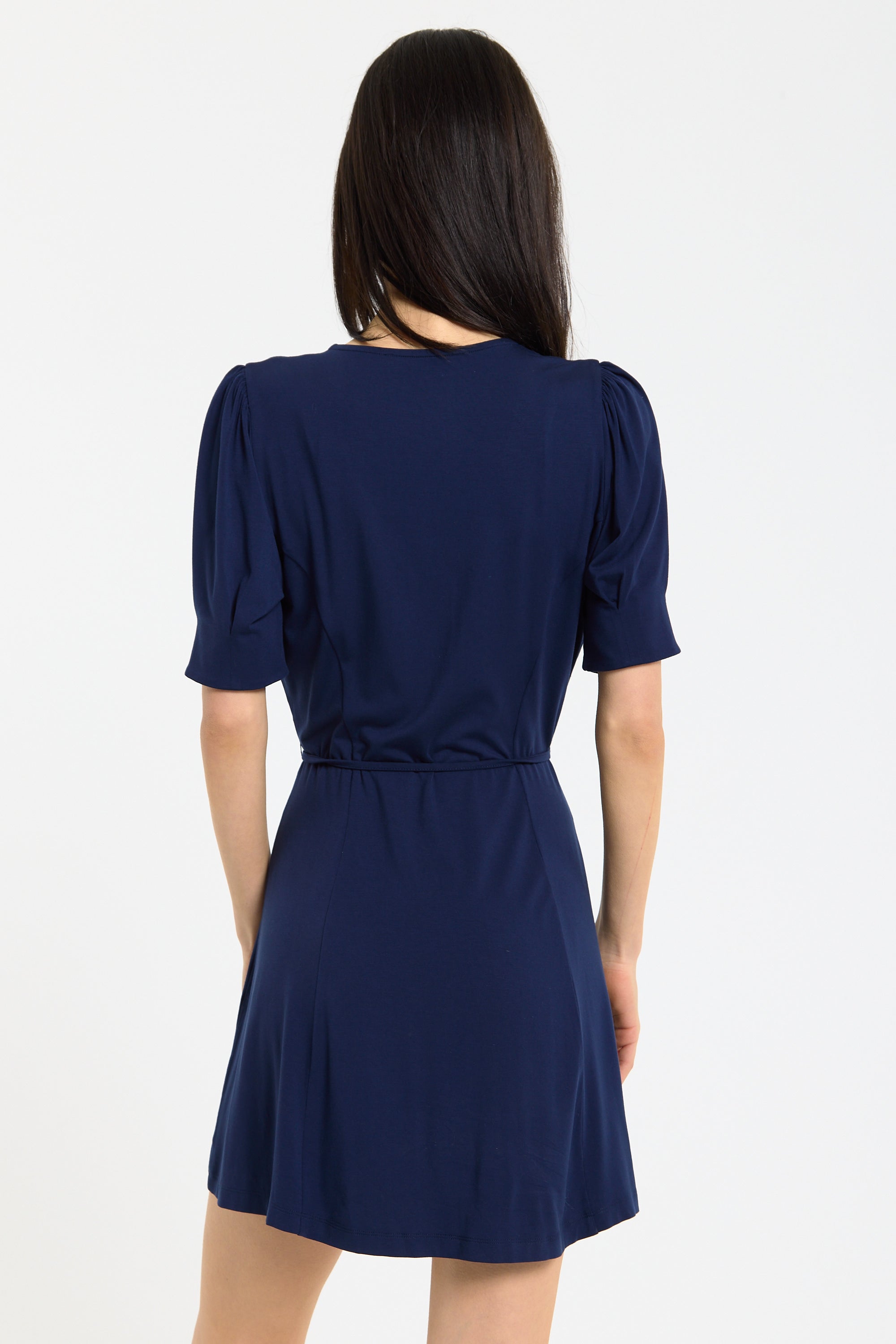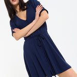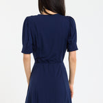 This navy mini dress features a flattering V-neckline with a button front detail and a soft tie waist that cinches the silhouette for an effortlessly feminine shape, complemented by short sleeves and a gently flared skirt for added movement and comfort. Designed to be both versatile and easy to wear, it can be styled casually with trainers or dressed up with heels for evenings, making it perfect for daytime outings, holidays, or relaxed occasions. The lightweight fabric ensures all-day comfort.