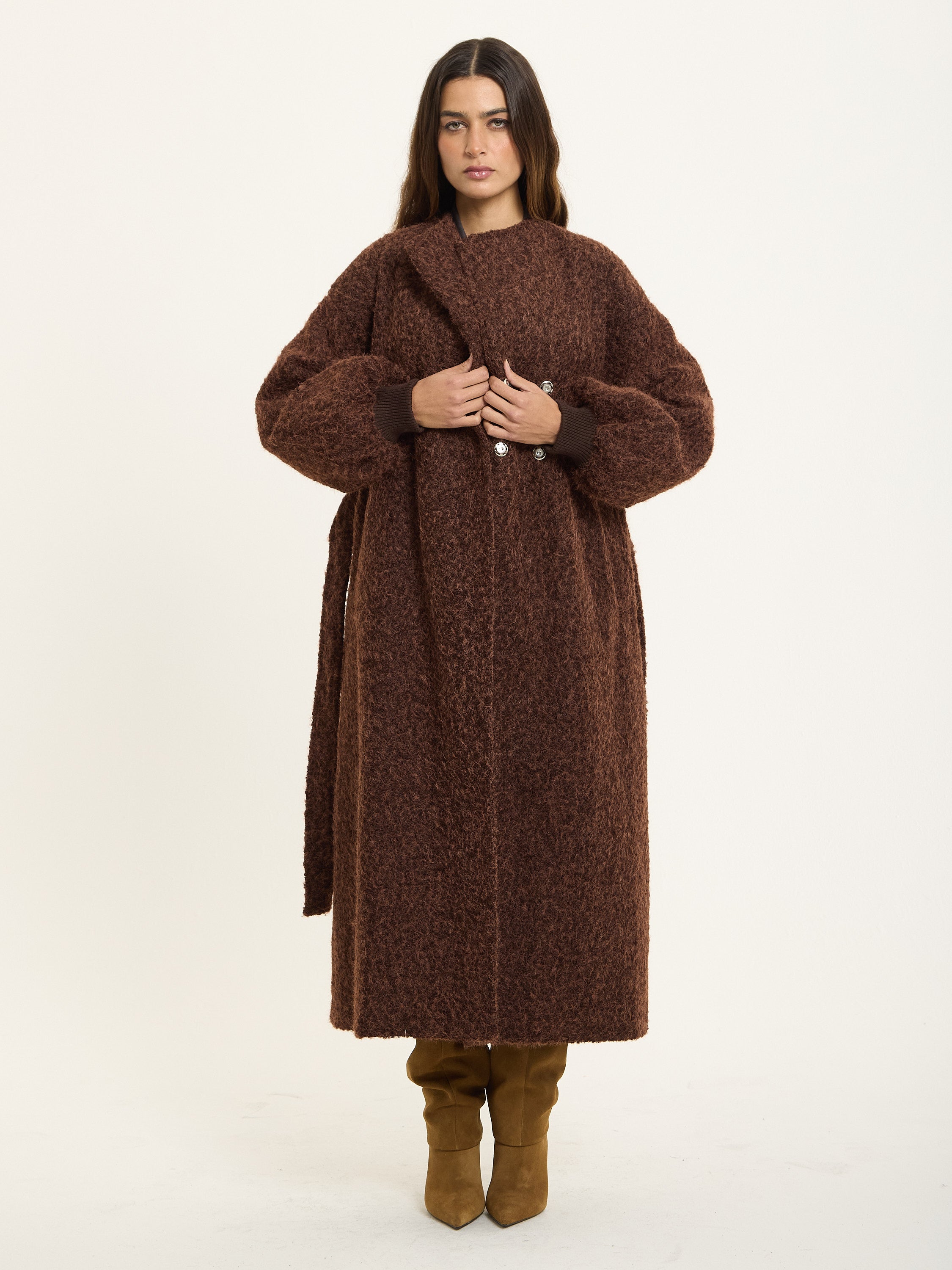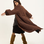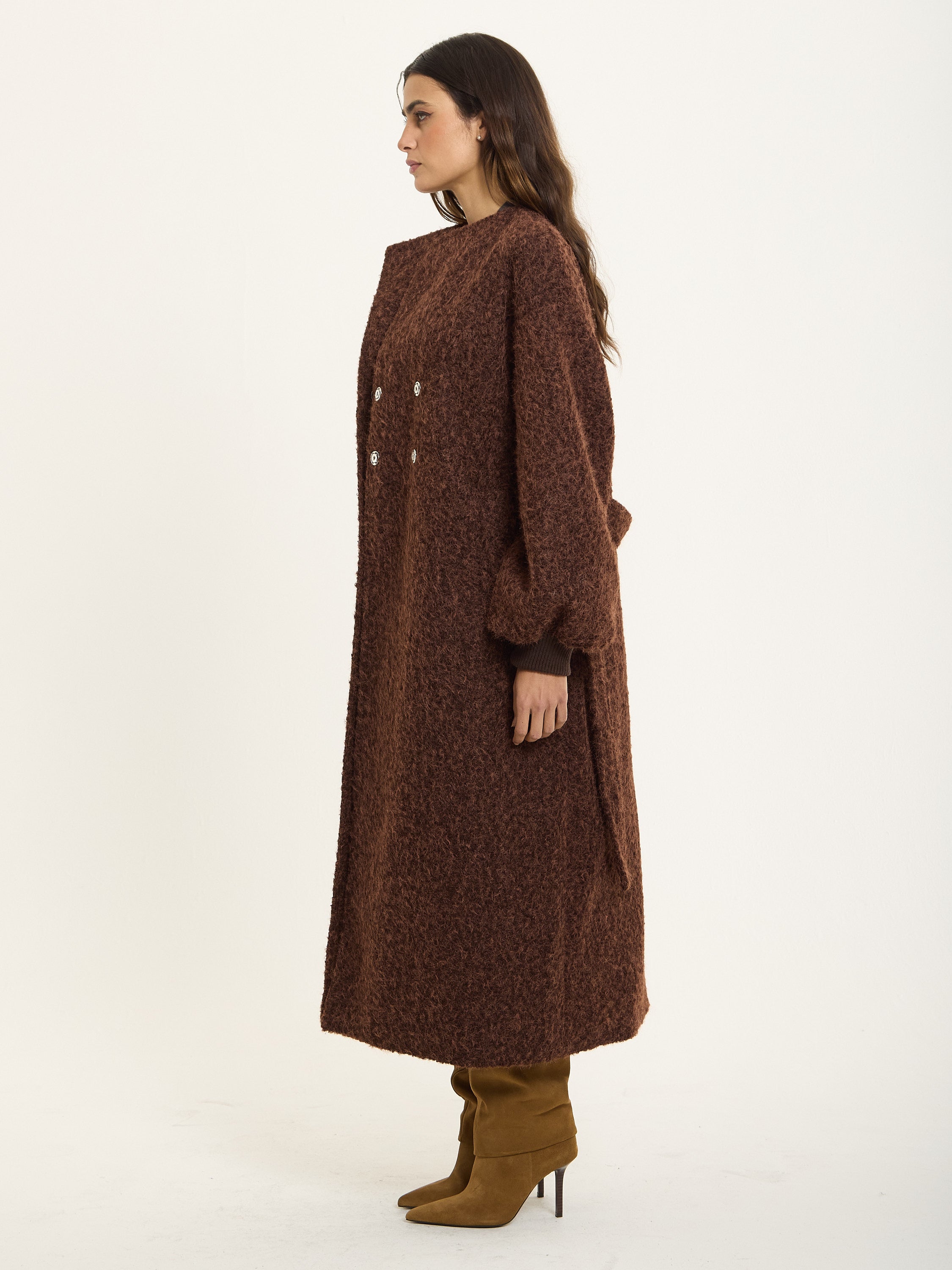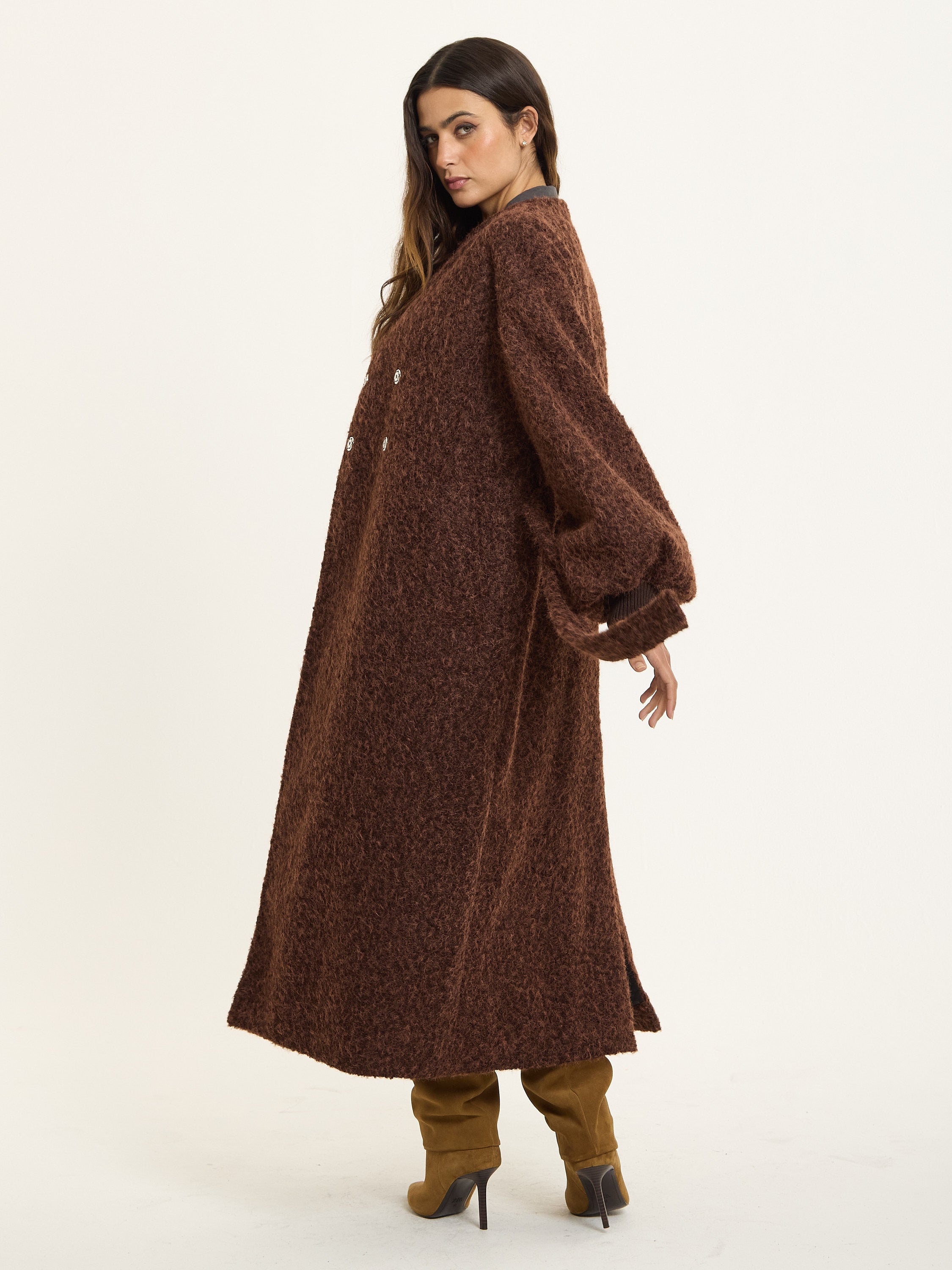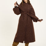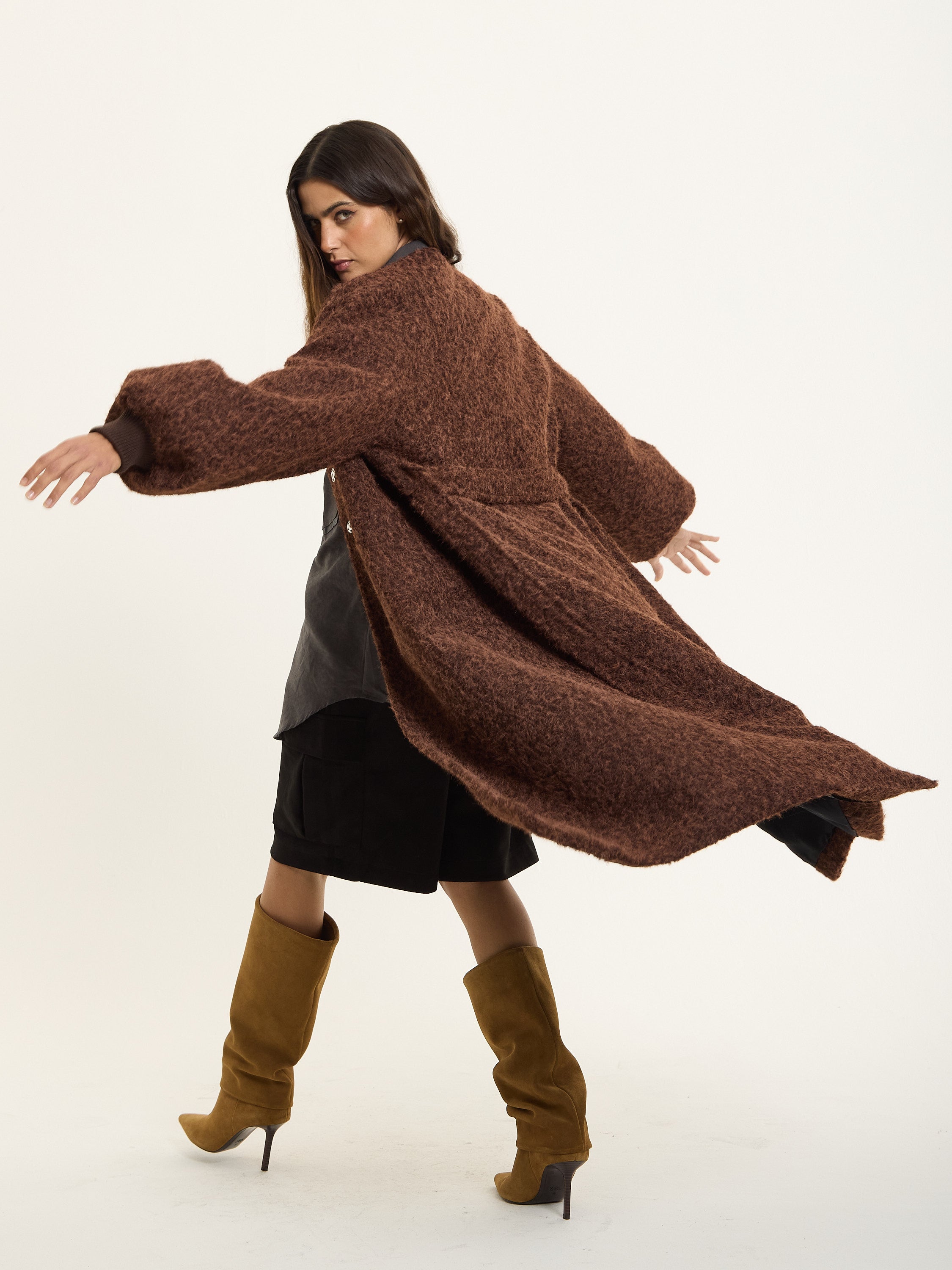 This longline statement coat is made from a soft textured polyester fabric in rich brown. Designed with an oversized silhouette, double-breasted front, balloon sleeves, and ribbed cuffs. The detachable belt allows you to wear it loose or cinched for a defined shape. A cozy and stylish choice for layering through the colder months.