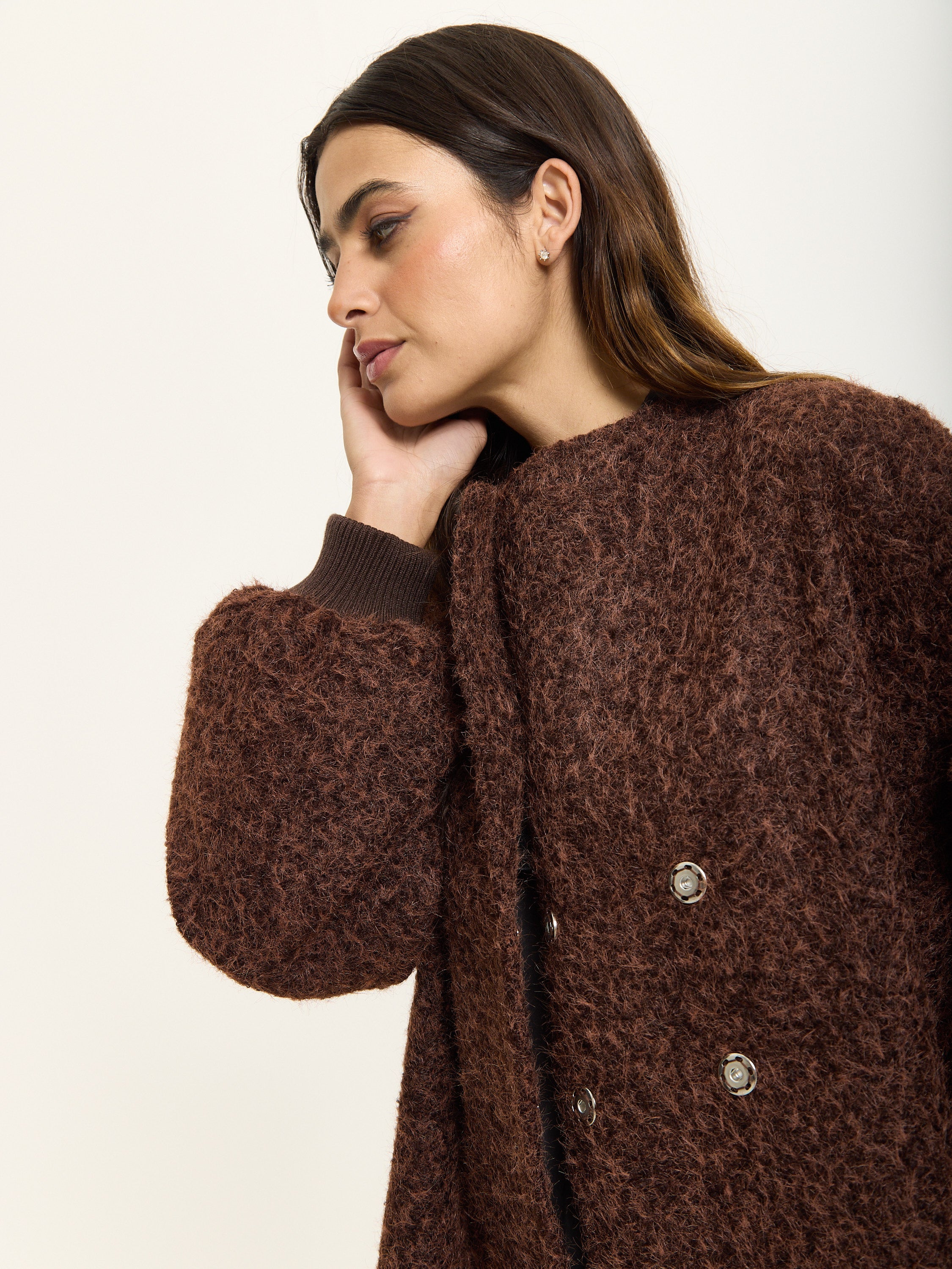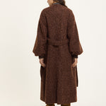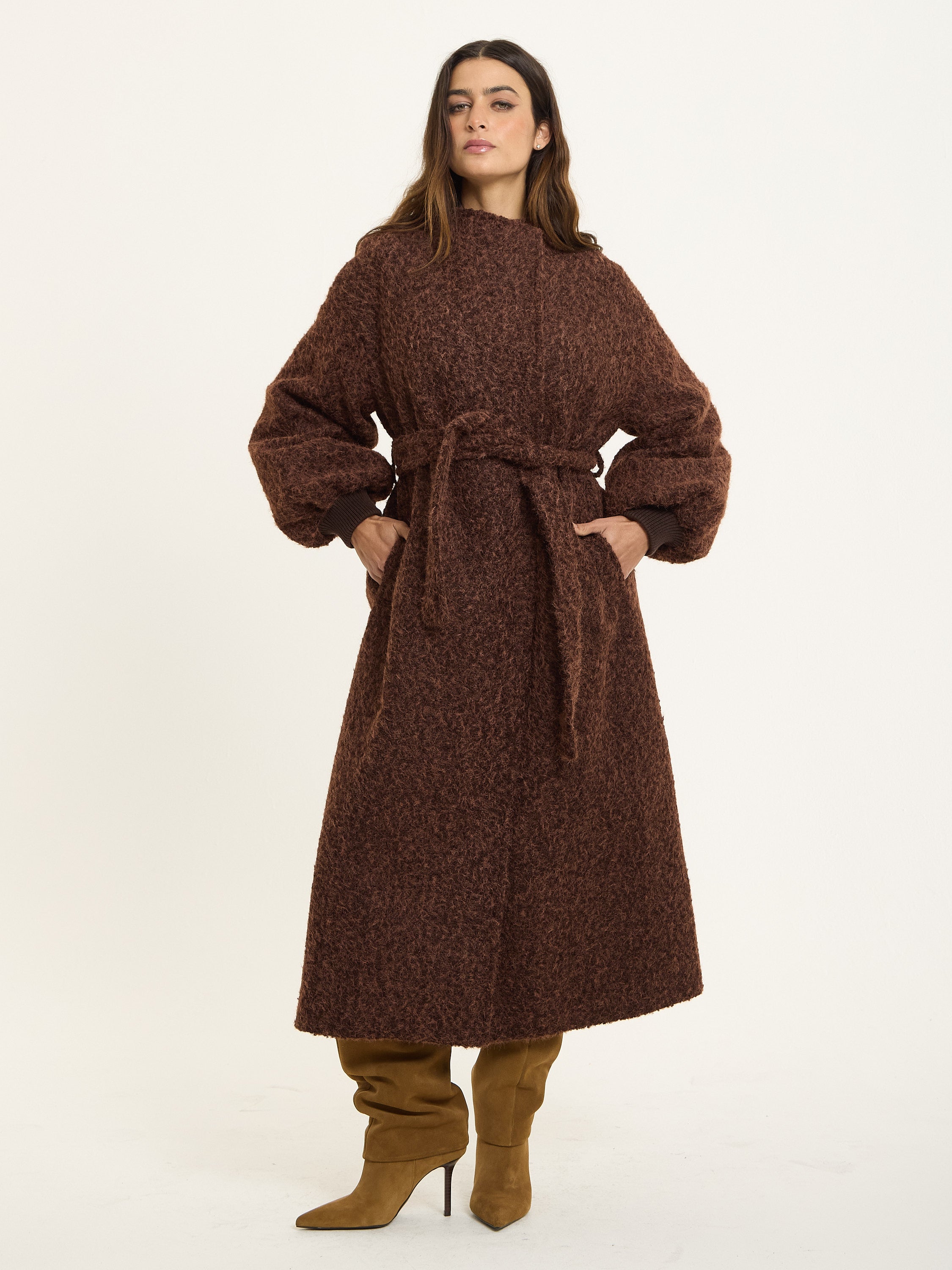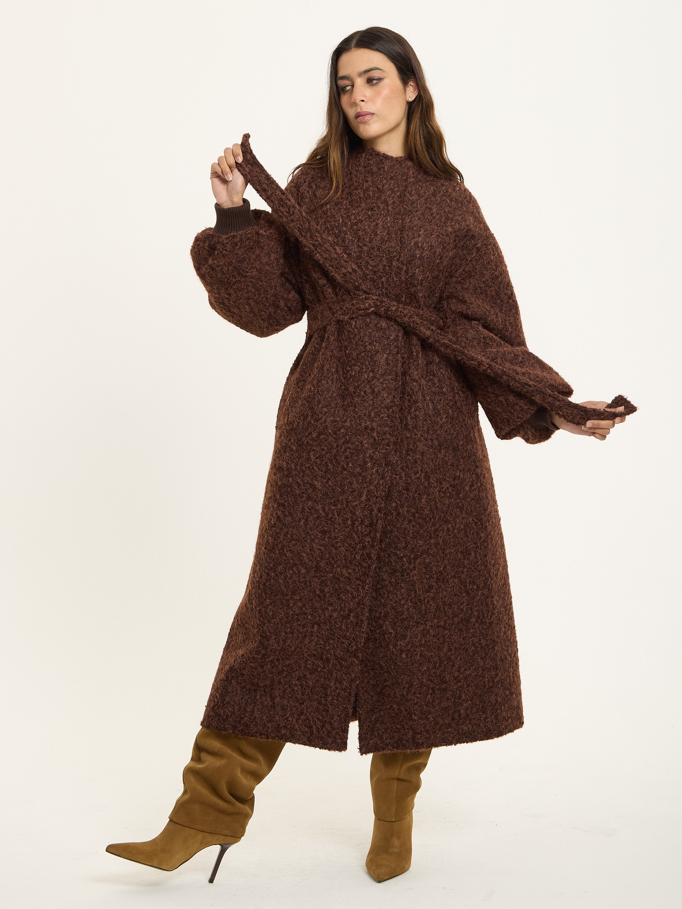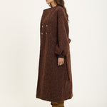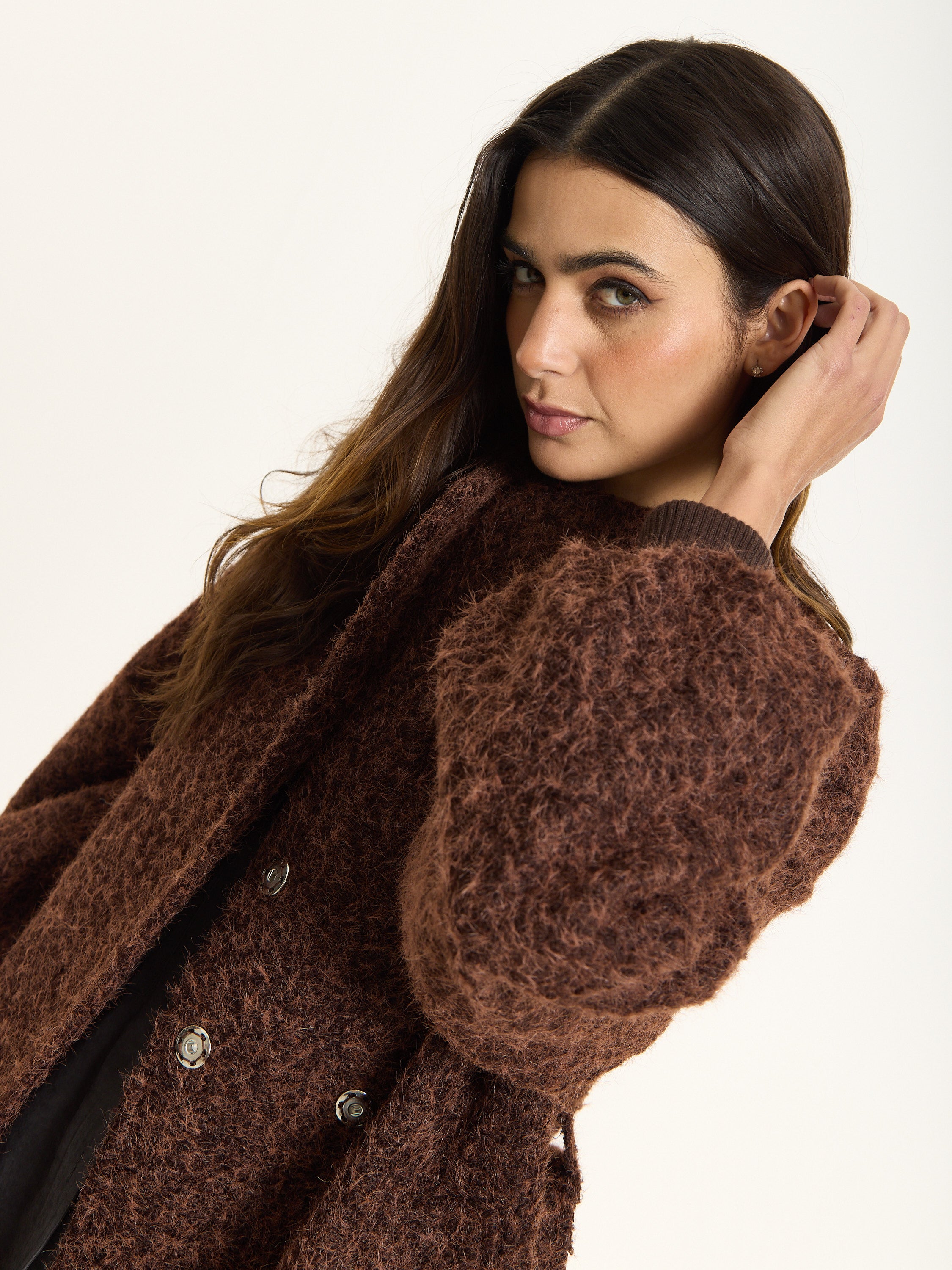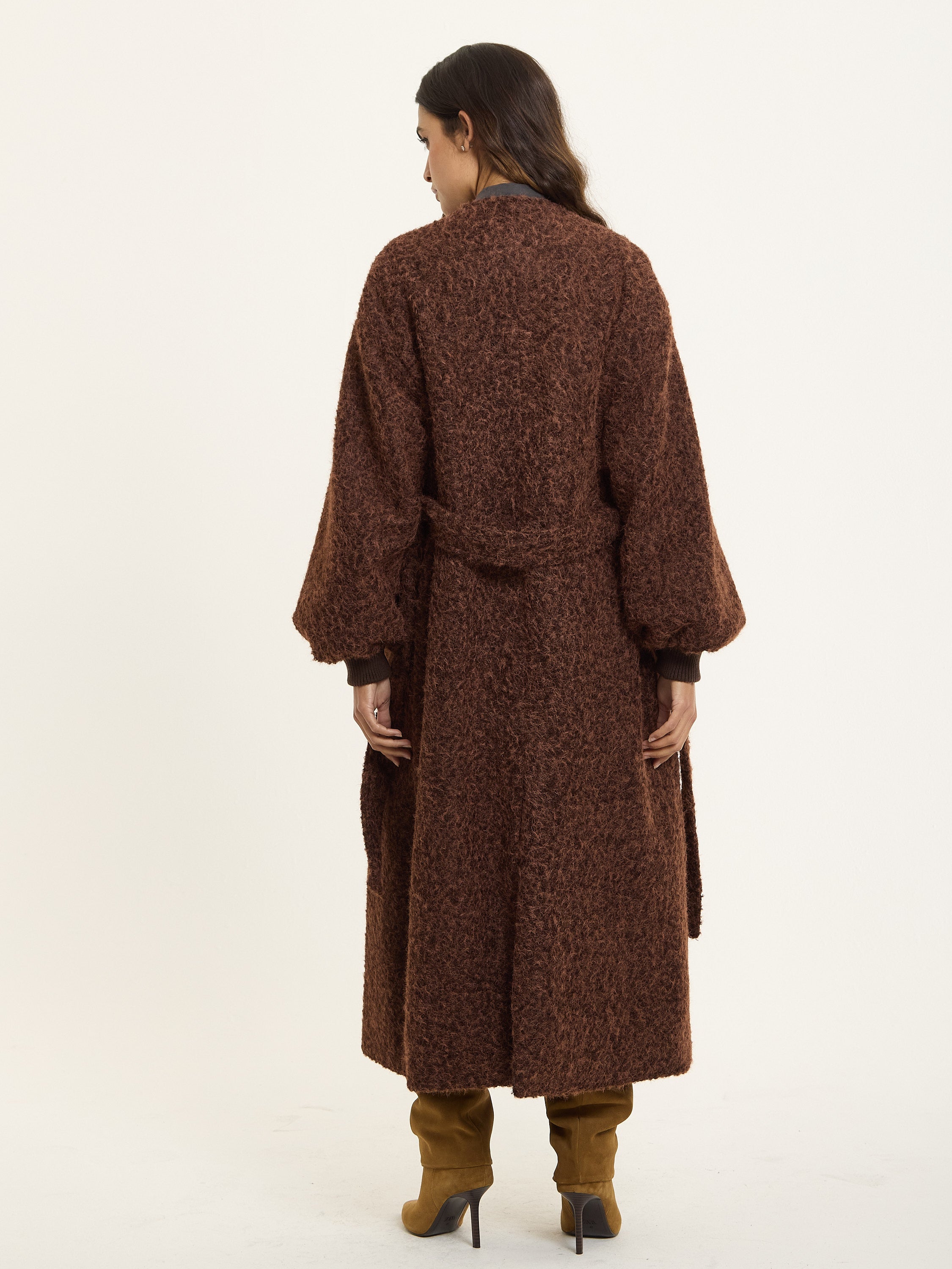 This longline statement coat is made from a soft textured polyester fabric in rich brown. Designed with an oversized silhouette, double-breasted front, balloon sleeves, and ribbed cuffs. The detachable belt allows you to wear it loose or cinched for a defined shape. A cozy and stylish choice for layering through the colder months.