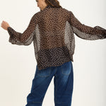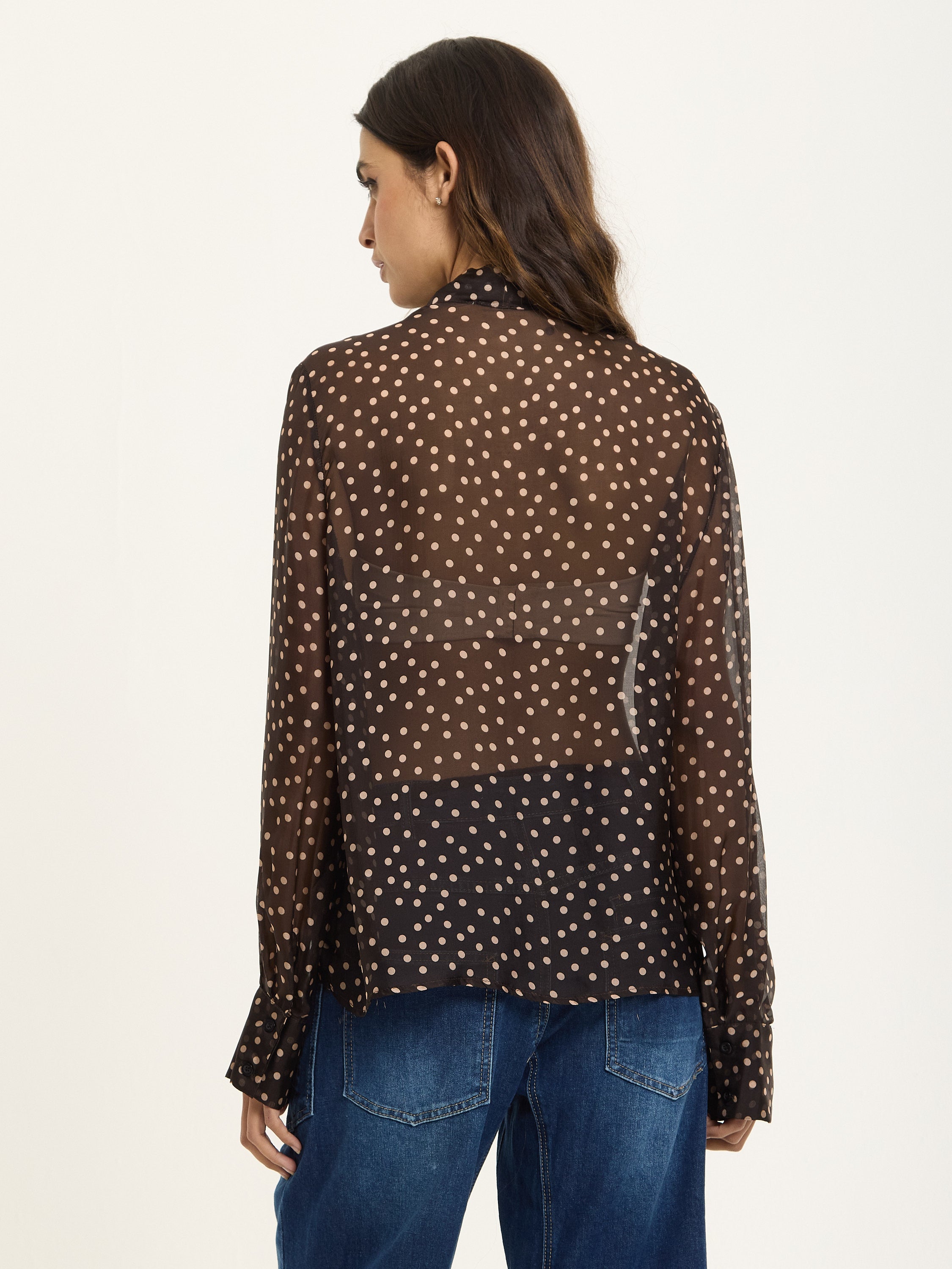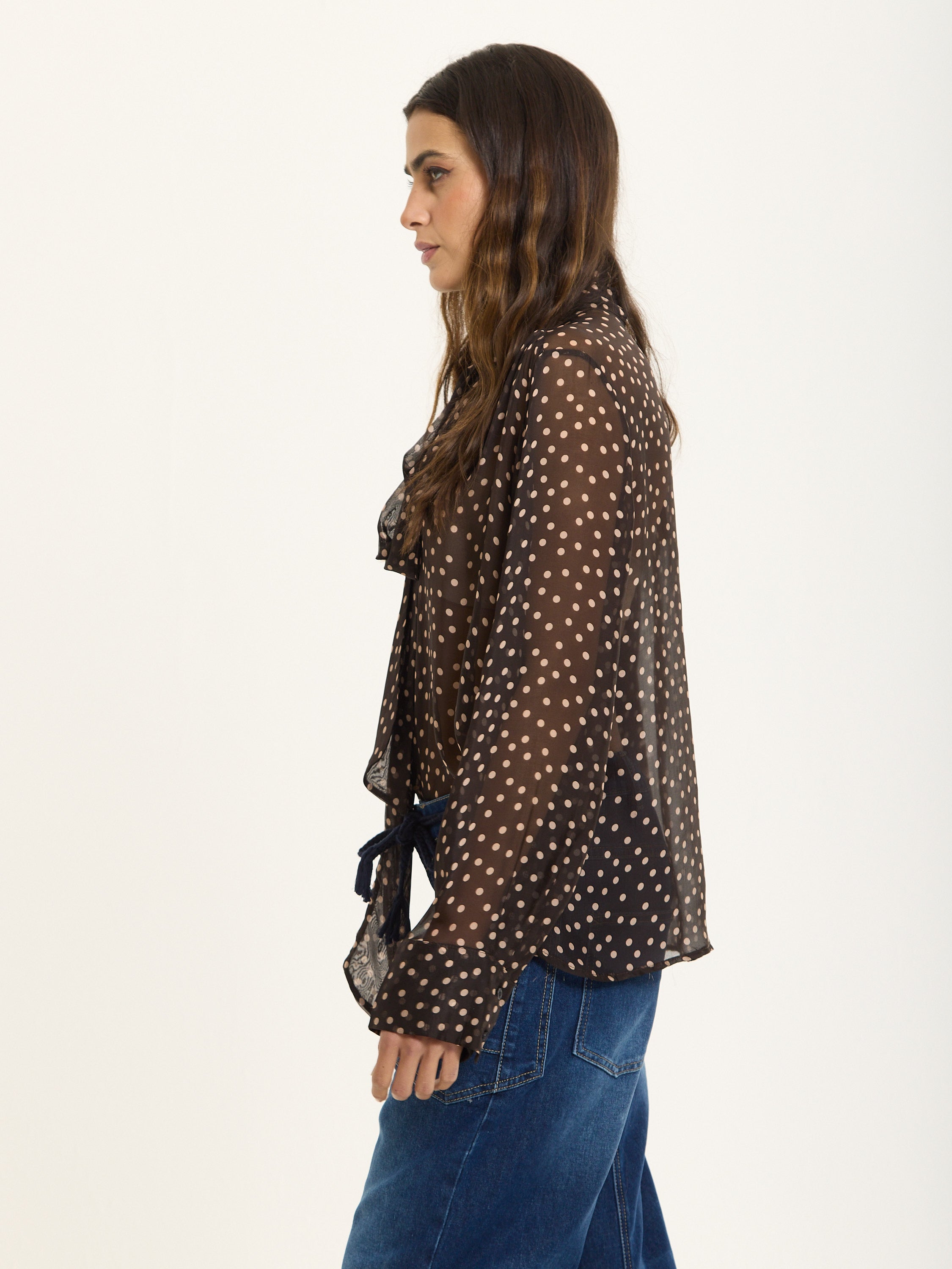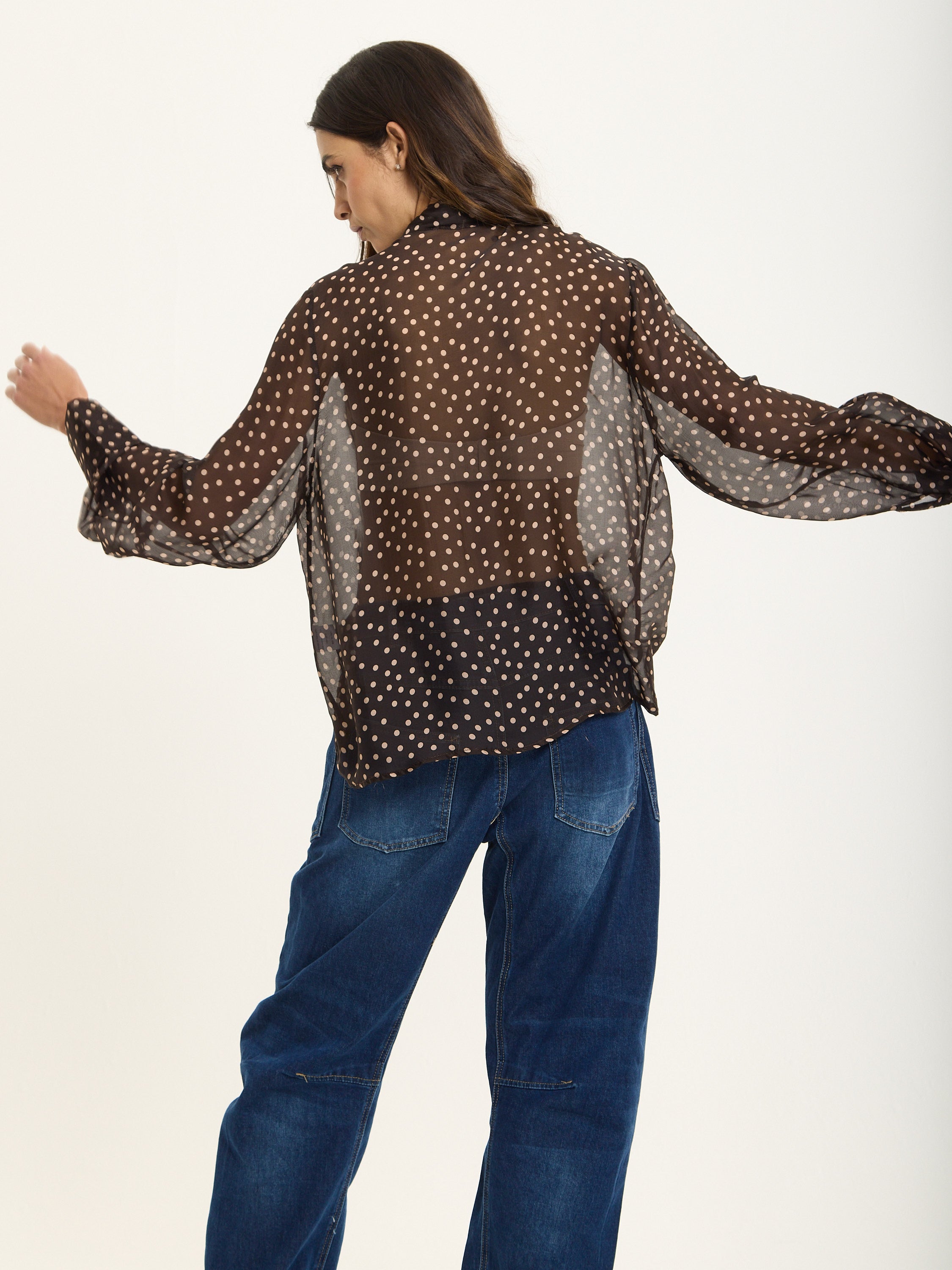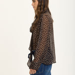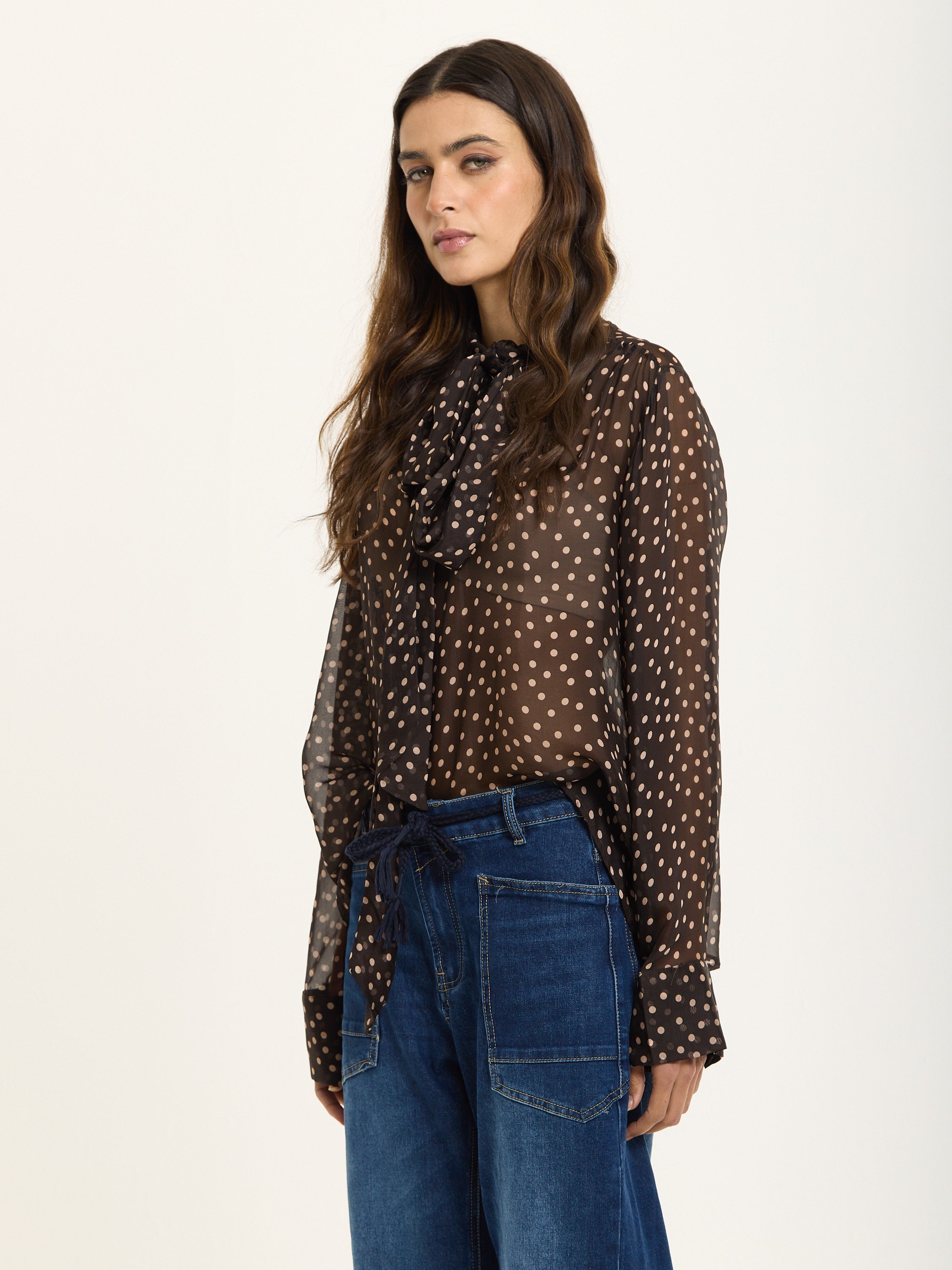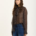 This elegant blouse is crafted from a luxurious silk blend chiffon with an all-over polka dot print. Featuring a statement bow tie neck, long cuffed sleeves, and a relaxed sheer silhouette, it brings effortless sophistication and femininity to any look.