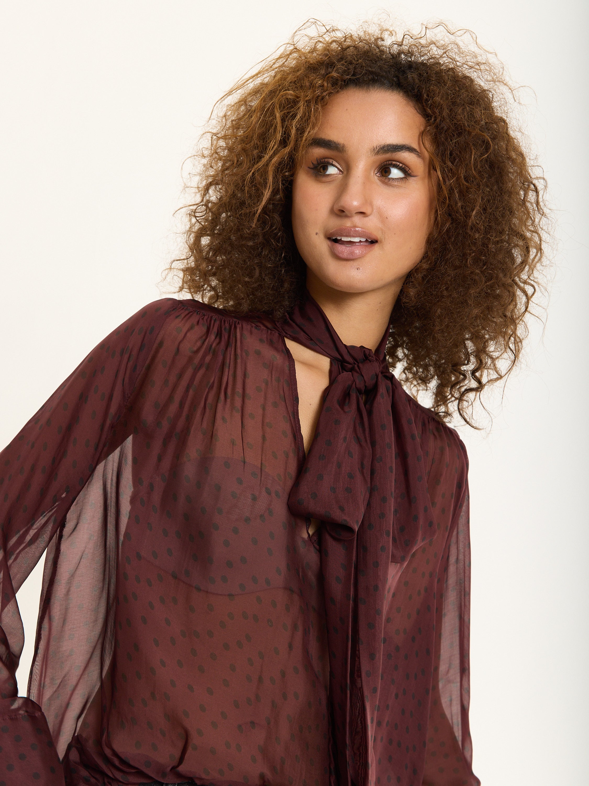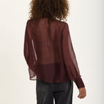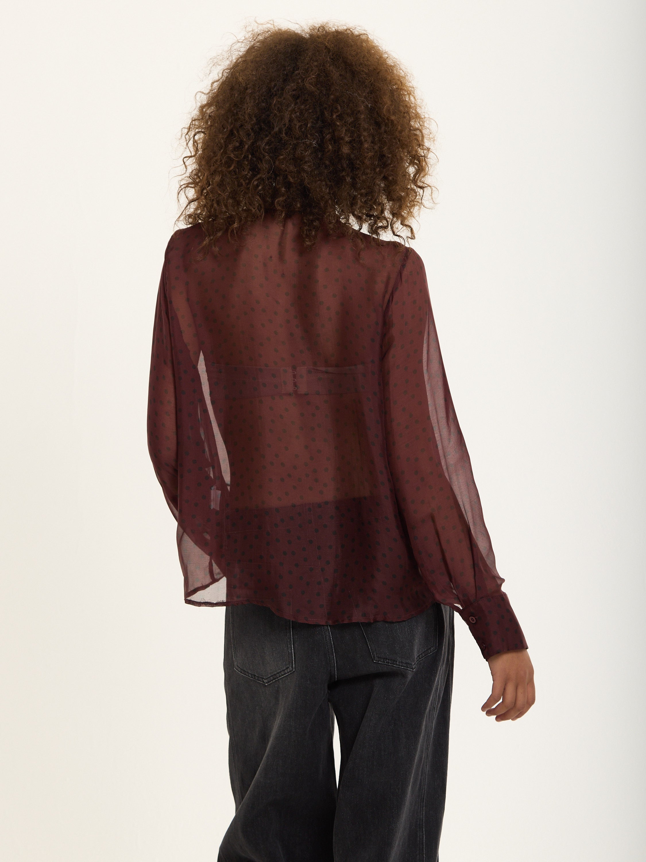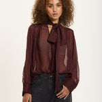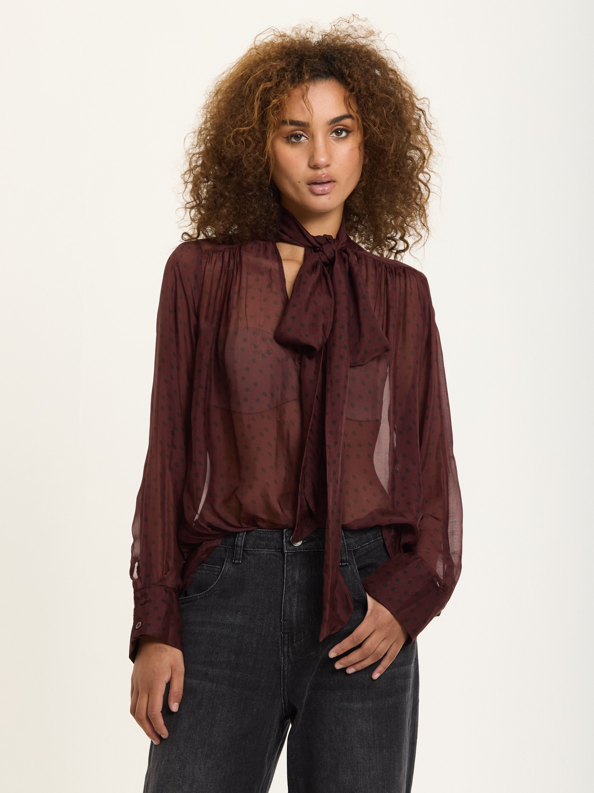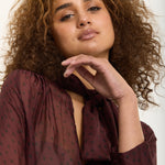 An elegant sheer blouse crafted from a luxurious silk blend, featuring a playful polka dot print in deep burgundy. The design includes a soft pussy bow neckline, gathered shoulders, and buttoned cuffs for a romantic, vintage-inspired finish.